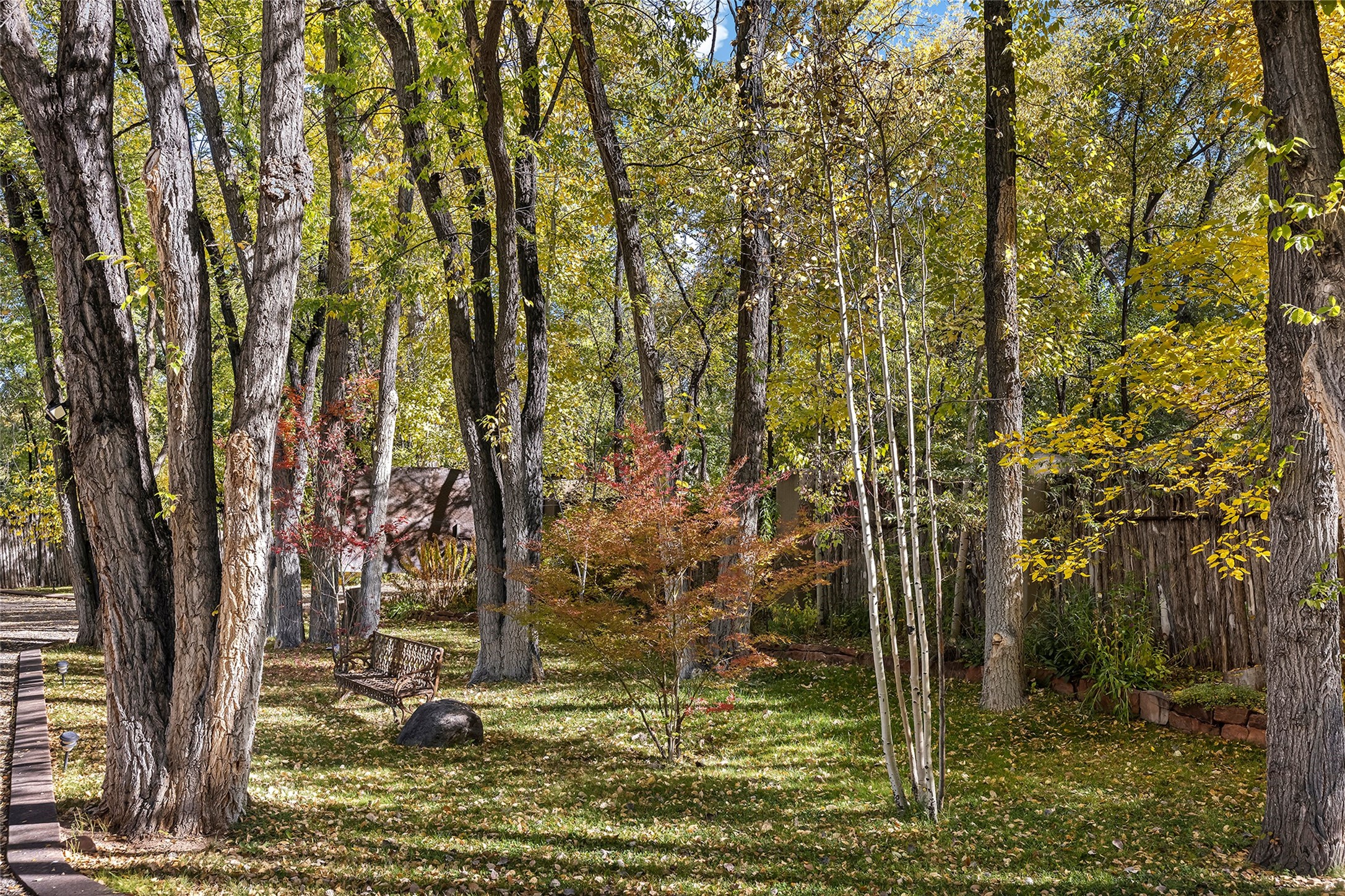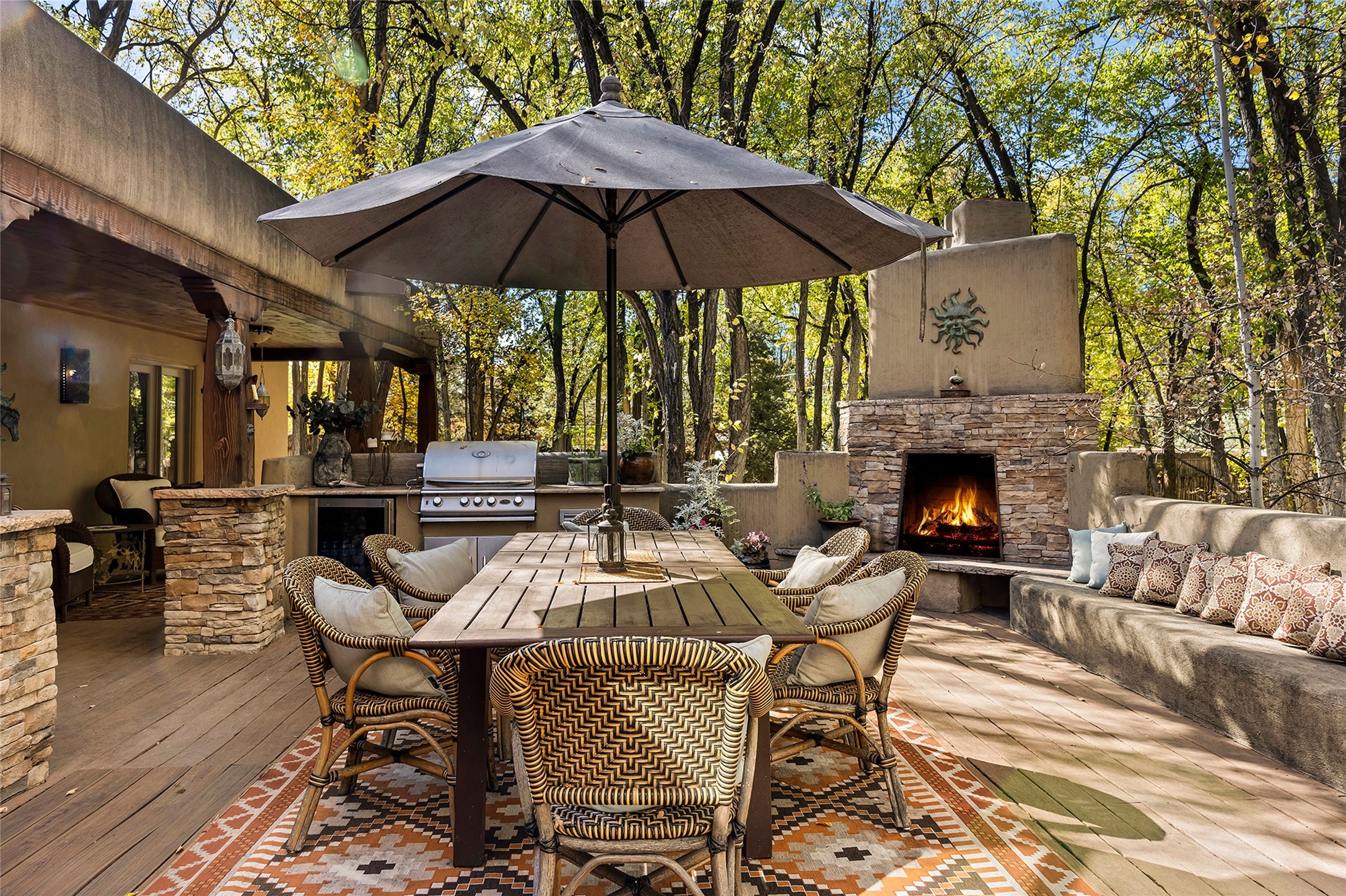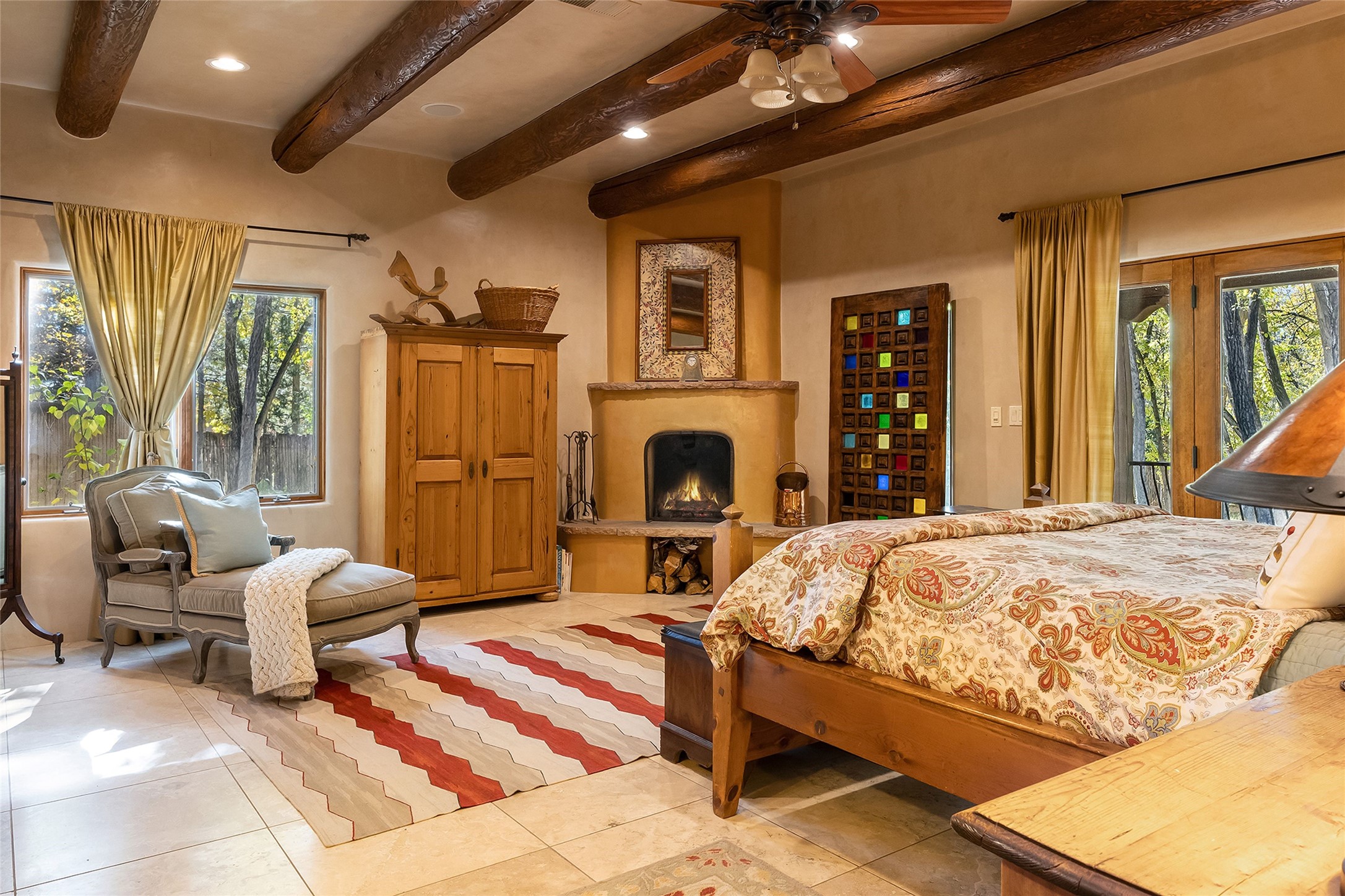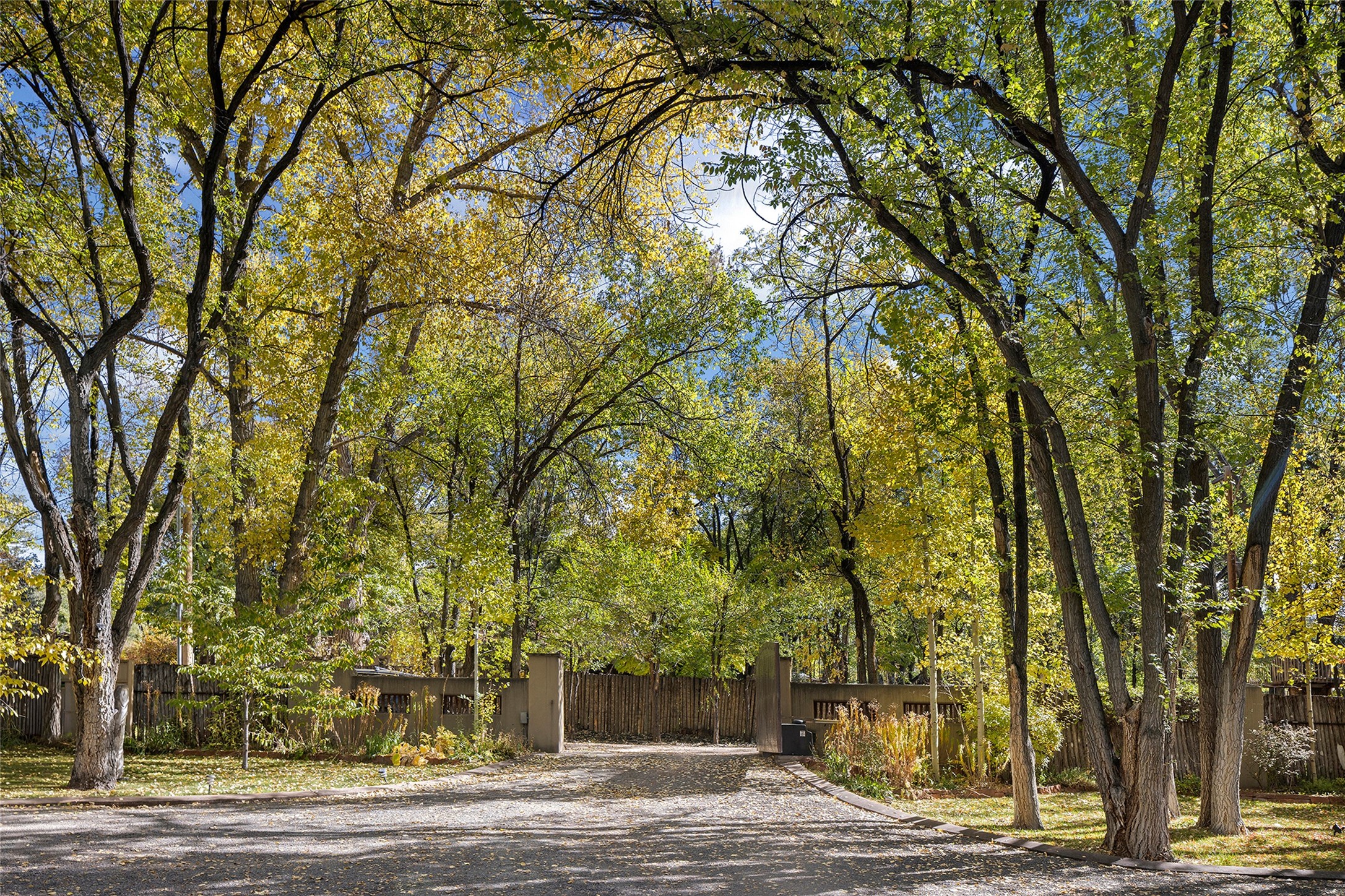 9 Old Coach Road is a 3-bedroom, 5-bath residence on 1.45 verdant, park-like acres in the heart of Tesuque Valley--one of Santa Fe's most distinct, coveted and naturally lush settings. The property is a quiet, gated enclave defined by mature deciduous trees and flowing grass that reflect the valley's rare greenery. The 5,447-square-foot home embodies classic Northern New Mexican design with a pitched metal roof and a warm, pueblo-inspired interior defined by hand-troweled plaster walls, vigas, copper and stone sinks and graceful rounded forms. A showpiece living room with a glass window-wall framing the landscaped tableau blends into a formal dining area and beautifully equipped kitchen, with an adjoining den that offers a more private retreat. The layout emphasizes both flow and function, creating an inviting environment for everyday living as well as entertaining. Each of the three bedrooms is a private suite, and the primary suite includes a fireplace, spa-style bath with steam shower and jetted tub, a large walk-in closet, and direct access to a private gym. Off the primary suite is a walled flagstone courtyard with a spa and outdoor bar. The home office is spacious and secluded behind custom carved wood doors, ideal for creative work or study. Outdoor living is central to the home's character, with a deep portal and patio featuring a wood-burning fireplace overlooking shaded lawns. The property's thoughtful design encourages a connection to nature while maintaining complete privacy. A three-car garage with storage rooms adds convenience and flexibility. Just minutes from downtown Santa Fe yet immersed in the quiet charm of Tesuque, 9 Old Coach Road offers a rare blend of authenticity, craftsmanship, and tranquility--an enduring reflection of traditional Northern New Mexico living in one of the region's most beautiful valleys.