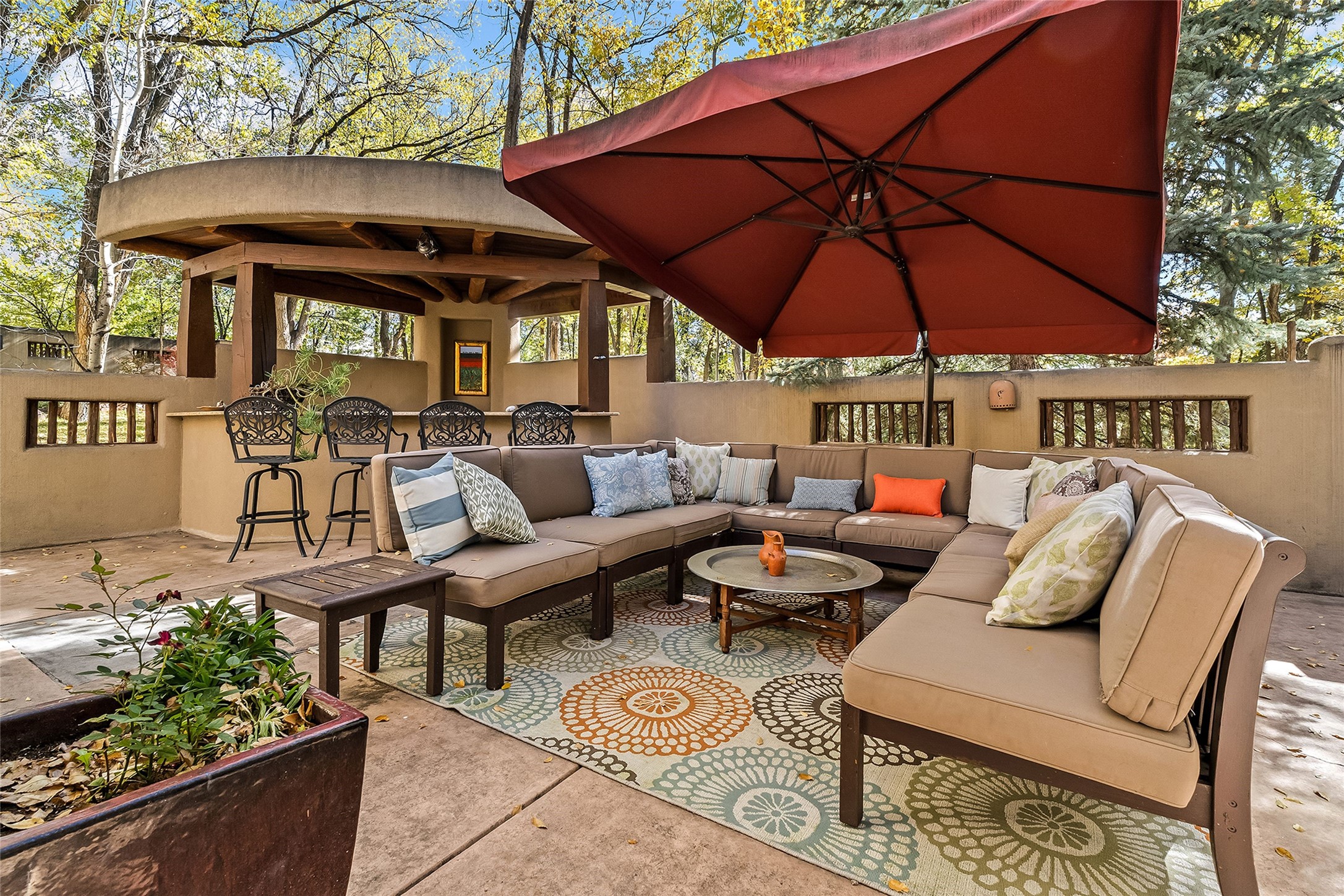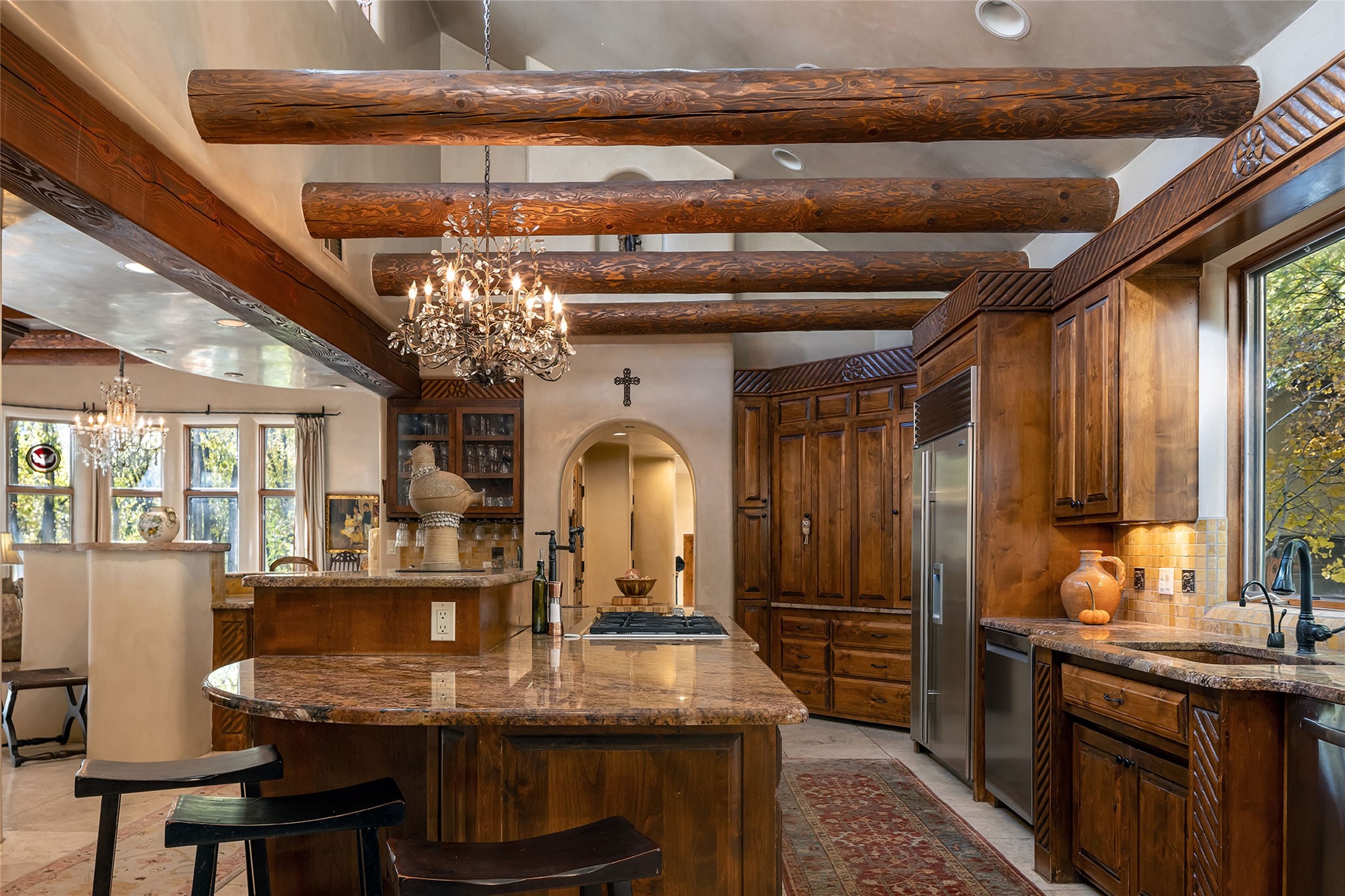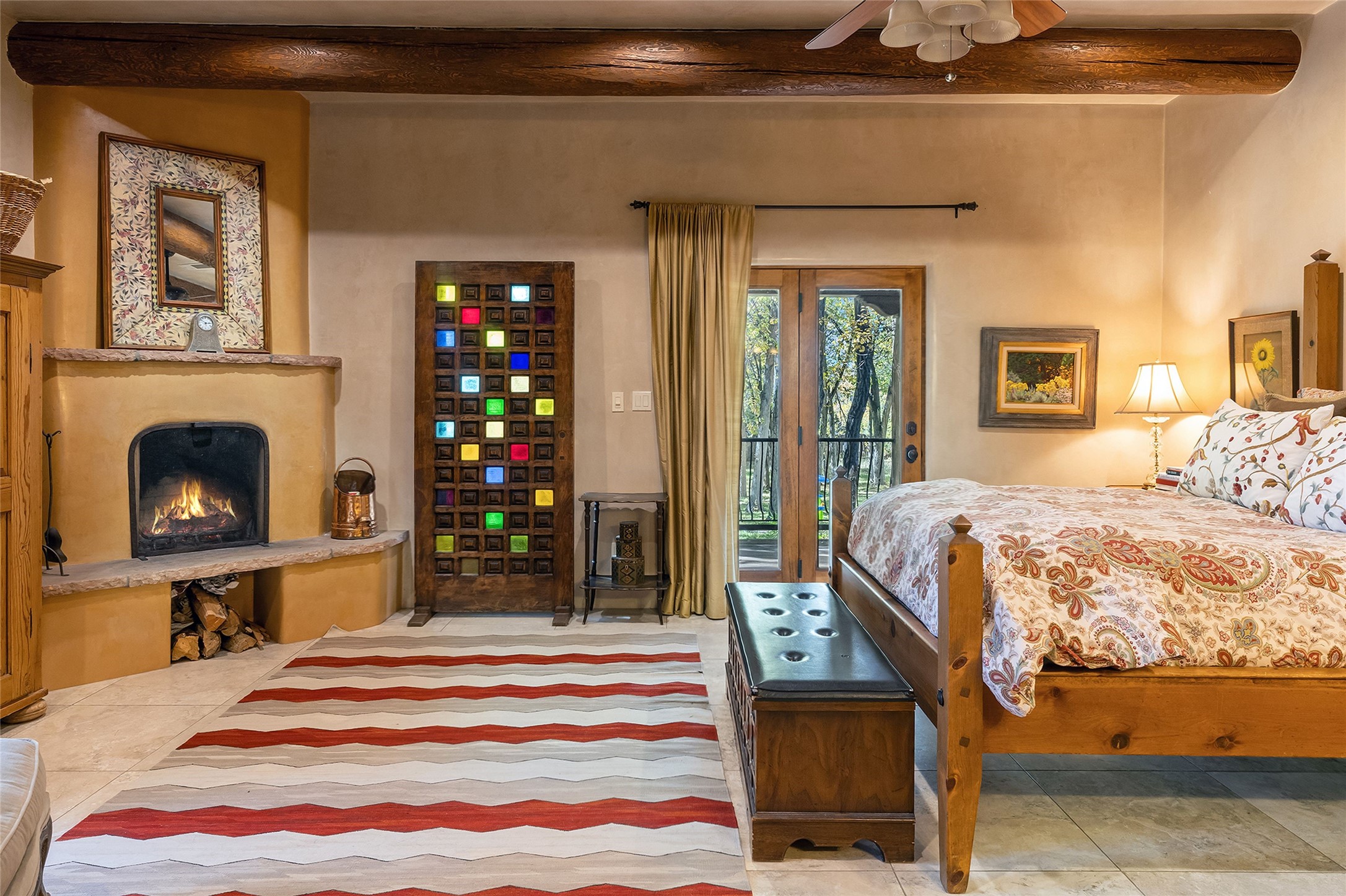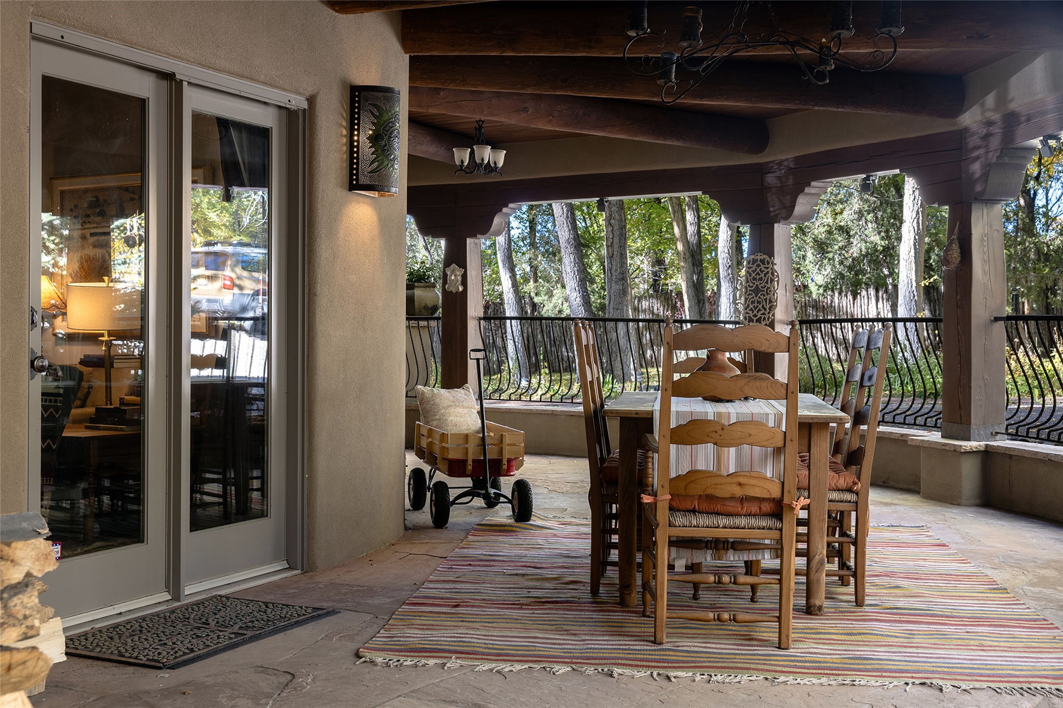 9 Old Coach Road is a 3-bedroom, 5-bath residence on 1.45 verdant, park-like acres in the heart of Tesuque Valley--one of Santa Fe's most distinct, coveted and naturally lush settings. The property is a quiet, gated enclave defined by mature deciduous trees and flowing grass that reflect the valley's rare greenery. The 5,447-square-foot home embodies classic Northern New Mexican design with a pitched metal roof and a warm, pueblo-inspired interior defined by hand-troweled plaster walls, vigas, copper and stone sinks and graceful rounded forms. A showpiece living room with a glass window-wall framing the landscaped tableau blends into a formal dining area and beautifully equipped kitchen, with an adjoining den that offers a more private retreat. The layout emphasizes both flow and function, creating an inviting environment for everyday living as well as entertaining. Each of the three bedrooms is a private suite, and the primary suite includes a fireplace, spa-style bath with steam shower and jetted tub, a large walk-in closet, and direct access to a private gym. Off the primary suite is a walled flagstone courtyard with a spa and outdoor bar. The home office is spacious and secluded behind custom carved wood doors, ideal for creative work or study. Outdoor living is central to the home's character, with a deep portal and patio featuring a wood-burning fireplace overlooking shaded lawns. The property's thoughtful design encourages a connection to nature while maintaining complete privacy. A three-car garage with storage rooms adds convenience and flexibility. Just minutes from downtown Santa Fe yet immersed in the quiet charm of Tesuque, 9 Old Coach Road offers a rare blend of authenticity, craftsmanship, and tranquility--an enduring reflection of traditional Northern New Mexico living in one of the region's most beautiful valleys.