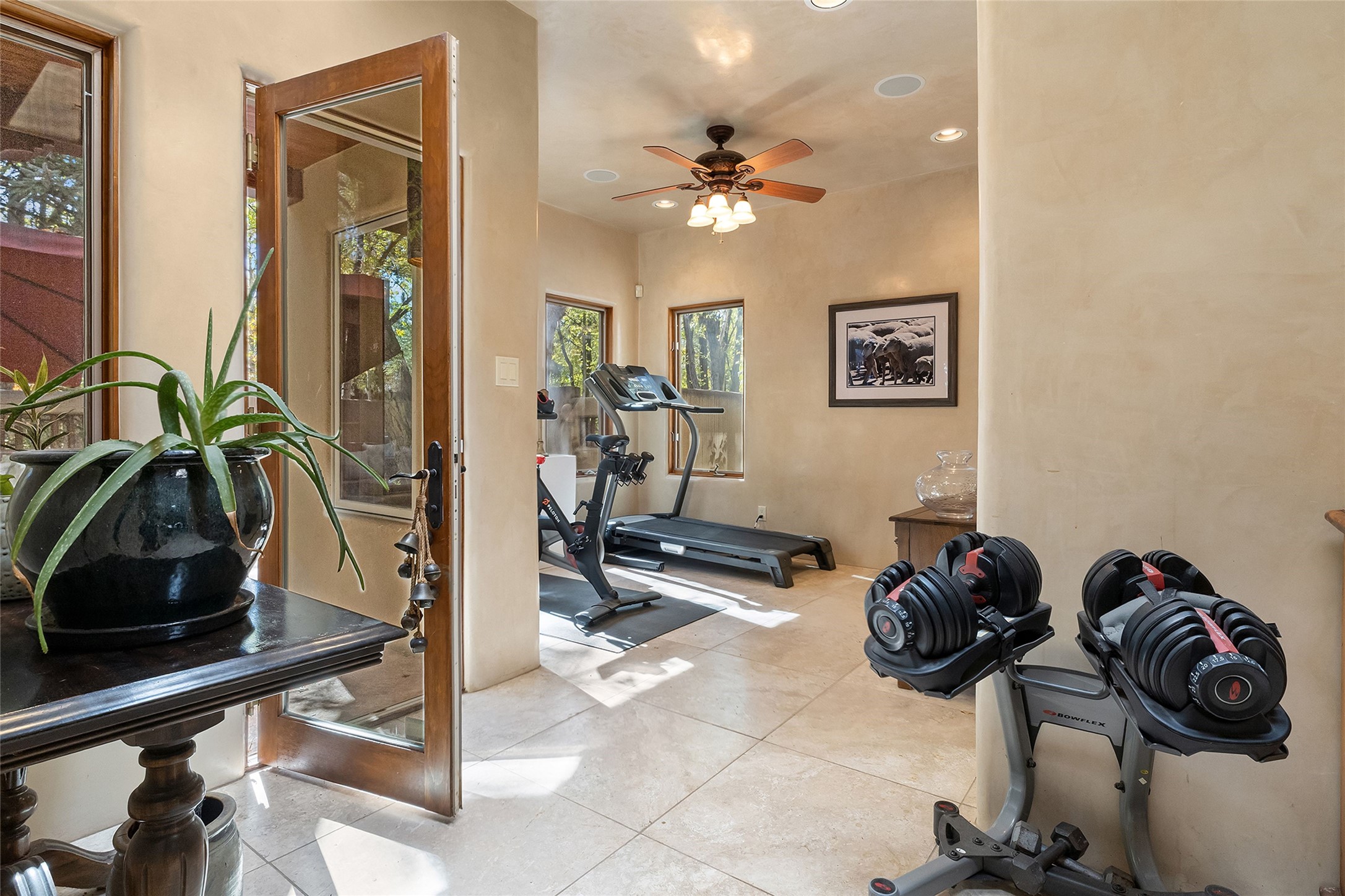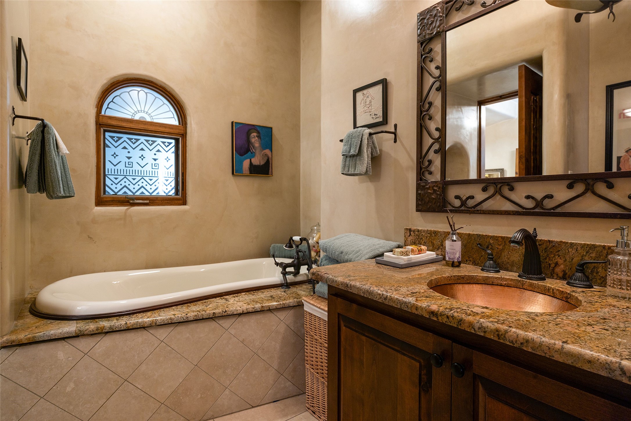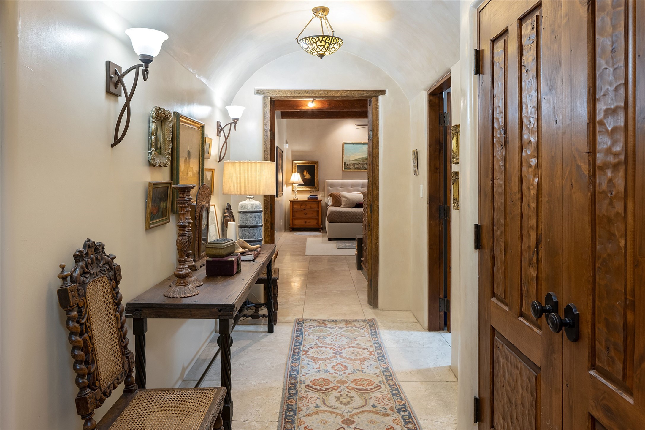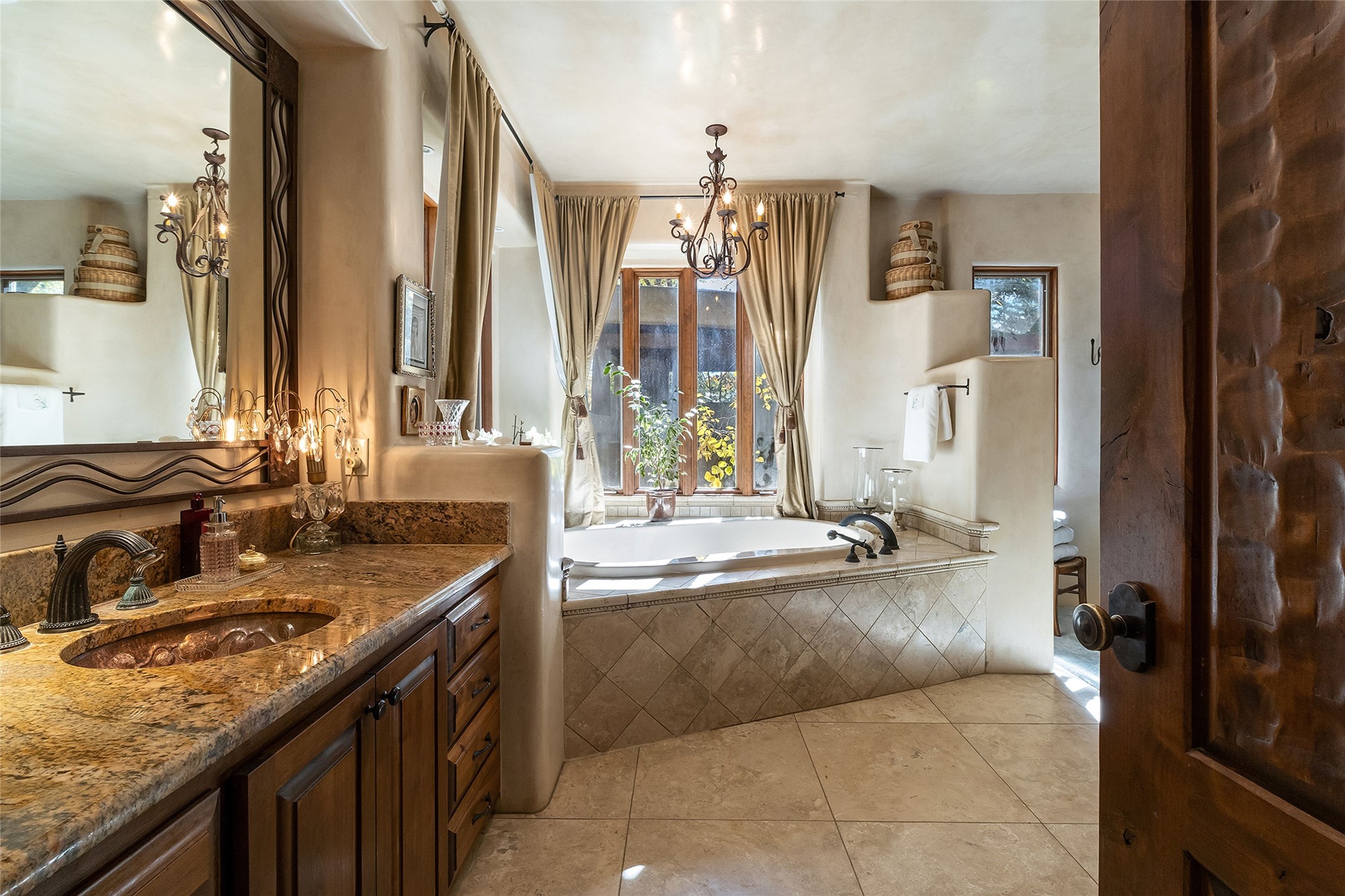 9 Old Coach Road is a 3-bedroom, 5-bath residence on 1.45 verdant, park-like acres in the heart of Tesuque Valley--one of Santa Fe's most distinct, coveted and naturally lush settings. The property is a quiet, gated enclave defined by mature deciduous trees and flowing grass that reflect the valley's rare greenery. The 5,447-square-foot home embodies classic Northern New Mexican design with a pitched metal roof and a warm, pueblo-inspired interior defined by hand-troweled plaster walls, vigas, copper and stone sinks and graceful rounded forms. A showpiece living room with a glass window-wall framing the landscaped tableau blends into a formal dining area and beautifully equipped kitchen, with an adjoining den that offers a more private retreat. The layout emphasizes both flow and function, creating an inviting environment for everyday living as well as entertaining. Each of the three bedrooms is a private suite, and the primary suite includes a fireplace, spa-style bath with steam shower and jetted tub, a large walk-in closet, and direct access to a private gym. Off the primary suite is a walled flagstone courtyard with a spa and outdoor bar. The home office is spacious and secluded behind custom carved wood doors, ideal for creative work or study. Outdoor living is central to the home's character, with a deep portal and patio featuring a wood-burning fireplace overlooking shaded lawns. The property's thoughtful design encourages a connection to nature while maintaining complete privacy. A three-car garage with storage rooms adds convenience and flexibility. Just minutes from downtown Santa Fe yet immersed in the quiet charm of Tesuque, 9 Old Coach Road offers a rare blend of authenticity, craftsmanship, and tranquility--an enduring reflection of traditional Northern New Mexico living in one of the region's most beautiful valleys.