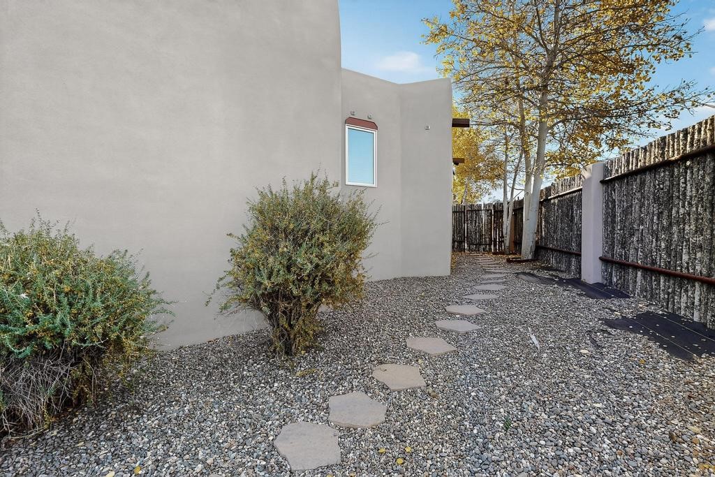 Don't miss this charming single-level home in Pueblos del Sol featuring three bedrooms and two bathrooms. This residence showcases classic Santa Fe details such as Vigas and a cozy Kiva fireplace. Lots of natural light streaming in from five skylights throughout the home. The home is positioned with southern exposure at the front and northern exposure at the rear. Mature trees provide exceptional privacy, with only one neighboring property. The surrounding trees and covered deck help keep the home cool in the summer, complemented by central air conditioning. Central heating ensures comfort and warmth throughout the winter months. The open floor plan provides great flow and comfortable bedroom separation, while the spacious deck with a solid portal--accessible from both the living room and primary bedroom--offers the perfect place to relax and enjoy the beautiful mountain views. York Central air conditioning and a two-car garage complete this wonderful Santa Fe home. Additionally, the raised subfloor design allows for easy access to plumbing for repairs or modifications. Situated on a large, beautifully landscaped corner lot with native plants and an apricot tree, the property backs onto a greenbelt for added privacy. Recent updates include a finished garage with a new door (2016), a new TPO roof (2021), new coyote and dog-eared fencing (2021), stucco patched and stained (2025), a new hot water heater (2025), a new sump pump (2023), and a new tankless water heater (2025). We invite you to come take a look at this wonderful property.