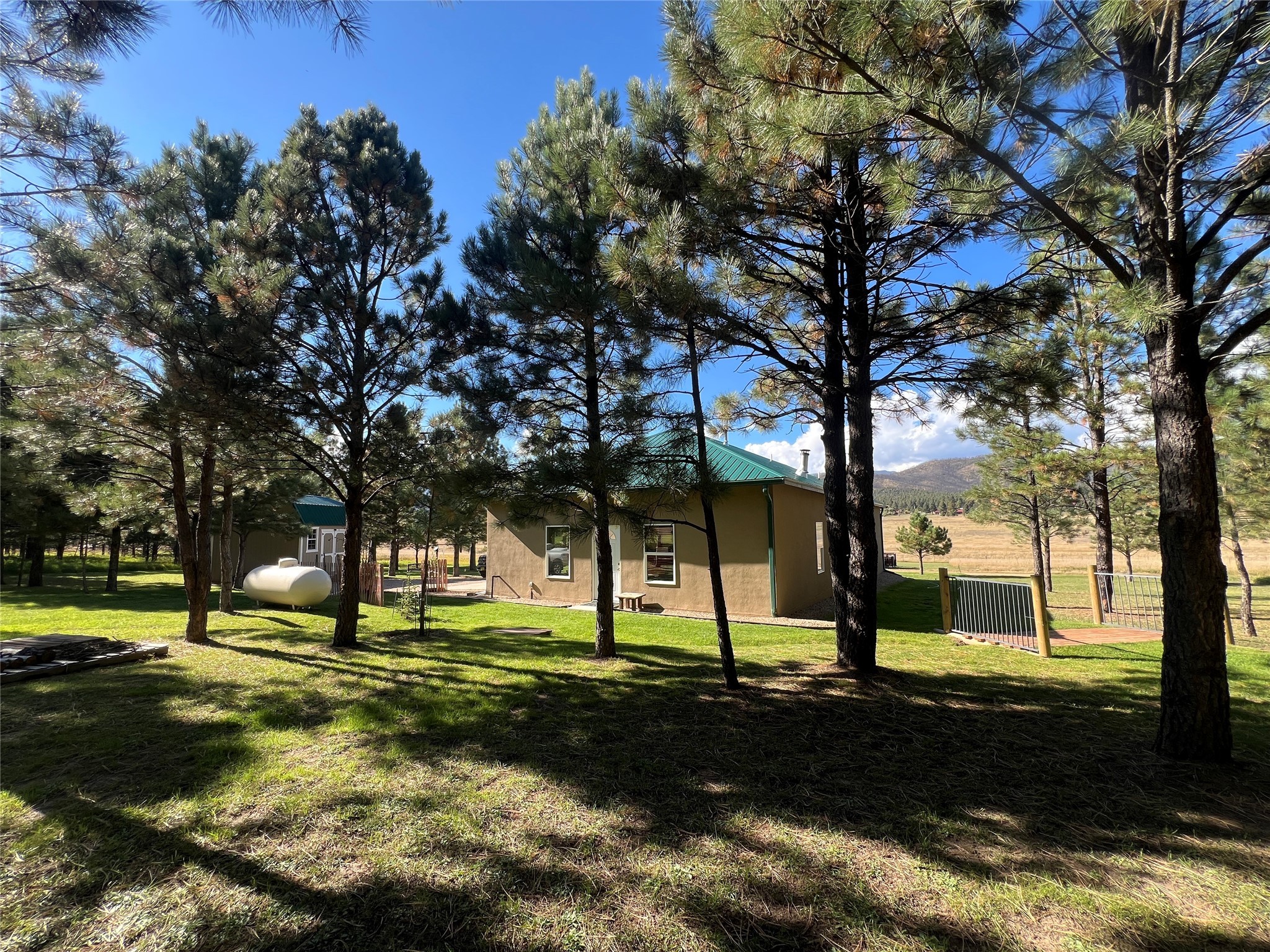 Immaculate mountain retreat with panoramic views and exceptional craftsmanship. Built in 2022, this beautifully maintained mountain home combines modern comfort with comfortable living. Situated on two lots with 0.83 acres allows for easy access off the paved county road. Step inside to soaring vaulted ceilings and a bright, open living area centered around a cozy pellet stove--perfect for relaxing or entertaining in style. The light bright well designed kitchen boasts butcher block countertops protected with an epoxy finish and a spacious pantry. The thoughtfully designed floor plan with luxury vinyl flooring throughout features a primary bedroom with en-suite bath and walk-in closet and a guest bedroom and another full bath. A convenient laundry area and mud room leads to the attached spacious oversized insulated finished 900-square-foot heated garage offering far more than parking--complete with a wood stove, workshop space, utility sink, and 220-volt outlet, it's ideal for hobbies, projects, or extra storage. Step out to the covered deck and take in breathtaking valley, mountain, and forest views--a peaceful setting where you'll love to unwind. Lush lawns frame the property, accented by two hand-built bridges and a large new storage shed with electricity for added convenience. Generac hard-wired full-house generator provides worry-free backup power. Offered furnished, this move-in-ready home is the perfect blend of quality, comfort, and mountain serenity. Located just 25 miles from Las Vegas, NM, and an easy 1-hour drive to Santa Fe or Taos, this property invites you to relax, recharge, and enjoy life in one of northern New Mexico's most scenic settings.