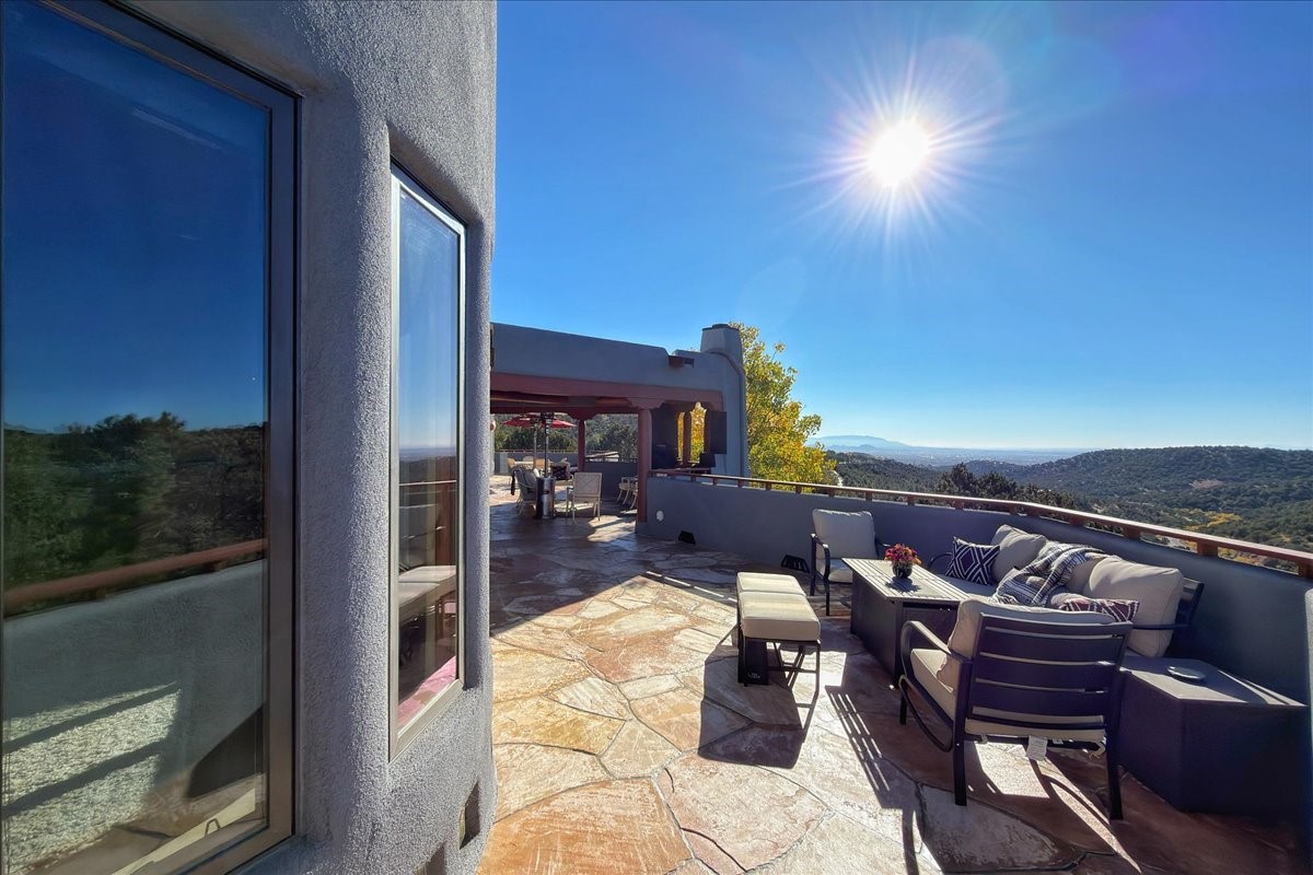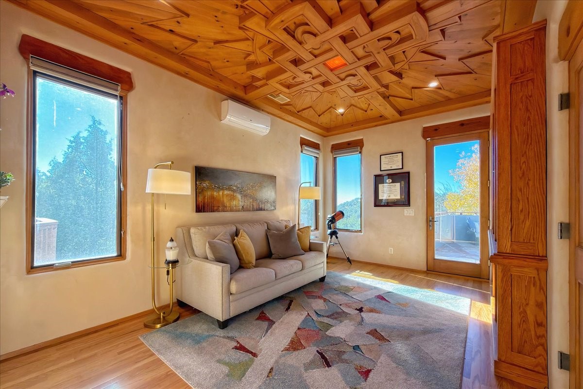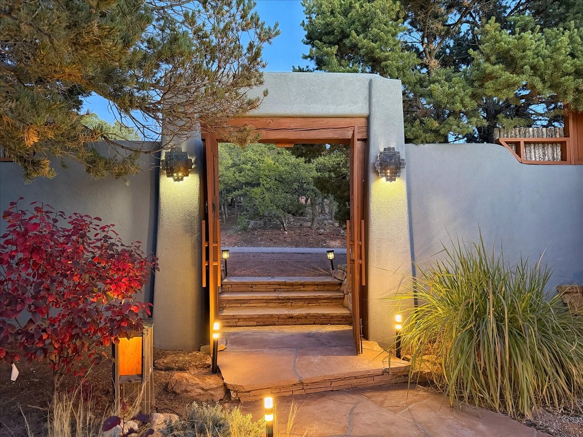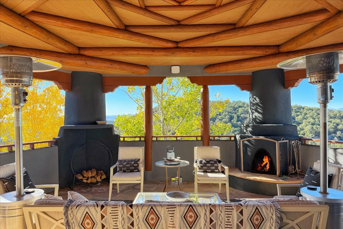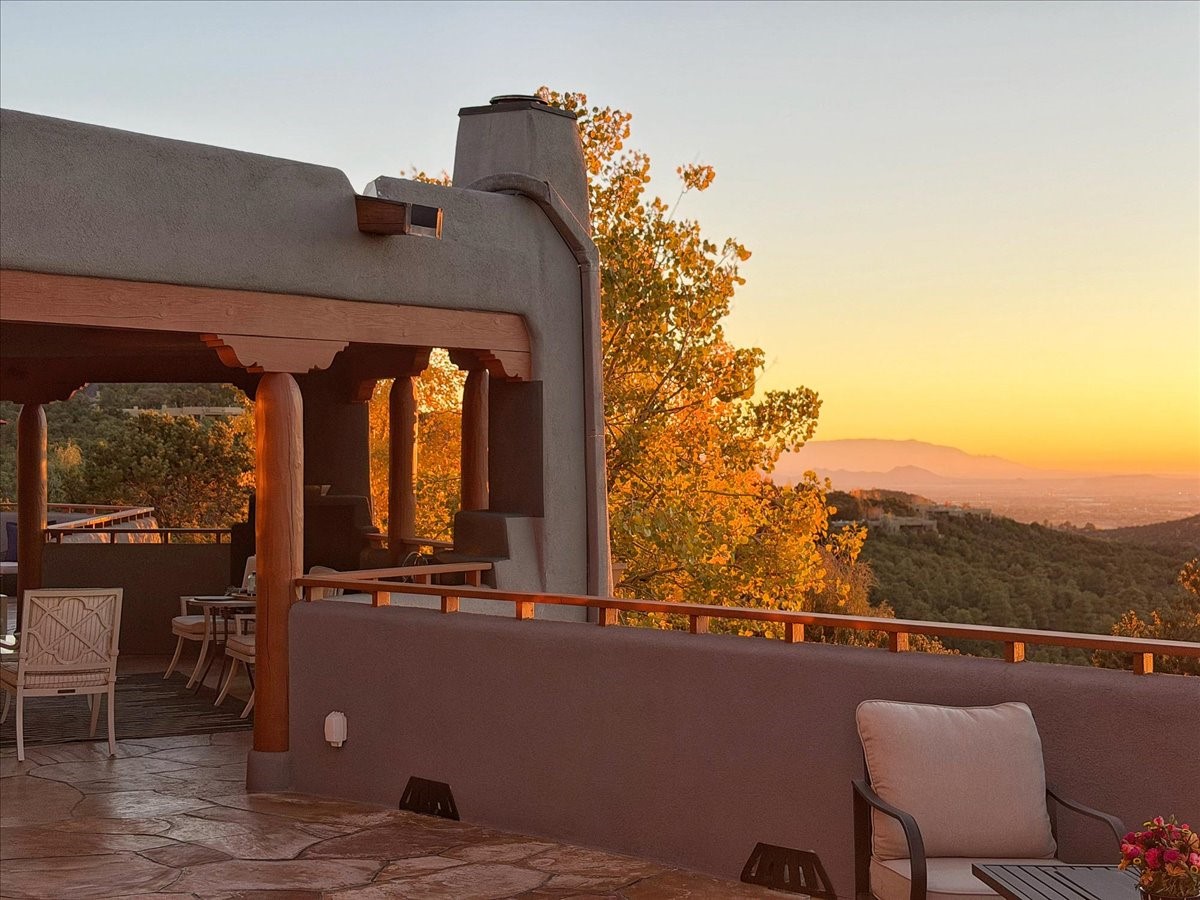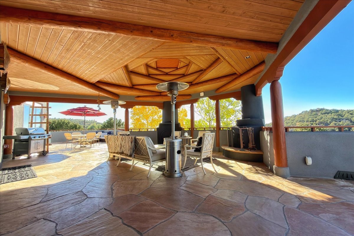 Whispering Hill--where nature's quiet beauty keeps its own gentle secrets. Set within Hyde Park Estates, this architectural statement captures panoramic vistas that are rare even for Santa Fe--a dramatic sweep of horizon, sculpted mountains, and ever-changing light. Designed with a flexible five-bedroom layout, Whispering Hill offers versatility without sacrificing elegance. The main level functions as a complete living environment, ideal for those who prefer life without stairs. A tranquil primary suite, sophisticated gathering areas, and rare hardwood cabinetry set a tone of refined luxury from the moment you arrive. Throughout the residence, artisan ceilings--each one individually crafted--serve as sculptural centerpieces across both levels and extend to the outdoor entertaining terrace, where their artistry meets the surrounding landscape with extraordinary effect. The Media Room, anchored by a gigantic viewing screen, was envisioned for cinema, live sporting events, and immersive entertainment--an atmospheric space designed for true enjoyment. The lower level continues the architectural flow with a second primary suite and additional bedrooms, each offering direct outdoor access to terraces, pathways, and quiet corners of the landscape. Outdoor living expands with multiple areas to gather, including a radiant-heated portal, a GreenHouse, secluded seating spaces designed for unplugged relaxation, and a private hot tub positioned just outside one of the lower-level bedrooms--a serene vantage point for stargazing and quiet evenings. From the elevated main terrace, you can see 10,000 Waves, Santa Fe's renowned Japanese-inspired spa nestled among the pines. Across the grounds, irrigated landscaping enhances the natural contours of the site, ensuring year-round beauty, color, and ease of care. Climate comfort is thoughtfully supported by eight strategically placed mini-splits for individualized heating and cooling, working in tandem with the primary systems to ensure four-season comfort at altitude. A pre-listing home inspection has already been completed, offering added transparency and confidence for prospective buyers. Minutes from the Santa Fe Plaza, Whispering Hill is an exceptional choice for those seeking either a full-time luxury residence or an elevated secondary retreat. With premium upgrades far too numerous to list, rare materials, master craftsmanship, and one of Santa Fe's most compelling vantage points, Whispering Hill stands as a true Santa Fe masterpiece--a seamless fusion of design, nature, and elevated mountain living.