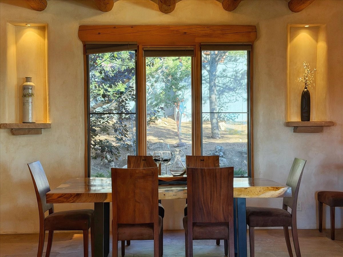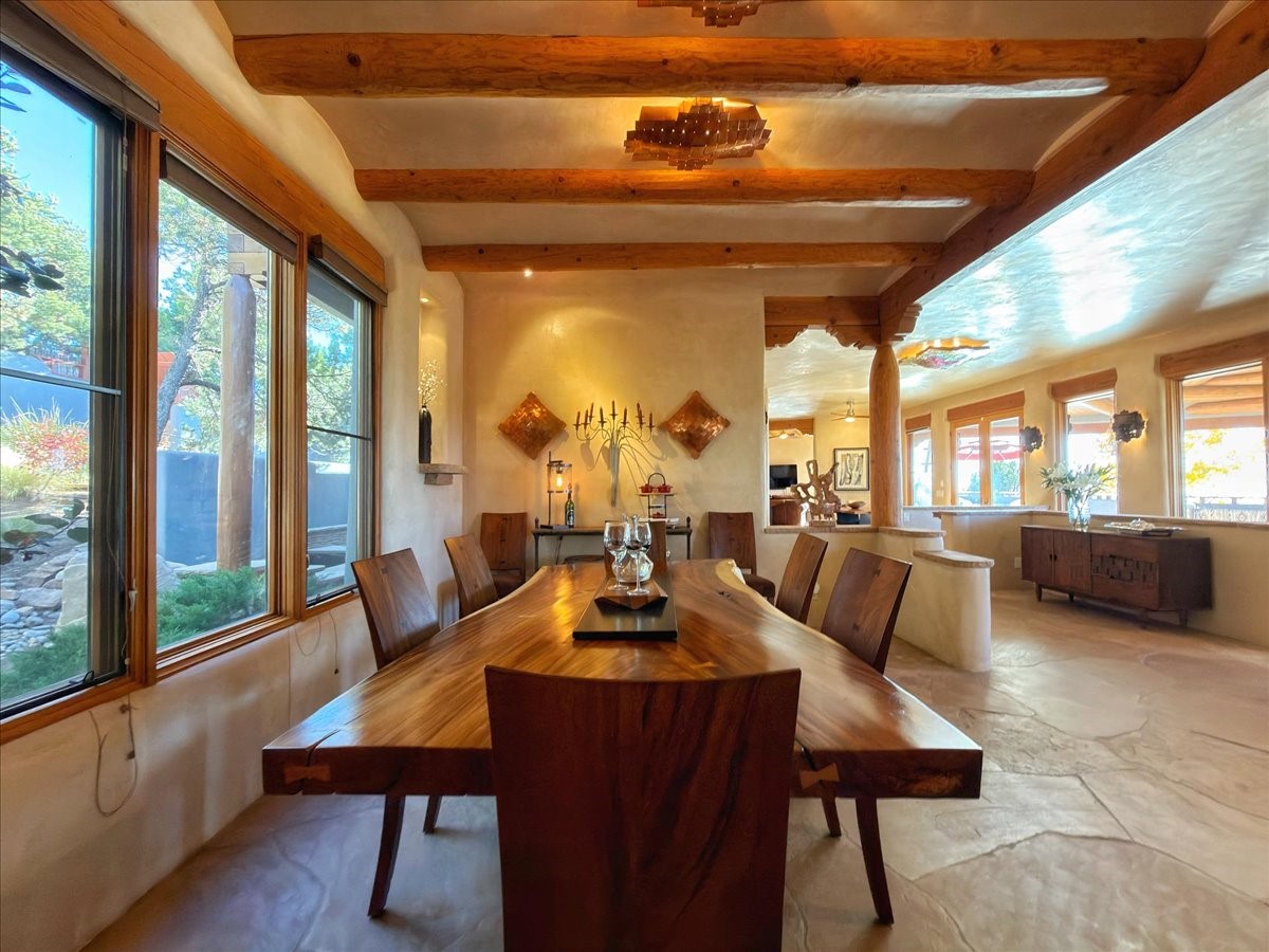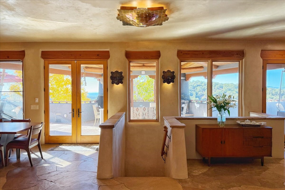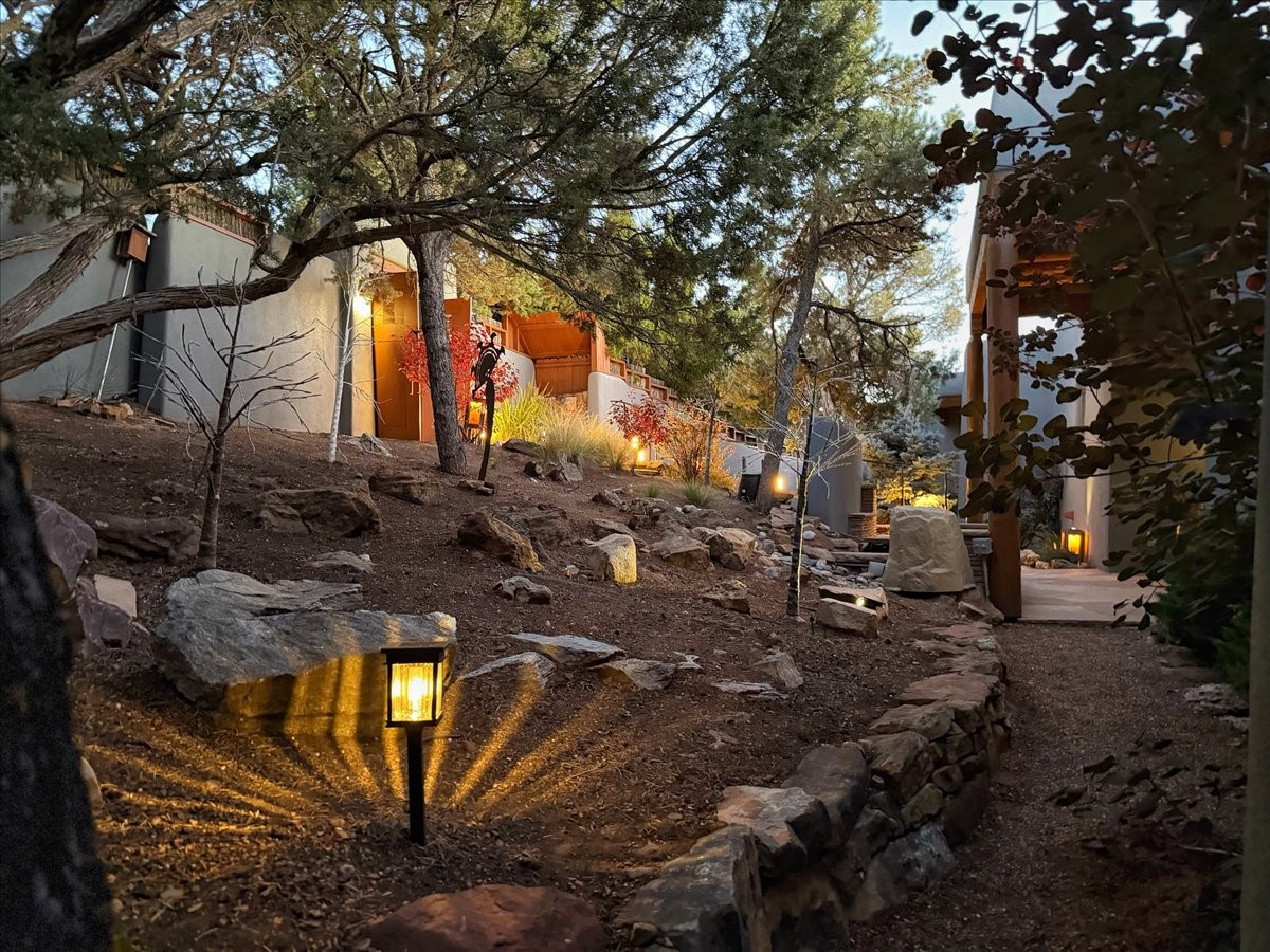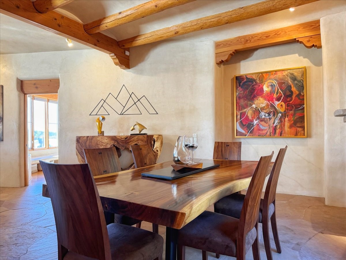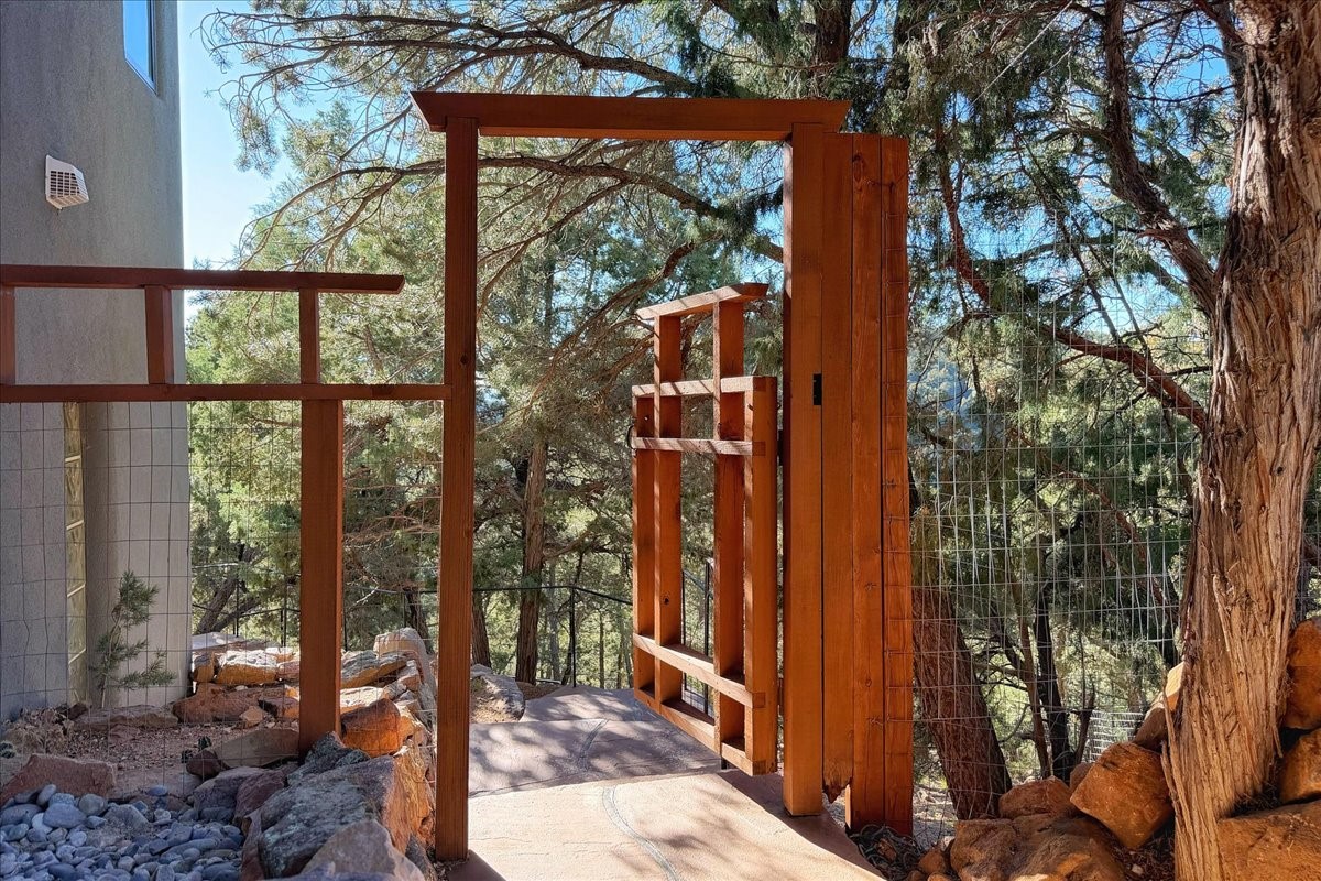 Whispering Hill--where nature's quiet beauty keeps its own gentle secrets. Set within Hyde Park Estates, this architectural statement captures panoramic vistas that are rare even for Santa Fe--a dramatic sweep of horizon, sculpted mountains, and ever-changing light. Designed with a flexible five-bedroom layout, Whispering Hill offers versatility without sacrificing elegance. The main level functions as a complete living environment, ideal for those who prefer life without stairs. A tranquil primary suite, sophisticated gathering areas, and rare hardwood cabinetry set a tone of refined luxury from the moment you arrive. Throughout the residence, artisan ceilings--each one individually crafted--serve as sculptural centerpieces across both levels and extend to the outdoor entertaining terrace, where their artistry meets the surrounding landscape with extraordinary effect. The Media Room, anchored by a gigantic viewing screen, was envisioned for cinema, live sporting events, and immersive entertainment--an atmospheric space designed for true enjoyment. The lower level continues the architectural flow with a second primary suite and additional bedrooms, each offering direct outdoor access to terraces, pathways, and quiet corners of the landscape. Outdoor living expands with multiple areas to gather, including a radiant-heated portal, a GreenHouse, secluded seating spaces designed for unplugged relaxation, and a private hot tub positioned just outside one of the lower-level bedrooms--a serene vantage point for stargazing and quiet evenings. From the elevated main terrace, you can see 10,000 Waves, Santa Fe's renowned Japanese-inspired spa nestled among the pines. Across the grounds, irrigated landscaping enhances the natural contours of the site, ensuring year-round beauty, color, and ease of care. Climate comfort is thoughtfully supported by eight strategically placed mini-splits for individualized heating and cooling, working in tandem with the primary systems to ensure four-season comfort at altitude. A pre-listing home inspection has already been completed, offering added transparency and confidence for prospective buyers. Minutes from the Santa Fe Plaza, Whispering Hill is an exceptional choice for those seeking either a full-time luxury residence or an elevated secondary retreat. With premium upgrades far too numerous to list, rare materials, master craftsmanship, and one of Santa Fe's most compelling vantage points, Whispering Hill stands as a true Santa Fe masterpiece--a seamless fusion of design, nature, and elevated mountain living.