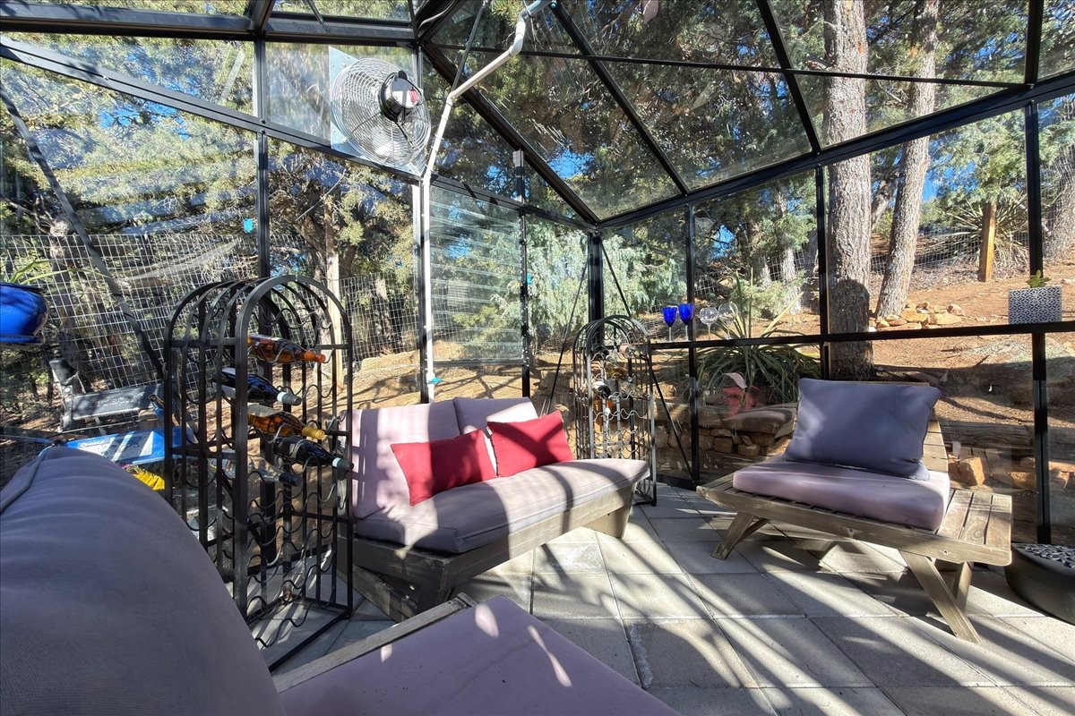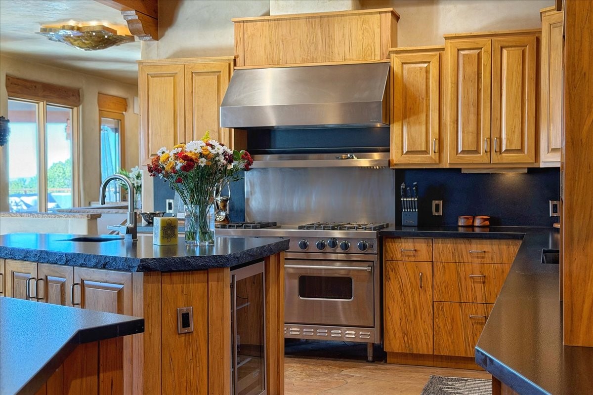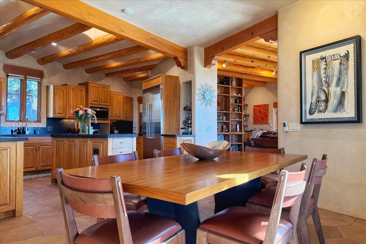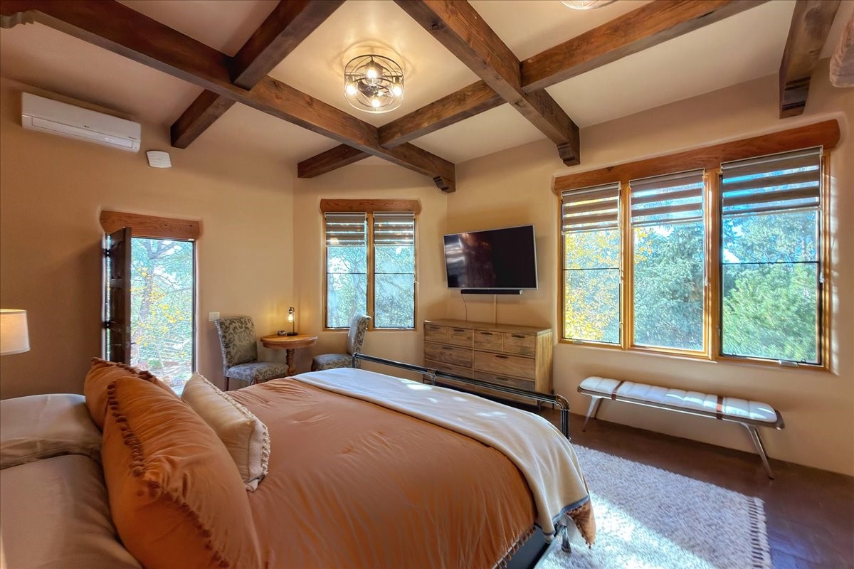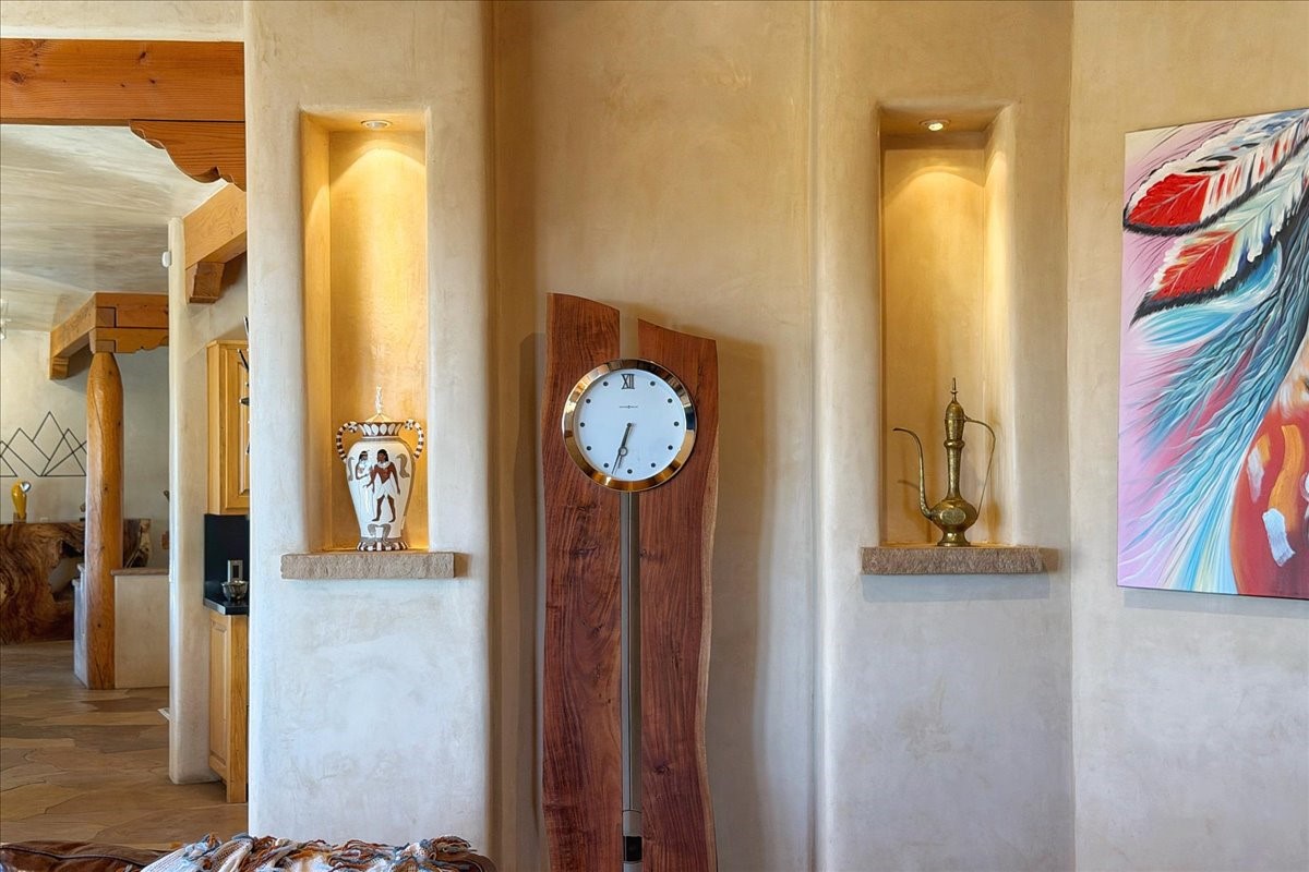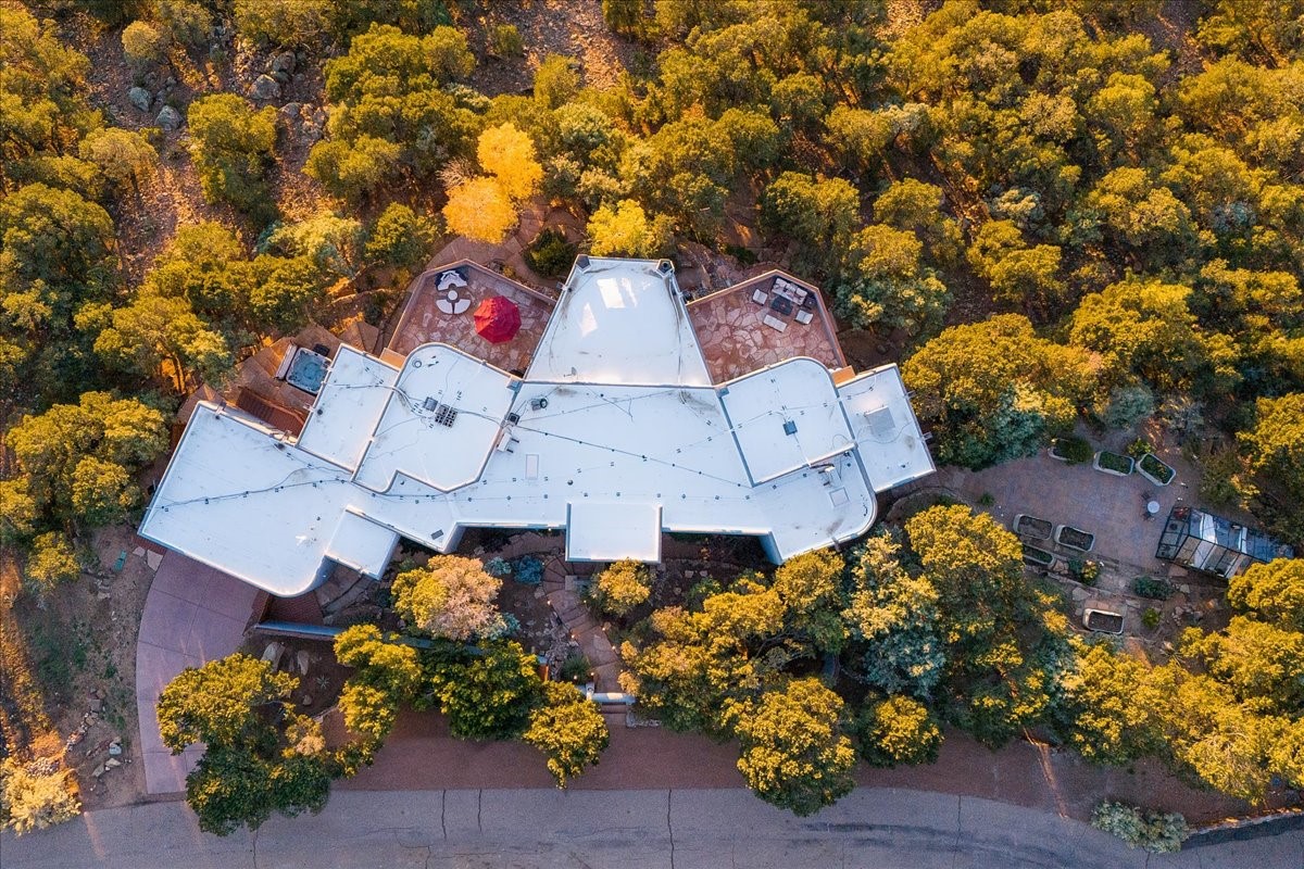 Whispering Hill--where nature's quiet beauty keeps its own gentle secrets. Set within Hyde Park Estates, this architectural statement captures panoramic vistas that are rare even for Santa Fe--a dramatic sweep of horizon, sculpted mountains, and ever-changing light. Designed with a flexible five-bedroom layout, Whispering Hill offers versatility without sacrificing elegance. The main level functions as a complete living environment, ideal for those who prefer life without stairs. A tranquil primary suite, sophisticated gathering areas, and rare hardwood cabinetry set a tone of refined luxury from the moment you arrive. Throughout the residence, artisan ceilings--each one individually crafted--serve as sculptural centerpieces across both levels and extend to the outdoor entertaining terrace, where their artistry meets the surrounding landscape with extraordinary effect. The Media Room, anchored by a gigantic viewing screen, was envisioned for cinema, live sporting events, and immersive entertainment--an atmospheric space designed for true enjoyment. The lower level continues the architectural flow with a second primary suite and additional bedrooms, each offering direct outdoor access to terraces, pathways, and quiet corners of the landscape. Outdoor living expands with multiple areas to gather, including a radiant-heated portal, a GreenHouse, secluded seating spaces designed for unplugged relaxation, and a private hot tub positioned just outside one of the lower-level bedrooms--a serene vantage point for stargazing and quiet evenings. From the elevated main terrace, you can see 10,000 Waves, Santa Fe's renowned Japanese-inspired spa nestled among the pines. Across the grounds, irrigated landscaping enhances the natural contours of the site, ensuring year-round beauty, color, and ease of care. Climate comfort is thoughtfully supported by eight strategically placed mini-splits for individualized heating and cooling, working in tandem with the primary systems to ensure four-season comfort at altitude. A pre-listing home inspection has already been completed, offering added transparency and confidence for prospective buyers. Minutes from the Santa Fe Plaza, Whispering Hill is an exceptional choice for those seeking either a full-time luxury residence or an elevated secondary retreat. With premium upgrades far too numerous to list, rare materials, master craftsmanship, and one of Santa Fe's most compelling vantage points, Whispering Hill stands as a true Santa Fe masterpiece--a seamless fusion of design, nature, and elevated mountain living.