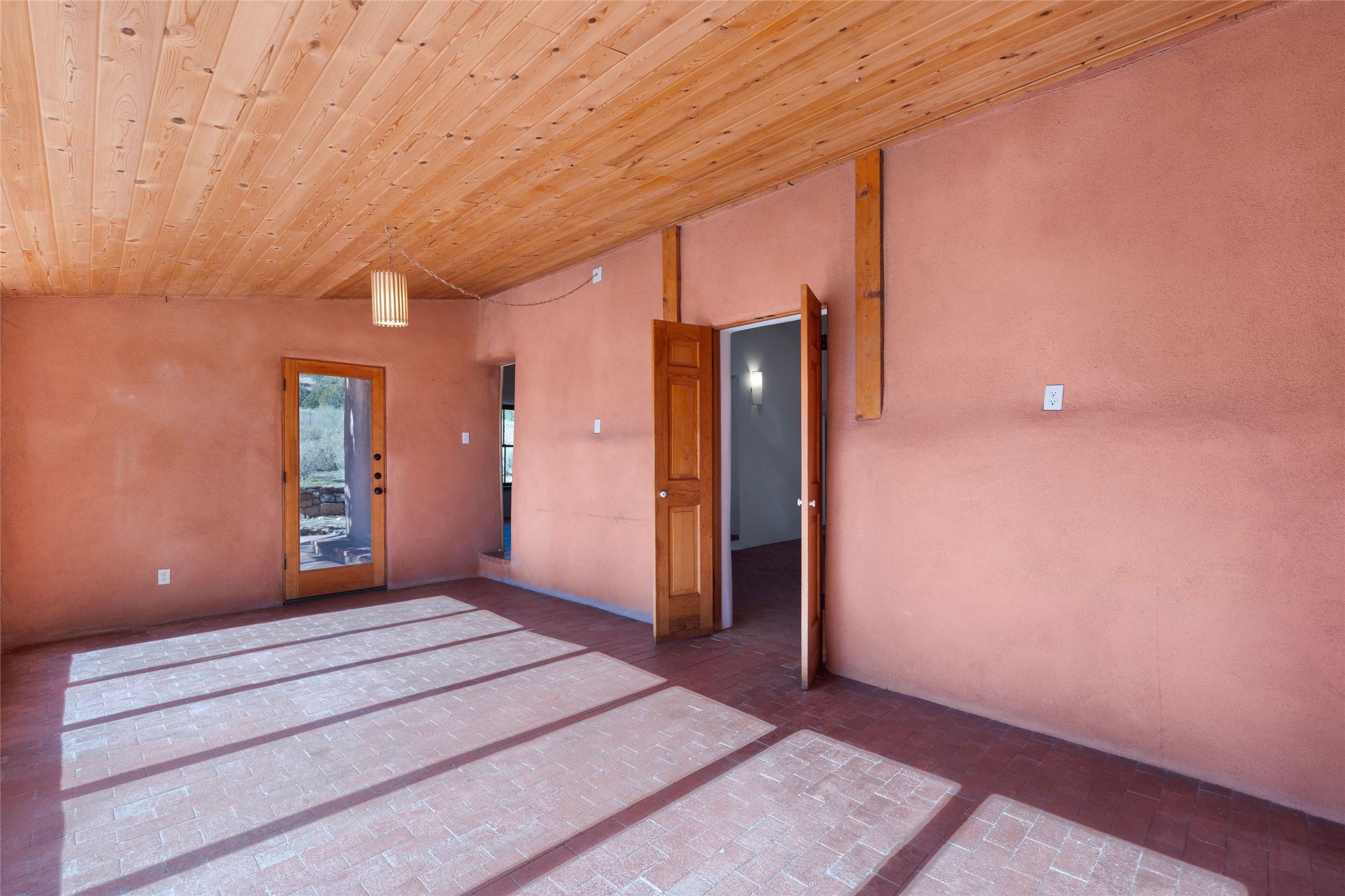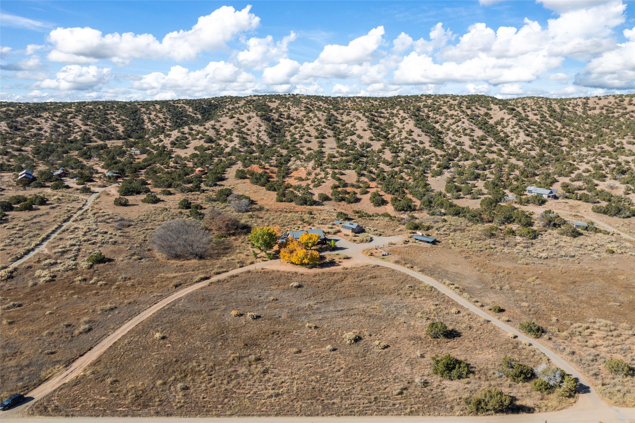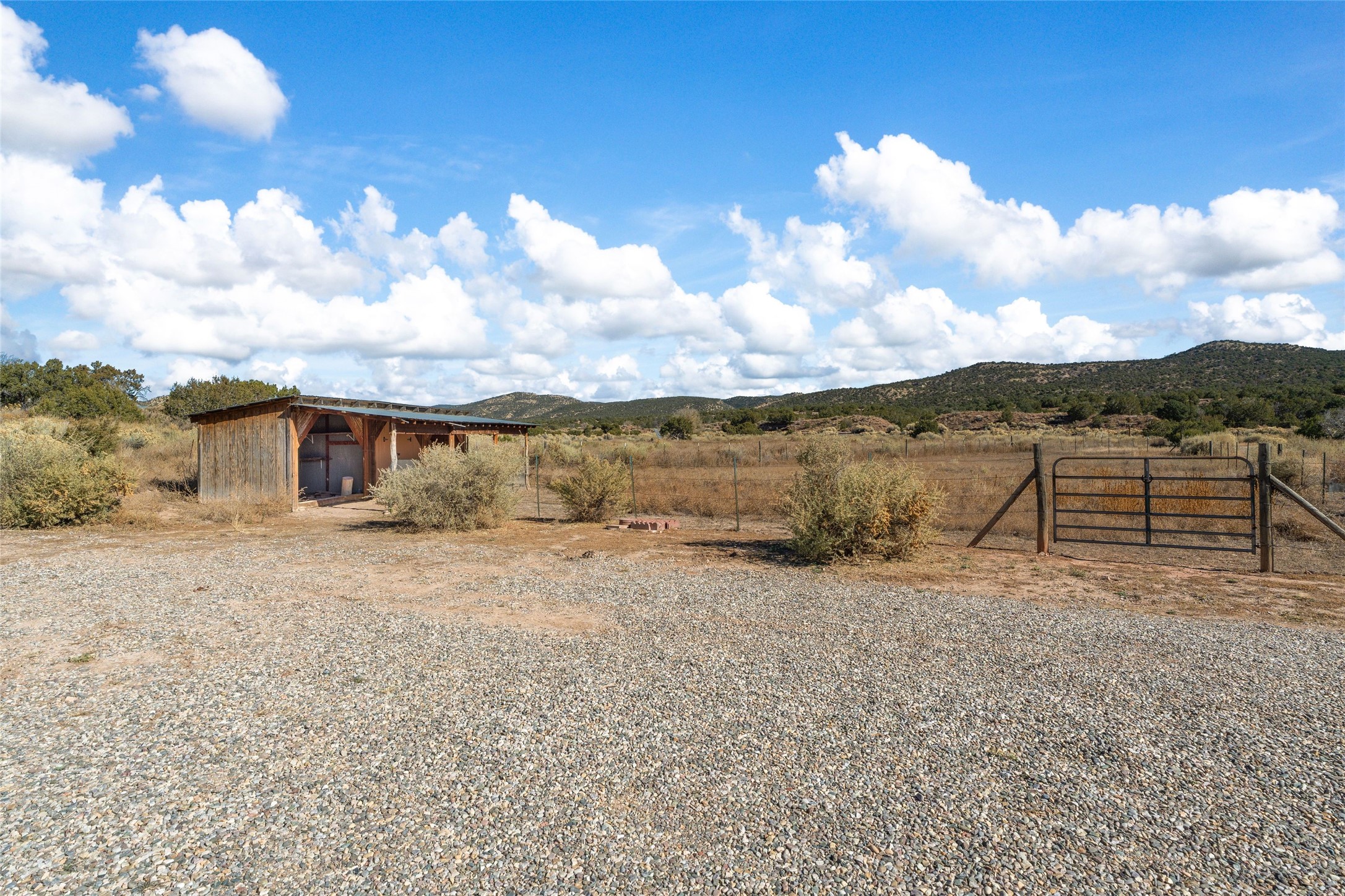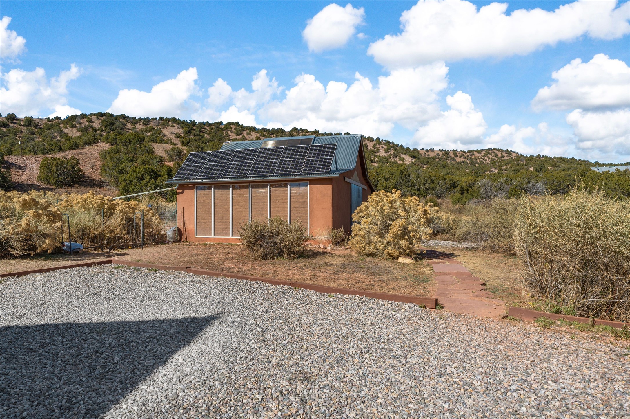 This Northern New Mexico style pitched roof mostly adobe dwelling with detached pitched roof adobe studio sits on 9 plus acres at the edge of the historic Lamy Village. This Karen Terry-designed and built, off the grid offering has three bedrooms and three full bathrooms. The main house has a dramatic entry hall, a high ceilinged-living room with vigas and a fireplace, a large sun room for passive solar gain and a roomy eat-in kitchen with slab granite counter tops and a wood stove. The first level has brick floors with oak flooring in one bedroom and the upstairs bedroom. An outside staircase takes one to the private third bedroom and full bath on the second level. The detached studio is heated, has a brick floor, running water and houses the generator for back-up electricity. In addition, there is a two-stall run in barn with tack/feed storage. The front of the house and the portal are cottonwood-shaded and there is a large stand of old oaks near the back of the house. Water is supplied by a shared well. There is also a roof-sourced water catchment system with approximately 4500 gallons of storage.