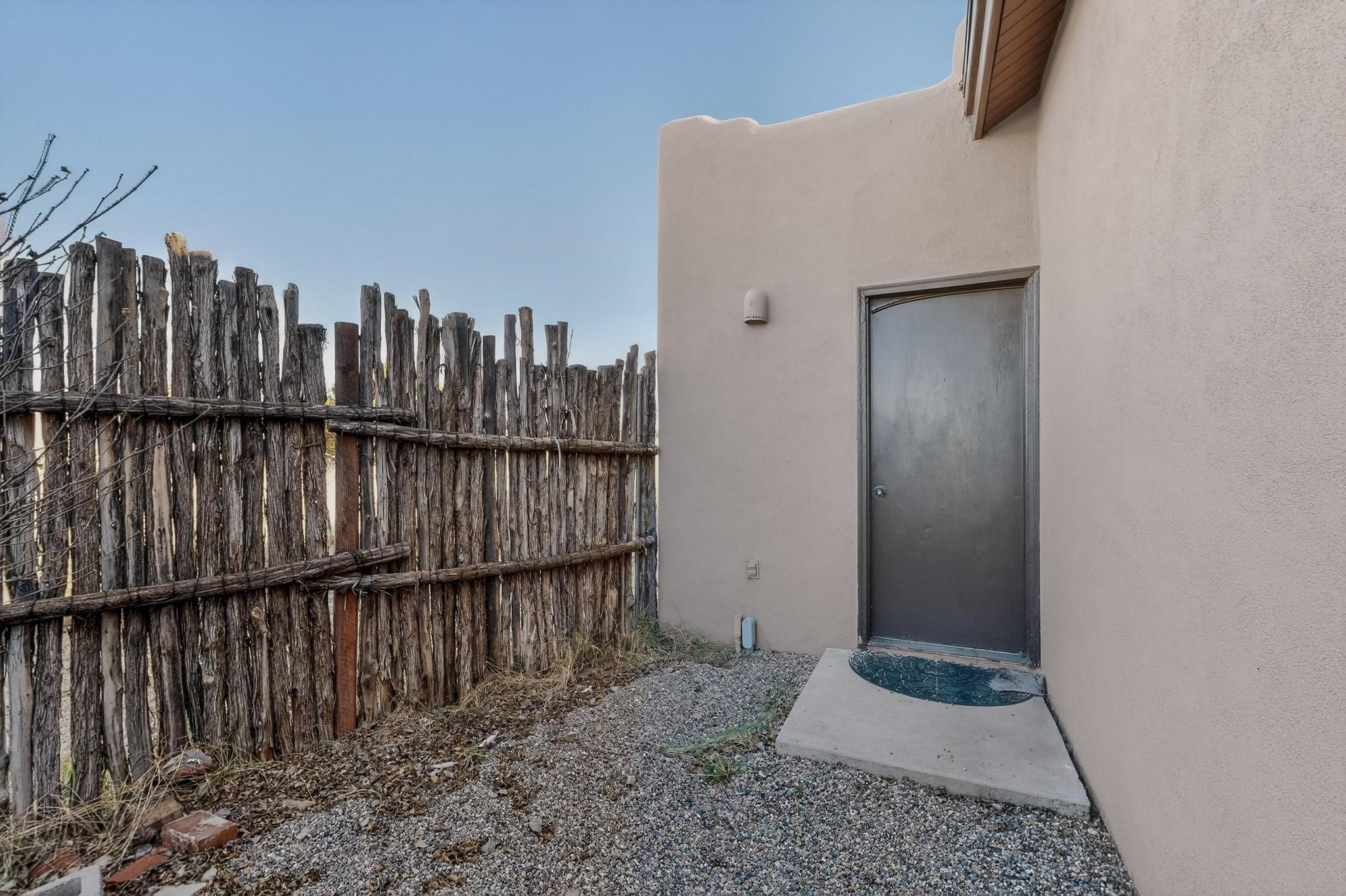 Open plan, split bedroom passive solar Eldorado cottage custom built by Santa Fe Solar homes. Beam ceilings, gleaming saltillo tile floors, a traditional kiva fireplace creates the Santa Fe ambience and warmth of character. Filled with sunlight this single level home has no steps to negotiate and flows easily from great room to kitchen/dining areas. The polybutylene radiant heating system is supplemented by mini splits which add a layer of comfortable air conditioning for summer cool. The main bedroom flows to a deck with hot tub and the guest bedroom is separated by the living areas for ultimate privacy. There is a separate study/ den with a vaulted ceiling which flows to a privately fenced rear yard and a summer enclosed atrium. There is 2 car garage plus plenty of guest parking. This home is located on the west side of Eldorado close to paved road and has access to all Eldorado amenities, close to local shopping centers and is within easy reach to Santa Fe.