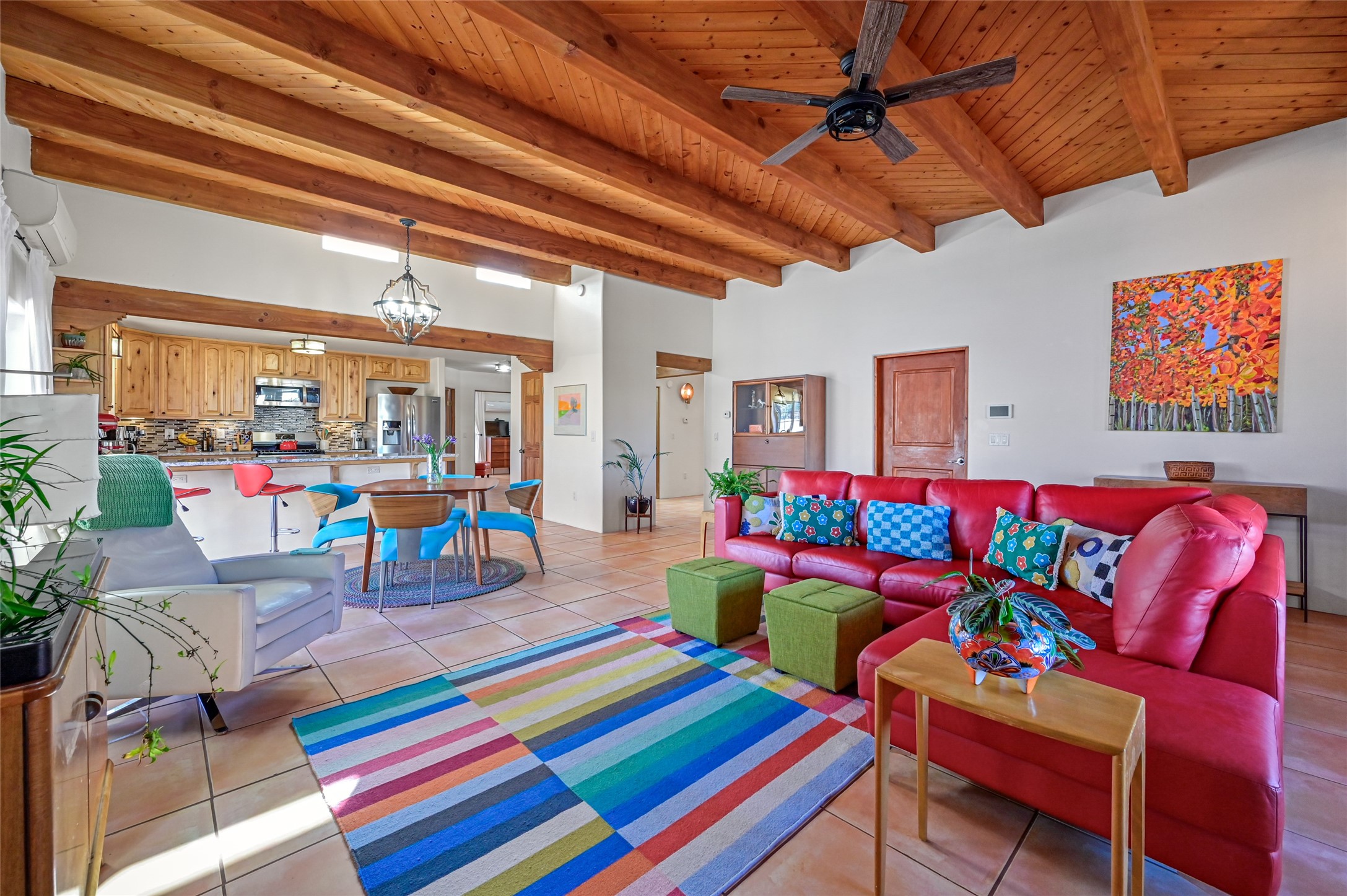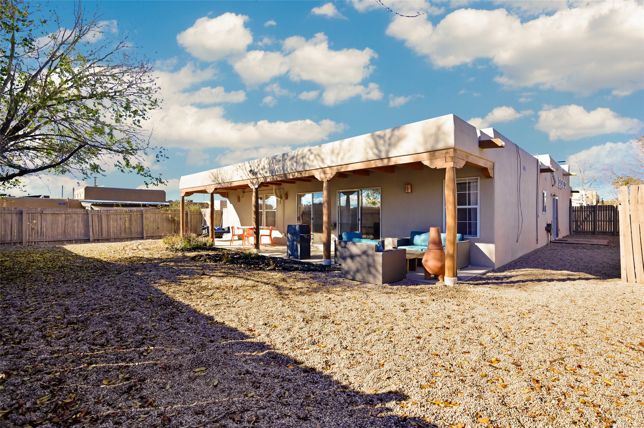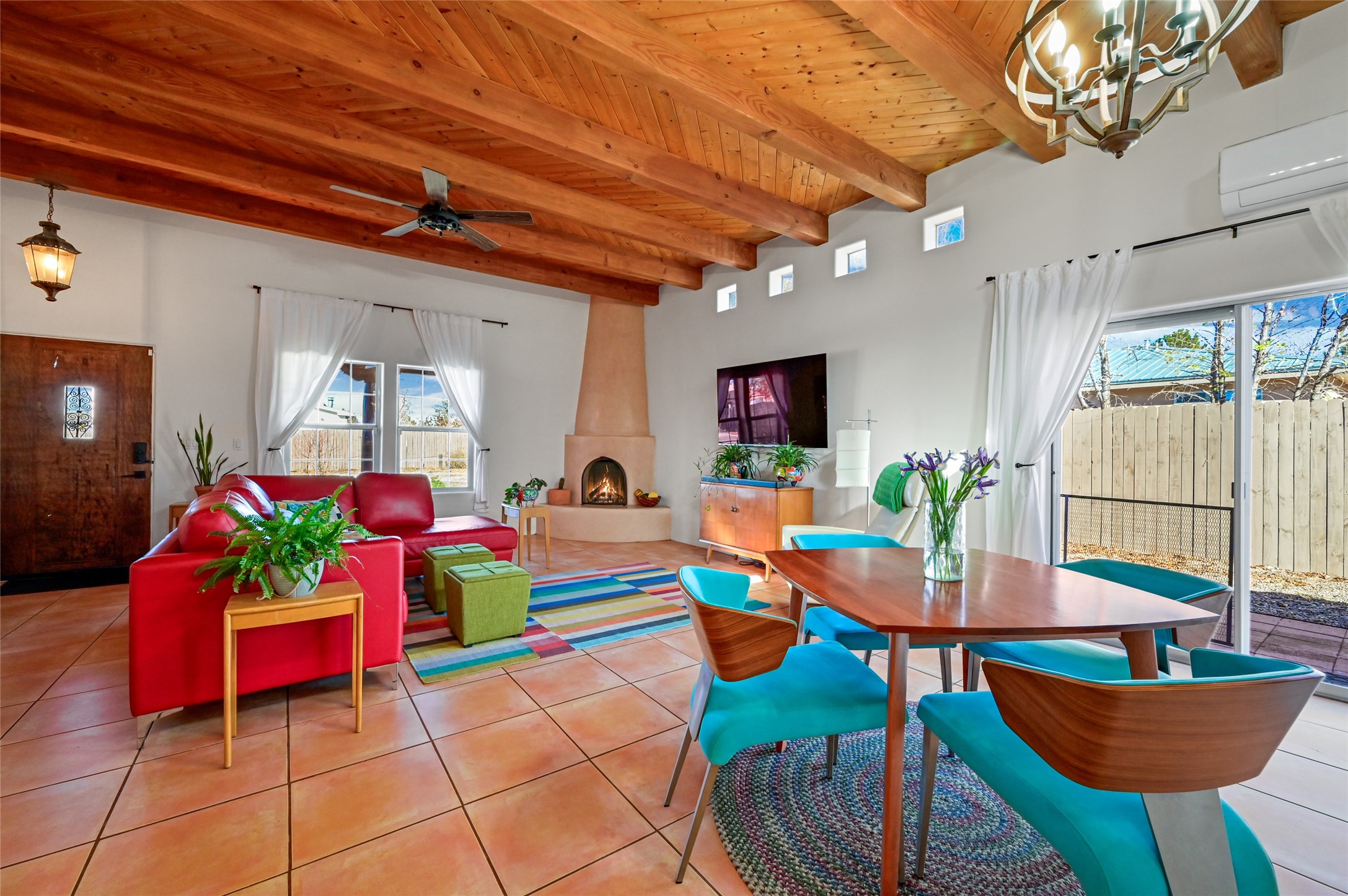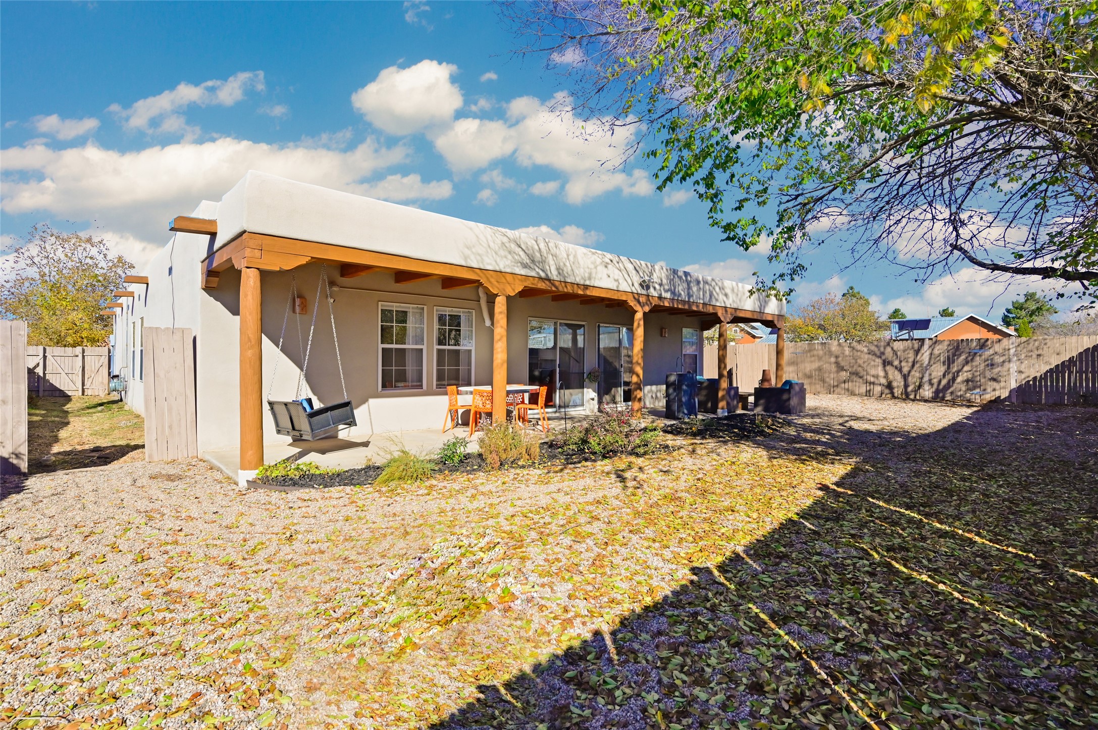 You will be delighted the minute you walk into this move in ready gem. Loaded with Santa Fe style, yet with all the modern touches, tile floors, mini-splits, granite counters, SS appliances. The open flow from living area to dining room and kitchen is perfect for gatherings with family and friends. The Owner's suite and oversized second bedroom are situated allowing for access to enjoy the backyard covered patio. The location is central to trails, shopping, the plaza, and fine dining, and located just down the street you can enjoy the neighborhood park. Once you see this home, I think you will agree it has a lot to offer.