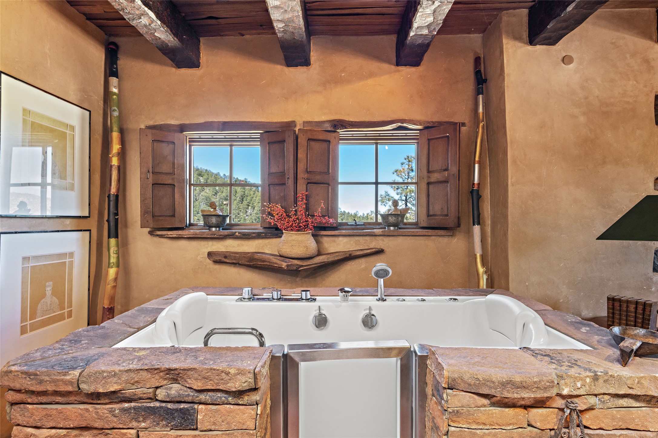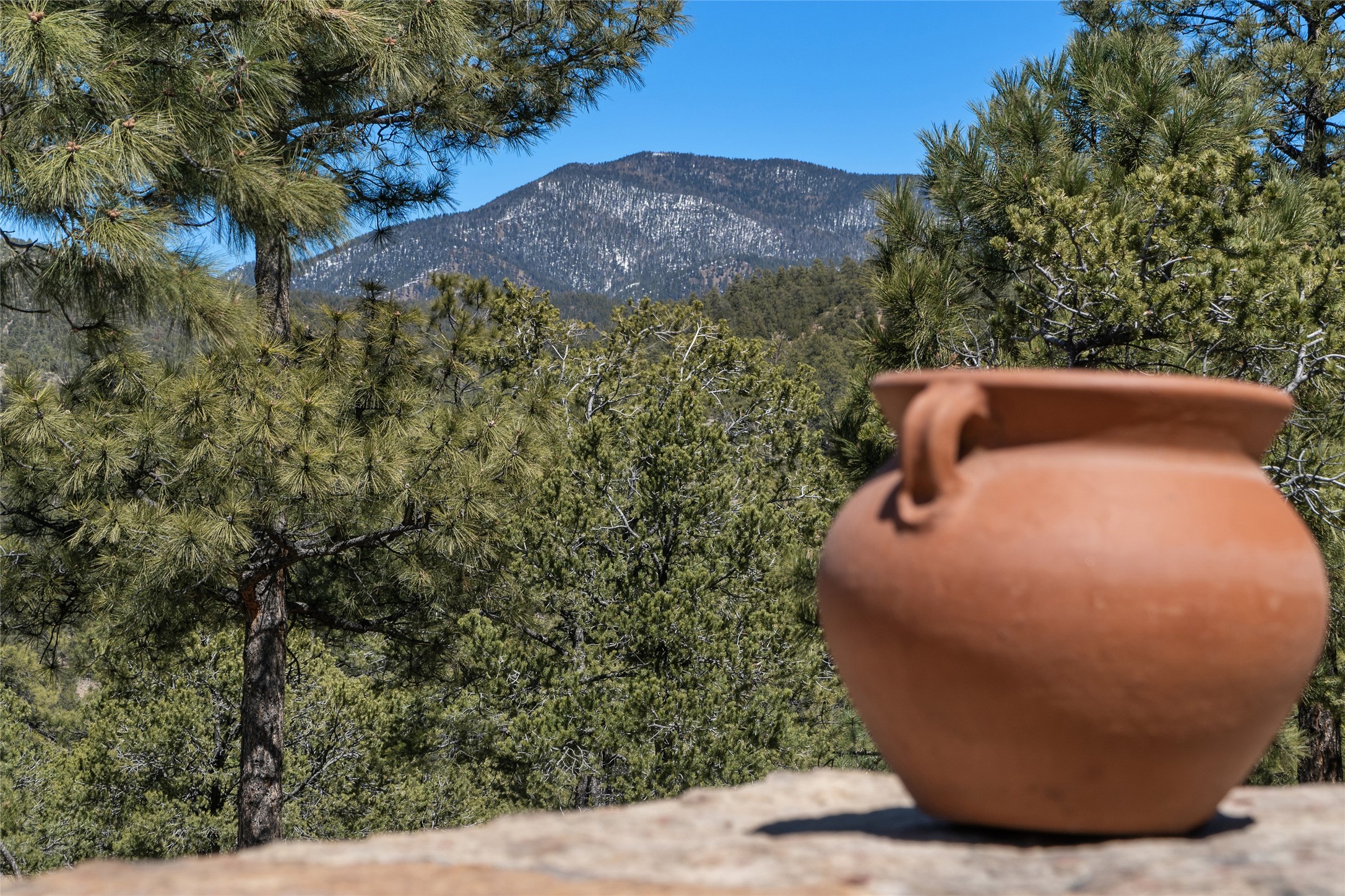 The ultimate hideaway home in Santa Fe High in the pines, fresh flower blooms, verdant grape vines and full apricots fruits beckon you to discover the bit of paradise. You are above allergies, crowds and pollution here. Through these doors, discover what is arguably the finest example of a Colonial Pueblo home in New Mexico atop very private mountain location with all the stars at night and your days filled with beautiful views. Thoughtfully designed, it boasts the finest finishes, hand-plastered double thick adobe walls, hand-carved beams with a massive 36 foot long 160-year-old Amish beam and hand carved 3 1/2 " thick doors from around the world. Windows trimmed with massive native rock, 8 heart-warming fireplaces and radiant-heated brick flooring. The spacious open floor plan features a chef's kitchen with 16 Sub-Zero drawers, Wolf appliances and an 18-foot island. Two elegant bedroom suites are well separated for privacy. An attached casita office/third en-suite bedroom offers work or guest accommodations. Spacious portals are everywhere. Gated access provides privacy and security. Three lucky vehicles are sheltered in an oversized garage with adaptable work areas. Enjoy nature and wildlife on the hiking and walking trails. This is a magical Santa Fe escape and an opportunity not to be missed just 15 minutes from the town center. Truly special.