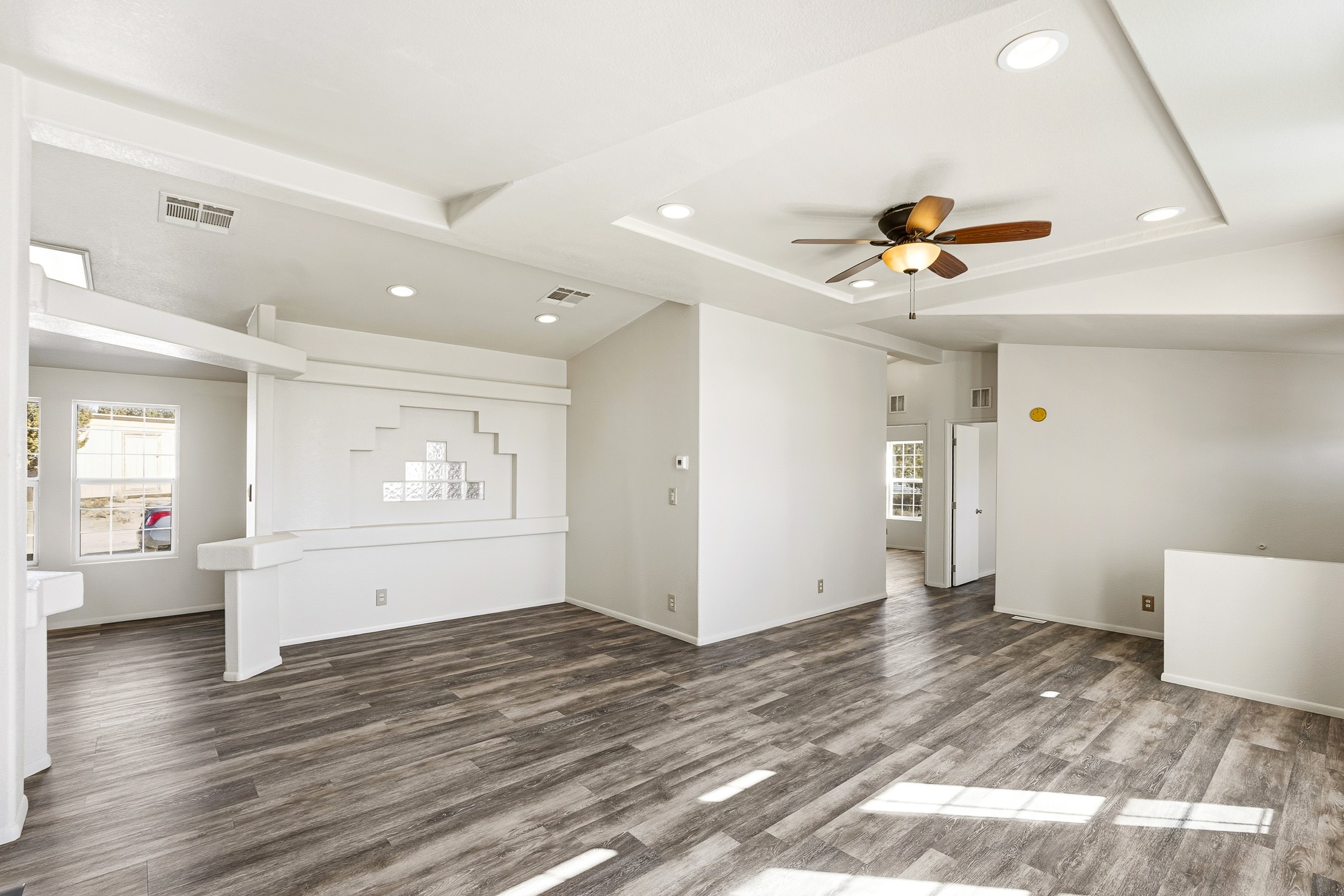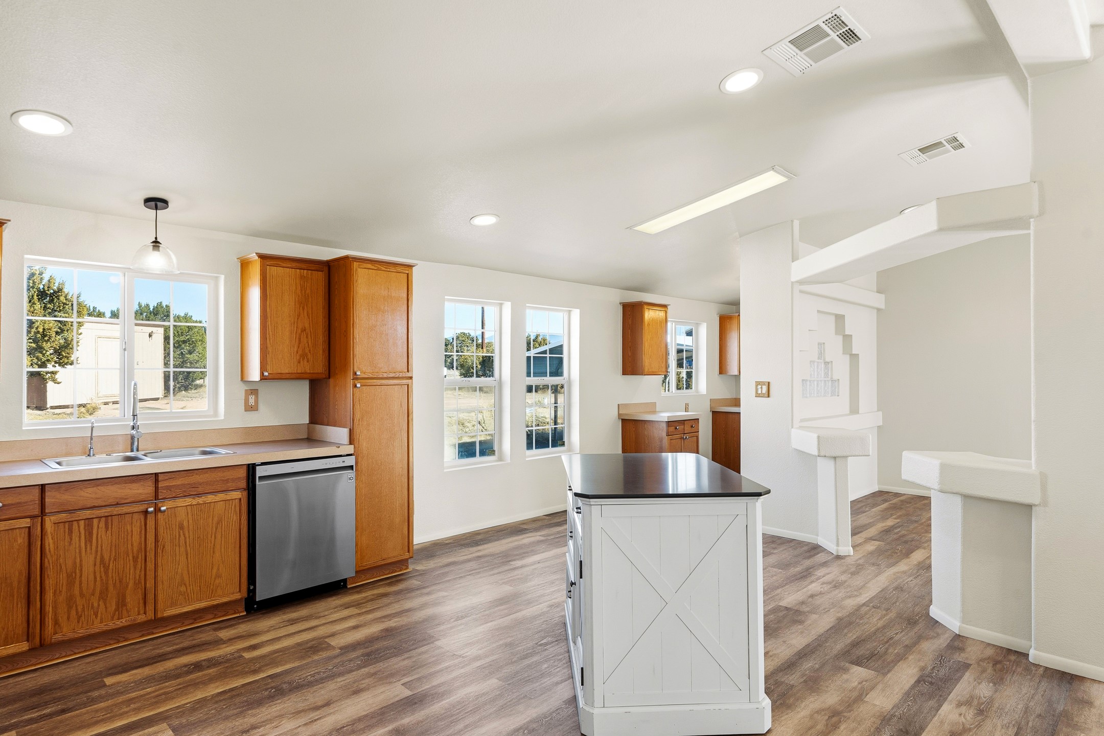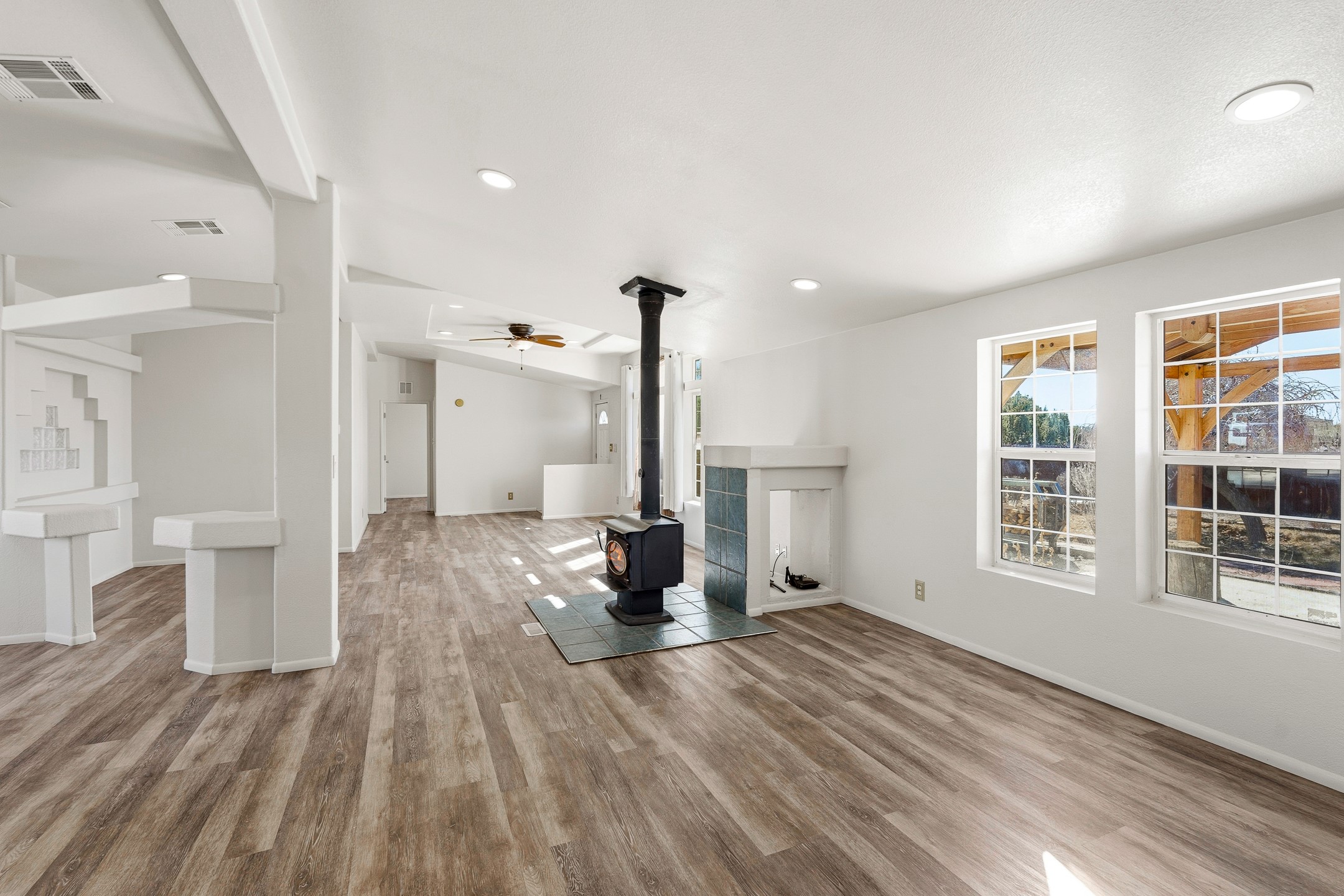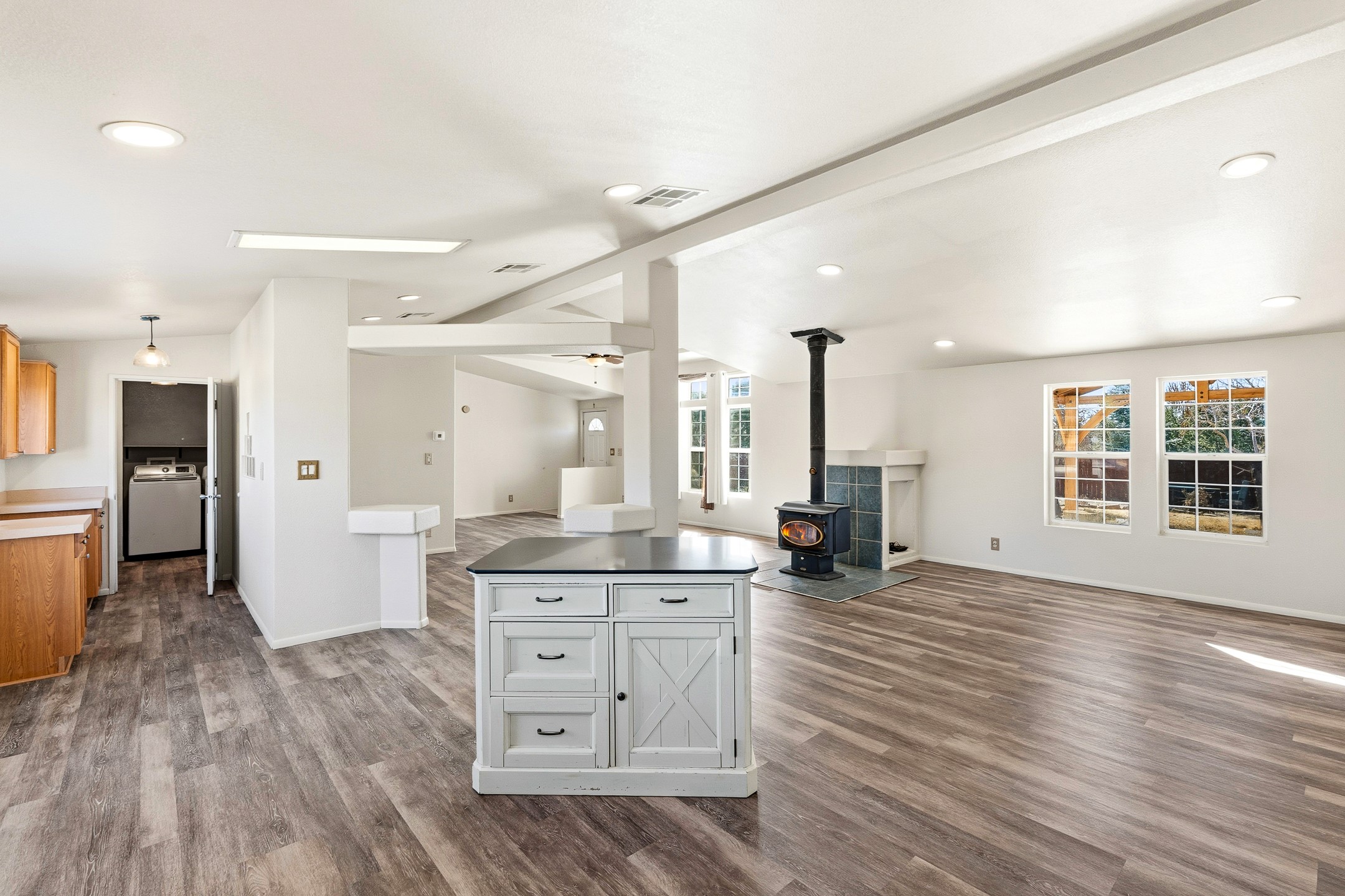 Peaceful private home in a rural setting with easy access to amenities and downtown Santa Fe. Enclosed front yard, metal roofing, refrigerated ac. Large new shop building for all your creative activities and storage. Large lot is fully fenced for your privacy and enjoyment.