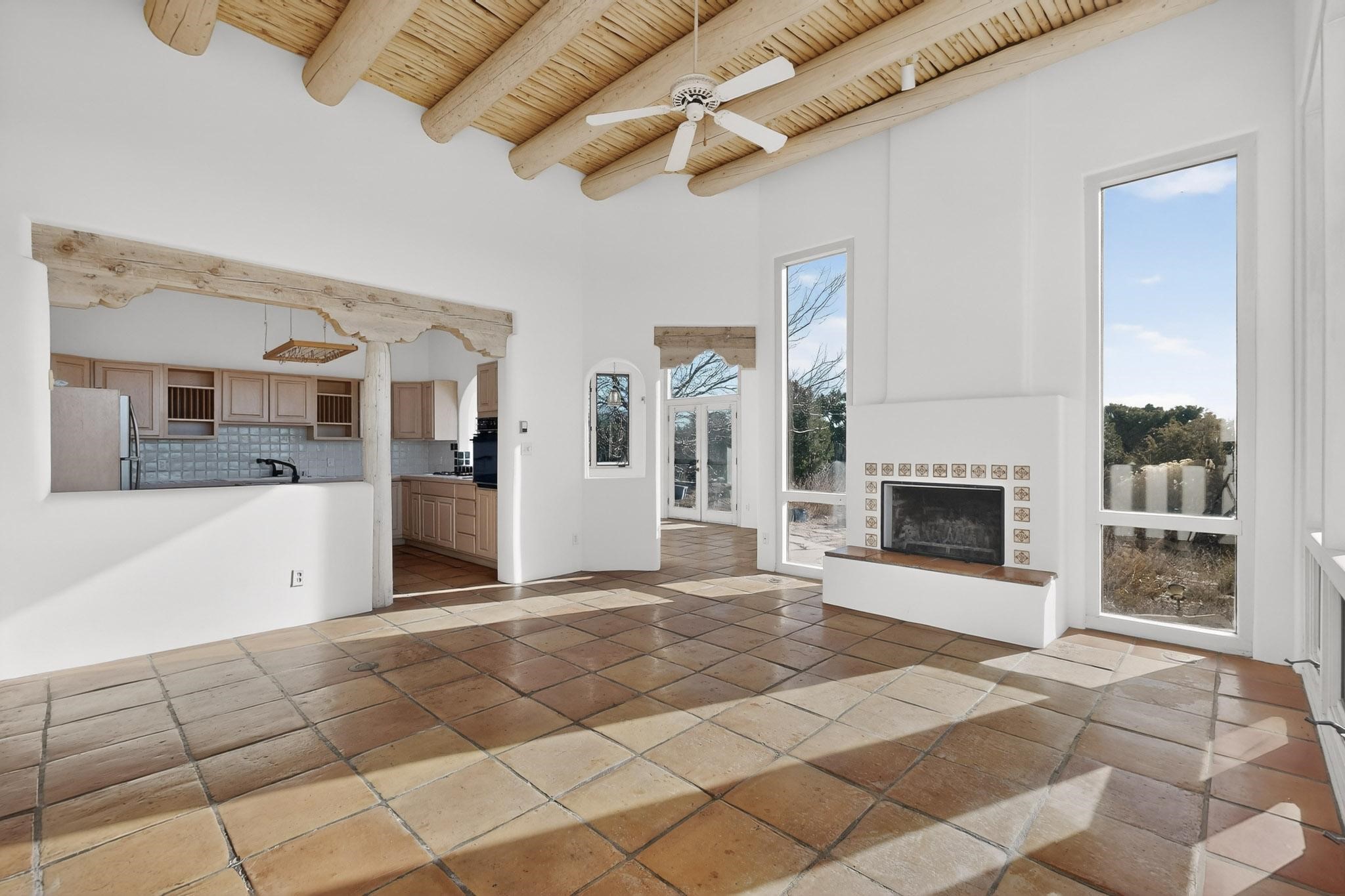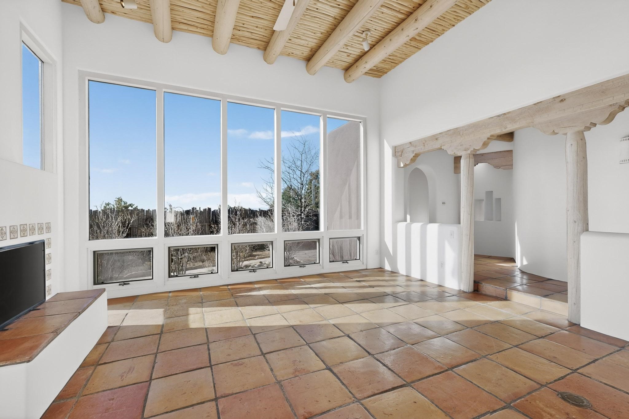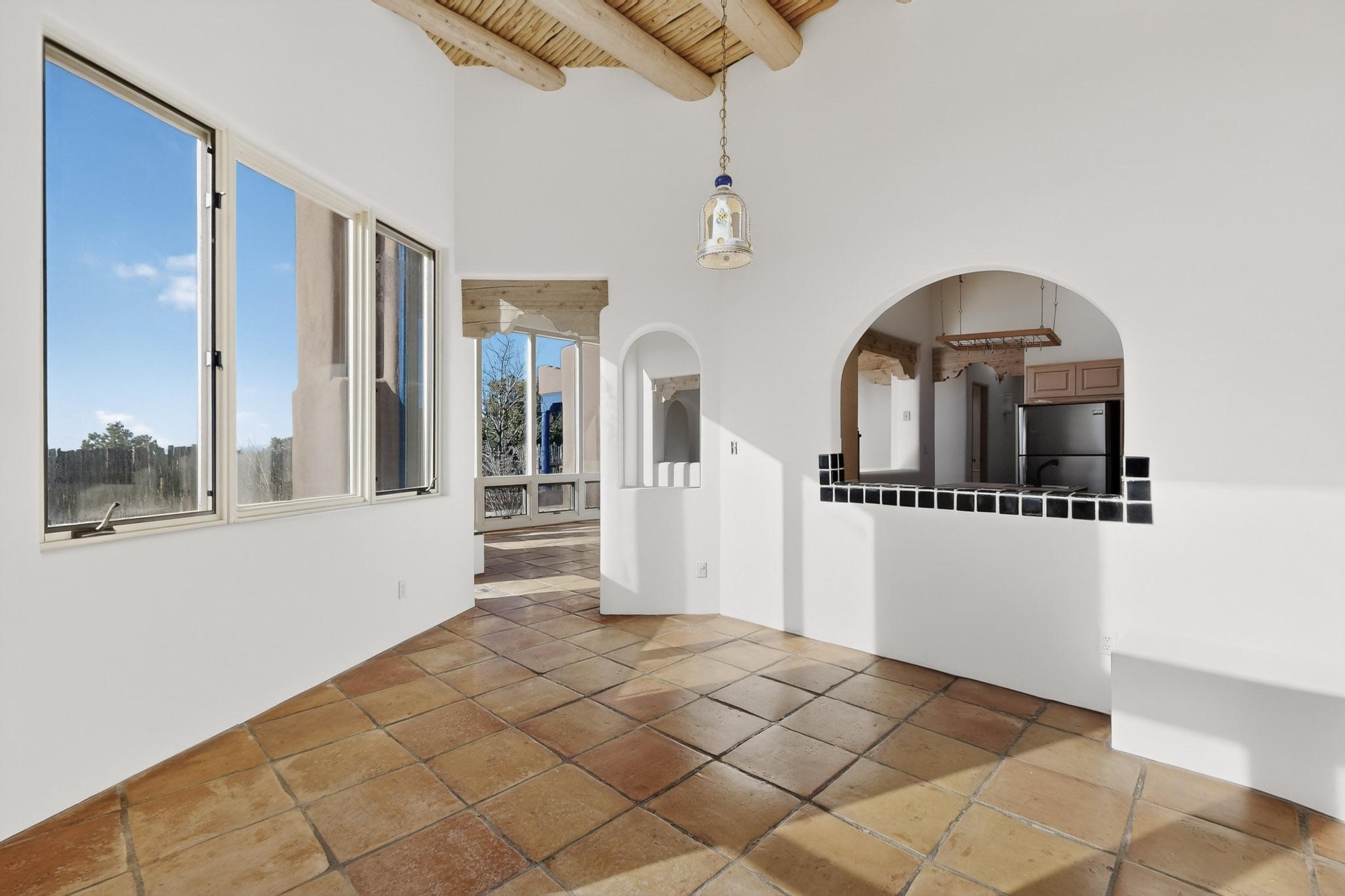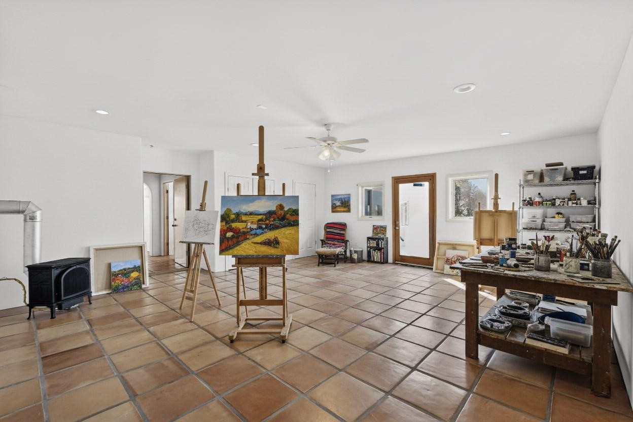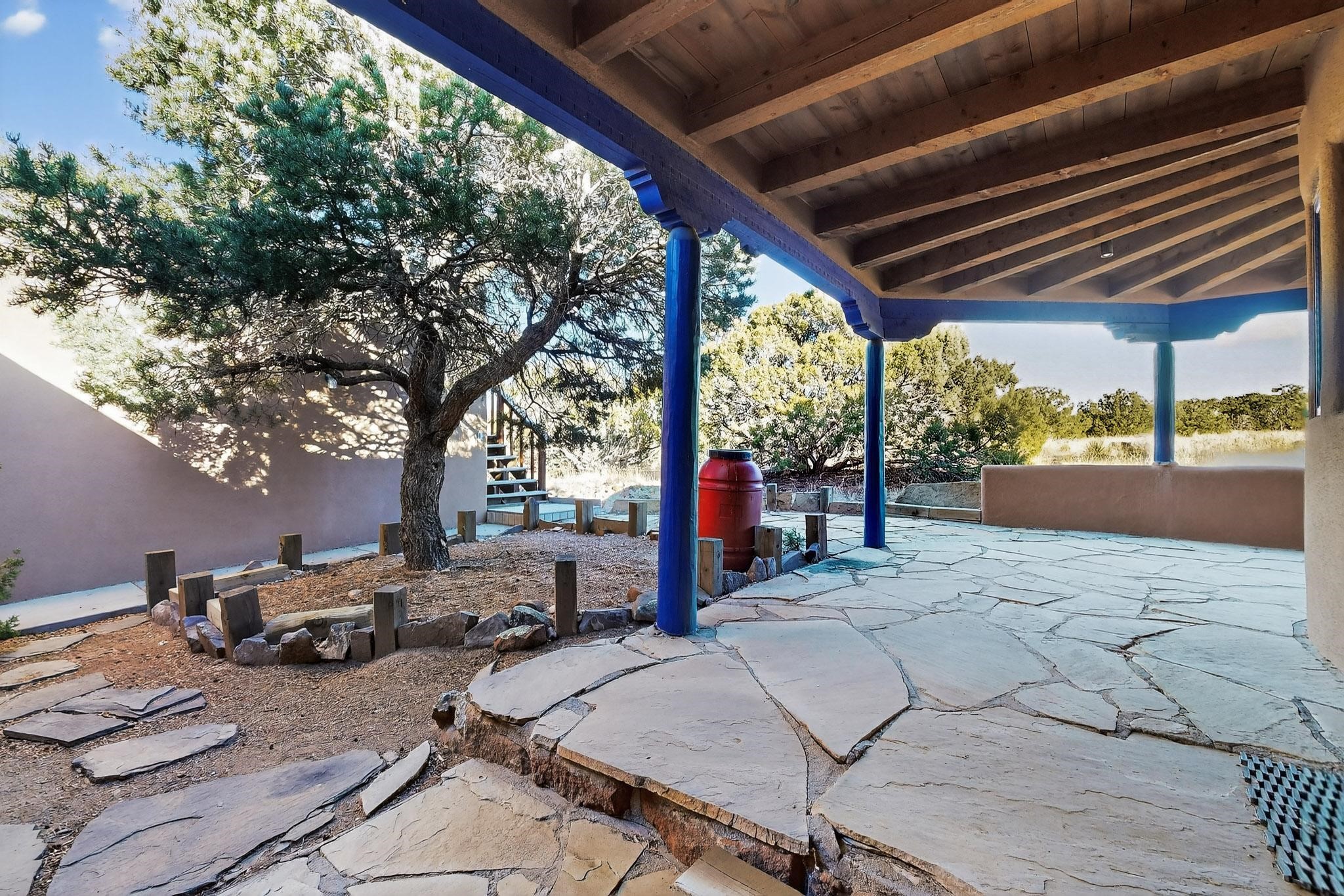 Lovely Eldorado home, situated on an expansive and beautifully landscaped almost 2-acre lot, is filled with natural light and exudes Santa Fe charm. Enjoy panoramic mountain views and amazing sunsets from inside the home and multiple outdoor areas enclosed by coyote fencing and flagstone walk-ways. Offering 2 bedrooms and 2 bathrooms with approximately 2800 square feet, the home features versatile areas perfect for a range of uses. A heated flex space (with gas stove) with appx 390 sqft, separate entrance and direct access to the home provides the ideal setting for a studio, office, workout room, or playroom. Off the spacious primary suite, you'll find a cozy office or sitting room with built-in desk space, as well as a large, light-filled appx 550 sqft unheated room with direct outdoor access--perfect as a work-out room, sitting/TV area, or relaxation space. There is ample storage throughout. The inviting living room boasts soaring ceilings with vigas, a kiva fireplace, and abundant natural light. The owner's suite includes a fireplace and ensuite bath with separate tub and large walk-in show all offering a serene retreat. Car enthusiasts will love the oversized garage (approx. 1,365 sq ft) with room for up to six cars & possibly an RV. Additional highlights include: 4 fireplaces-Abundant skylights-Radiant heat (we have been told not Kitec or Entran II)-Wood doors-Large laundry room with closet & washer/dryer-Saltillo tile floors-Rooftop viewing deck-Vigas in almost every room including bathrooms-Nichos-Banco-Corbels-Archways-Ceiling fans-Newly paved Frasco Rd-Multiple decks and sitting areas and more. This unique property combines Southwestern character with extraordinary versatility and spectacular views.