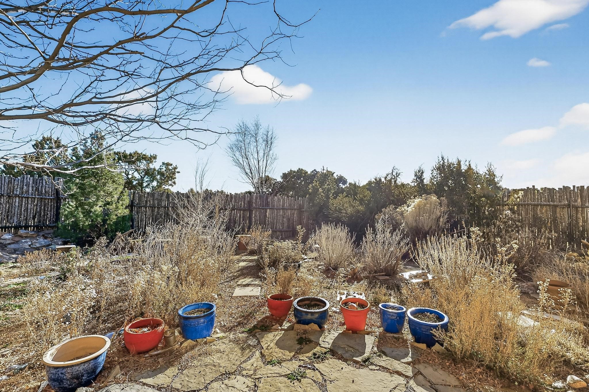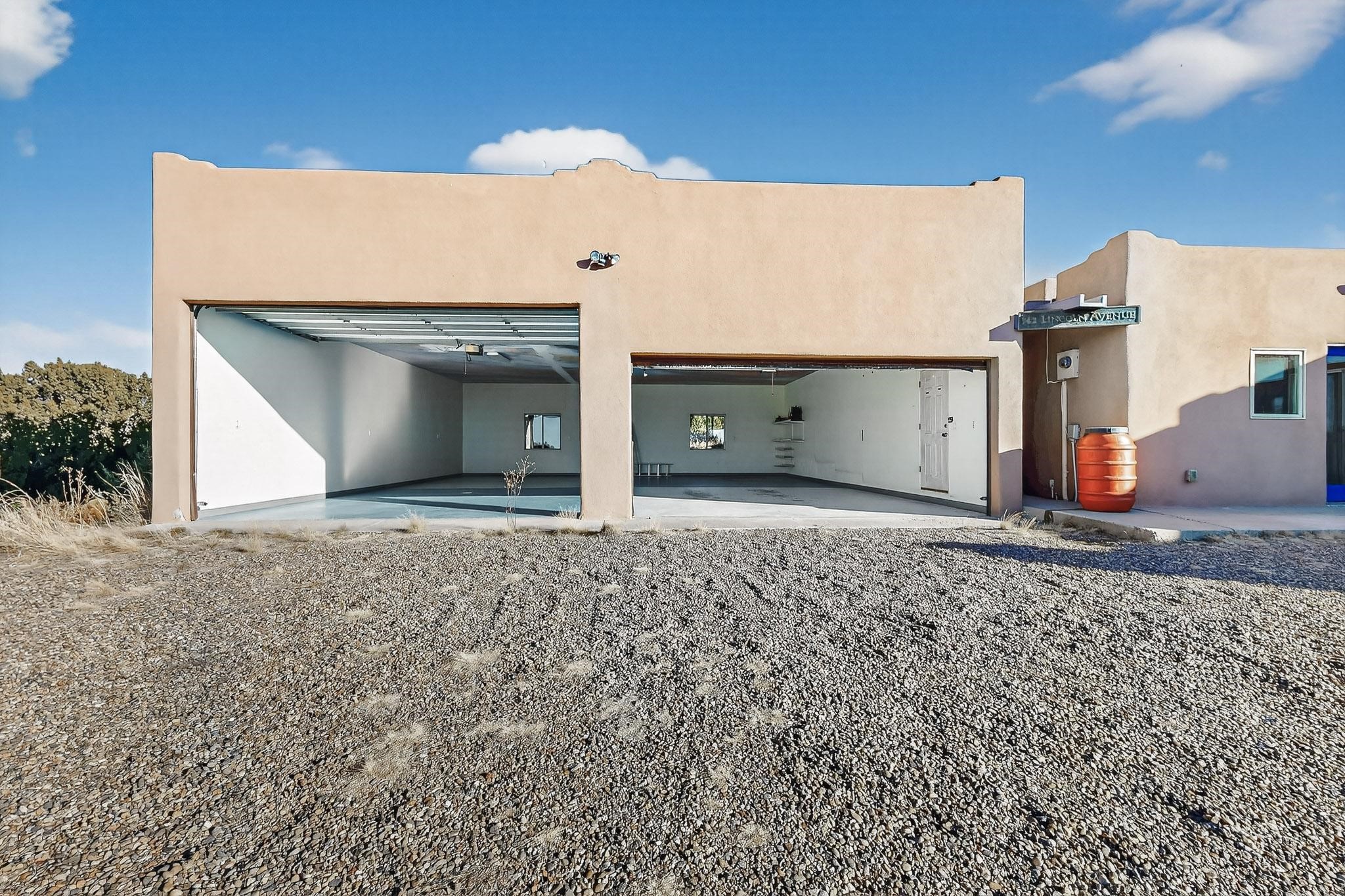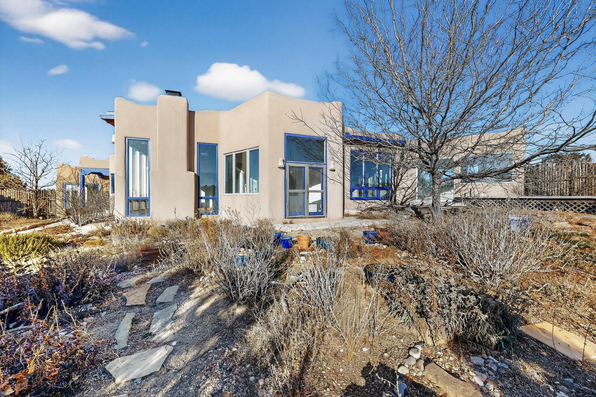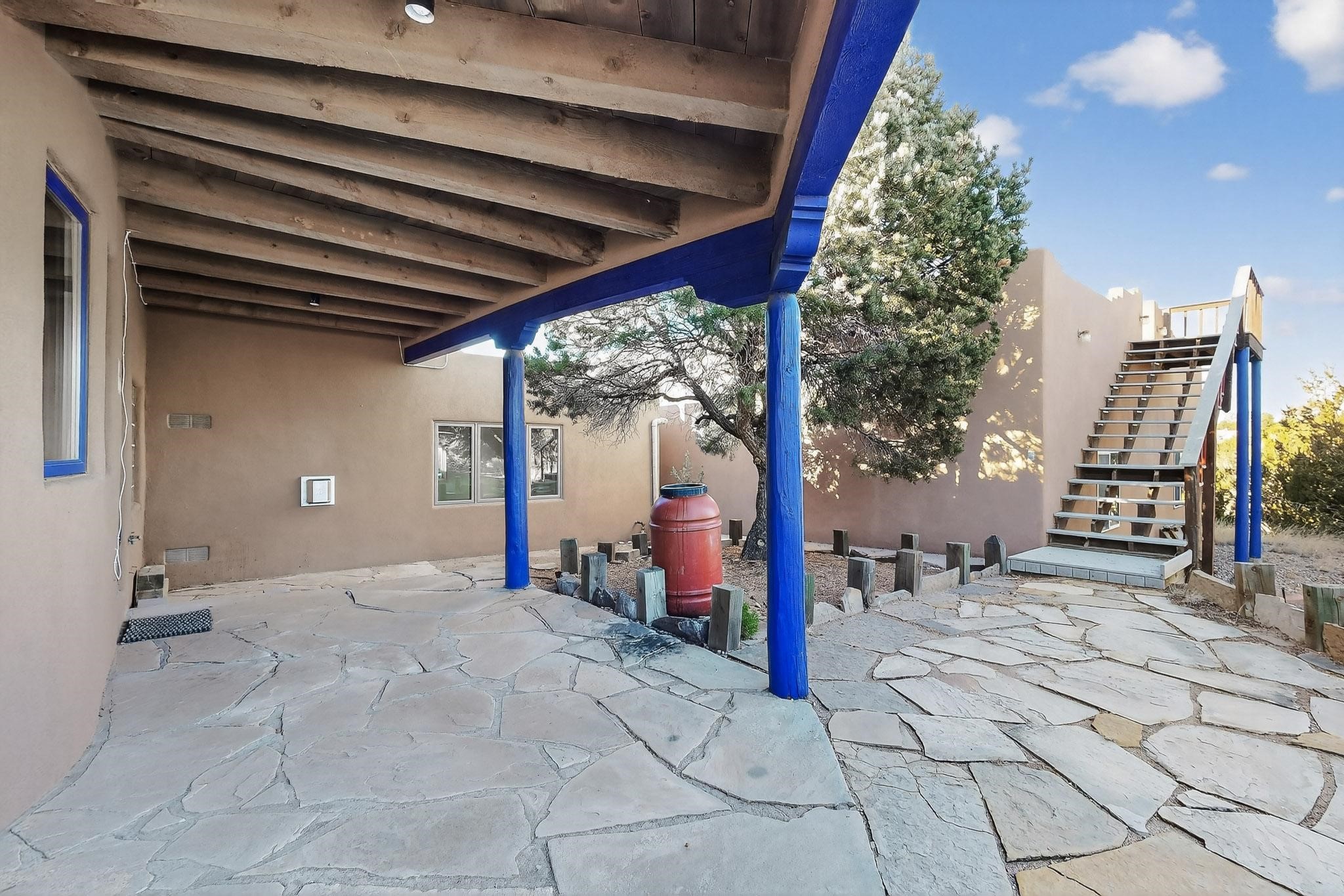 Lovely Eldorado home, situated on an expansive and beautifully landscaped almost 2-acre lot, is filled with natural light and exudes Santa Fe charm. Enjoy panoramic mountain views and amazing sunsets from inside the home and multiple outdoor areas enclosed by coyote fencing and flagstone walk-ways. Offering 2 bedrooms and 2 bathrooms with approximately 2800 square feet, the home features versatile areas perfect for a range of uses. A heated flex space (with gas stove) with appx 390 sqft, separate entrance and direct access to the home provides the ideal setting for a studio, office, workout room, or playroom. Off the spacious primary suite, you'll find a cozy office or sitting room with built-in desk space, as well as a large, light-filled appx 550 sqft unheated room with direct outdoor access--perfect as a work-out room, sitting/TV area, or relaxation space. There is ample storage throughout. The inviting living room boasts soaring ceilings with vigas, a kiva fireplace, and abundant natural light. The owner's suite includes a fireplace and ensuite bath with separate tub and large walk-in show all offering a serene retreat. Car enthusiasts will love the oversized garage (approx. 1,365 sq ft) with room for up to six cars & possibly an RV. Additional highlights include: 4 fireplaces-Abundant skylights-Radiant heat (we have been told not Kitec or Entran II)-Wood doors-Large laundry room with closet & washer/dryer-Saltillo tile floors-Rooftop viewing deck-Vigas in almost every room including bathrooms-Nichos-Banco-Corbels-Archways-Ceiling fans-Newly paved Frasco Rd-Multiple decks and sitting areas and more. This unique property combines Southwestern character with extraordinary versatility and spectacular views.