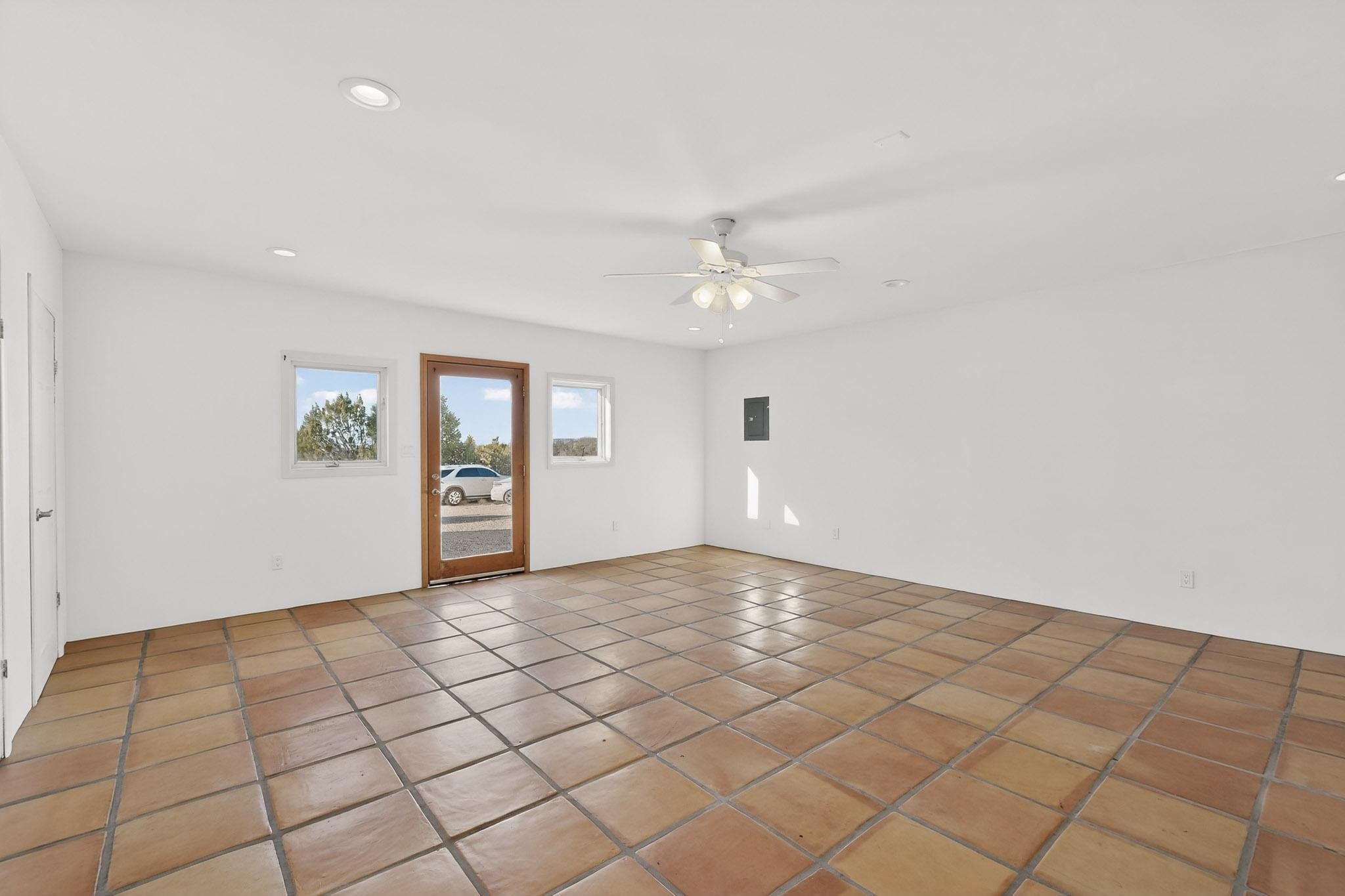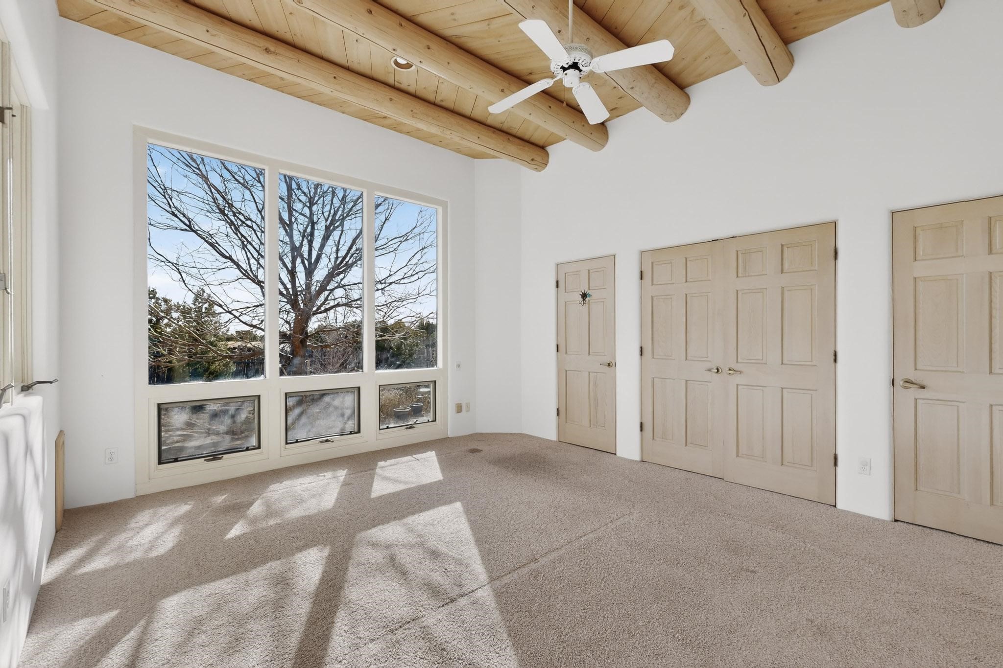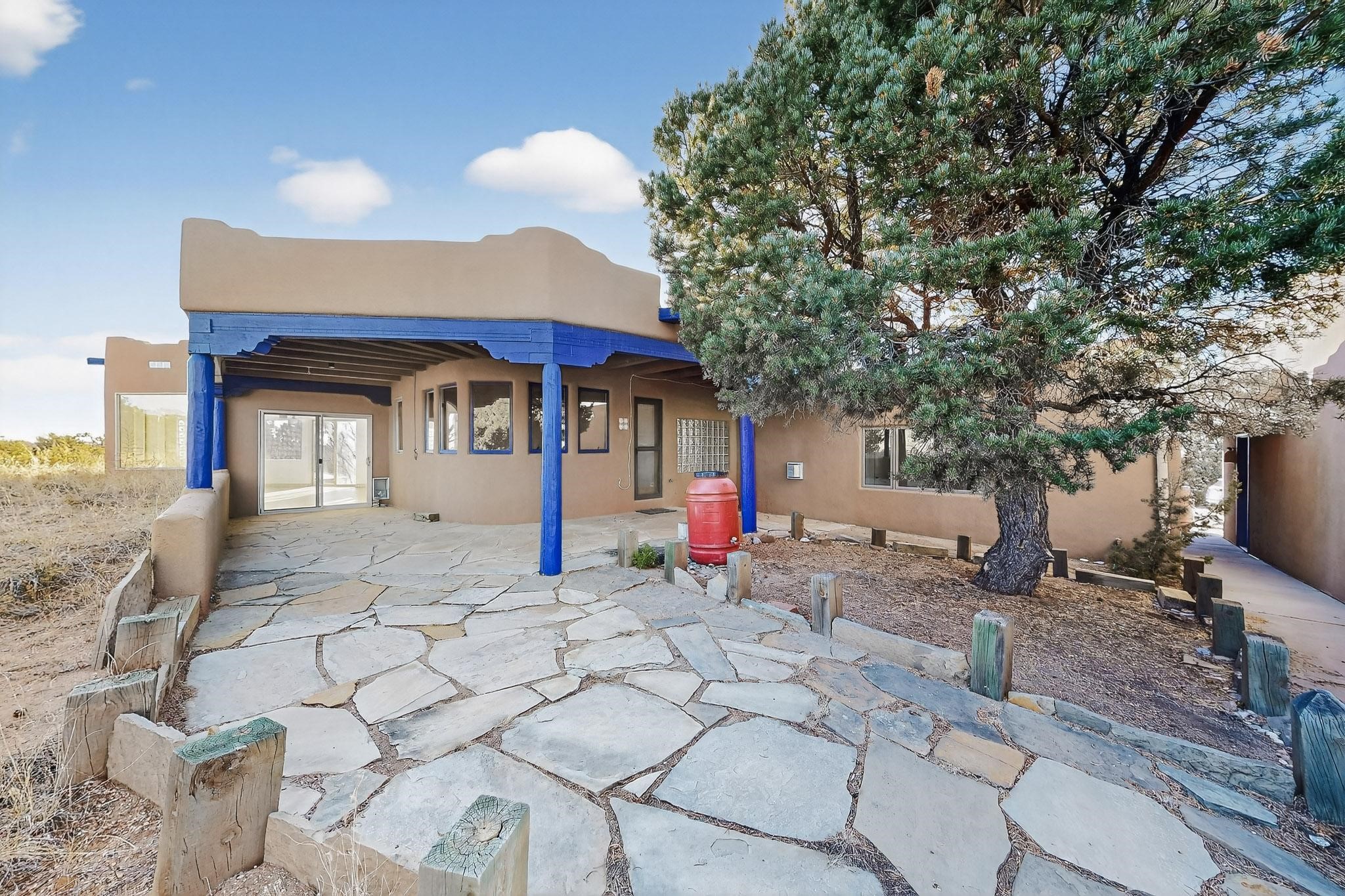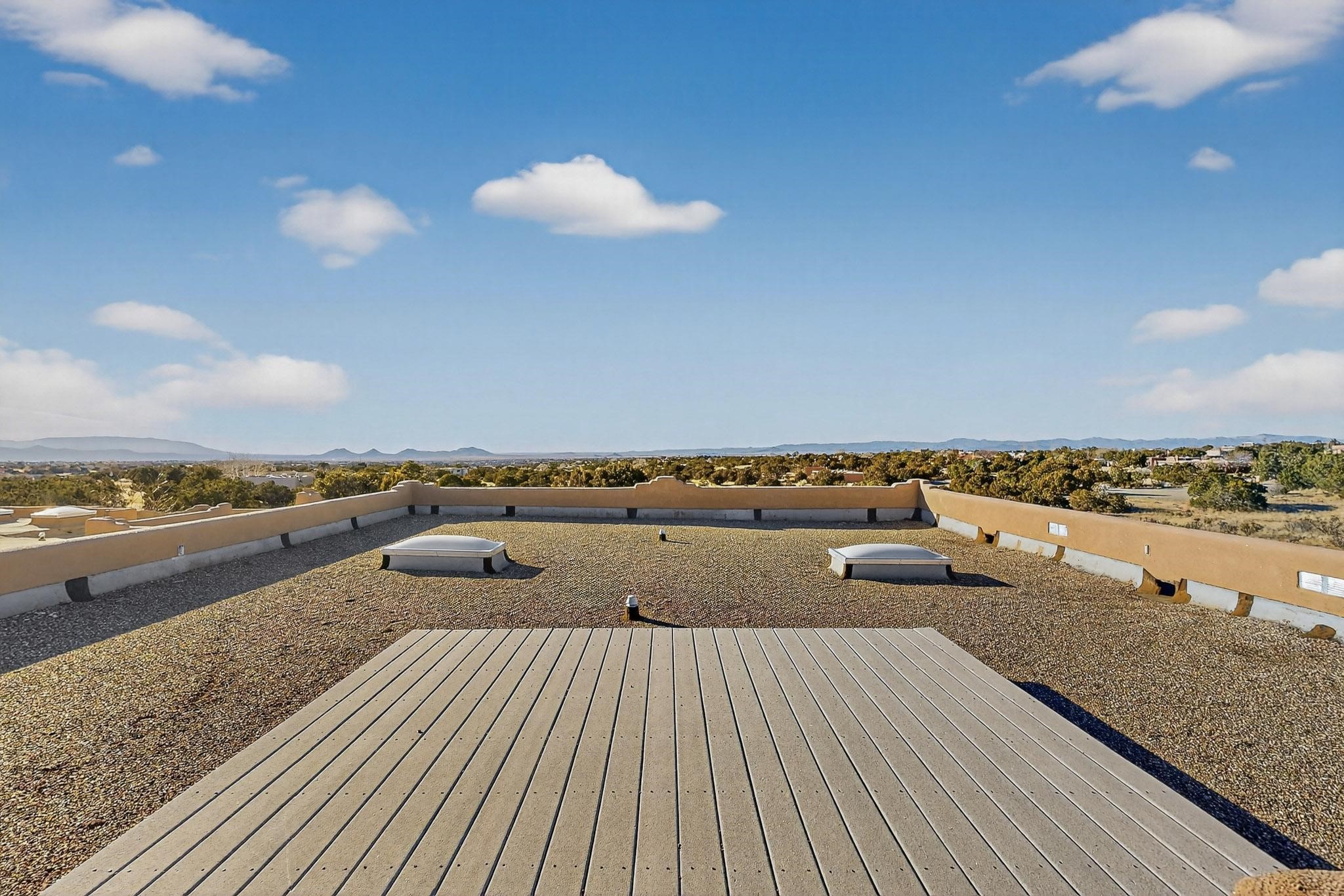 Lovely Eldorado home, situated on an expansive and beautifully landscaped almost 2-acre lot, is filled with natural light and exudes Santa Fe charm. Enjoy panoramic mountain views and amazing sunsets from inside the home and multiple outdoor areas enclosed by coyote fencing and flagstone walk-ways. Offering 2 bedrooms and 2 bathrooms with approximately 2800 square feet, the home features versatile areas perfect for a range of uses. A heated flex space (with gas stove) with appx 390 sqft, separate entrance and direct access to the home provides the ideal setting for a studio, office, workout room, or playroom. Off the spacious primary suite, you'll find a cozy office or sitting room with built-in desk space, as well as a large, light-filled appx 550 sqft unheated room with direct outdoor access--perfect as a work-out room, sitting/TV area, or relaxation space. There is ample storage throughout. The inviting living room boasts soaring ceilings with vigas, a kiva fireplace, and abundant natural light. The owner's suite includes a fireplace and ensuite bath with separate tub and large walk-in show all offering a serene retreat. Car enthusiasts will love the oversized garage (approx. 1,365 sq ft) with room for up to six cars & possibly an RV. Additional highlights include: 4 fireplaces-Abundant skylights-Radiant heat (we have been told not Kitec or Entran II)-Wood doors-Large laundry room with closet & washer/dryer-Saltillo tile floors-Rooftop viewing deck-Vigas in almost every room including bathrooms-Nichos-Banco-Corbels-Archways-Ceiling fans-Newly paved Frasco Rd-Multiple decks and sitting areas and more. This unique property combines Southwestern character with extraordinary versatility and spectacular views.