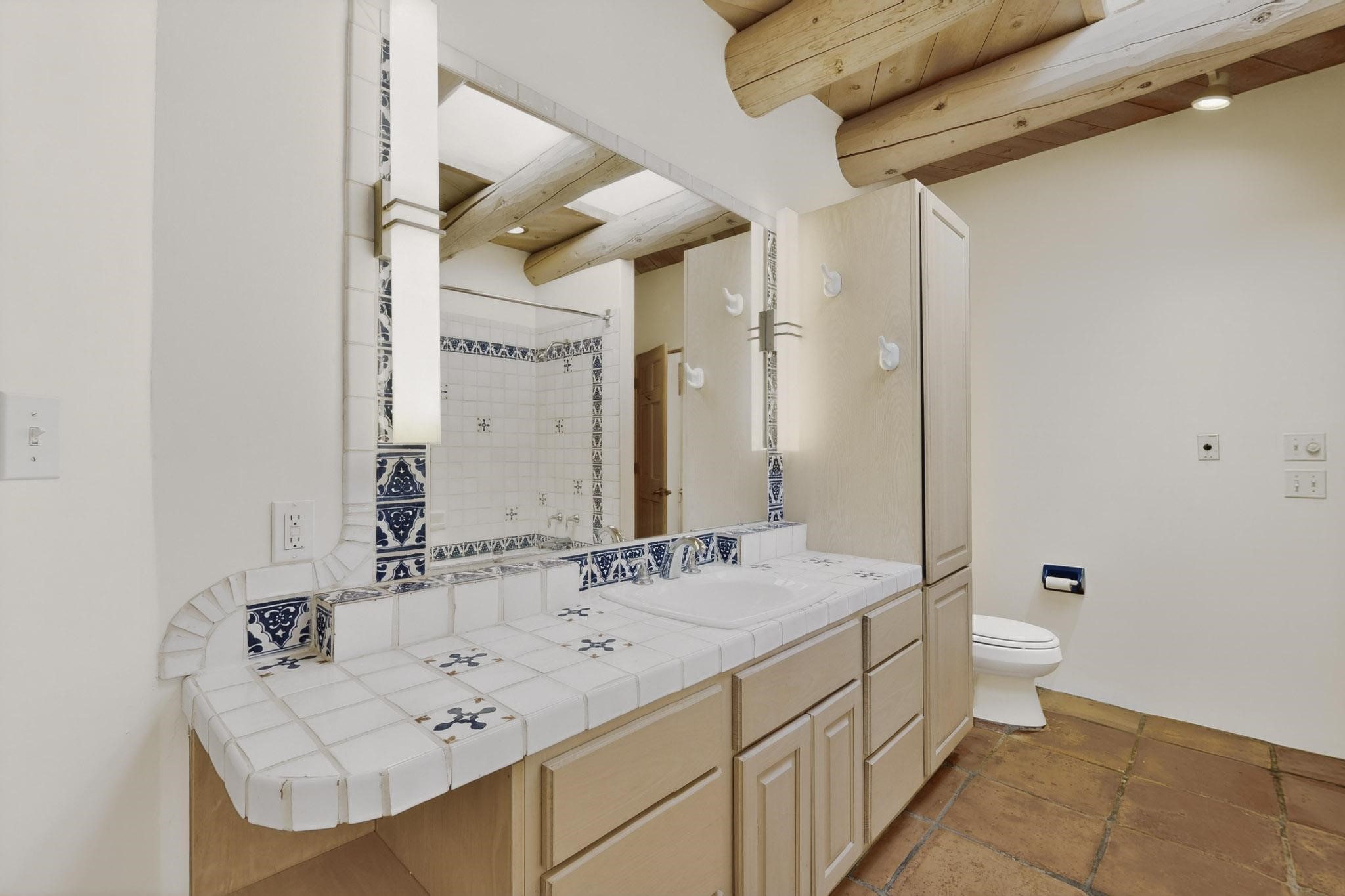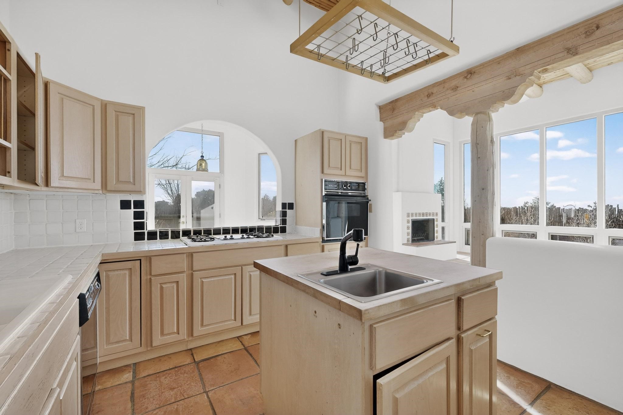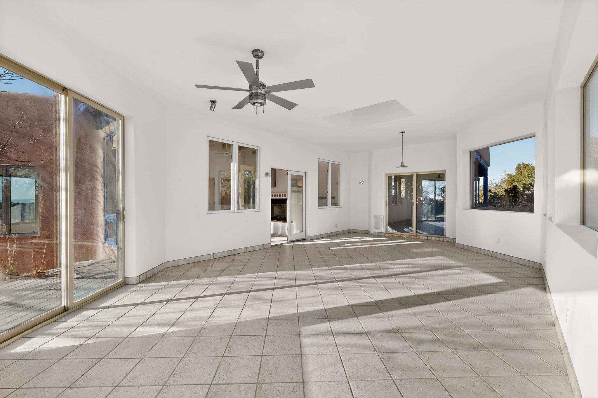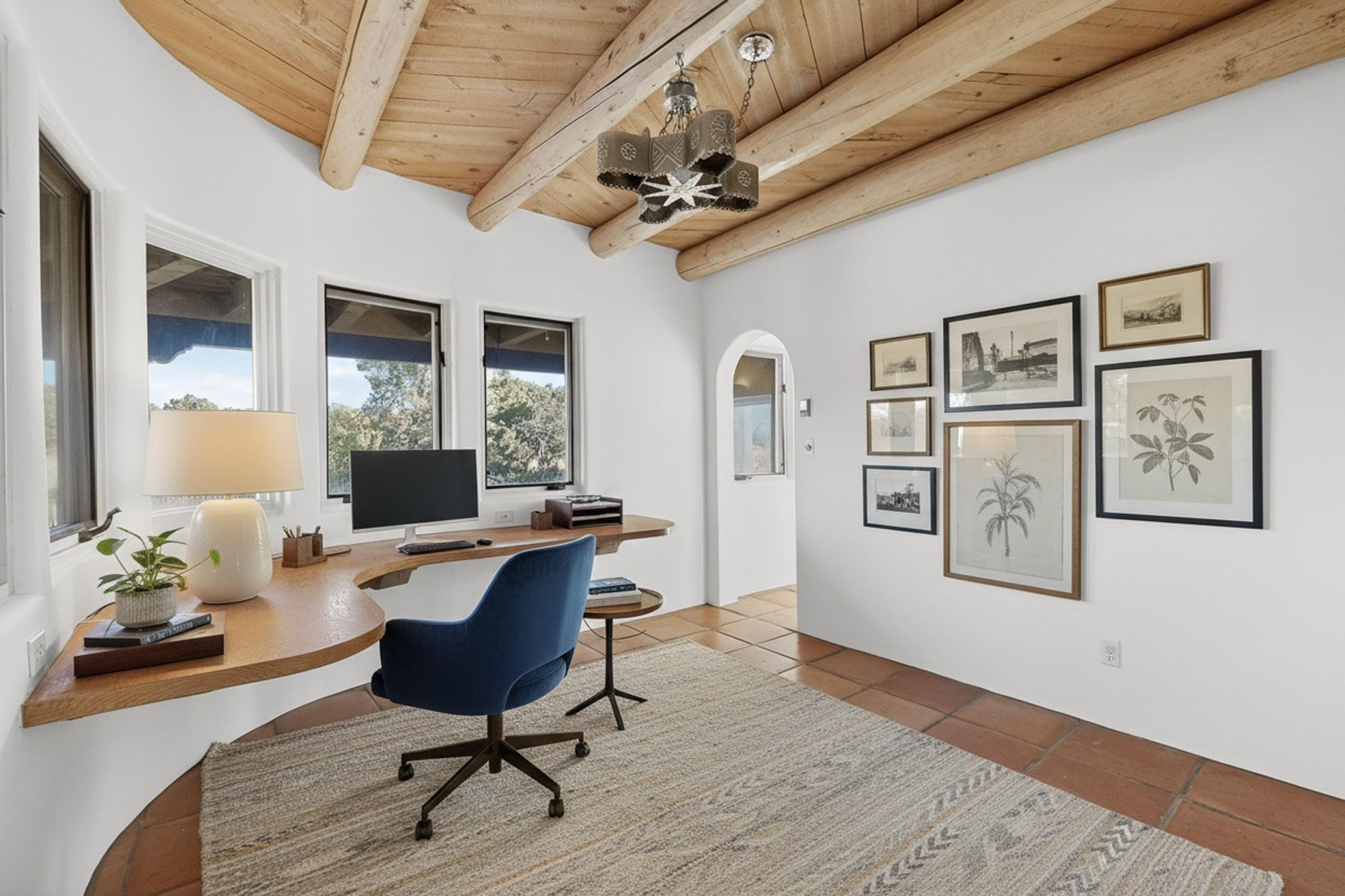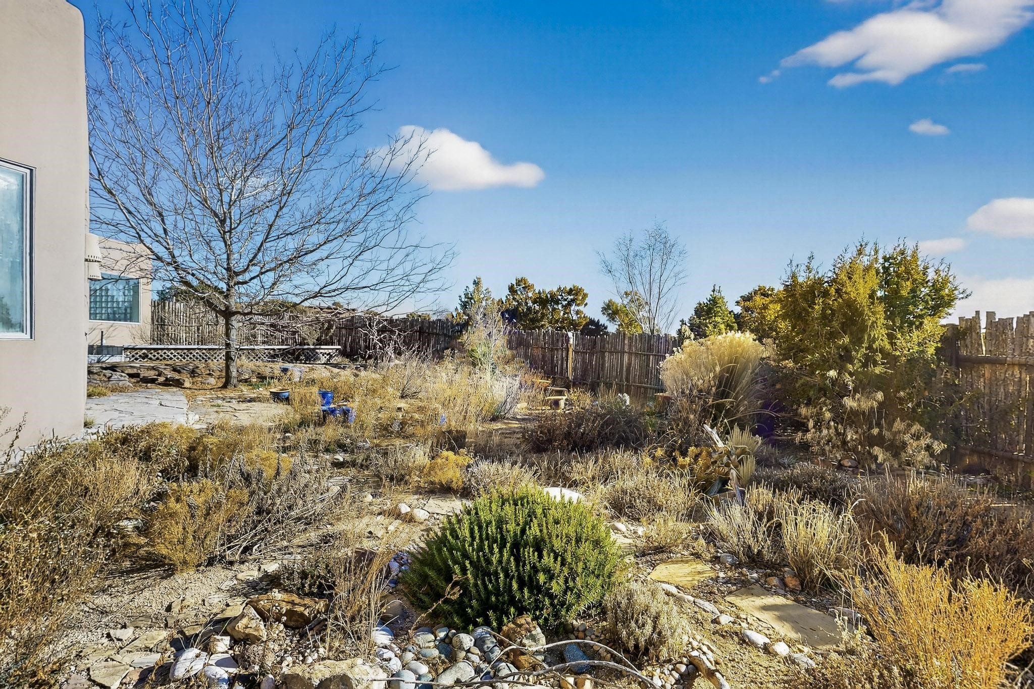 Lovely Eldorado home, situated on an expansive and beautifully landscaped almost 2-acre lot, is filled with natural light and exudes Santa Fe charm. Enjoy panoramic mountain views and amazing sunsets from inside the home and multiple outdoor areas enclosed by coyote fencing and flagstone walk-ways. Offering 2 bedrooms and 2 bathrooms with approximately 2800 square feet, the home features versatile areas perfect for a range of uses. A heated flex space (with gas stove) with appx 390 sqft, separate entrance and direct access to the home provides the ideal setting for a studio, office, workout room, or playroom. Off the spacious primary suite, you'll find a cozy office or sitting room with built-in desk space, as well as a large, light-filled appx 550 sqft unheated room with direct outdoor access--perfect as a work-out room, sitting/TV area, or relaxation space. There is ample storage throughout. The inviting living room boasts soaring ceilings with vigas, a kiva fireplace, and abundant natural light. The owner's suite includes a fireplace and ensuite bath with separate tub and large walk-in show all offering a serene retreat. Car enthusiasts will love the oversized garage (approx. 1,365 sq ft) with room for up to six cars & possibly an RV. Additional highlights include: 4 fireplaces-Abundant skylights-Radiant heat (we have been told not Kitec or Entran II)-Wood doors-Large laundry room with closet & washer/dryer-Saltillo tile floors-Rooftop viewing deck-Vigas in almost every room including bathrooms-Nichos-Banco-Corbels-Archways-Ceiling fans-Newly paved Frasco Rd-Multiple decks and sitting areas and more. This unique property combines Southwestern character with extraordinary versatility and spectacular views.