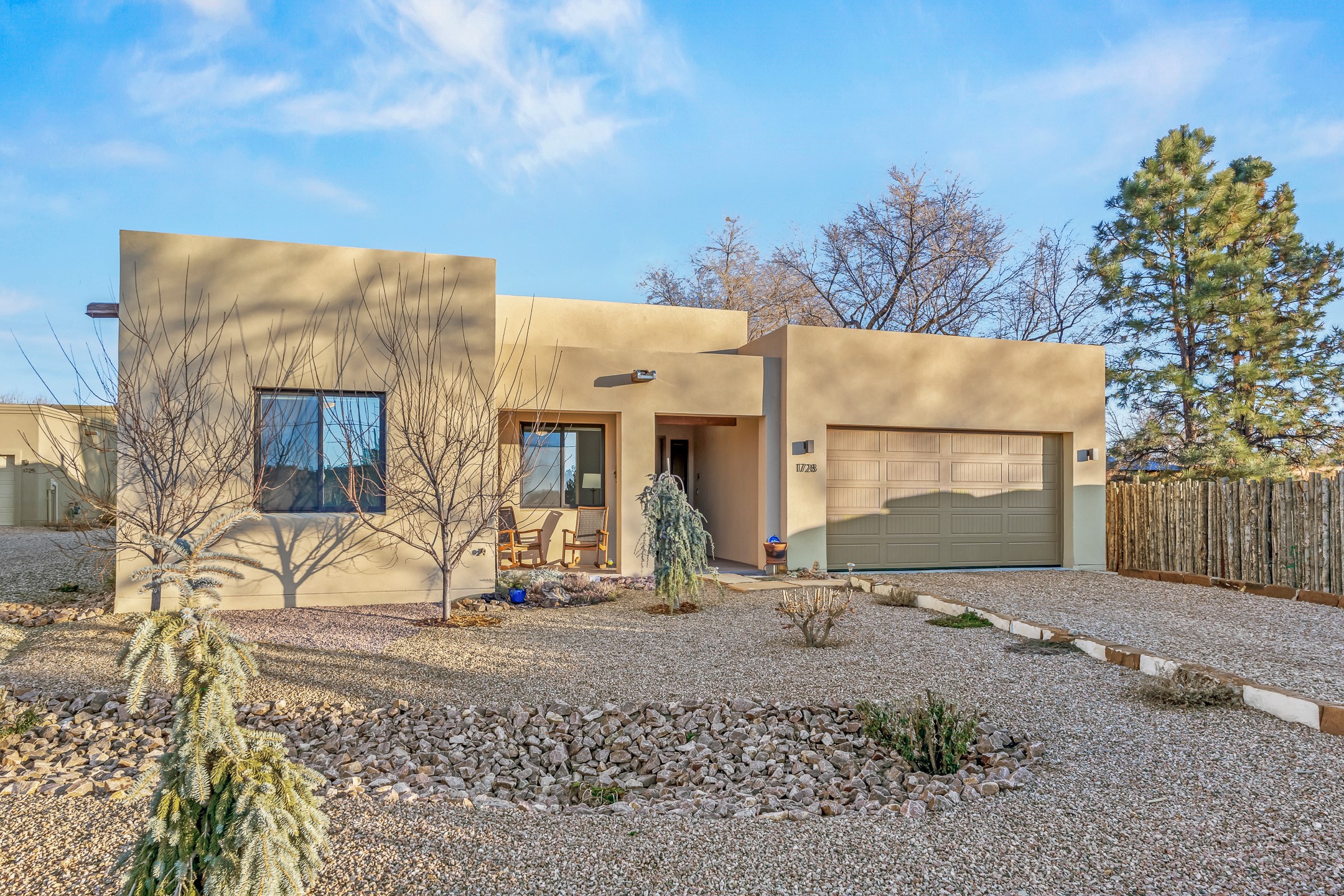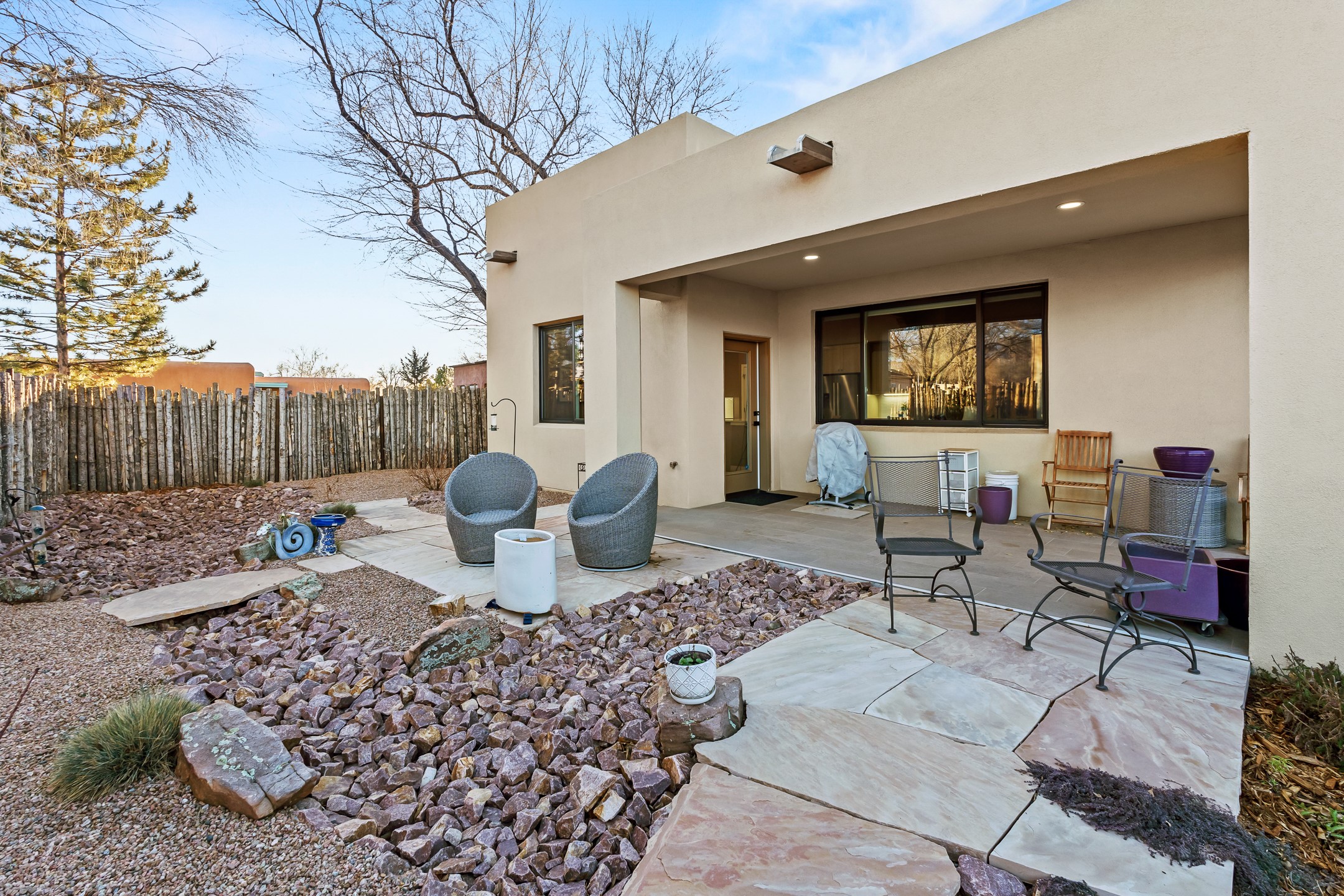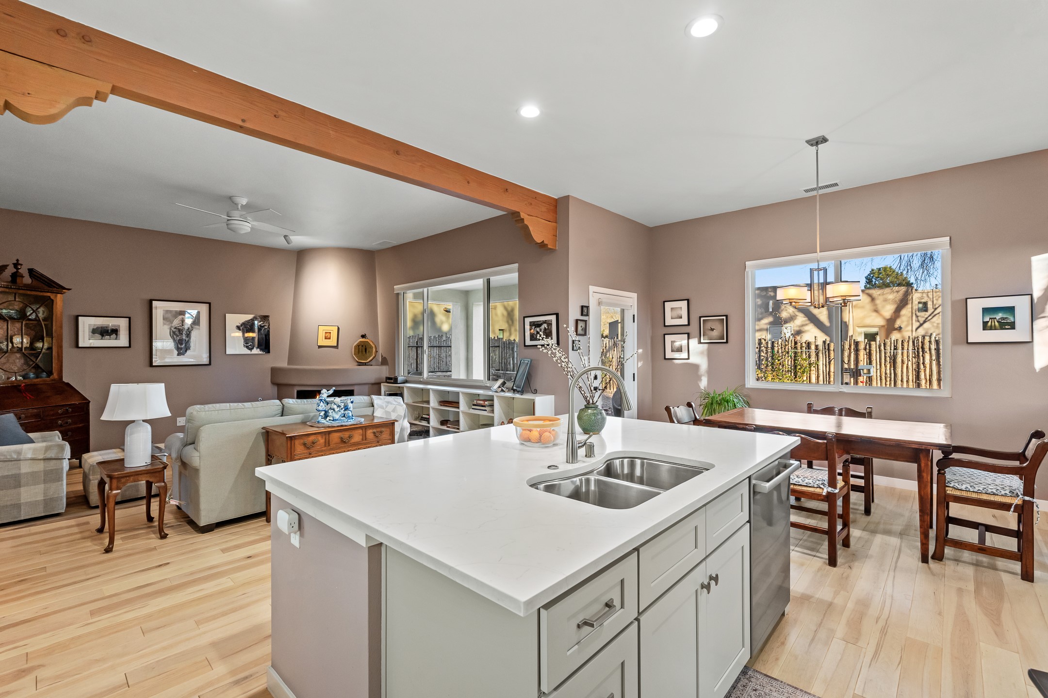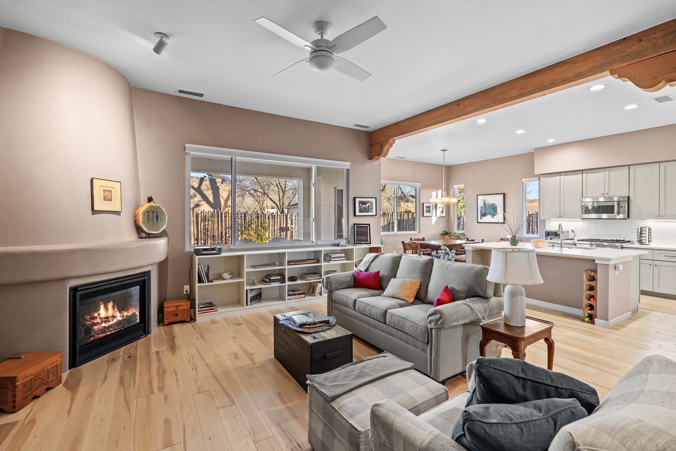 Built in 2022 by Arete Homes of Santa Fe, this beautifully designed single-level 3BD/2BA home offers 1,685 sq. ft. of light-filled living just minutes from The Plaza. Set on a 0.22-acre lot, it enjoys rare privacy, space, and a landscaped backdrop that feels like a hidden oasis. The open-concept kitchen, living, and dining area flows effortlessly into the beautifully hardscaped backyard--complete with flagstone patios, raised garden beds, and lush plantings. The kitchen is the social heart of the home, featuring stone countertops, brand-new stainless steel appliances (Bosch refrigerator and dishwasher/ Thermador oven and microwave), a central island with bar seating, and a sink perfectly placed for both prep and conversation. The living room is anchored by a gas kiva fireplace and rich hardwood floors, which extend throughout the main living areas and bedrooms. Two generous guest bedrooms share a well-appointed full bathroom off the main hallway. The private primary suite is ideally sited in the Northeast corner of the home, offering views of the backyard, abundant natural light, a spacious walk-in closet, and a serene en suite bath with double vanities and a large walk-in shower. Additional highlights include forced air heating and central air conditioning, a full laundry room with utility sink, and a coveted attached two-car garage. New construction opportunities in downtown Santa Fe are exceptionally rare--1728 Callejon Melinda presents a unique chance to enjoy the ease of newer construction in a quiet, tucked-away location near everything Santa Fe has to offer.