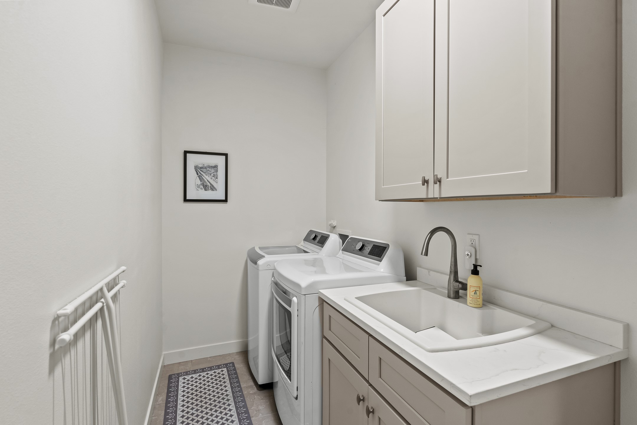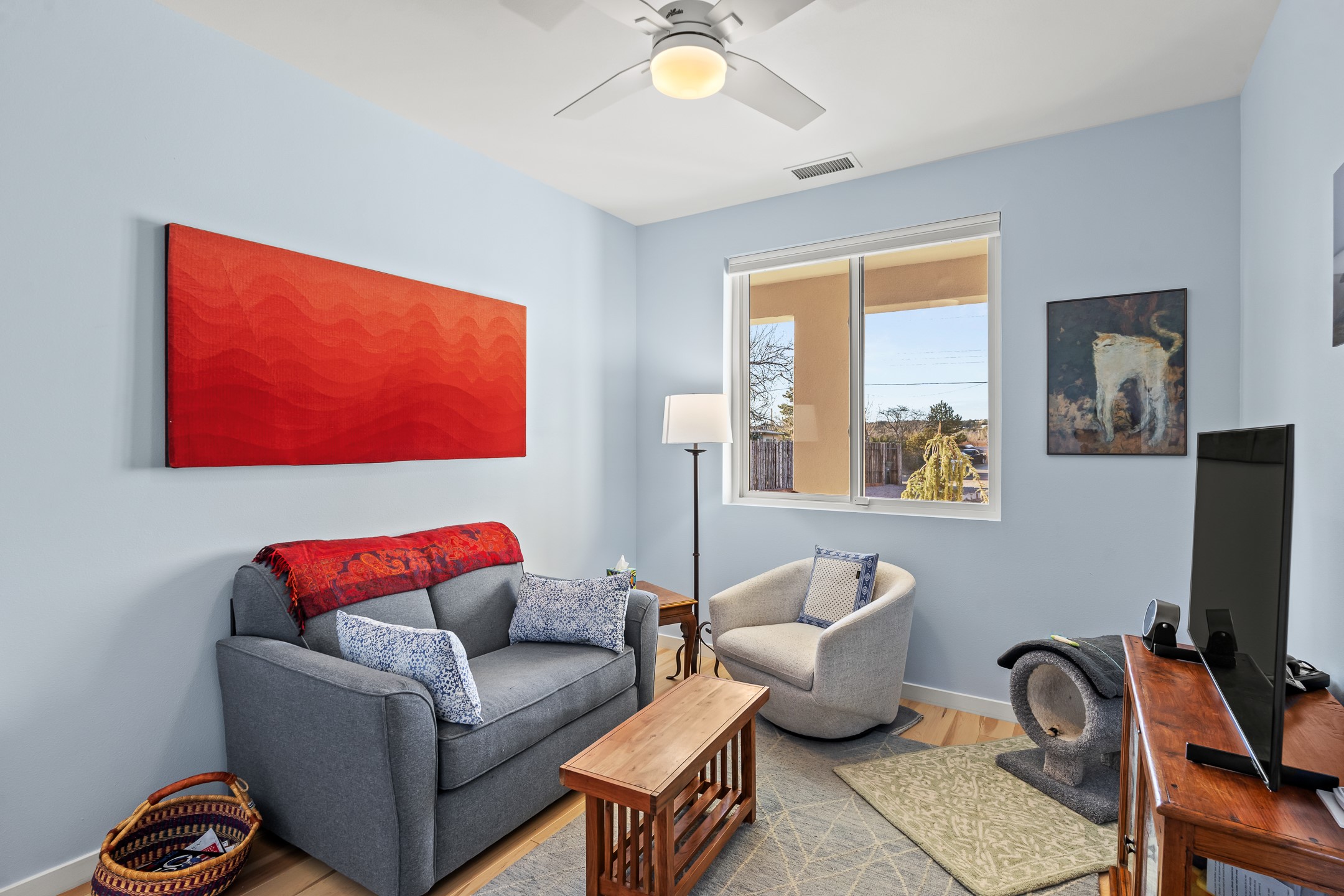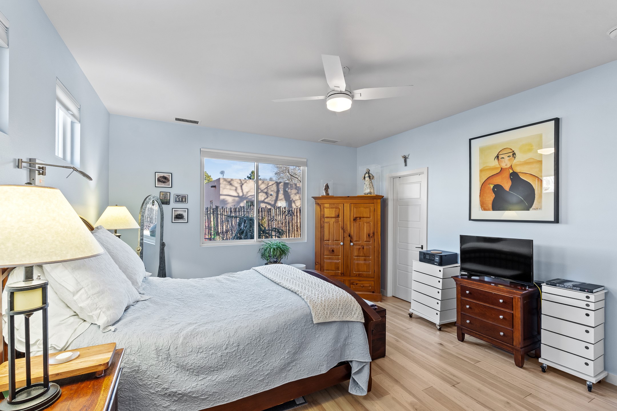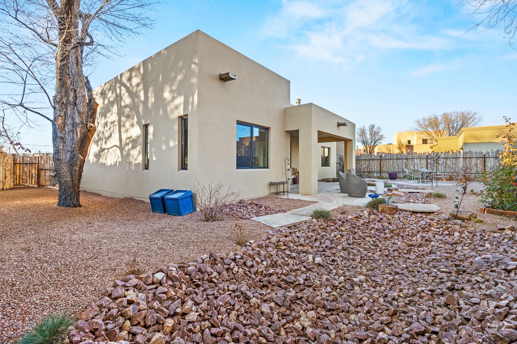 Built in 2022 by Arete Homes of Santa Fe, this beautifully designed single-level 3BD/2BA home offers 1,685 sq. ft. of light-filled living just minutes from The Plaza. Set on a 0.22-acre lot, it enjoys rare privacy, space, and a landscaped backdrop that feels like a hidden oasis. The open-concept kitchen, living, and dining area flows effortlessly into the beautifully hardscaped backyard--complete with flagstone patios, raised garden beds, and lush plantings. The kitchen is the social heart of the home, featuring stone countertops, brand-new stainless steel appliances (Bosch refrigerator and dishwasher/ Thermador oven and microwave), a central island with bar seating, and a sink perfectly placed for both prep and conversation. The living room is anchored by a gas kiva fireplace and rich hardwood floors, which extend throughout the main living areas and bedrooms. Two generous guest bedrooms share a well-appointed full bathroom off the main hallway. The private primary suite is ideally sited in the Northeast corner of the home, offering views of the backyard, abundant natural light, a spacious walk-in closet, and a serene en suite bath with double vanities and a large walk-in shower. Additional highlights include forced air heating and central air conditioning, a full laundry room with utility sink, and a coveted attached two-car garage. New construction opportunities in downtown Santa Fe are exceptionally rare--1728 Callejon Melinda presents a unique chance to enjoy the ease of newer construction in a quiet, tucked-away location near everything Santa Fe has to offer.
