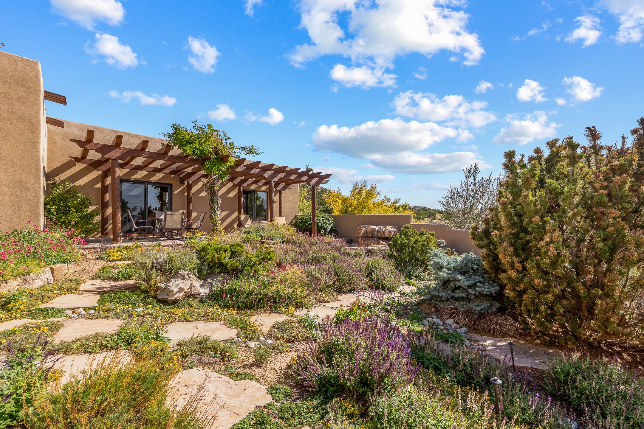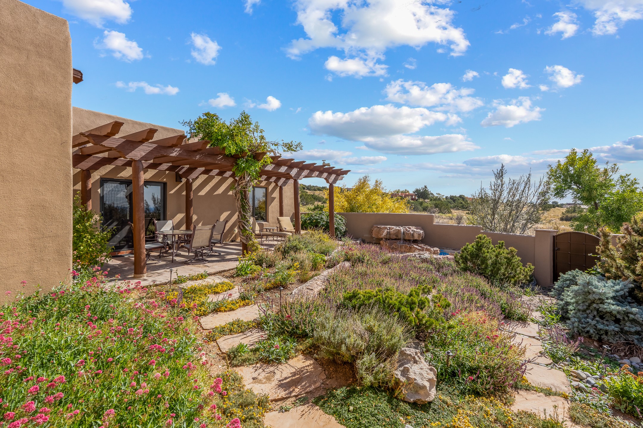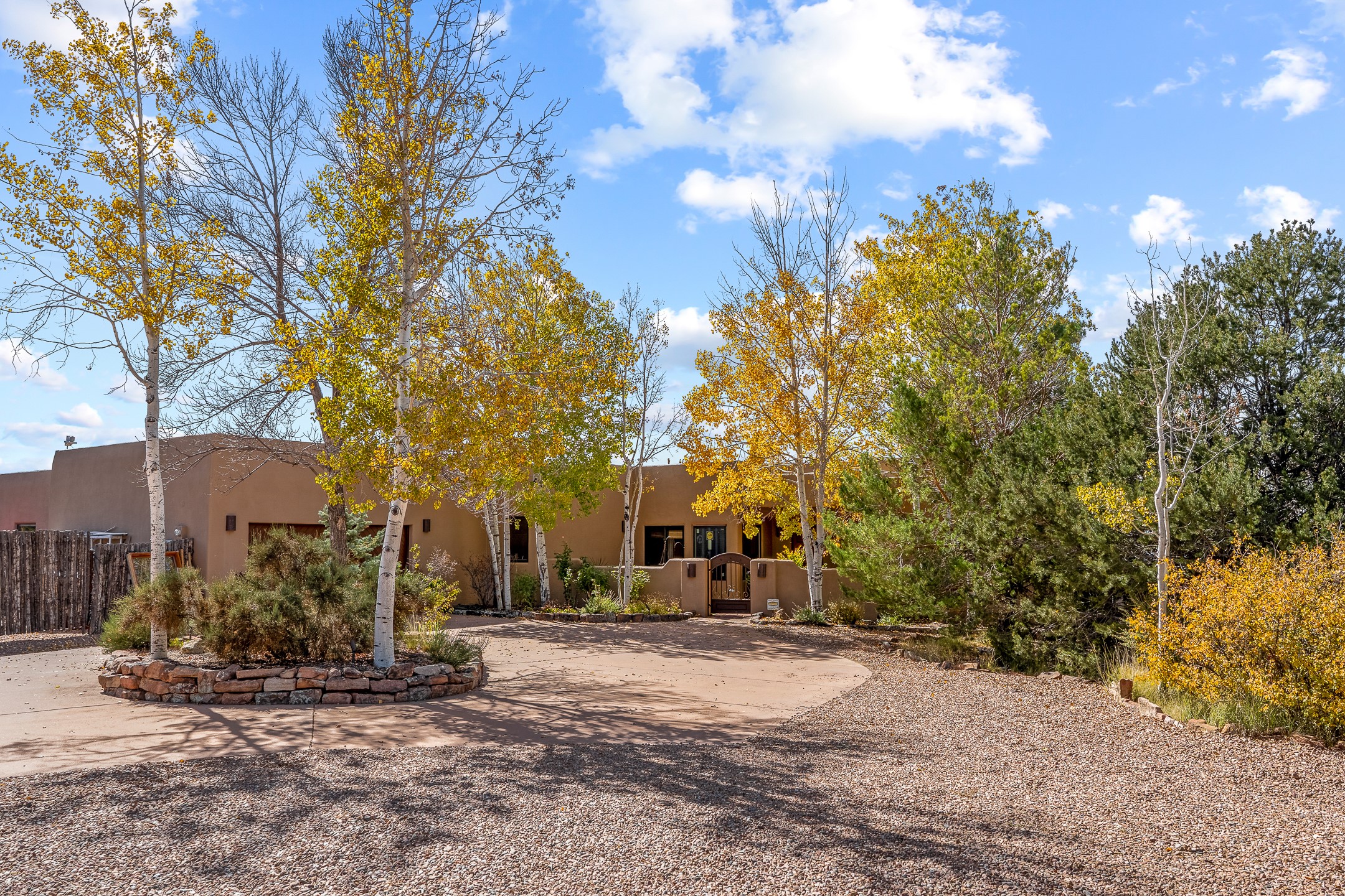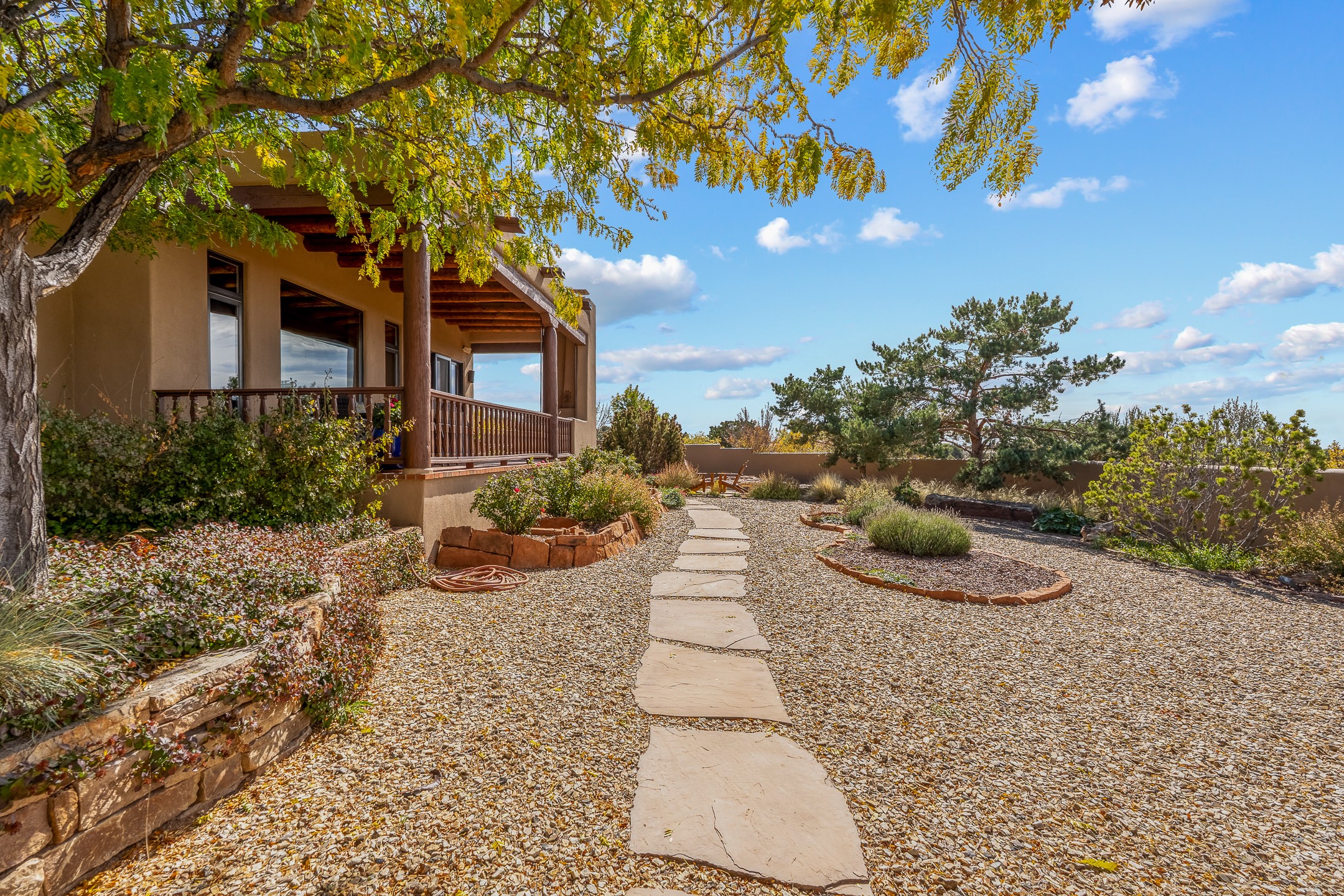 Move-in-ready, single-level home offering 3 bedrooms, 2 full bathrooms, and 1 half bathroom, plus an attached studio, located in the desirable Dos Griegos subdivision, approximately 20 minutes from Santa Fe. The main residence spans 2,995 square feet and features a thoughtfully designed floor plan with the primary suite and guest bedrooms situated in separate wings for optimal privacy. The living area showcases tall ceilings with vigas and tongue-and-groove planks, complemented by large windows that fill the home with abundant natural light. A formal dining room and a sunny breakfast nook provide flexible dining and entertaining options. The primary bedroom includes an extended office or flex space, while a full guest bath is conveniently located between the guest bedrooms, and a half bath sits just off the breakfast nook. Outdoor living is a highlight, with a fully enclosed, landscaped backyard on a drip irrigation system, a rear portal for enjoying the views, and a trellis off the primary bedroom. Two tranquil water features enhance the backyard setting, and an outdoor jacuzzi is ideally positioned between the attached studio and flex space. Additional features include three wood-burning kiva fireplaces, a side flagstone trellis, mature trees, and a welcoming front courtyard. Quality windows, new appliances, and exceptional craftsmanship throughout complete this offering. The home was awarded Best Craftsmanship in the Parade of Homes, reflecting its timeless design and attention to detail.