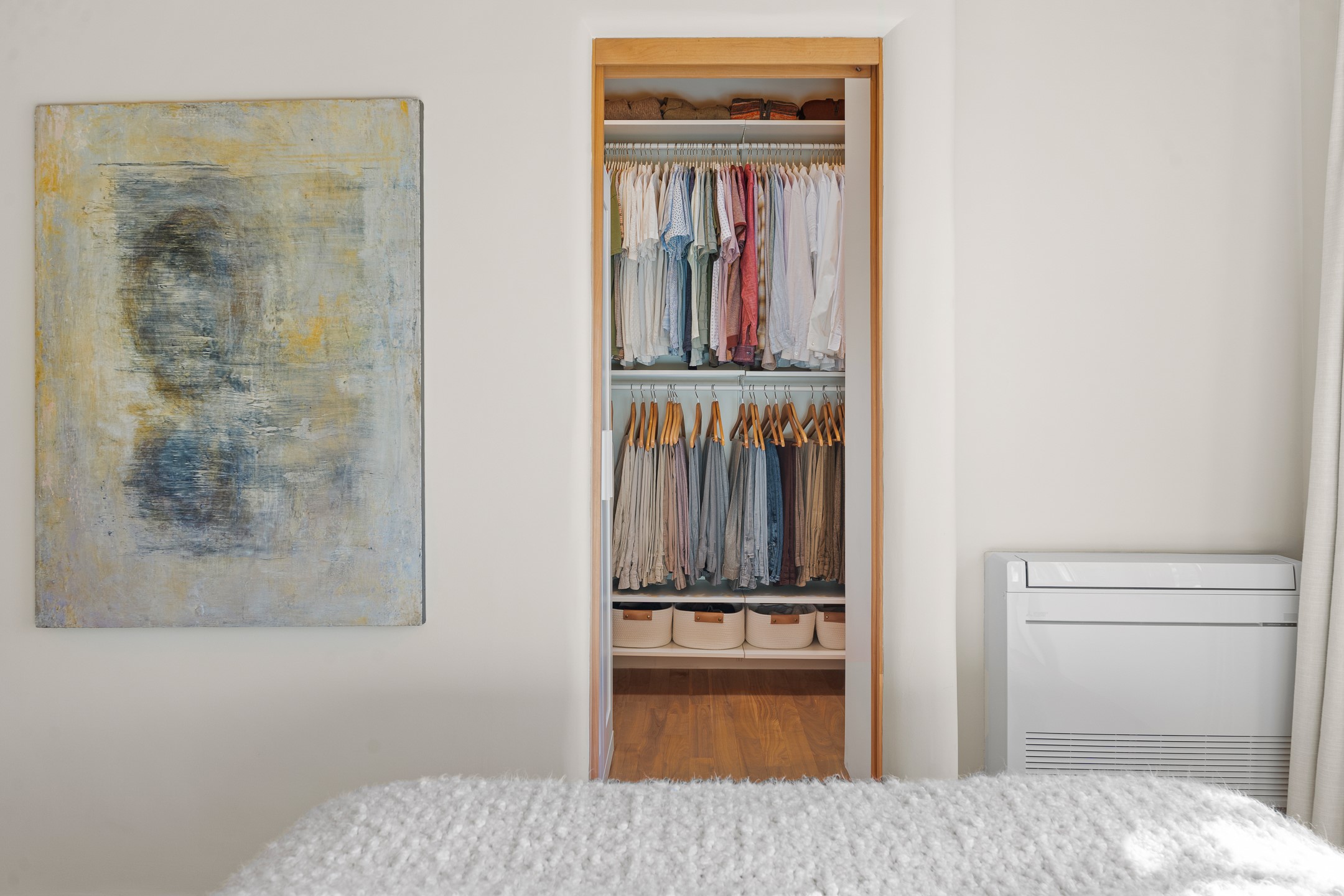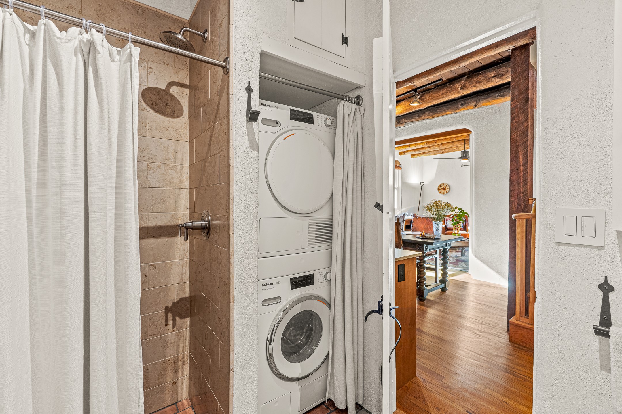 Tucked away on a quiet street in South Capitol, this charming 2-bedroom, 2-bathroom condo has been thoughtfully transformed by Santa Fe Kitchen Design. Every detail of the home reflects quality and craftsmanship with high-end finishes and an integrated design that maximizes style as well as space. The ground level includes the designer kitchen, dining area, a bath with laundry, and a flexible guest bedroom with a walk-in closet which is currently used as an office/sitting room--easily closed off with sliding barn doors. Beautiful hardwood floors run throughout and comfort is ensured year-round with mini-split heating and cooling. Upstairs, the sunny living room offers a warm and inviting retreat, perfect for relaxing or entertaining. The primary suite features a stylish built-in desk, a custom walk-in closet, and a beautifully renovated (2025) bathroom complete with a wall-mounted vanity, an onyx vessel sink, Toto wall-mounted toilet, floor-to-ceiling tiled walk-in shower, and radiant heat flooring. Solar panels, installed in 2023 and backed by a 20-year warranty, enhance energy efficiency and sustainability, while a curbside EV outlet is pre-wired for convenient electric vehicle charging. Located just minutes from downtown Santa Fe, this home is a rare opportunity to own a turnkey, design-forward residence in one of the city's most beloved neighborhoods.