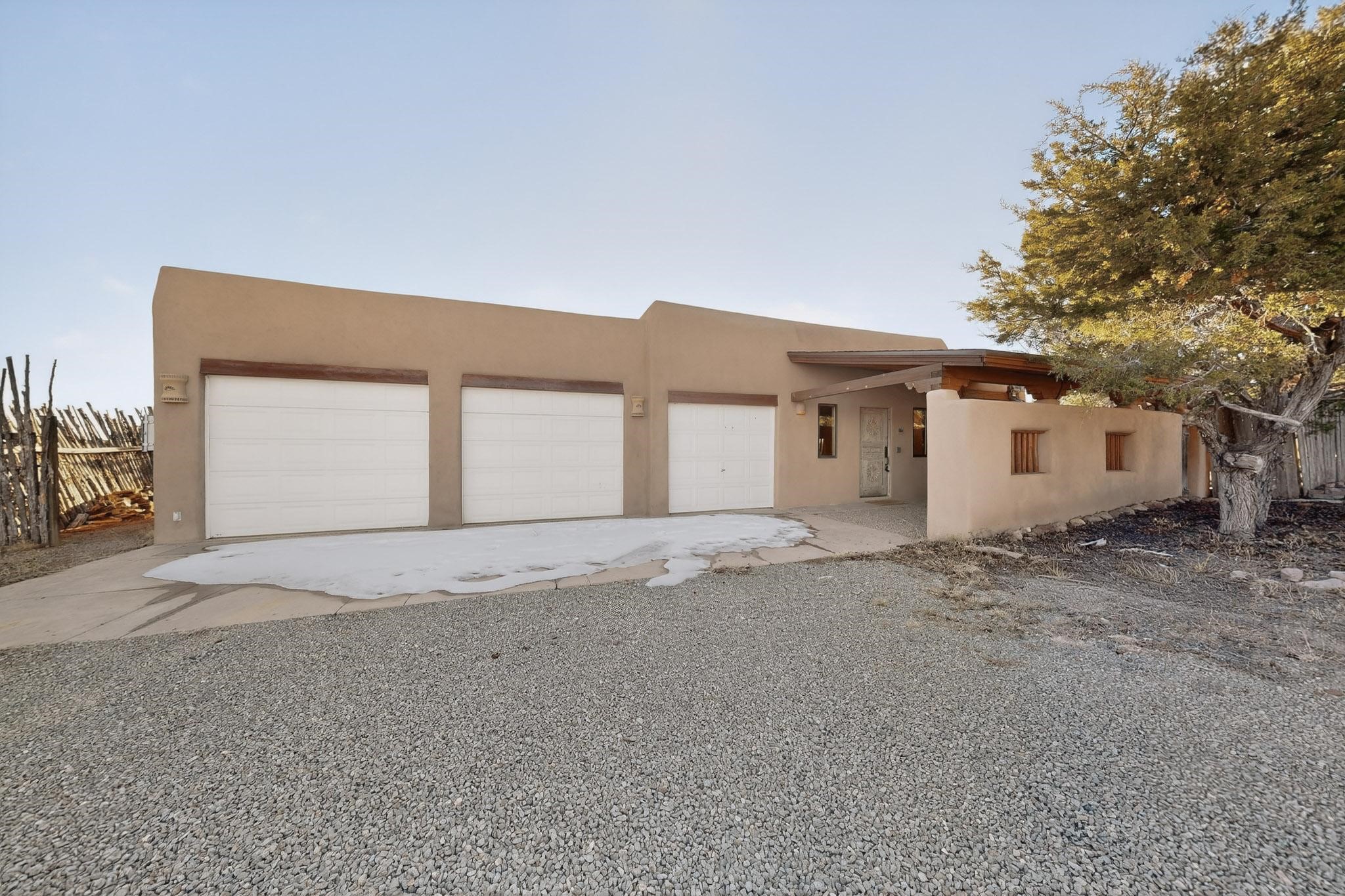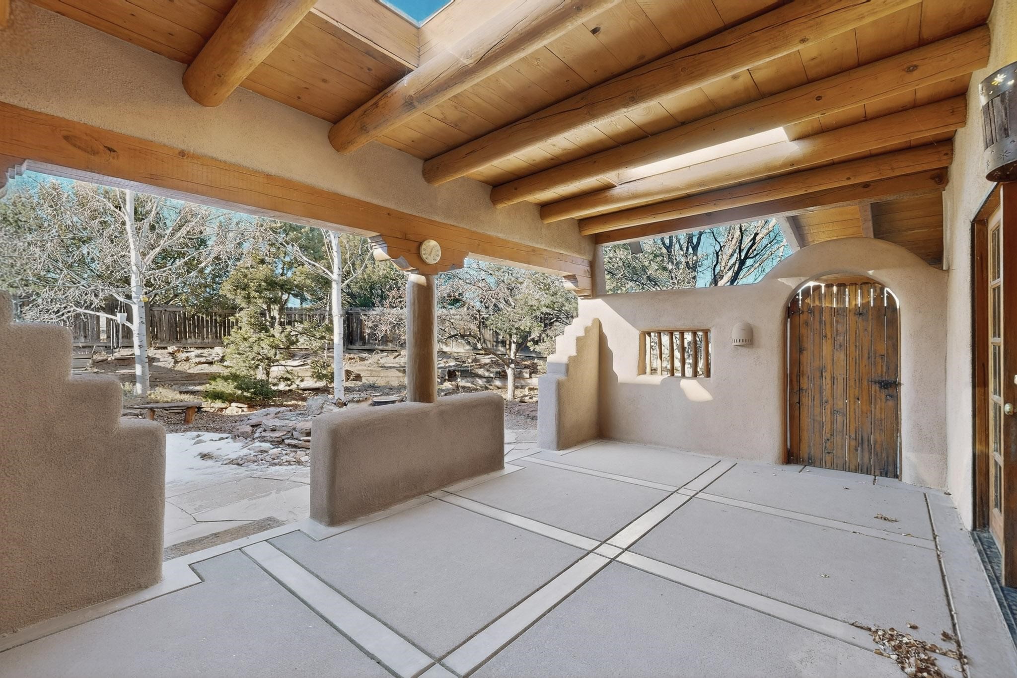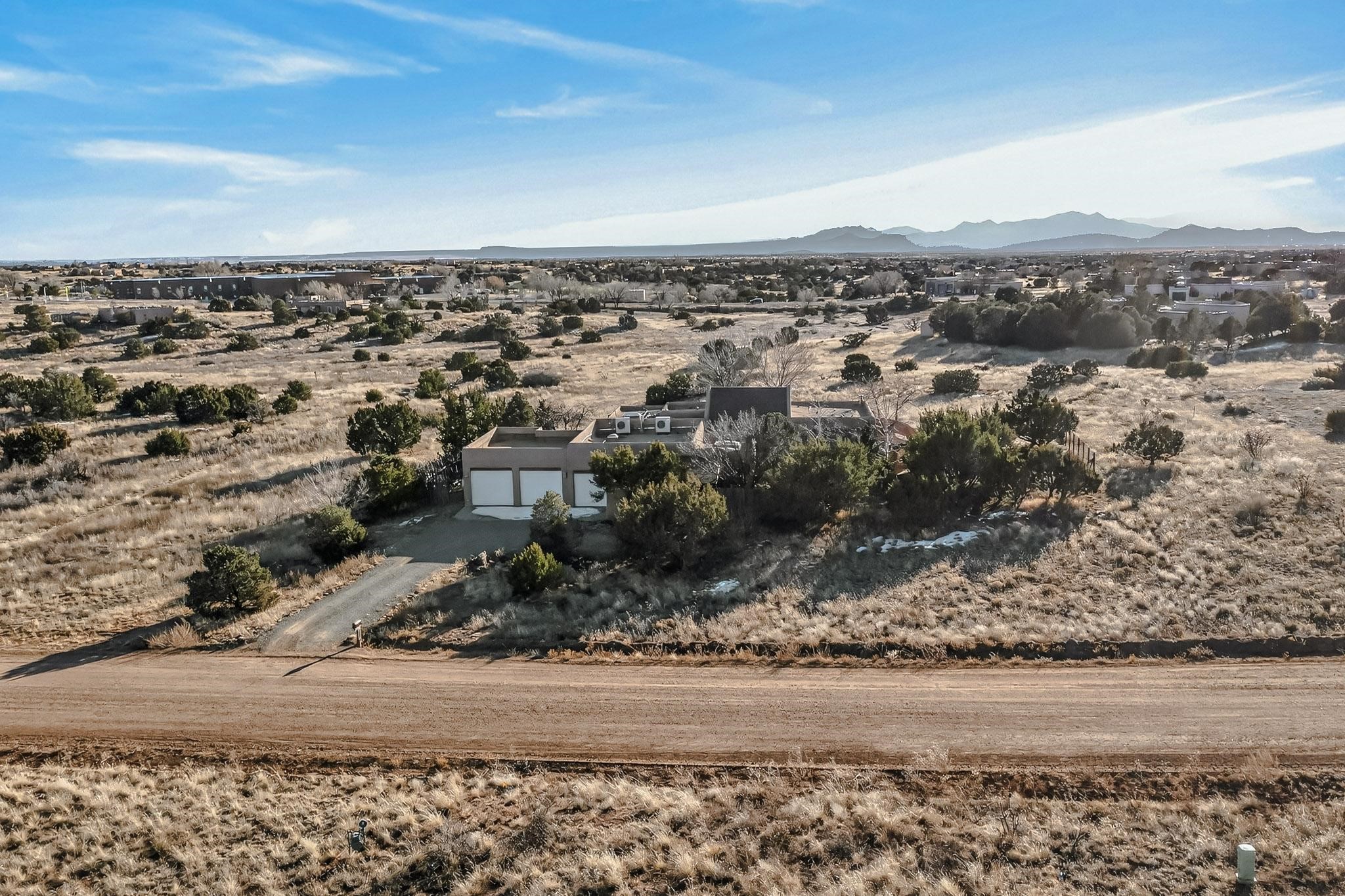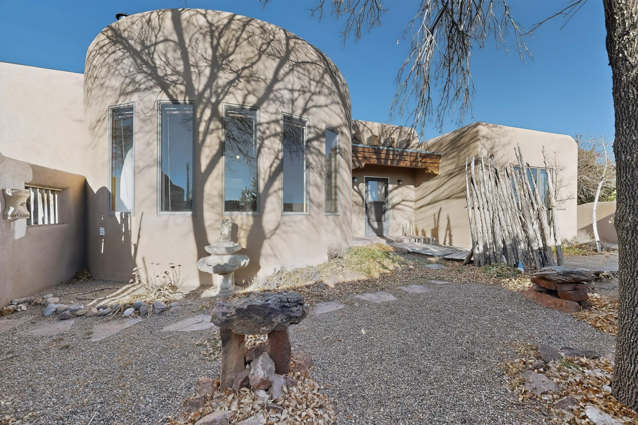 Custom designed and built for the first owner, this 4 bedroom 3 bath home is filled with eye catching hand carved details throughout. An excellent potential for multi family living with great separation of main bedroom and 2 guest wings. A sunny open plan concept with many extra rooms to expand your hobbies or private enjoyment areas. There is a new solar array, boiler, hot water heater and new above ground hot tub installed 2022/2023. New stucco, partial new roof and the 6 mini splits serviced in 2025. An oversized 2 car garage plus a studio bay with garage doors at both ends for easy access and plenty of guest parking. Two walled in private gardens for outside enjoyment accessed from north and south sides of the home. Ideally located bordering a large greenbelt, close to the community centre, hike bike trails, K-8 school, library, senior centre, 2 shopping plazas and only minutes into Santa Fe.