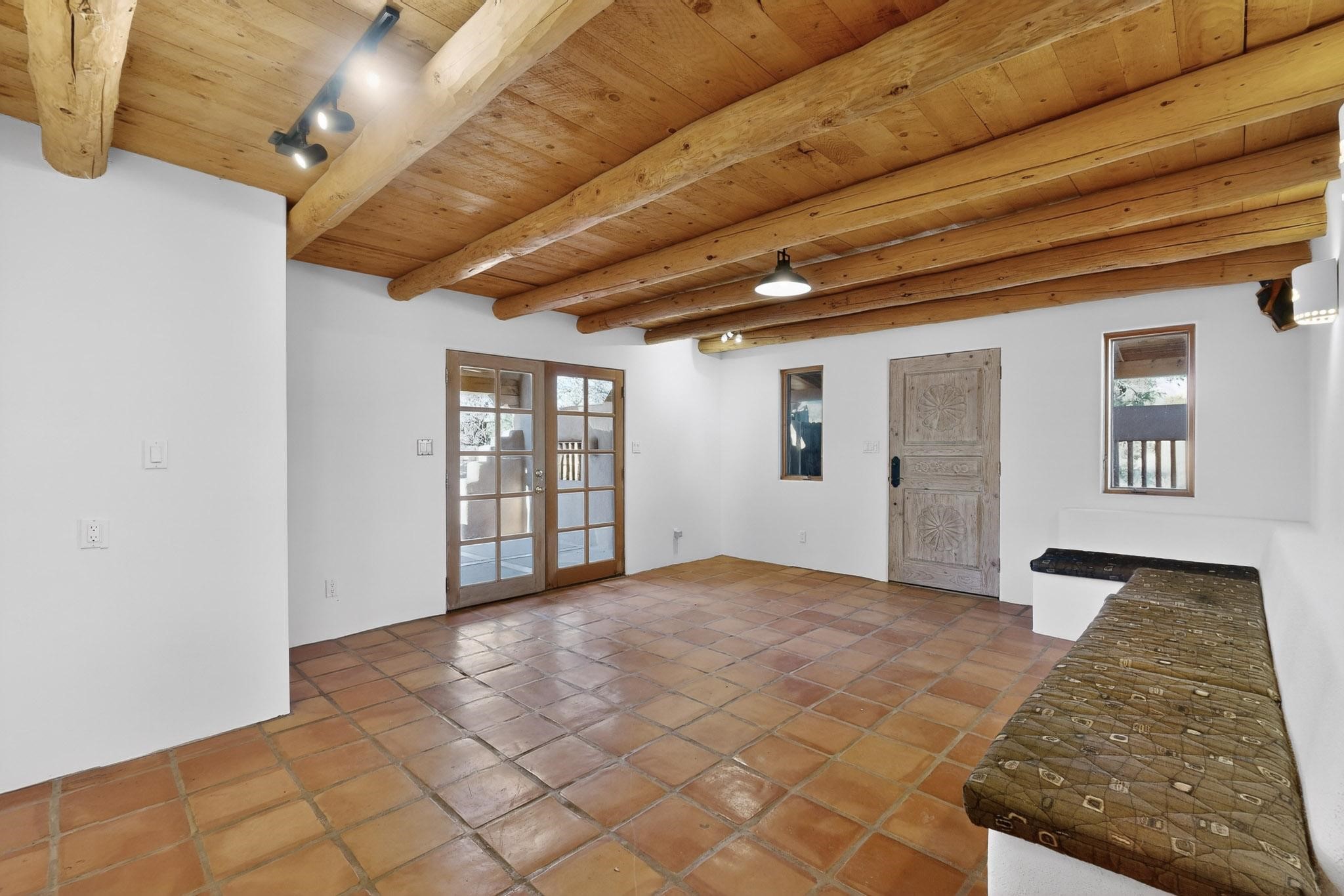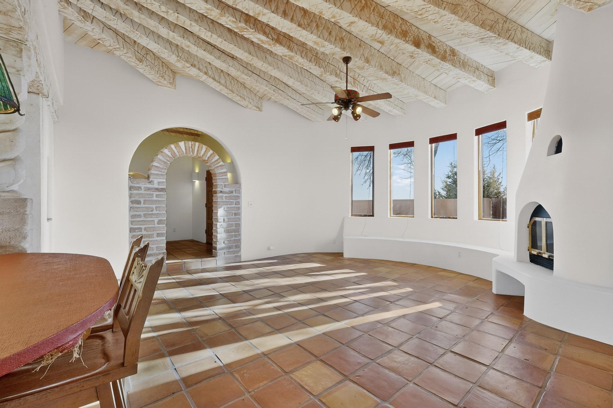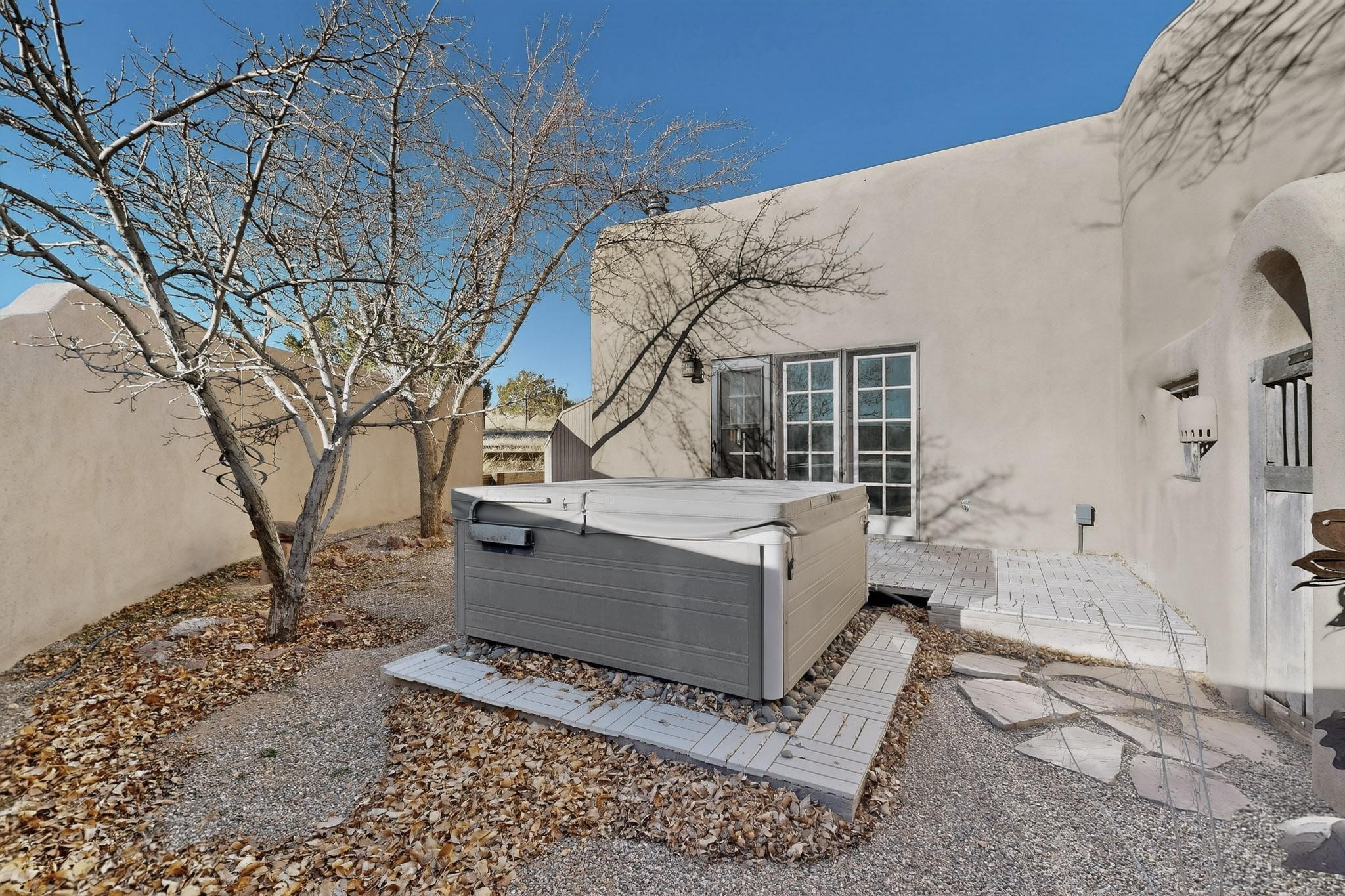 Custom designed and built for the first owner, this 4 bedroom 3 bath home is filled with eye catching hand carved details throughout. An excellent potential for multi family living with great separation of main bedroom and 2 guest wings. A sunny open plan concept with many extra rooms to expand your hobbies or private enjoyment areas. There is a new solar array, boiler, hot water heater and new above ground hot tub installed 2022/2023. New stucco, partial new roof and the 6 mini splits serviced in 2025. An oversized 2 car garage plus a studio bay with garage doors at both ends for easy access and plenty of guest parking. Two walled in private gardens for outside enjoyment accessed from north and south sides of the home. Ideally located bordering a large greenbelt, close to the community centre, hike bike trails, K-8 school, library, senior centre, 2 shopping plazas and only minutes into Santa Fe.