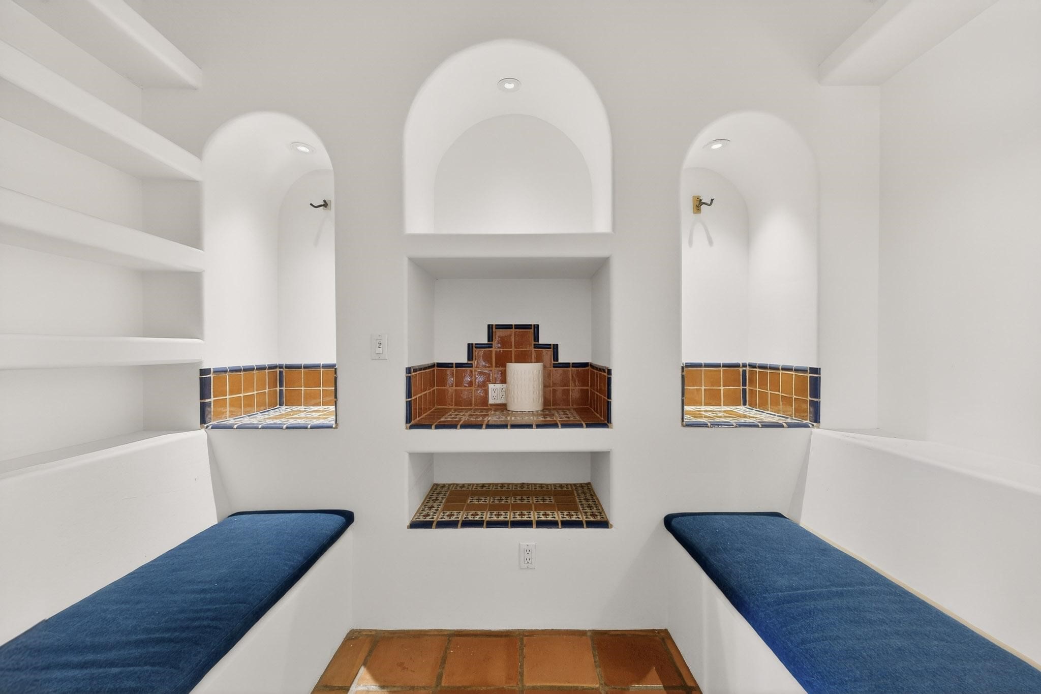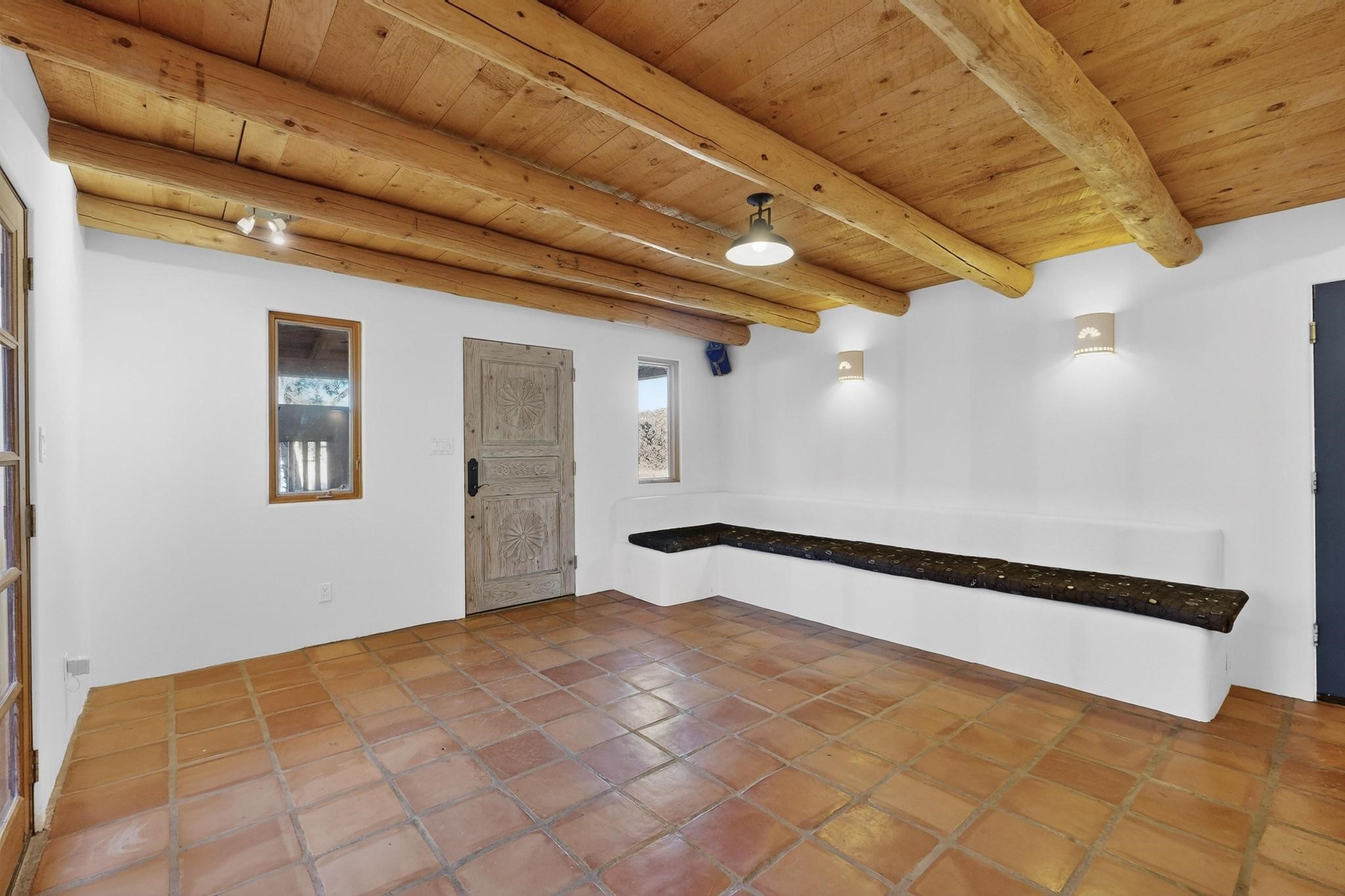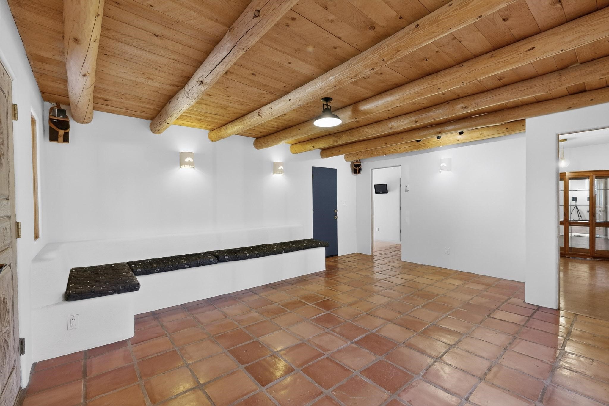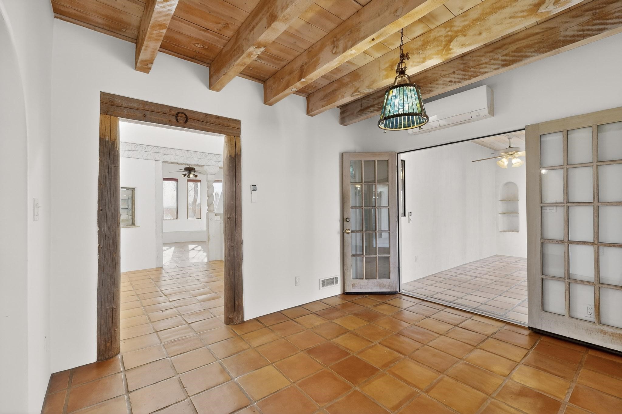 Custom designed and built for the first owner, this 4 bedroom 3 bath home is filled with eye catching hand carved details throughout. An excellent potential for multi family living with great separation of main bedroom and 2 guest wings. A sunny open plan concept with many extra rooms to expand your hobbies or private enjoyment areas. There is a new solar array, boiler, hot water heater and new above ground hot tub installed 2022/2023. New stucco, partial new roof and the 6 mini splits serviced in 2025. An oversized 2 car garage plus a studio bay with garage doors at both ends for easy access and plenty of guest parking. Two walled in private gardens for outside enjoyment accessed from north and south sides of the home. Ideally located bordering a large greenbelt, close to the community centre, hike bike trails, K-8 school, library, senior centre, 2 shopping plazas and only minutes into Santa Fe.