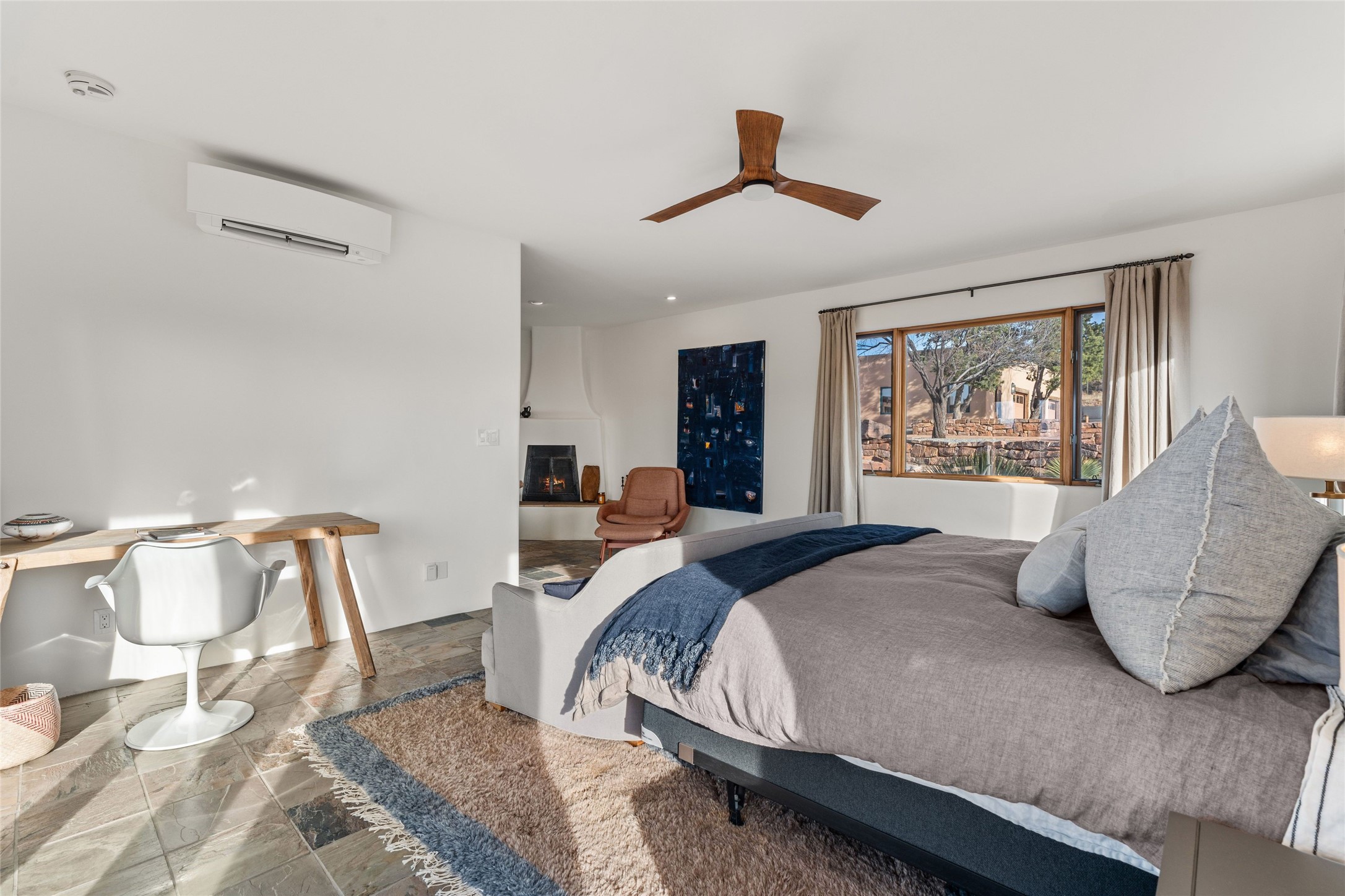 Remarkable 3-bedroom, 4.5-bath luxury retreat set on nearly 12 acres in the desirable La Tierra community. This stunning property offers breathtaking views and a unique 6-hole putting green, making it a golfer's paradise right in your backyard. Diamond plaster walls, vigas and beams, and expansive brick-lined portals add character. Enter through carved wood doors and be greeted by a grand foyer that seamlessly flows into an open-concept living space. Living and dining areas are adorned with soaring 12-ft. ceilings, large-scale windows, and French doors that invite natural light and the beauty of the outdoors into your home. Gourmet kitchen features high-end appliances, a center island with 6-burner cooktop, and a stylish bar area complete with a wine cooler. Retreat to the primary suite, which includes sitting area, fireplace, and a luxurious bath with divided 2 vanities and sinks, 2 water closets, and 2 walk-in closets for ample storage. A versatile studio/media room offers flex space as a 4th bedroom complete with a bathroom with shower. 3-car garage and an extra 10,000-gallon water storage tank. Recent upgrades such as solar photovoltaic electric, 2 new water heaters, window screens, motorized awnings in the living and dining rooms, and all new skylights enhance the home's efficiency. Enjoy awe-inspiring sunset views that will take your breath away, all while being conveniently located just 10-15 minutes from the Santa Fe Plaza, Ten Thousand Waves, and the Santa Fe Opera.