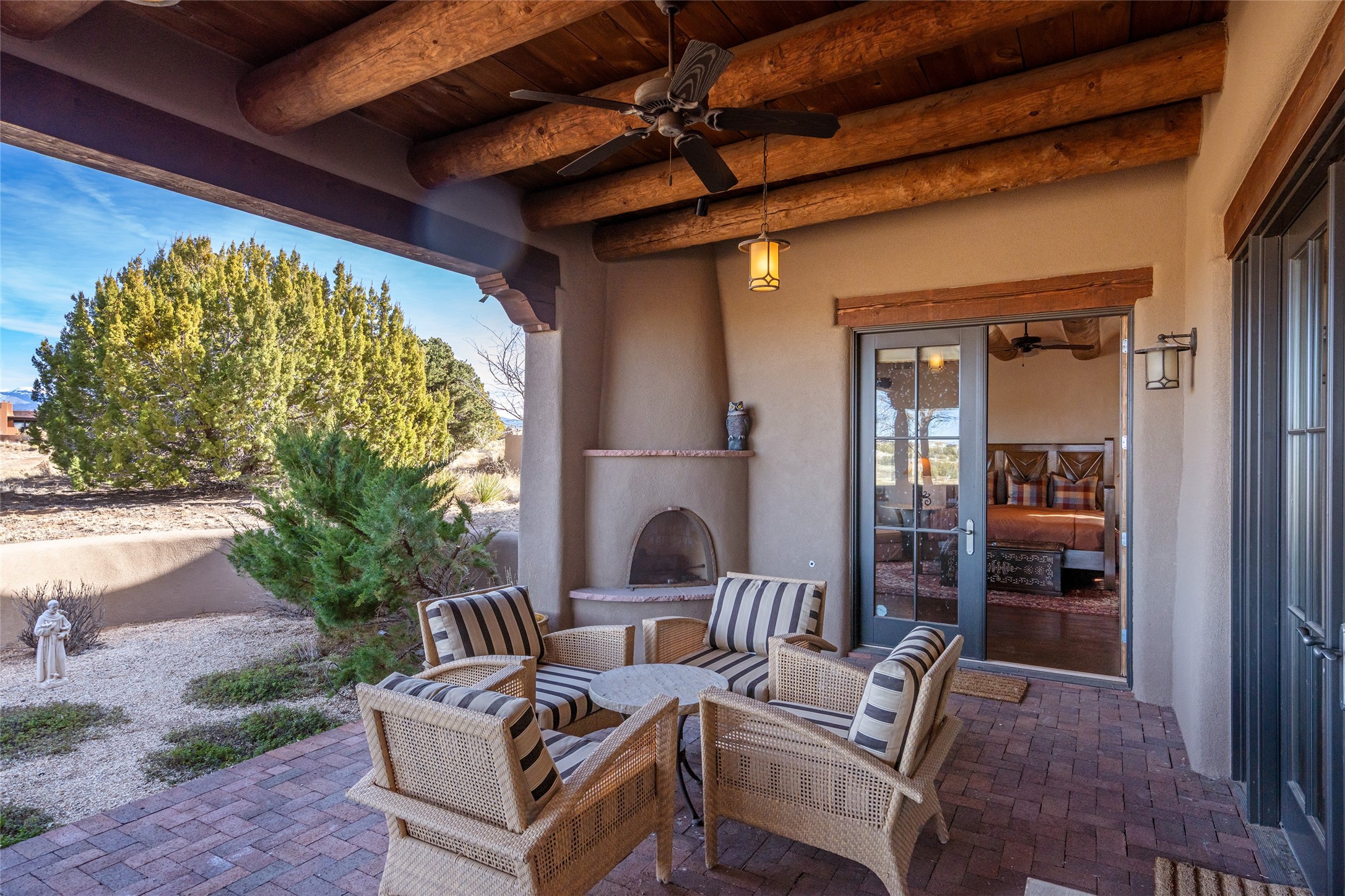 PERCHED ON A SLEEPY CUL DE SAC IN THE COVETED PUEBLOS ENCLAVE OF LAS CAMPANAS IS AN EXTRAORDINARY PROPERTY WITH HANDSOME SANTA FE TOUCHES THROUGHOUT, GREAT INDOOR/OUTDOOR ENTERTAINING SPACES AND ARCHITECTURAL DETAILS THAT ADD INTEREST AND TRUE COMFORT. Gleaming plaster walls, coved vigas, and warm wood floors anchor the residence. A spacious, cook's kitchen with center island, granite counter tops and high-end appliances - replete with a generous butler's pantry. Good sized laundry and a mud room area adjacent to entry from garage. The floor plan provides marvelous separation of spaces - including the 3 bedrooms and wide hallways that double as fine gallery space. New Stucco. Rare offering in a section of Las Campanas where homes seldom come to market.