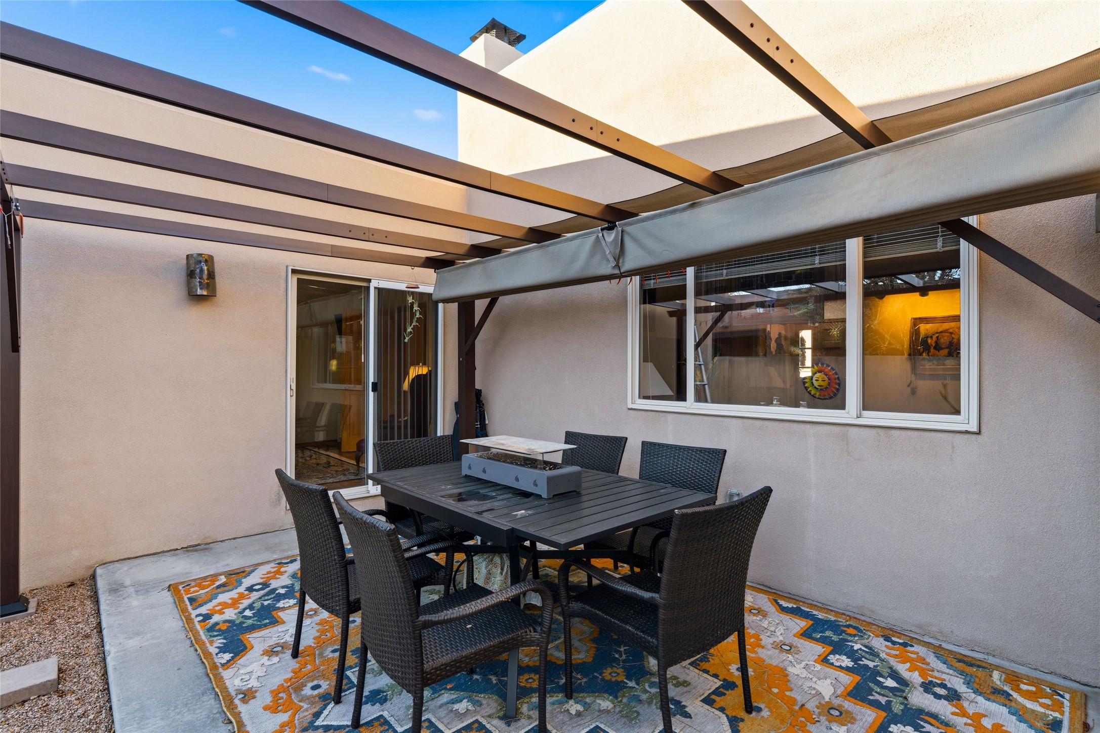 Desirable Pueblos del Sol Home in the Coveted Pion School Zone. This inviting 1,386 sq. Foot, 3-bedroom, 2-bath residence has a new roof (2023) and driveway (2025). Thoughtfully designed for comfortable living, the home features a welcoming living area with high ceiling and beams, anchored by a classic kiva fireplace--perfect for cozy evenings. The thoughtfully laid out kitchen flows around a large center island and into a well-lit dining space that opens up to the back garden. Enjoy recently updated flooring throughout the main living spaces. The primary suite offers an updated bath and direct access to the back portal, creating a seamless indoor-outdoor connection and a peaceful retreat. Step outside to enjoy the generously sized fully-enclosed backyard, ideal for entertaining, gardening, pets, or simply relaxing under New Mexico skies. With its prime location, functional layout, and expansive outdoor space, this home presents a wonderful opportunity in one of Santa Fe's most popular neighborhoods.