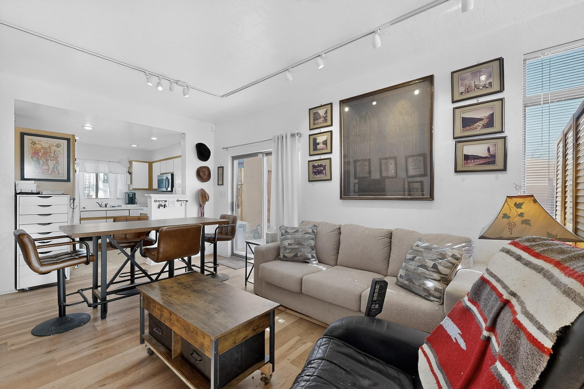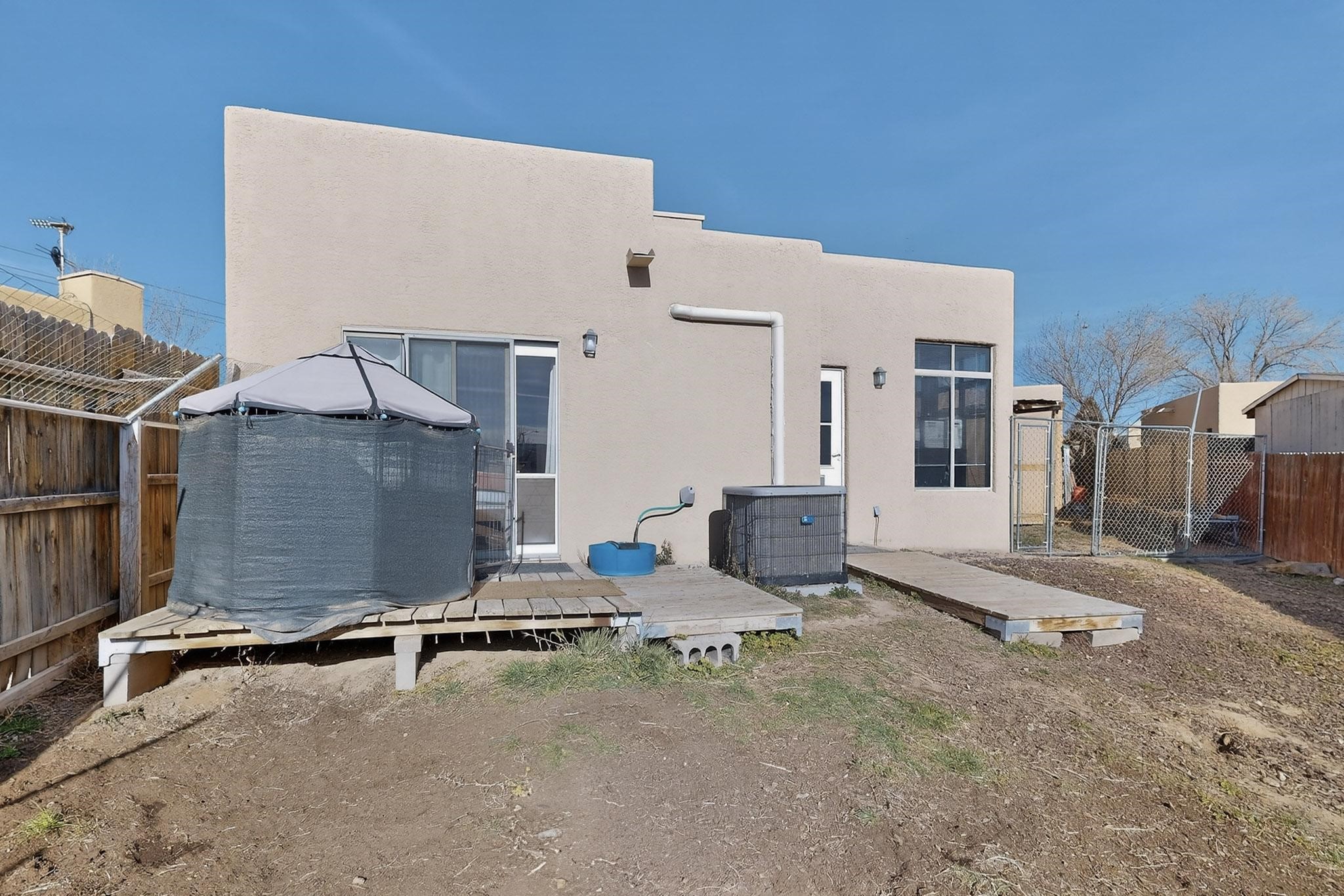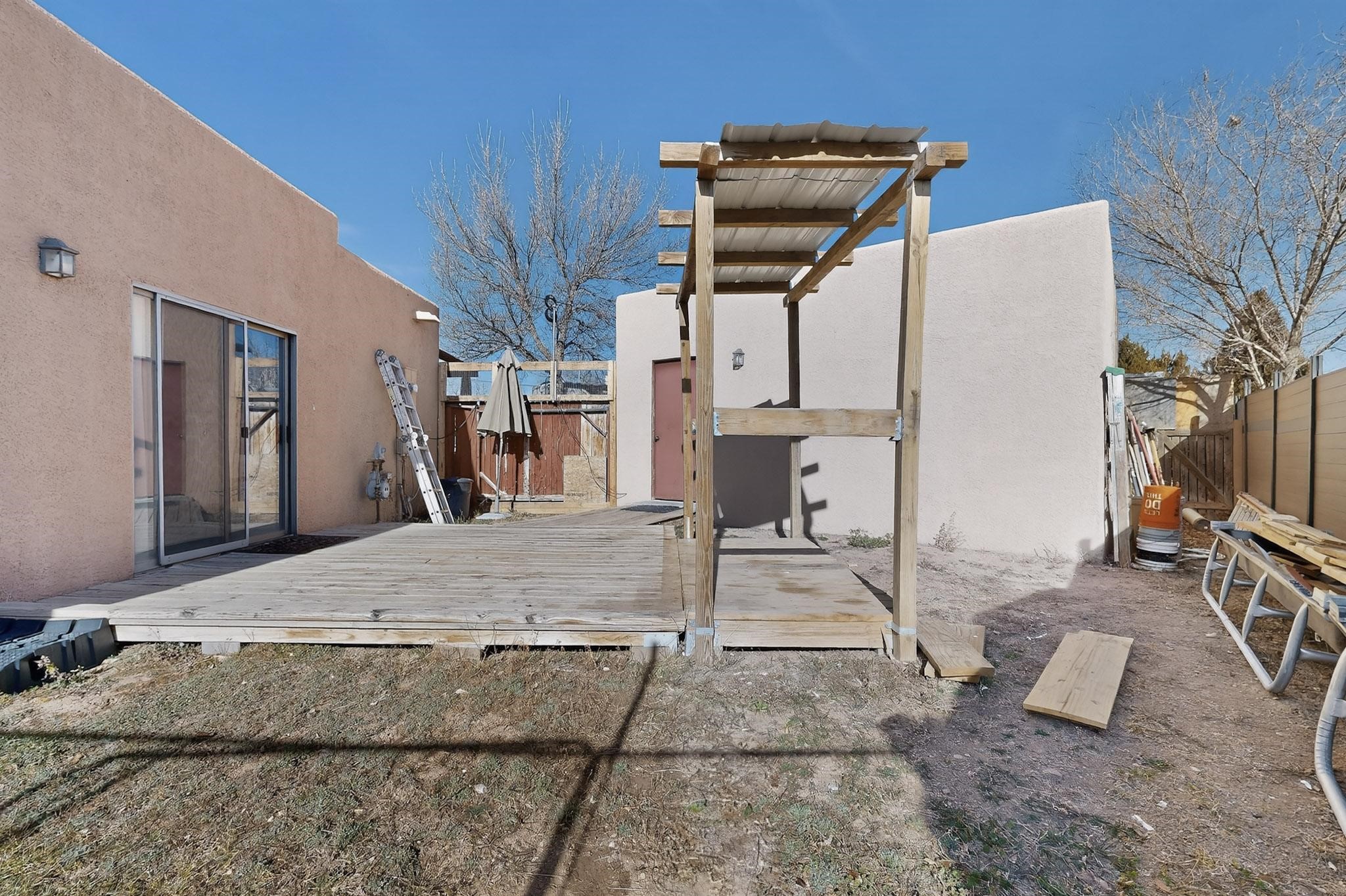This two bedroom, two bathroom, single level home with a two car detached garage is the Perfect and Best Value in Santa Fe! The open concept living and dining area is flooded with natural light and has easy to care for flooring. The dining area offers patio access to the east yard and a custom trellis awaiting a porch swing. Quick access to a separated backyard allows for pets to enjoy their own space. Lots of great outdoor areas awaiting your ideas. The primary suite has a custom closet with a sliding barn door, private access to the backyard with a deck and a primary bathroom with a sliding barn door as well, to allow for maximum use of the space. Bedroom #2 sits at the entry of the home with a cul-de-sac view and access to the guest's full bathroom. The stackable washer and dryer save space and are tucked away from view. Lots of great perks, including the refrigerated A/C that was added and the storage shed in the backyard that will convey. The Seller is offering a $3,000 credit towards a flooring allowance and a $2,000 paint allowance with a reasonable and accepted offer.
