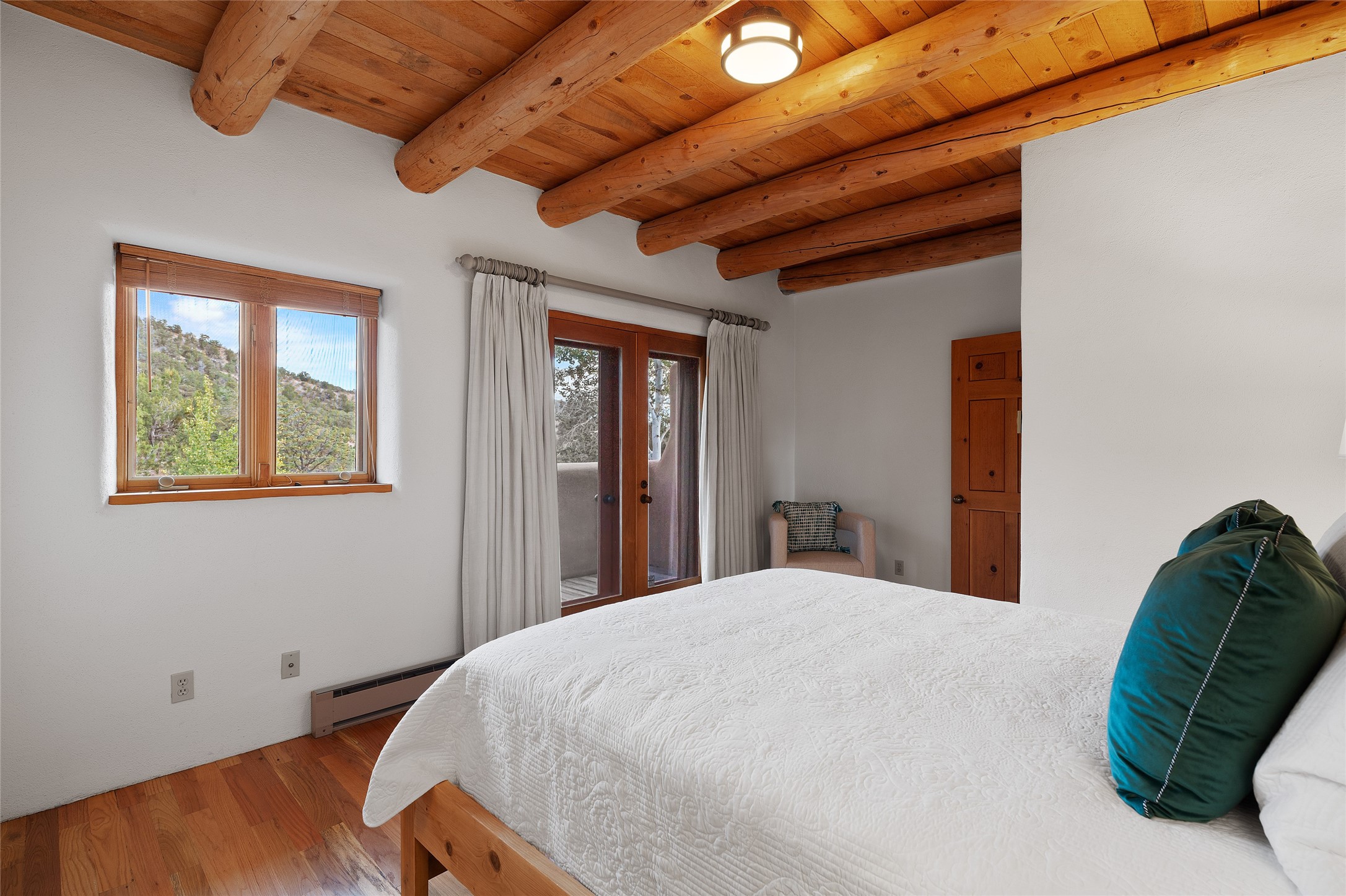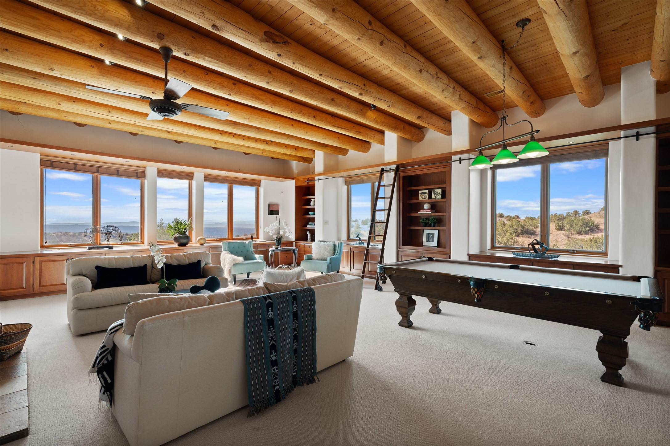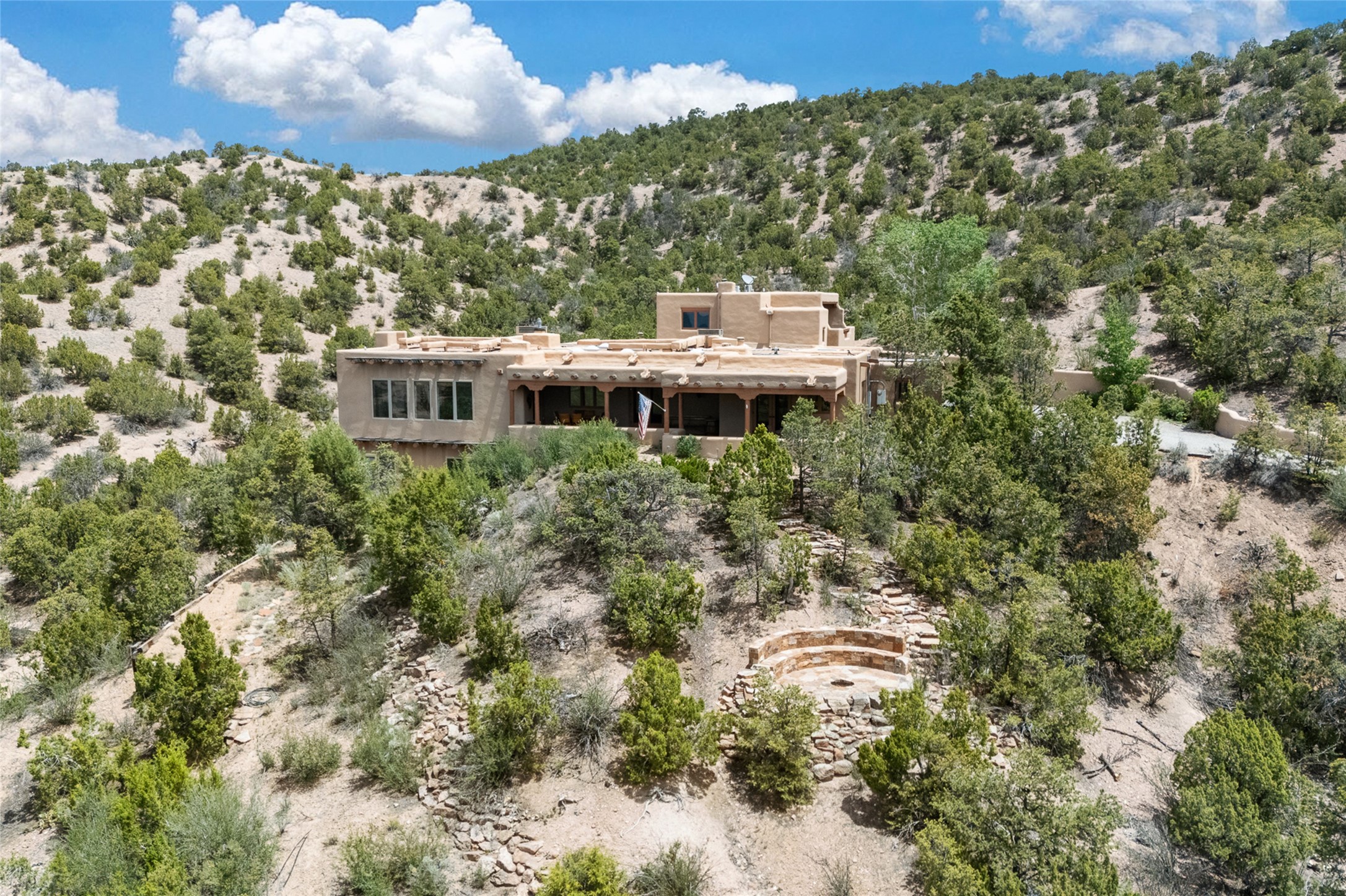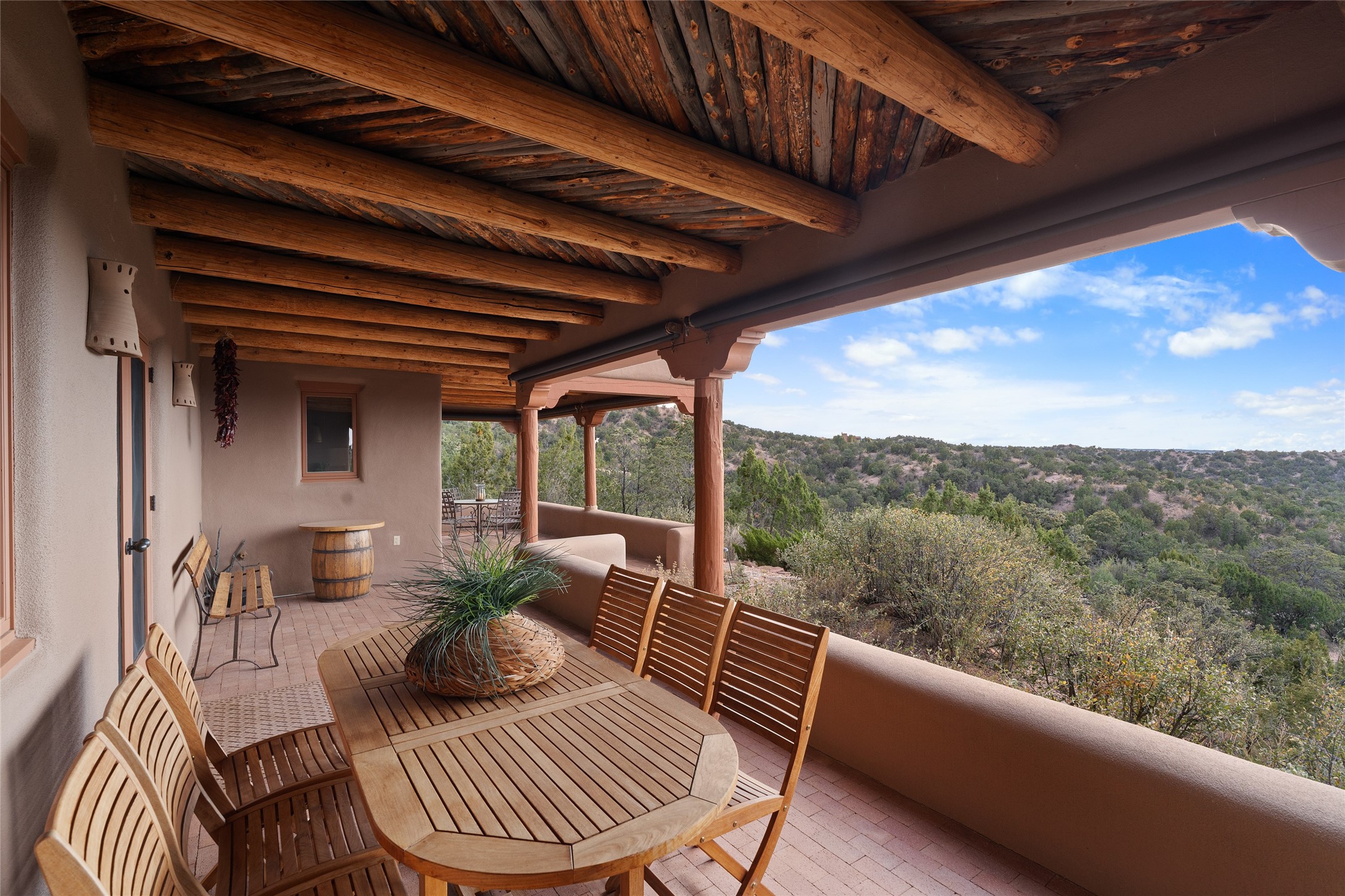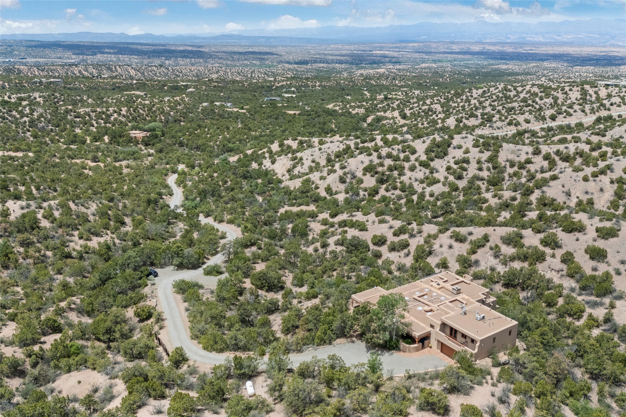Here's a rare chance to own a very special property in gorgeous, exclusive Los Caminitos, and wouldn't you like to live on Love Street- Camino Amor! A classic Santa Fe Style Hacienda sits atop a glorious ridgeline on 27 lush, private acres in the luxurious green hills of private Los Caminitos with views that go on forever and ever, overlooking vistas far and wide for miles! This is easy living, with easy entertaining flowing through spacious rooms with high finished ceilings and all of the Santa Fe touches; vigas, corbels, lintels, nichos and bancos that enhance this happy ambience. 5 bedrooms and 6 baths with a nice separation of spaces comfortably accommodate all your family and friends! It is silent out here...You can hear the cicadas and the bluebirds, and see millions of stars at night in the big, deep, dark sky. You can be alone with the universe here. This impeccably maintained home is move-in ready now as it is, or you could take it to the next level and create a publishable showplace. As an owner in the lovely gated community of Los Caminitos, whose website you may visit for further information, you will be a member of the private Los Caminitos Clubouse with pool, tennis, pickleball, barbecue facilities and private party house for members use. A stones throw to elegant Encantado, and about 12 minutes to the plaza, you are sure to come back home to peace, serenity, and love here on Camino Amor.