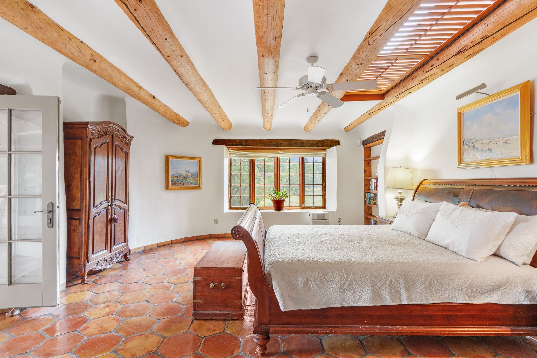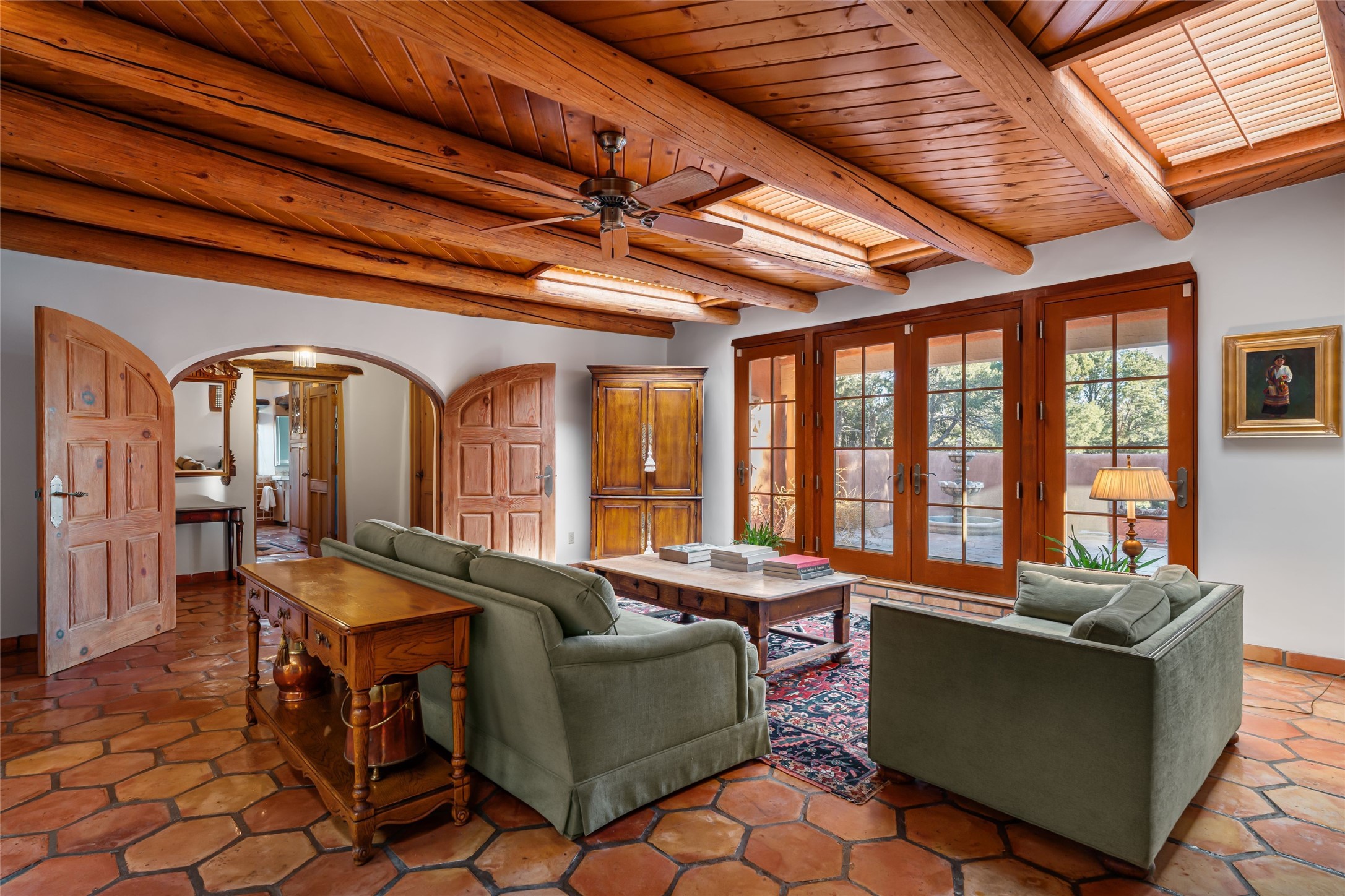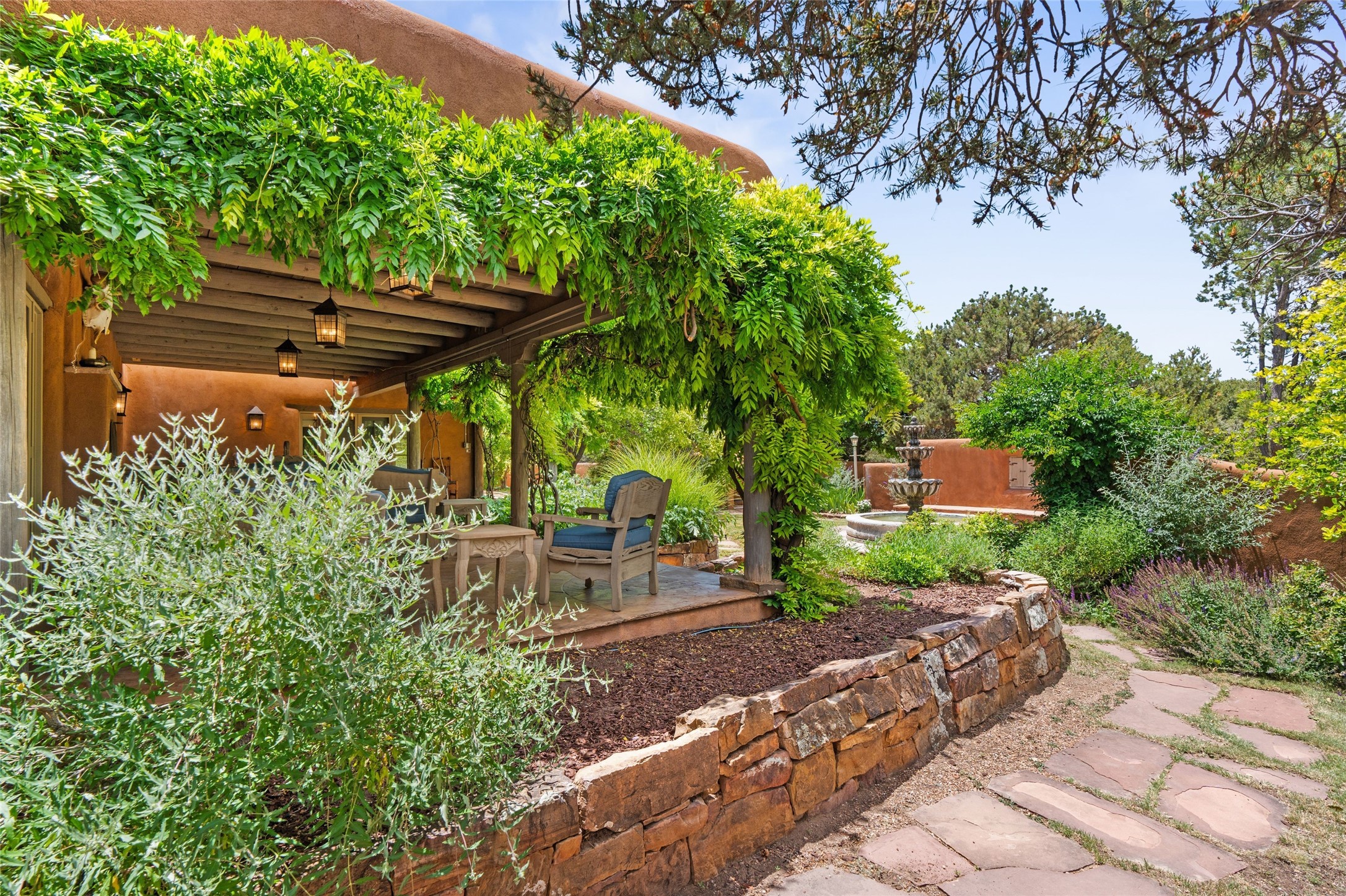 One doesn't simply just buy a Buzz Bainbridge property; one acquires an iconic aesthetic, a lifestyle, an environment of luxurious beauty to live in among his signature Santa Fe features: genuine handmade Adobe walls, some 30" thick; large open room spaces with gorgeous wraparound views and gorgeously embellished high ceilings, wonderful finishes with vigas and latillas and nichos, and kivas, and all the creature comforts of happy living. The intelligent floor plan opens onto gorgeous courtyards, portals, patios, and gardens abounding with high old trees, fountains, and established perennial flowers that embrace the property on the sprawling 7.5 acres. There is even a nurturing, part subterranean greenhouse for year-round blooms and vegetation. The double Adobe main house has three bedrooms, each with its own bath, each with a fireplace, while up the driveway sit the lovely two-bedroom guest house... privately separate, but close enough to borrow a cup of sugar! An additional art studio by the guesthouse with bathroom and fireplace can be an art space or a third bedroom on the guesthouse. There is no HOA to instruct you! The elegant location on prestigious Calle San Martin is 8 minutes to De Vargas mall and 10 to the airport! Yet you feel like you are unwinding in the country! Already pre-inspected with imperfections cured. This is opportunity knocking...!