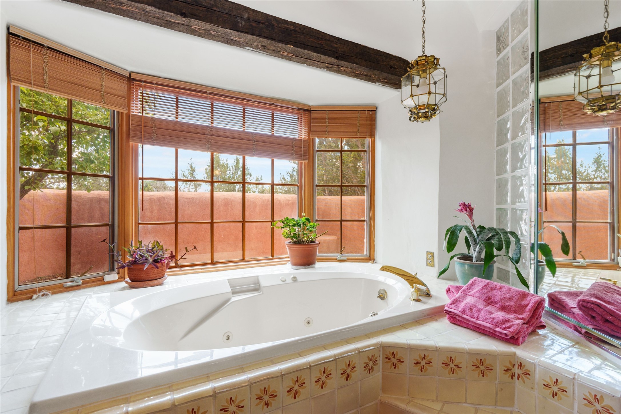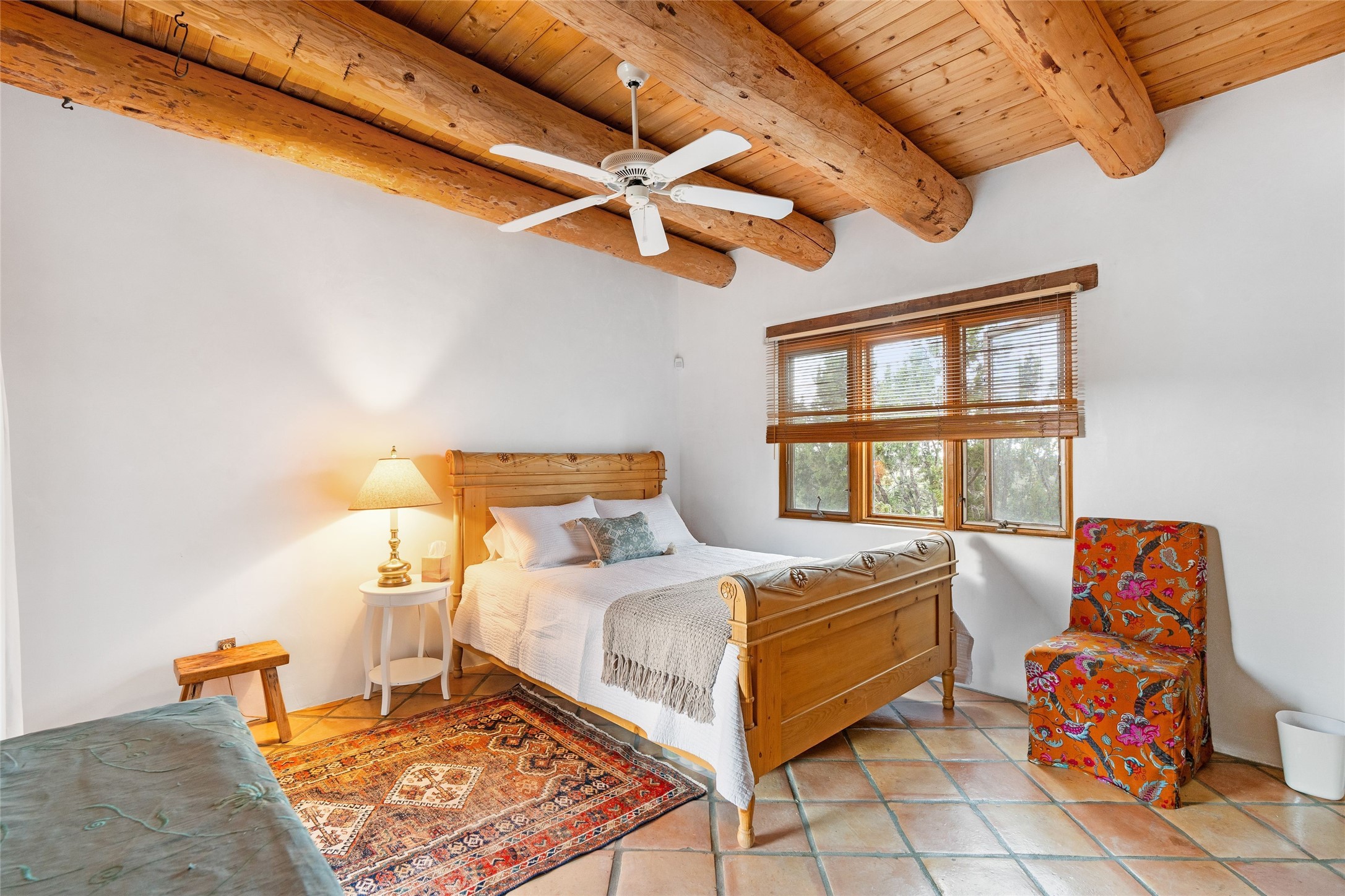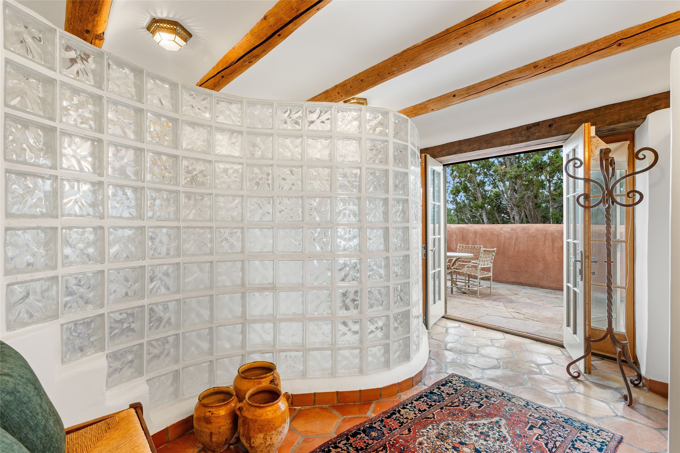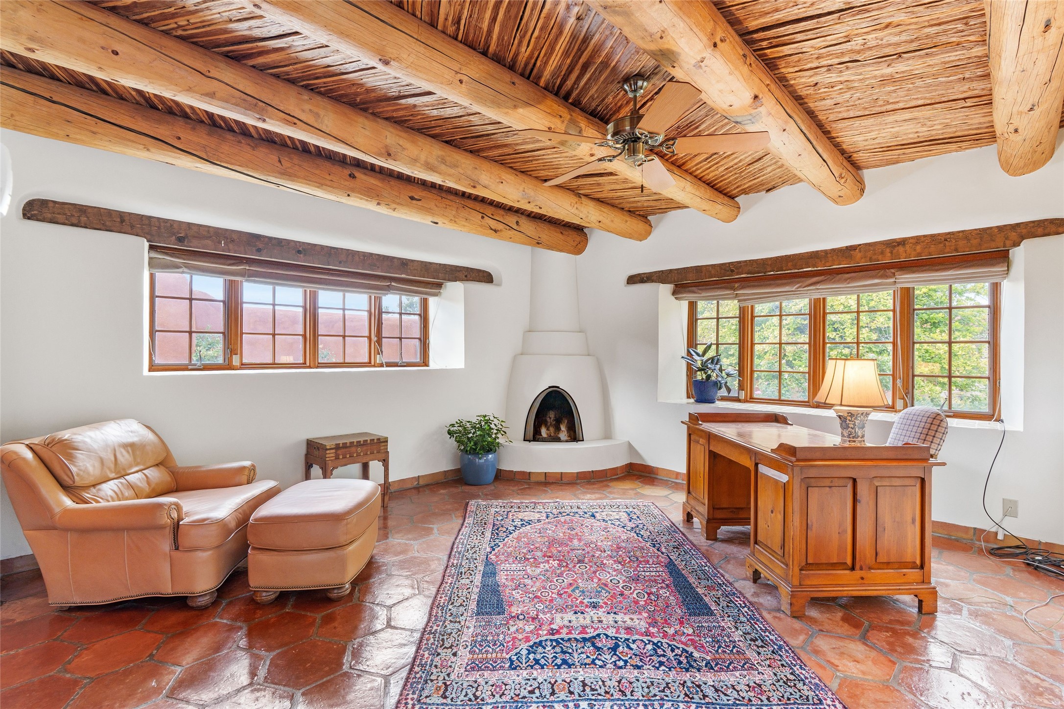 One doesn't simply just buy a Buzz Bainbridge property; one acquires an iconic aesthetic, a lifestyle, an environment of luxurious beauty to live in among his signature Santa Fe features: genuine handmade Adobe walls, some 30" thick; large open room spaces with gorgeous wraparound views and gorgeously embellished high ceilings, wonderful finishes with vigas and latillas and nichos, and kivas, and all the creature comforts of happy living. The intelligent floor plan opens onto gorgeous courtyards, portals, patios, and gardens abounding with high old trees, fountains, and established perennial flowers that embrace the property on the sprawling 7.5 acres. There is even a nurturing, part subterranean greenhouse for year-round blooms and vegetation. The double Adobe main house has three bedrooms, each with its own bath, each with a fireplace, while up the driveway sit the lovely two-bedroom guest house... privately separate, but close enough to borrow a cup of sugar! An additional art studio by the guesthouse with bathroom and fireplace can be an art space or a third bedroom on the guesthouse. There is no HOA to instruct you! The elegant location on prestigious Calle San Martin is 8 minutes to De Vargas mall and 10 to the airport! Yet you feel like you are unwinding in the country! Already pre-inspected with imperfections cured. This is opportunity knocking...!