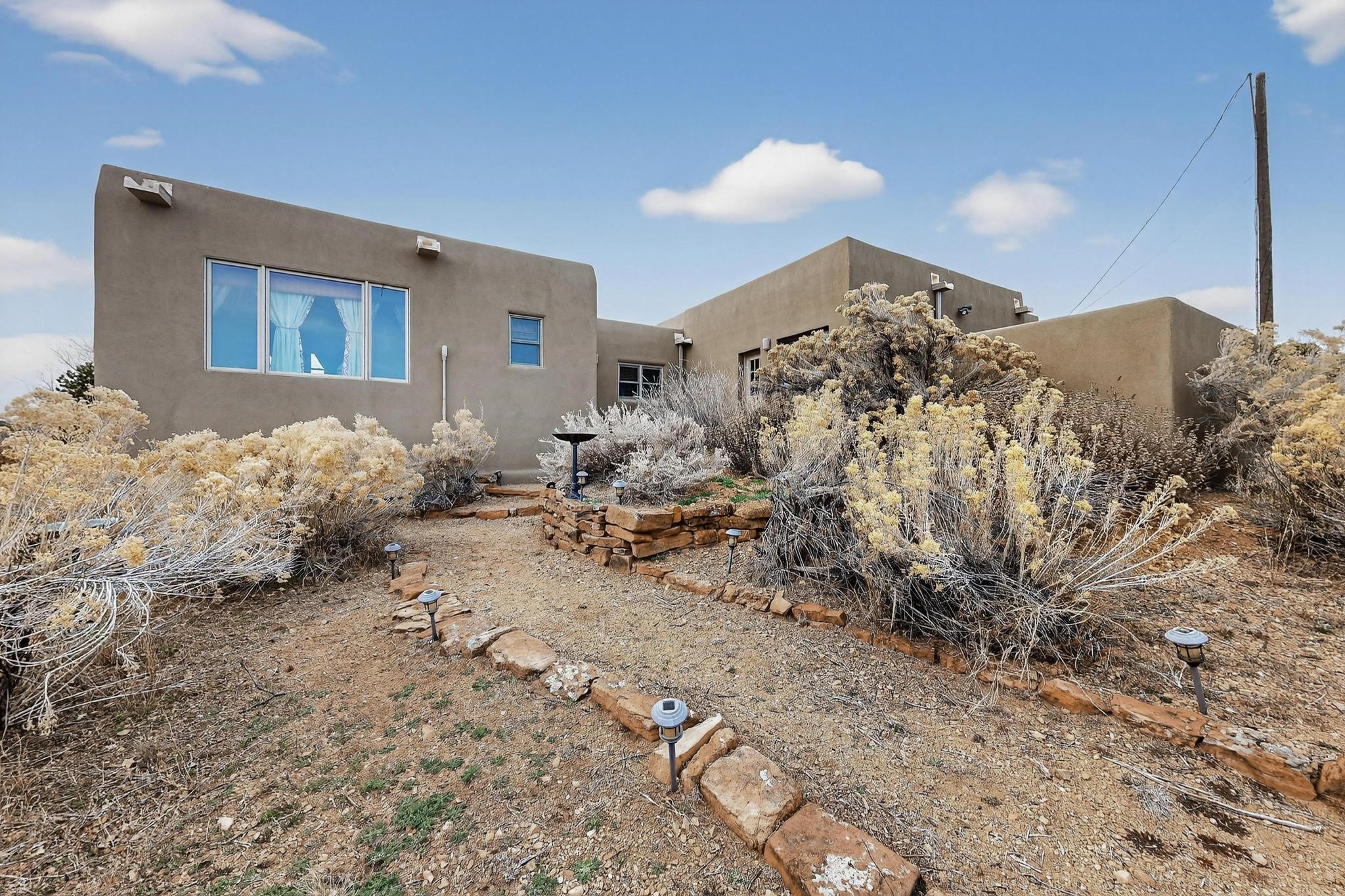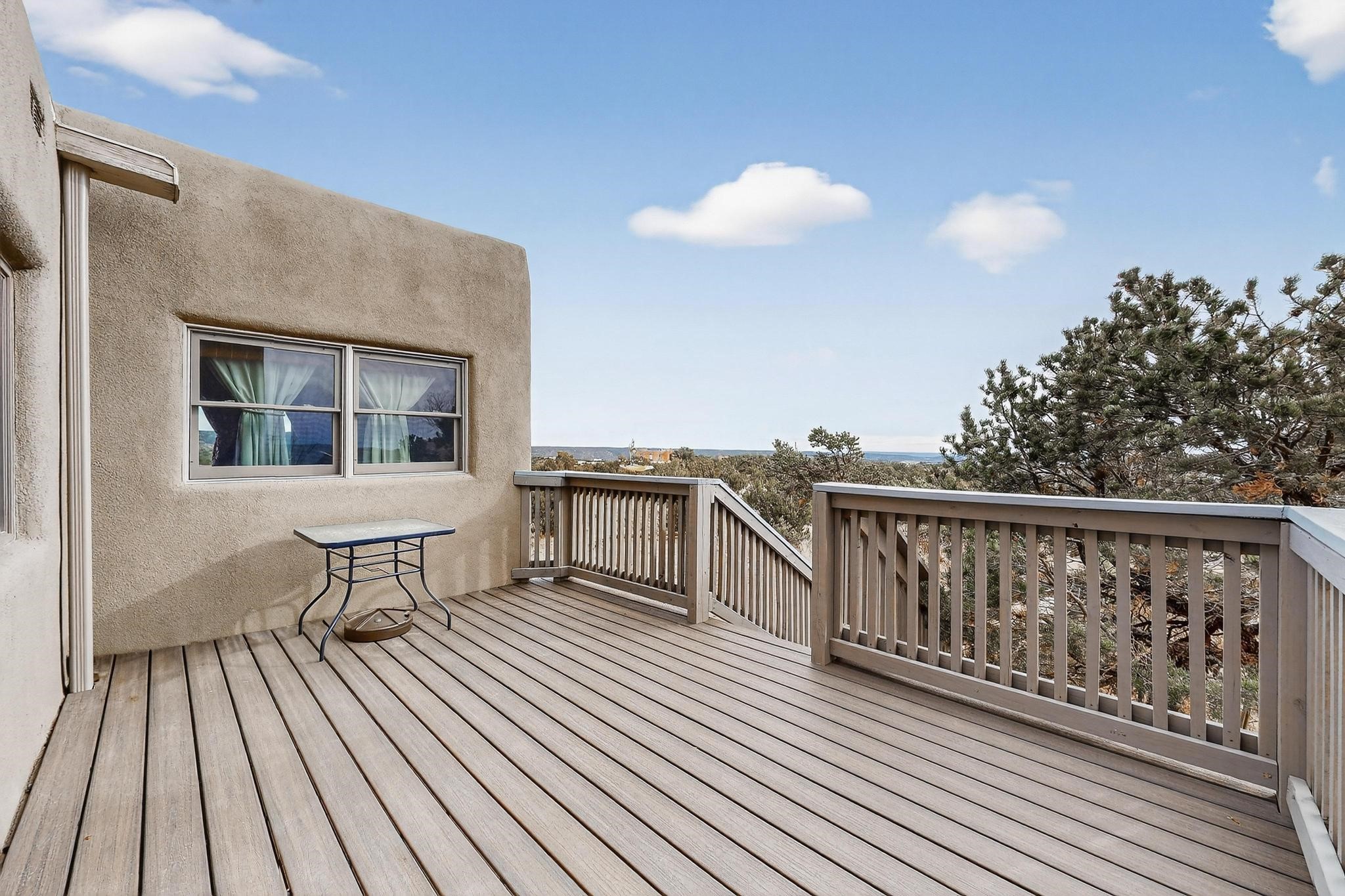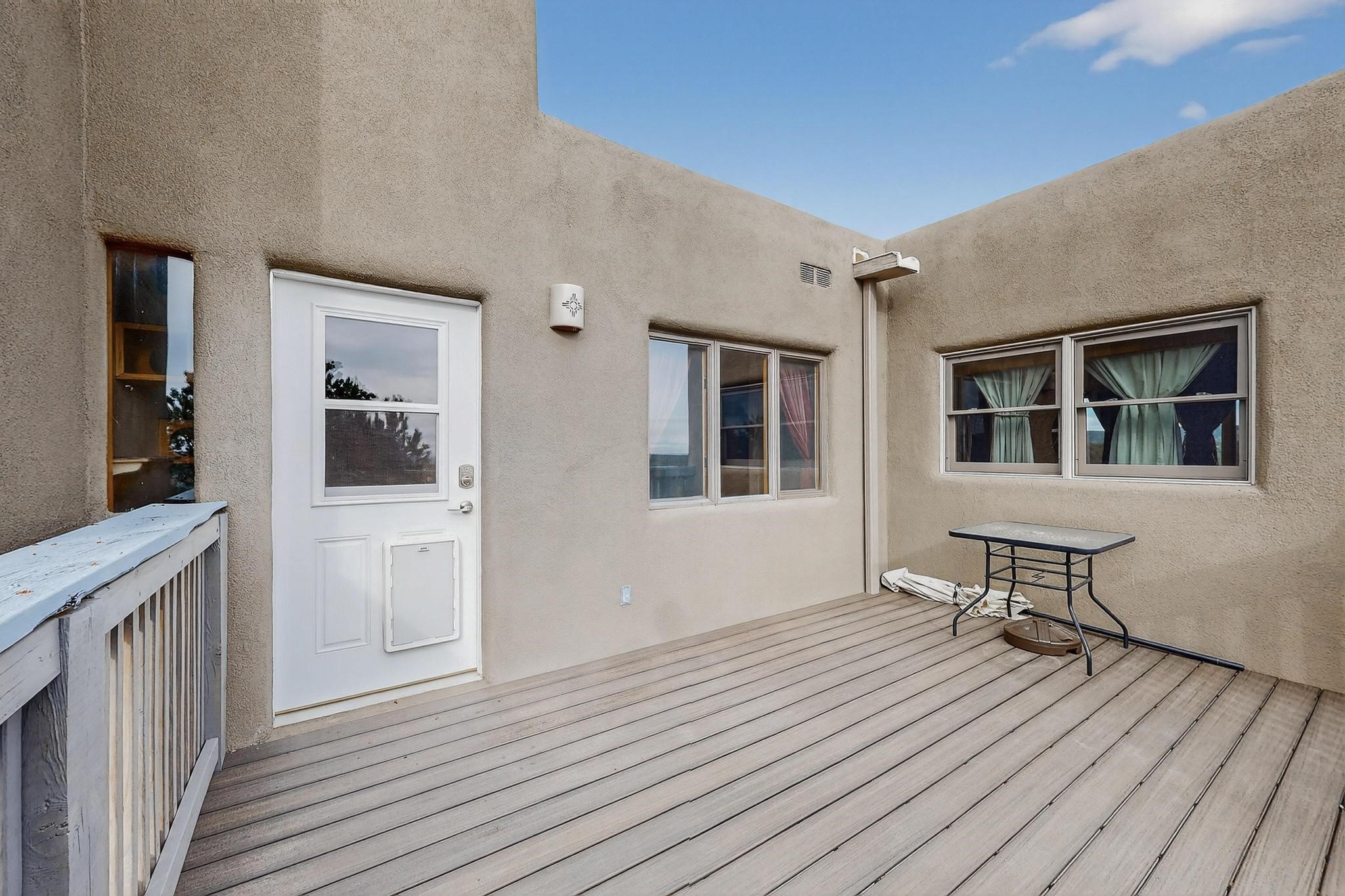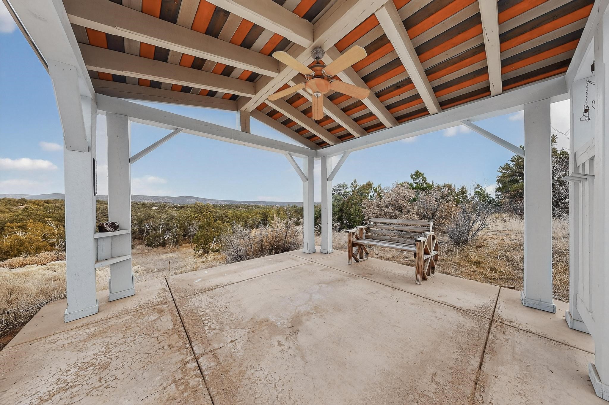 Move in Ready! Priced to Sell. Wonderful passive solar trilevel design nestled on a hilltop with decks and a lighted gazebo to enjoy the sweeping Sangre's and Pecos mountain views. A flexible floorpan with the owners suite, kitchen, dining and living areas on the main level. A TV / family room, and an office upstairs with a view deck. A walk out lower level includes 2 guest bedrooms, a full bath and laundry. The 36' x 29' heated garage also has a workshop and storage room. In 2023 the stucco and roof were replaced, 3 Bosch mini splits added, a new tankless hot water heater, plus new windows and storm doors, 2 trex/wood decks, rain downspouts and the kitchen appliances. In 2024 the well pump was replaced, and there is a 1500 gallon underground cistern. The underground 500 gallon propane tank is owned, the hot tub is ready with fabulous views. All this on 5 acres, No HOA, horses and chickens welcome, only minutes to Eldorado area local shopping and services, or into historic Santa Fe.
