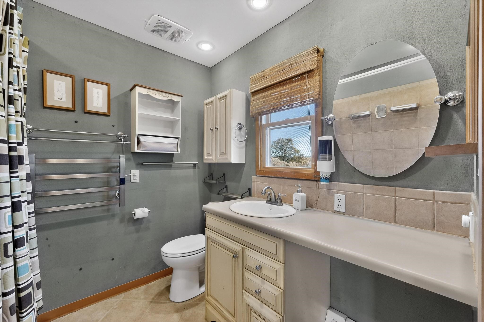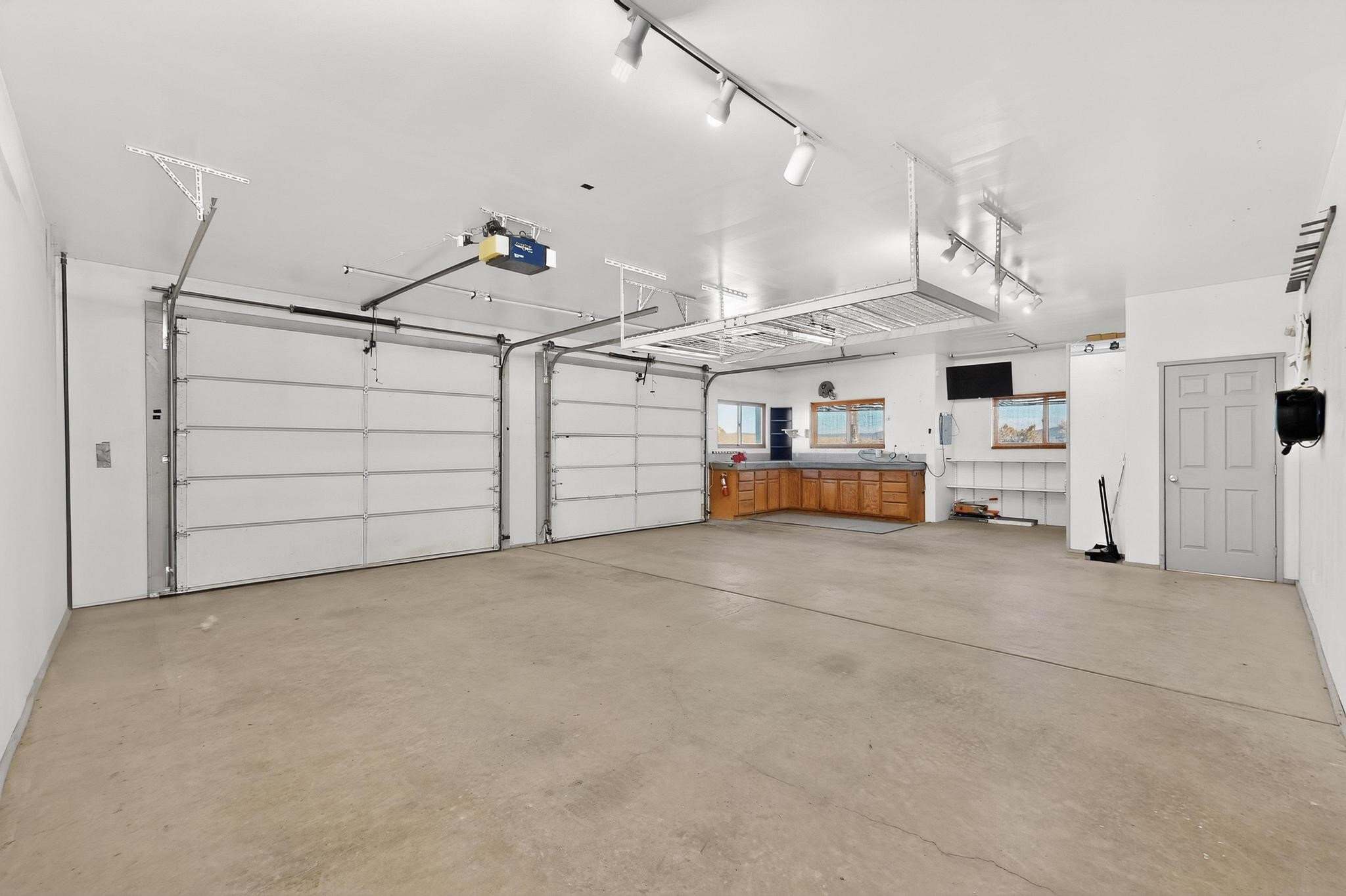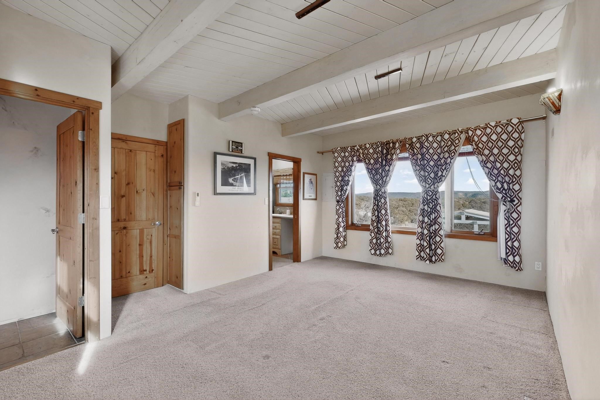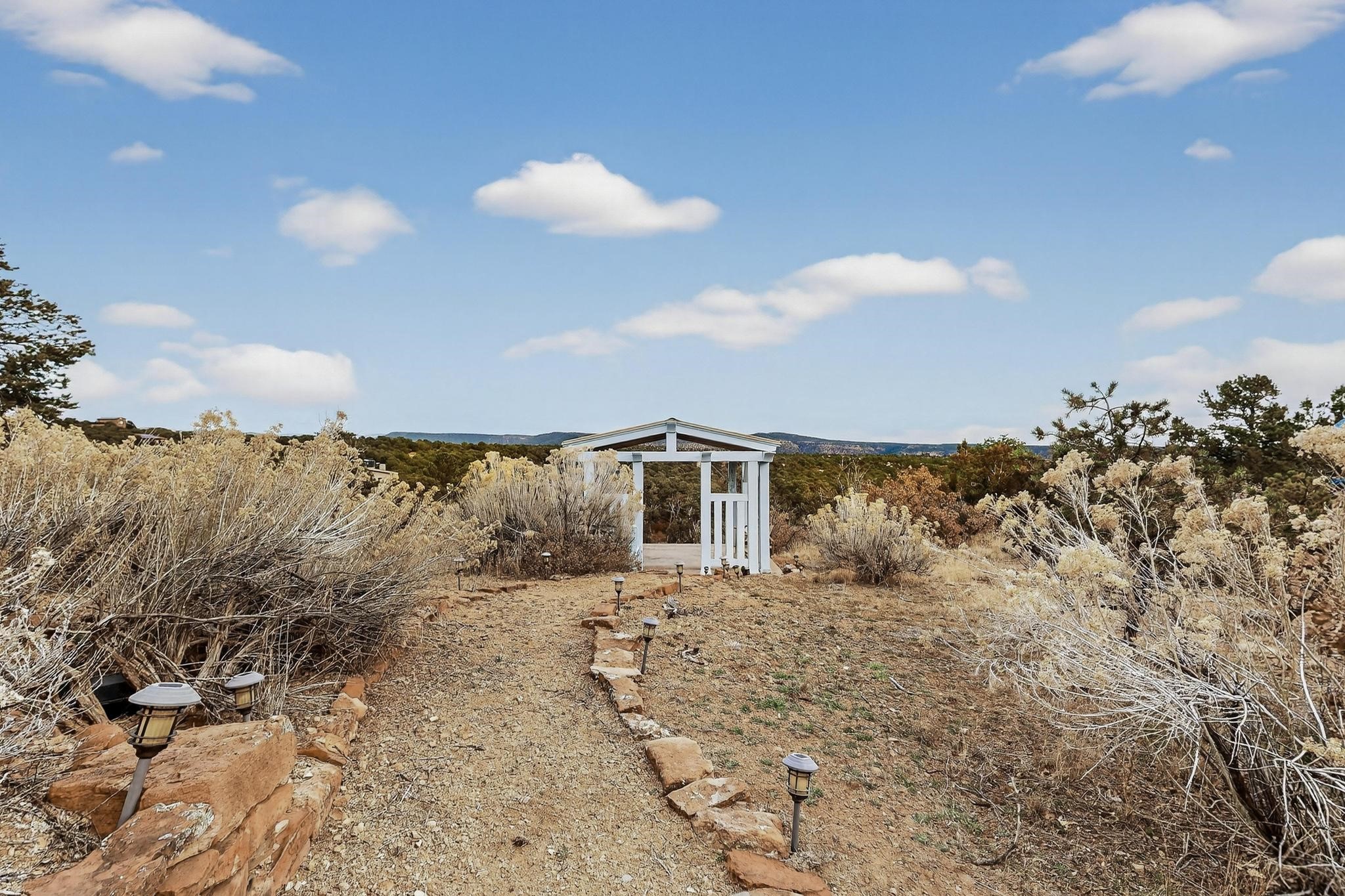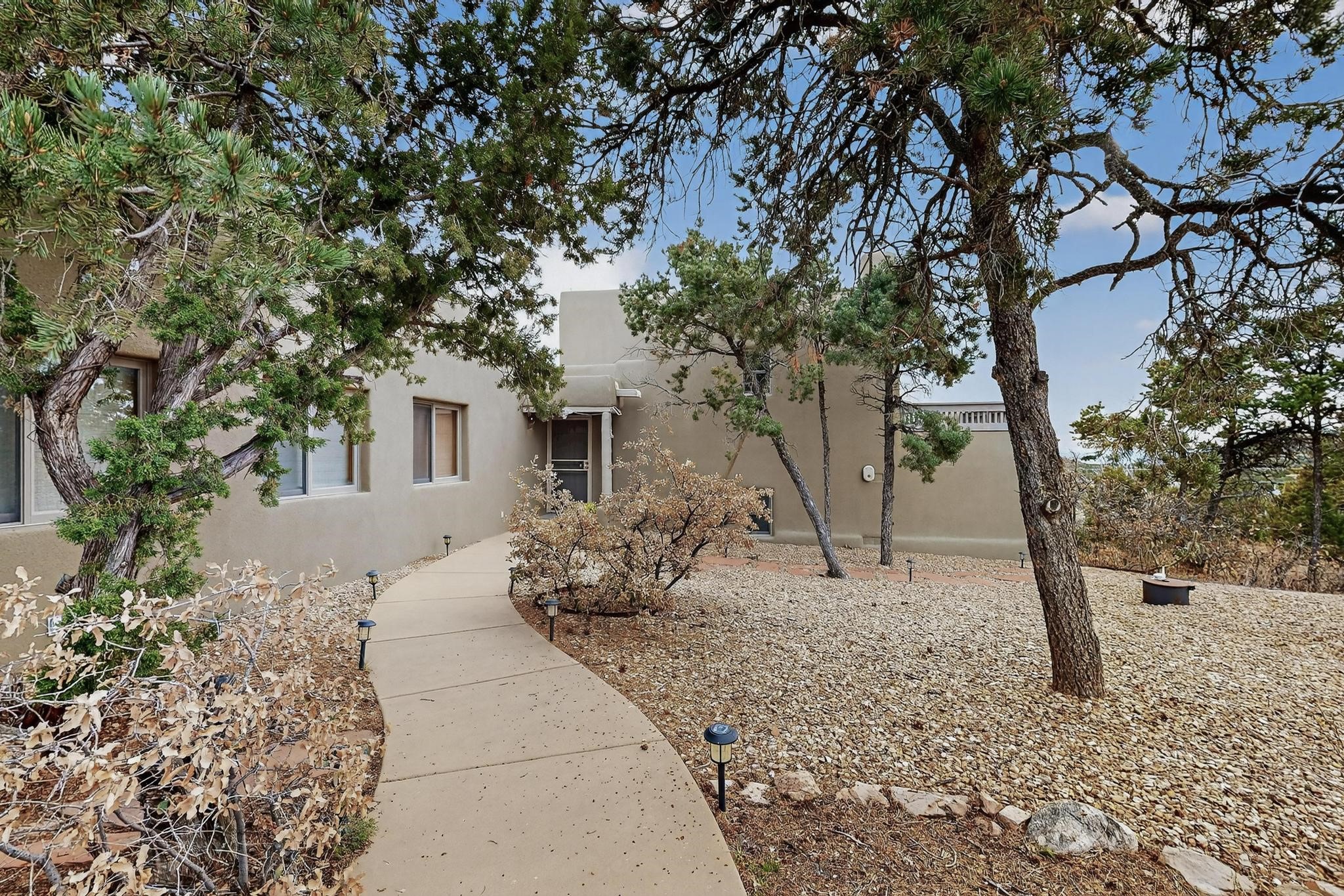 Move in Ready! Priced to Sell. Wonderful passive solar trilevel design nestled on a hilltop with decks and a lighted gazebo to enjoy the sweeping Sangre's and Pecos mountain views. A flexible floorpan with the owners suite, kitchen, dining and living areas on the main level. A TV / family room, and an office upstairs with a view deck. A walk out lower level includes 2 guest bedrooms, a full bath and laundry. The 36' x 29' heated garage also has a workshop and storage room. In 2023 the stucco and roof were replaced, 3 Bosch mini splits added, a new tankless hot water heater, plus new windows and storm doors, 2 trex/wood decks, rain downspouts and the kitchen appliances. In 2024 the well pump was replaced, and there is a 1500 gallon underground cistern. The underground 500 gallon propane tank is owned, the hot tub is ready with fabulous views. All this on 5 acres, No HOA, horses and chickens welcome, only minutes to Eldorado area local shopping and services, or into historic Santa Fe.