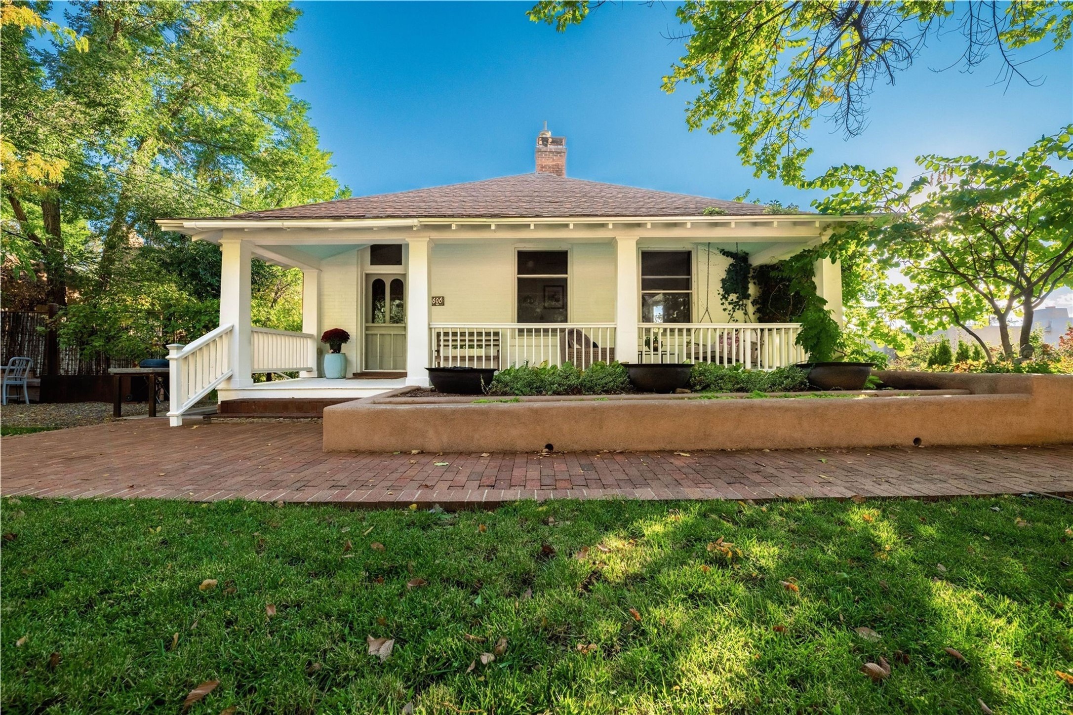Palace Avenue is Santa Fe's coveted crown jewel of streets--people wait years for an opportunity to own a home here. Elegant, prestigious, and with that magical old Santa Fe feel. You're moments from Canyon Road's galleries, steps to Santa Fe's best restaurants, at the epicenter of the city's internationally celebrated arts scene. Walk through the front gate, and the first thing you see is the magnificent garden by landscape architect Alana Markle, whose work is featured in Sunset magazine and Su Casa. Mature trees offer cooling dappled shade, and the bubbling fountain provides a calming soundtrack. The generous front porch with a classic swing invites you to pause--morning coffee, evening wine and conversations. The adobe wall surrounding the home provides privacy. Fruit trees line the side of the property. Step inside this treasure of a home and discover what makes it so special: soaring ceilings, incredible interior design, and light that pours through every room. The living room glows with natural brightness, hardwood floors gleam beneath those high ceilings, and a wood-burning brick fireplace that becomes the heart of winter evenings. Move into the kitchen designed for people who actually cook--a chef's stove, upgraded appliances, and a Moroccan tile backsplash. The kitchen opens up to another living area with exposed brick and a picturesque bay window. The primary suite is your sanctuary--hardwood floors, high ceilings, walk-in closet with built-in storage, and a spa-like bathroom with clawfoot soaking tub and natural light. Downstairs is cozy and inviting: a den with thick exposed stone walls and three bedrooms, each with generous storage. Outside, Alana Markle's design continues to shine--thoughtfully curated spaces for al fresco dining, a hot tub for unwinding under the stars. Plenty of room to expand parking, plant a full garden, or even add a swimming pool. You're not buying potential--you're buying perfection already grown by one of the region's most sought-after landscape architects.