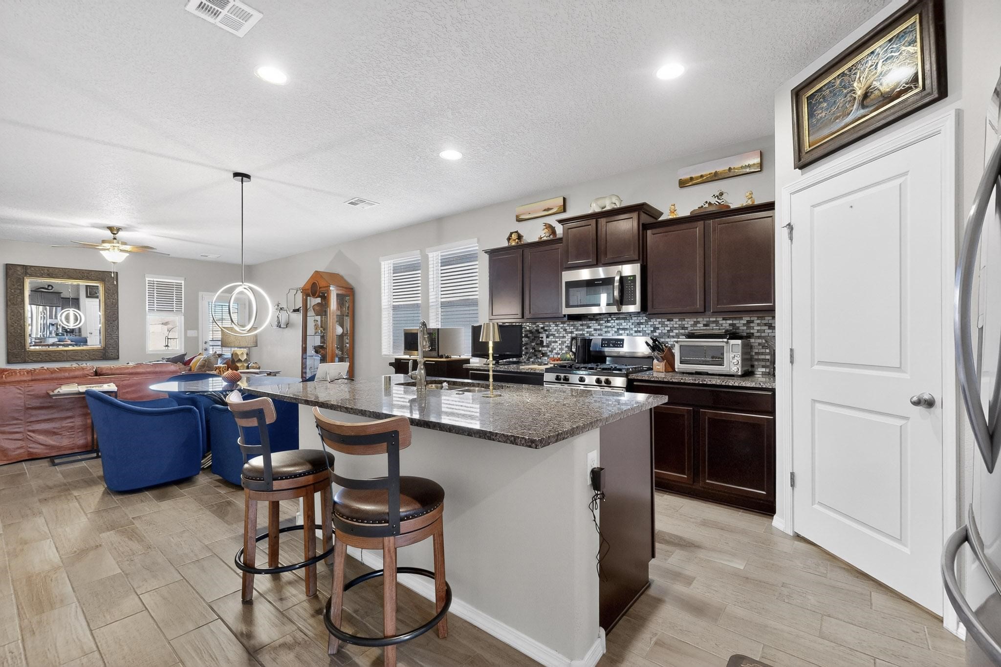Offering attractive curb appeal, this 4 bedroom, 2 bathroom, DR Horton home is exceptional inside and out. Upgraded cabinetry, floors, counters, appliance package and a walled backyard with an open greenbelt behind the property is the perfect idea! The beautiful Anasazi stacked rock on the front of the home offers character and warmth. The floorplan is smart with a guest bedroom upon entry which can double as an office for great privacy. The heart of the home offers an open feel with the wide entry, open kitchen with an oversized island for casual eating and meal prep, a designated dining area with an open view to the living room and a spacious hallway leading to bedroom #2, bedroom #3, the guest bathroom with full bath and the laundry room with access to the finished garage. The primary suite is tucked away at the rear of the home and boasts the right size en-suite with an oversized walk-in shower, walk-in closet, water closet and plenty of storage to stay organized. Enjoy the privacy of the walled backyard awaiting your landscaping ideas and relish the idea that there is open space behind the property giving you room to breathe. The neighborhood park is seconds away allowing one to enjoy the outdoors even more. Easy living with great value and close to highway access for commuters or enjoy the booming southside of town with restaurants, shopping, schools and medical facilities close by.