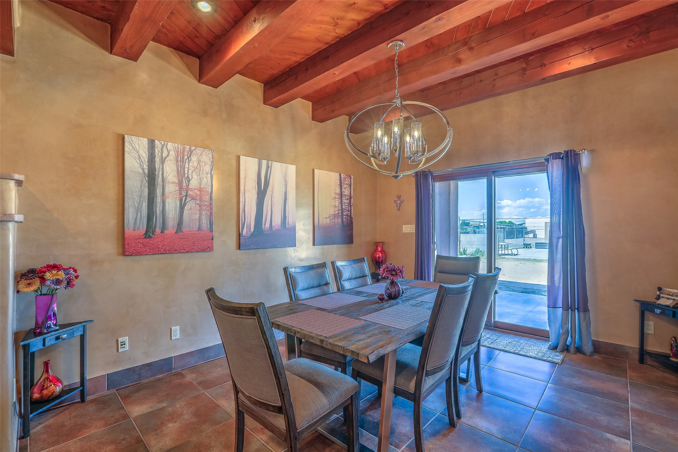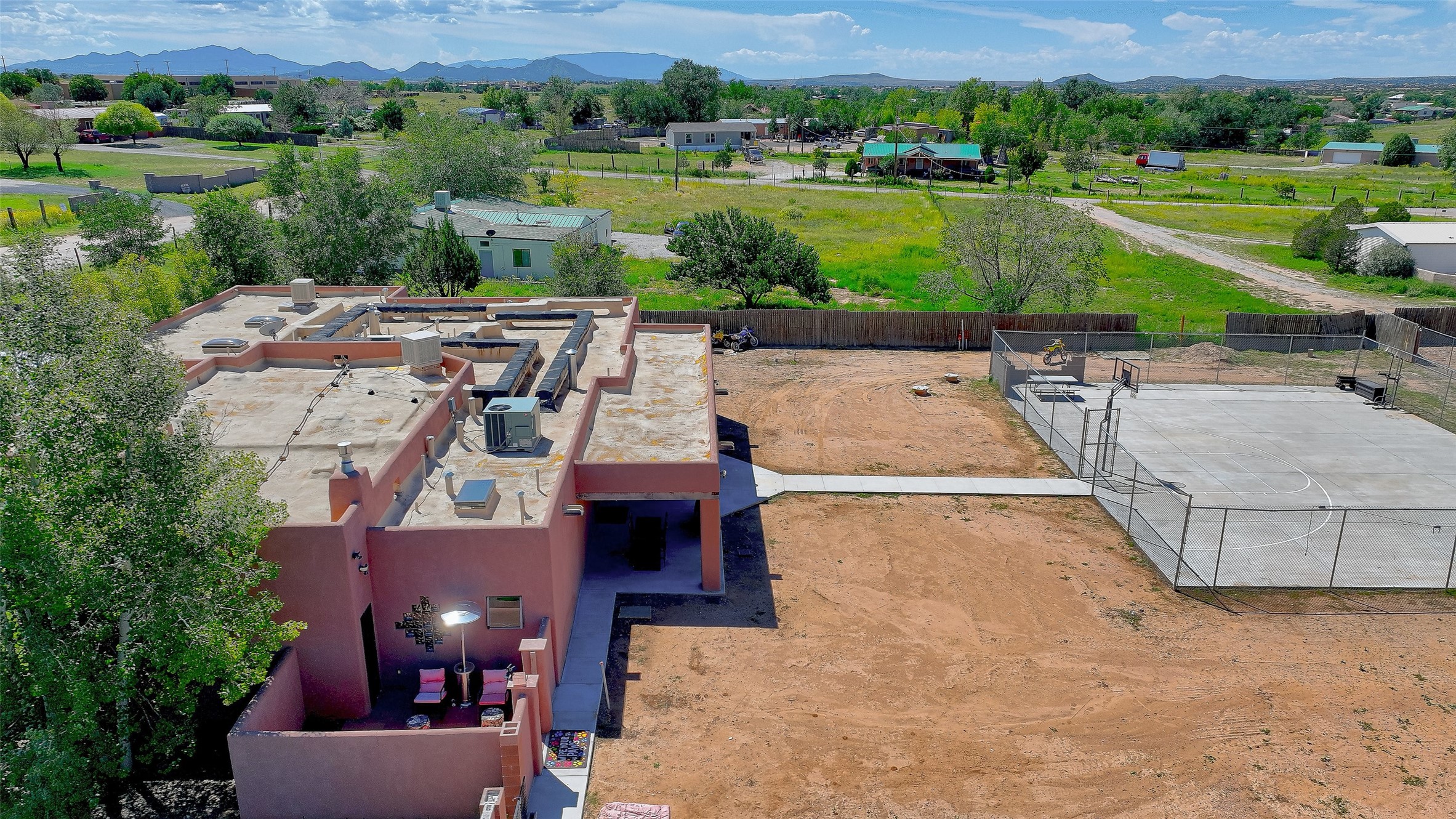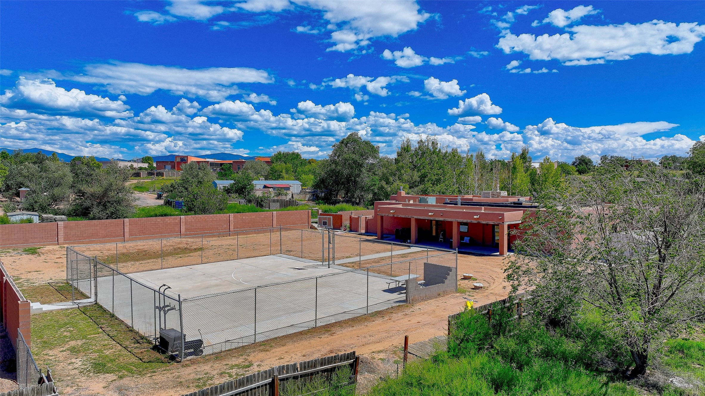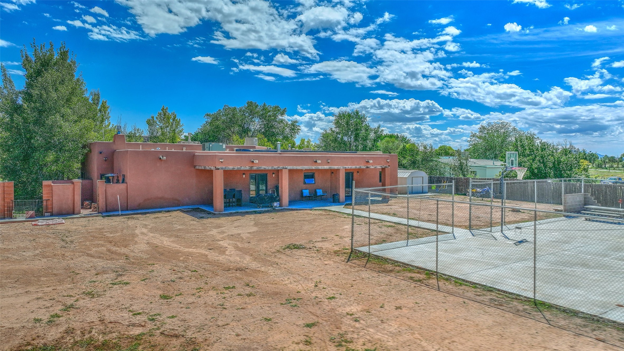 No showings until Mon 1/12. Priced to sell! Don't miss our on this opportunity!!! Absolute Stunner in Santa Fe! Perfect for a Large Family or Investor. Walk into the 2,764 SF 3 Bedroom, 3.5 Bath Primary Home and be greeted with Luxury! A Huge Sunken Family Room creates a Cozy and Intimate Atmosphere for Family Gatherings centered around a Fireplace accented with a Stonewall covering the entire South Wall. Magnificent Vigas and Diamond Finish Walls provide the Perfect Touch! The Kitchen is a True Chefs Delight! The Main Home includes an En Suite, Office, Radiant Floor Heating, Central Vac System, Water Softener System, and a High Efficiency Tankless Water Heater. The Comfy Primary Suite is equipped with its own Fireplace offering the Ultimate Relaxation. Attached to the Main Home is a Fabulous 1,008 SF Efficiency Suite with its own Private Entrance and includes 1 Bedroom, 1 Bath, Office, Full Kitchen, Laundry Room and Living Area. Behind the Full Size Enclosed Basketball Court you will find an additional 1,560 SF Guest Home that was built in 2022. This Modern New Home offers 4 Bedrooms; a Primary Suite, an En Suite, and 2 Guest Rooms and 3 Baths. Features include all Tile Flooring, Tankless Water Heater, TPO Roof, Fenced Yard and its own Private Road. The Two Large (480 SF Each) Utility Sheds/Carports also convey. Don't Miss Out on this One of a Kind Opportunity!!