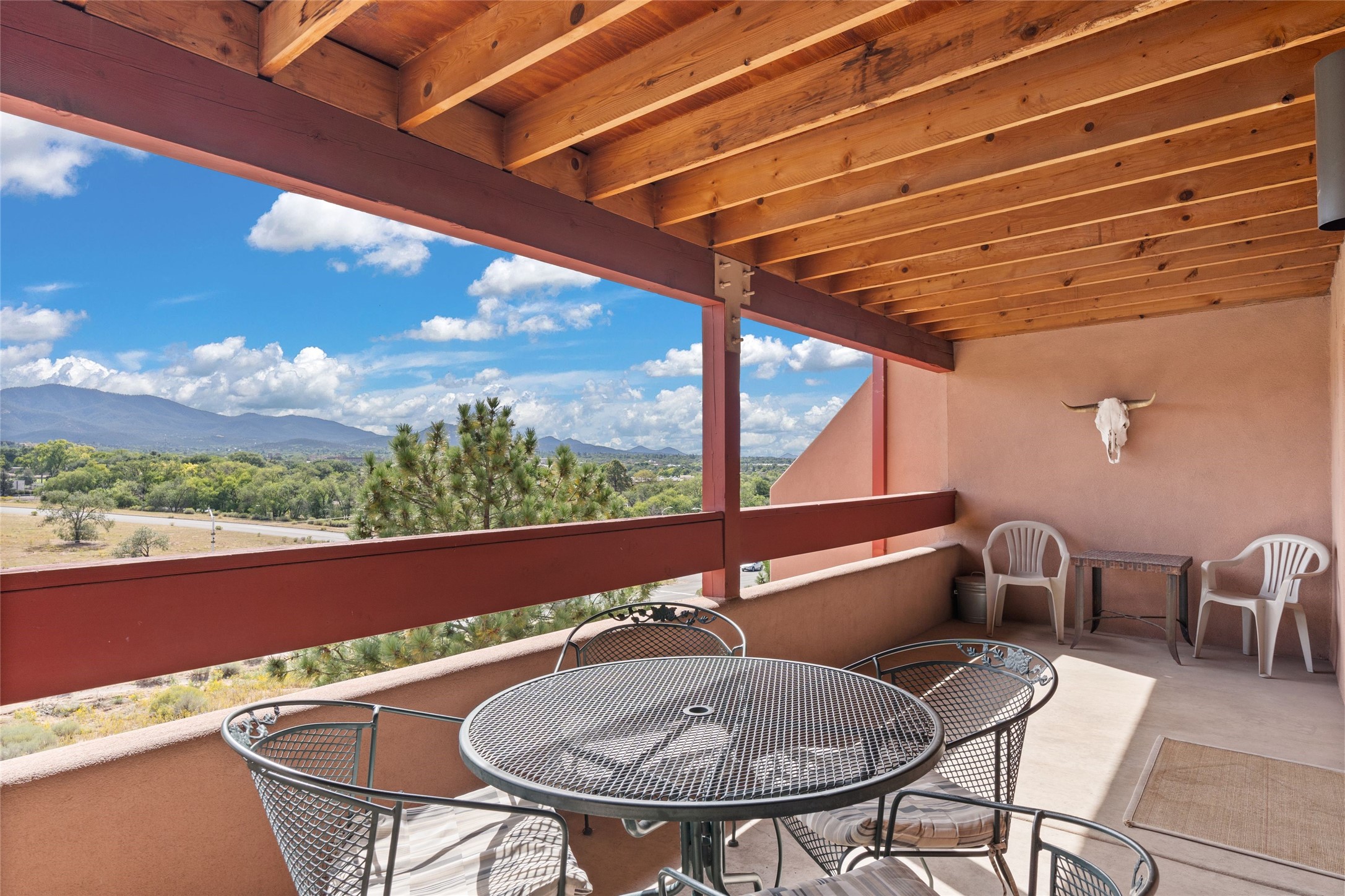 Cielo Grande condominium on the northside offering great views of the Sangre de Cristo mountains from the living room, kitchen, and balcony of the top-floor end unit. The home has two bedrooms and two bathrooms and is located very near downtown and the Plaza. The owner has enjoyed it as a second home and vacation rental for many years. This sweet place is available fully furnished.