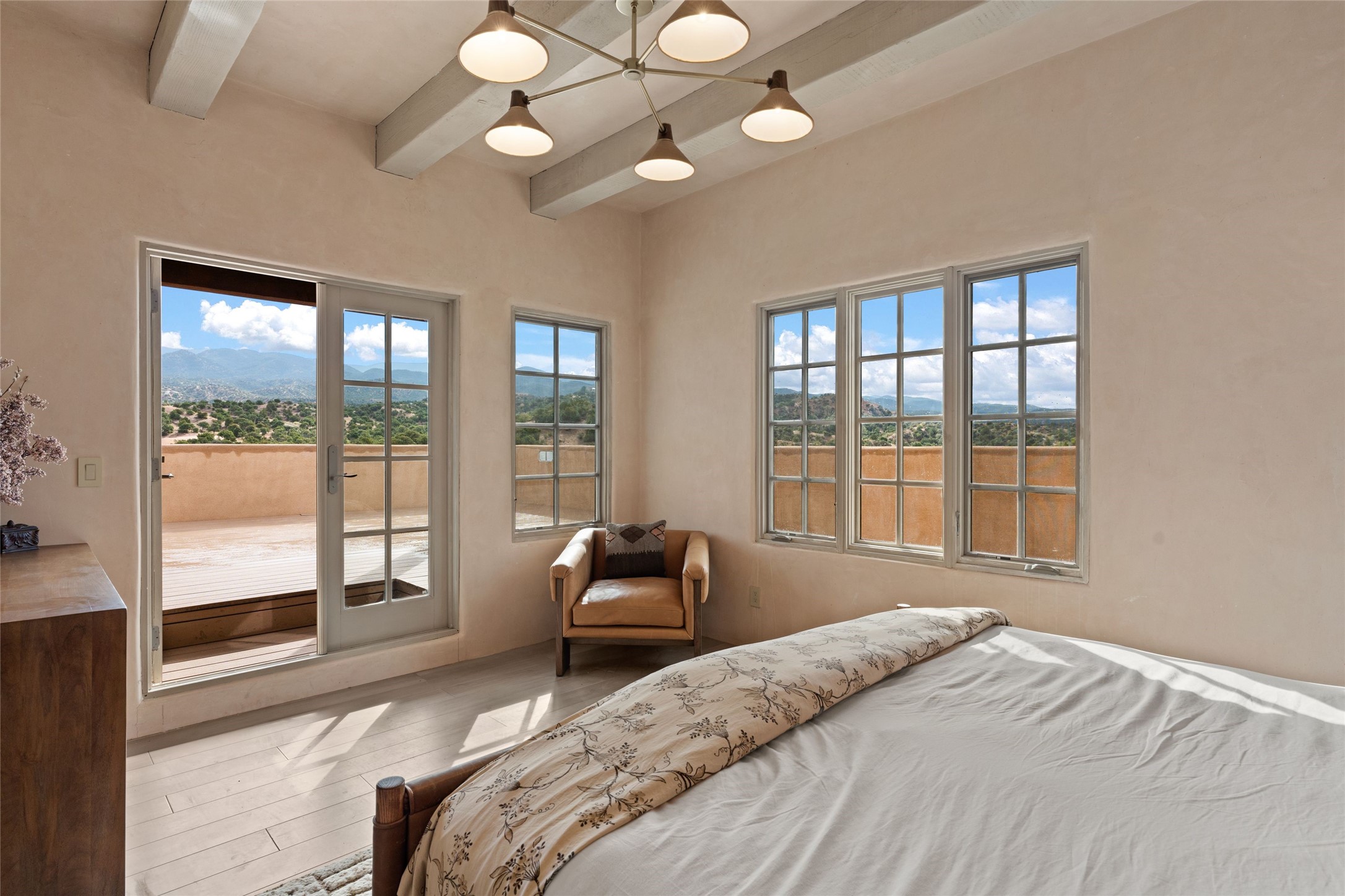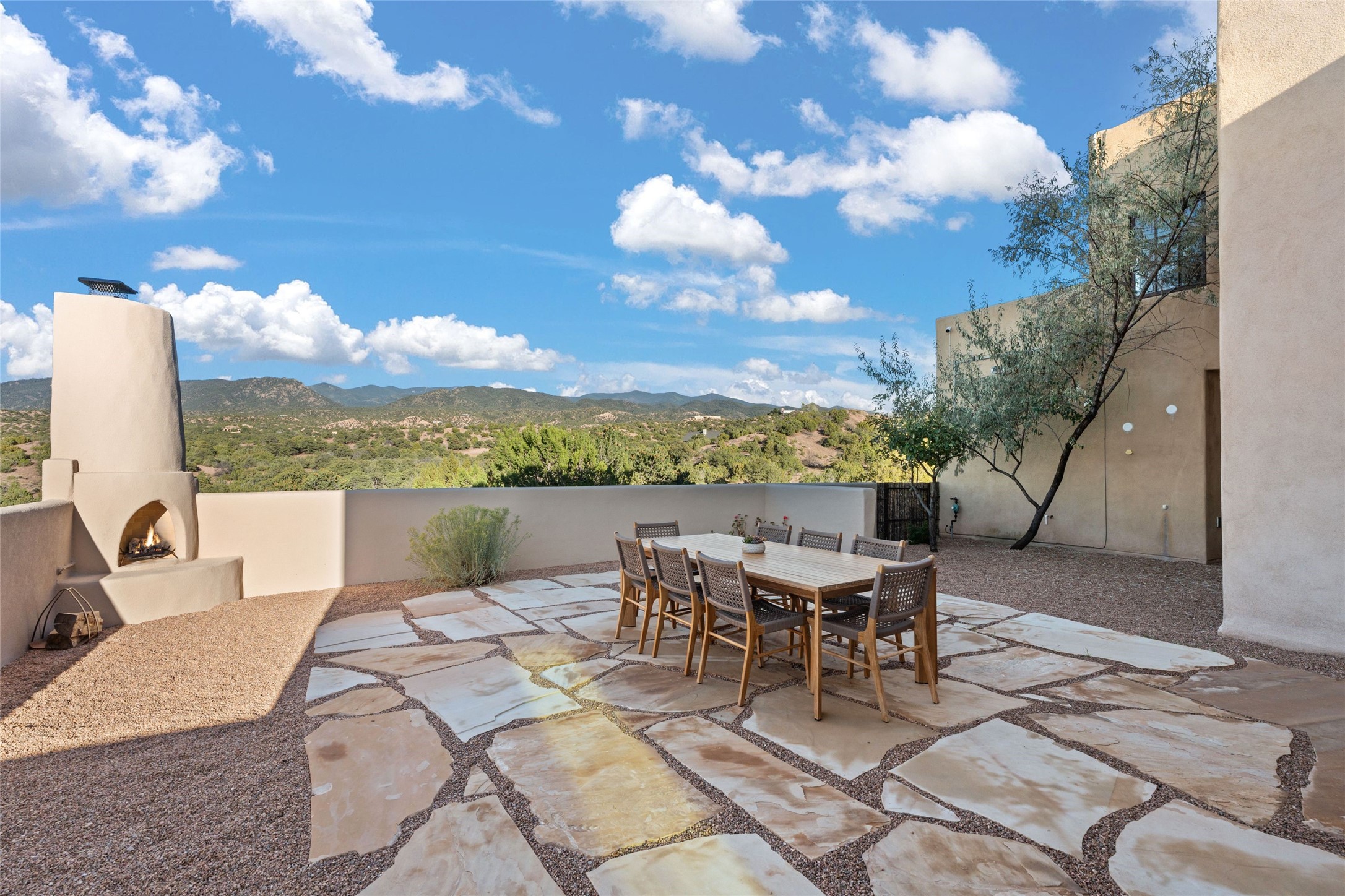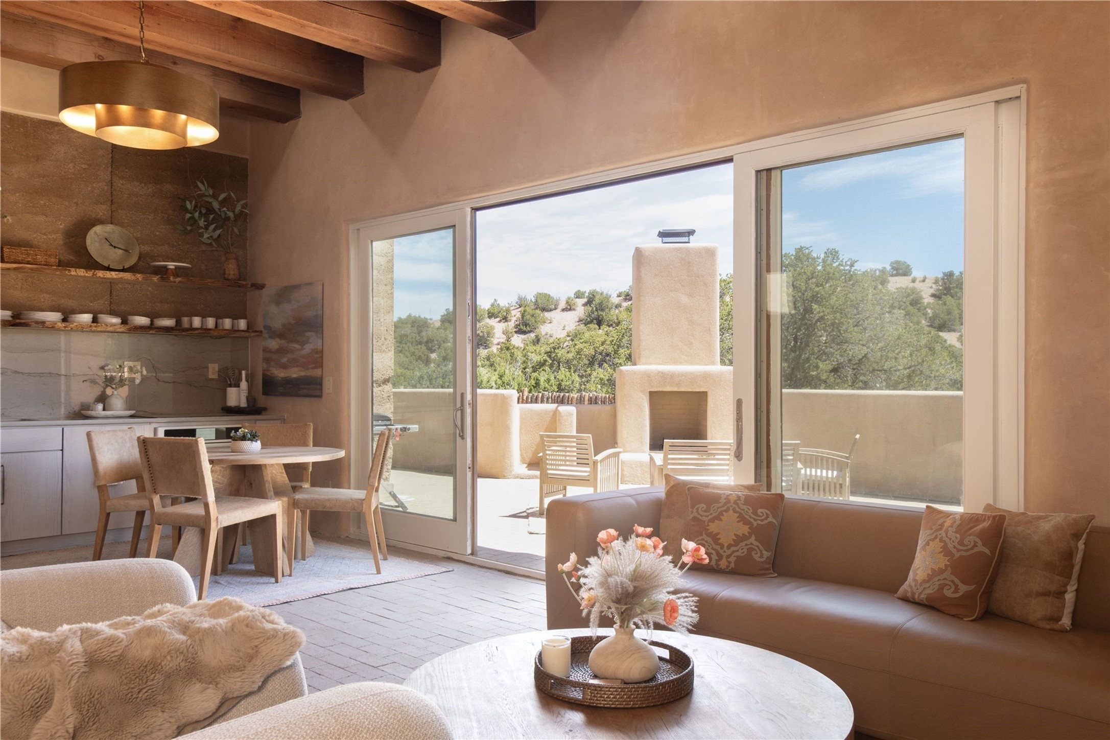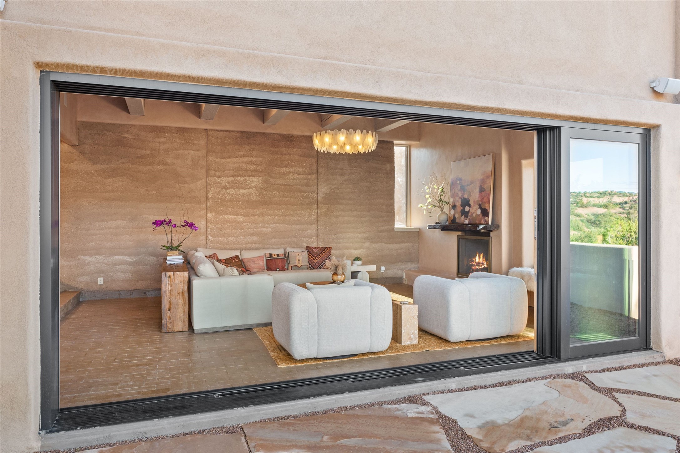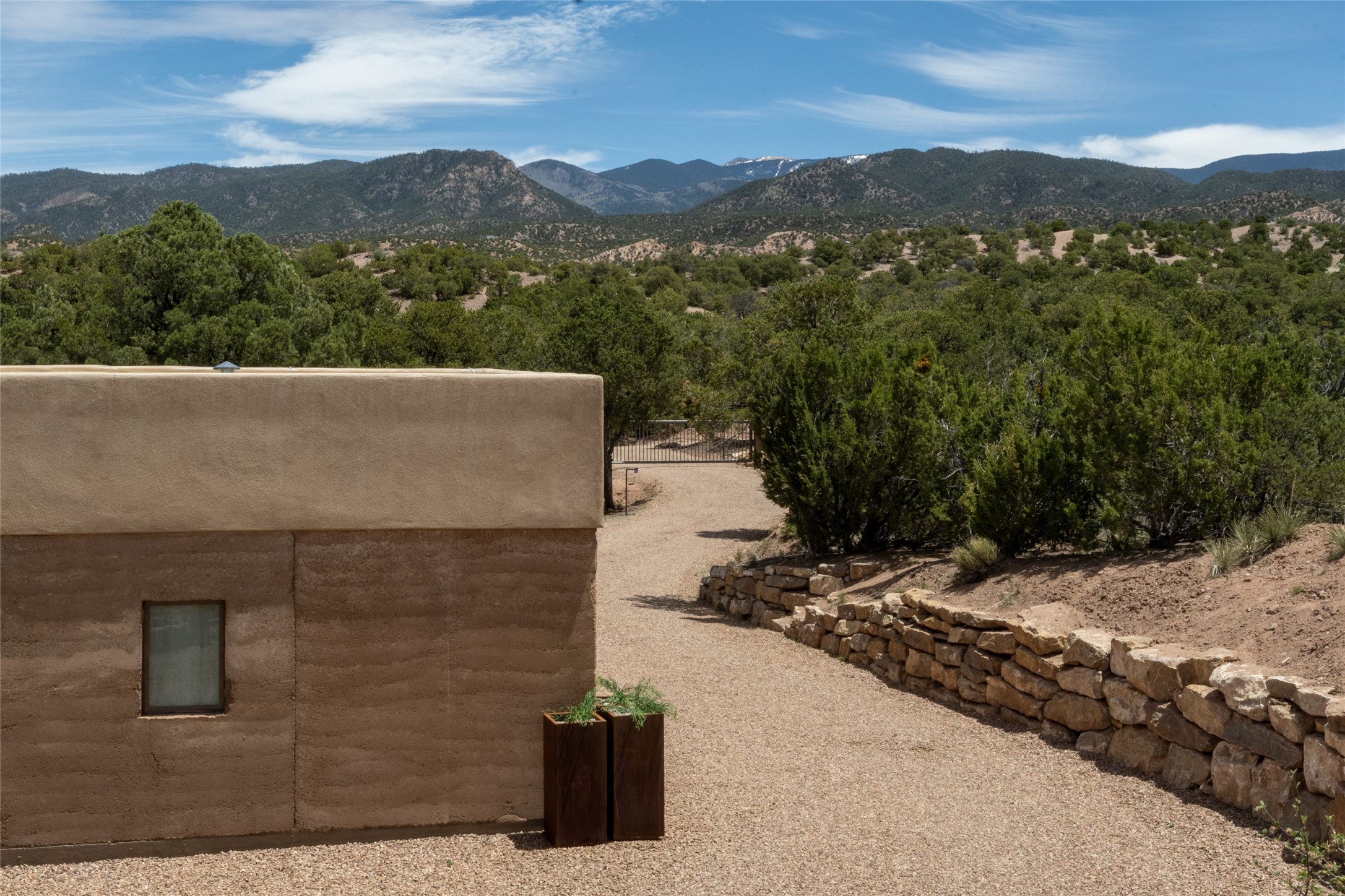 Tranquility, seclusion, and refined living define this beautifully reimagined 6.4 acre dual-residence estate tucked into the Sangre de Cristo foothills. Although located just minutes from the Santa Fe Plaza, SF Opera, Four Seasons Resort, and the village of Tesuque, the property feels wonderfully removed from the world. Adore multiple panoramas of the Sangre de Cristos, the Jemez, and expansive northern badlands. Set beside conservation land, offering long-term privacy, this award-winning design by architect Efthimios Maniatis reflects an organic modern aesthetic, blending clean architectural lines with warm textures, exposed beams, and earthy materials. Mornings begin with sunlight spilling over the ski basin. Evenings invite quiet reflection on the north deck as the Jemez Mountains glow. Open the expansive glass doors in the living area for seamless indoor-outdoor dining beside the patio fireplace, or retreat to a primary suite with a media room and sweeping views. A distinctive feature of both homes is the use of rammed earth accent walls, an ancient construction technique prized for its natural beauty, acoustic calm, and thermal efficiency, making this estate one of a select few in Santa Fe to showcase this coveted architectural element. Both homes were professionally styled in 2024, and furnishings are available separately for a turnkey transition. Completely renovated in 2024, the property offers the confidence of modern systems throughout, including new roofs, kitchens, bathrooms, closets, boilers, whole-house water purification, and integrated smart-home technology with security, audio, high-speed internet, and climate controls. The 2/bed 2/bath, guest house is currently licensed for short term rentals and has generated over $100,000 annually, with existing reservations transferable to the new owner. This exceptional estate combines natural beauty, modern luxury, and investment opportunity in one unforgettable offering.