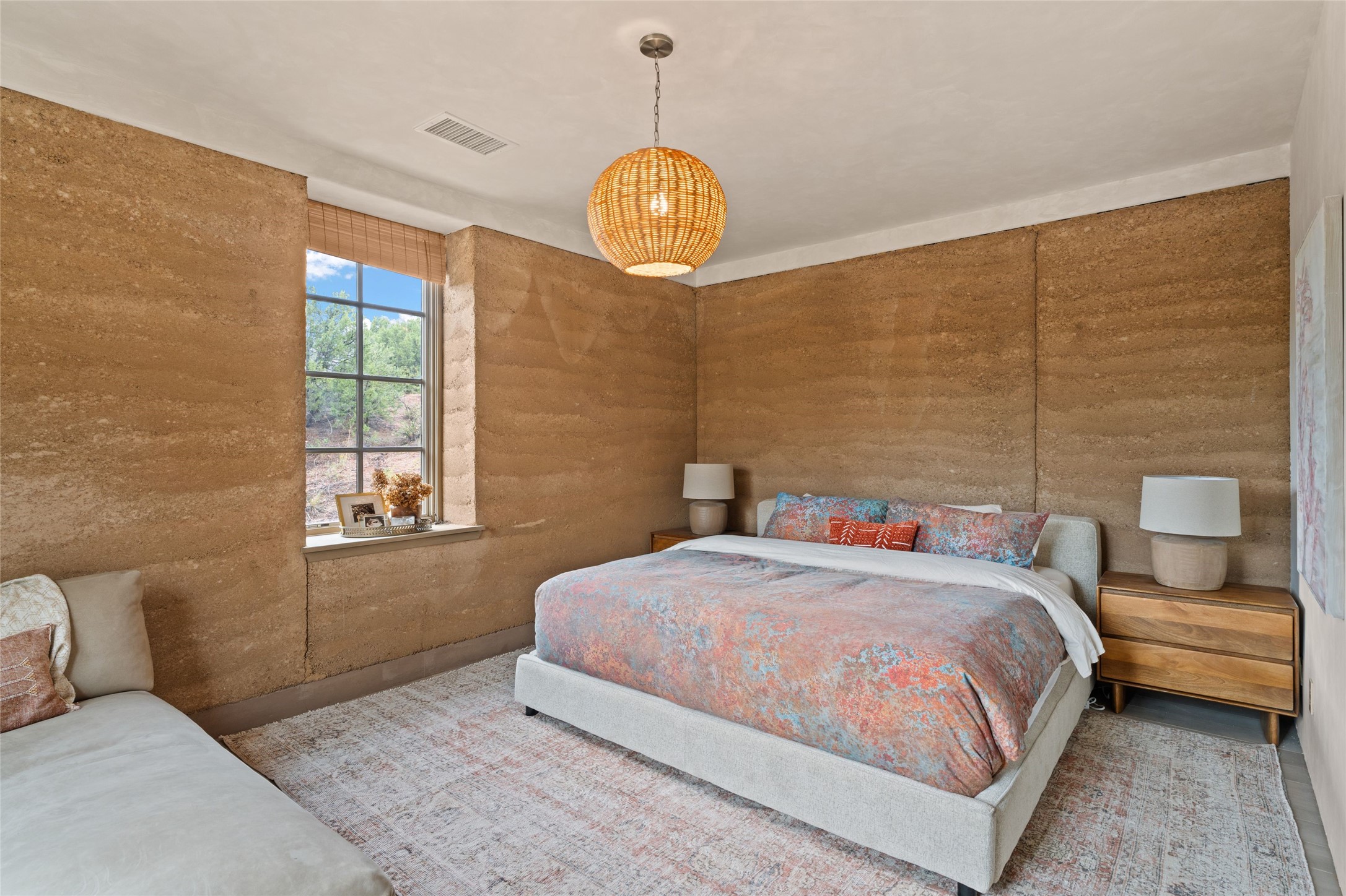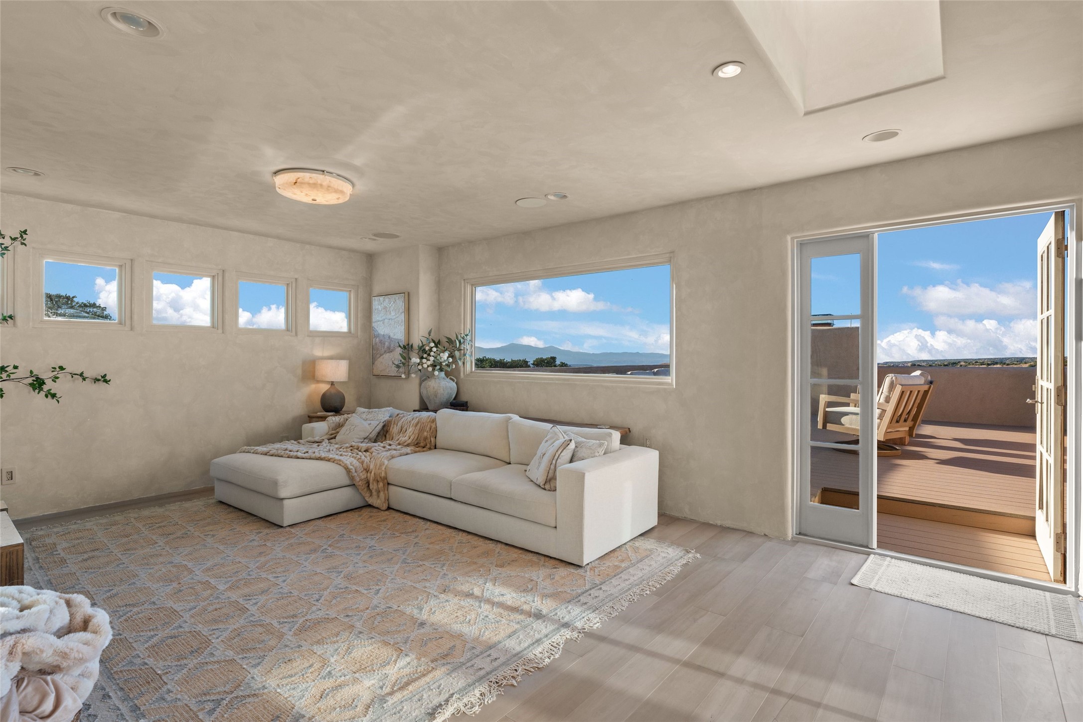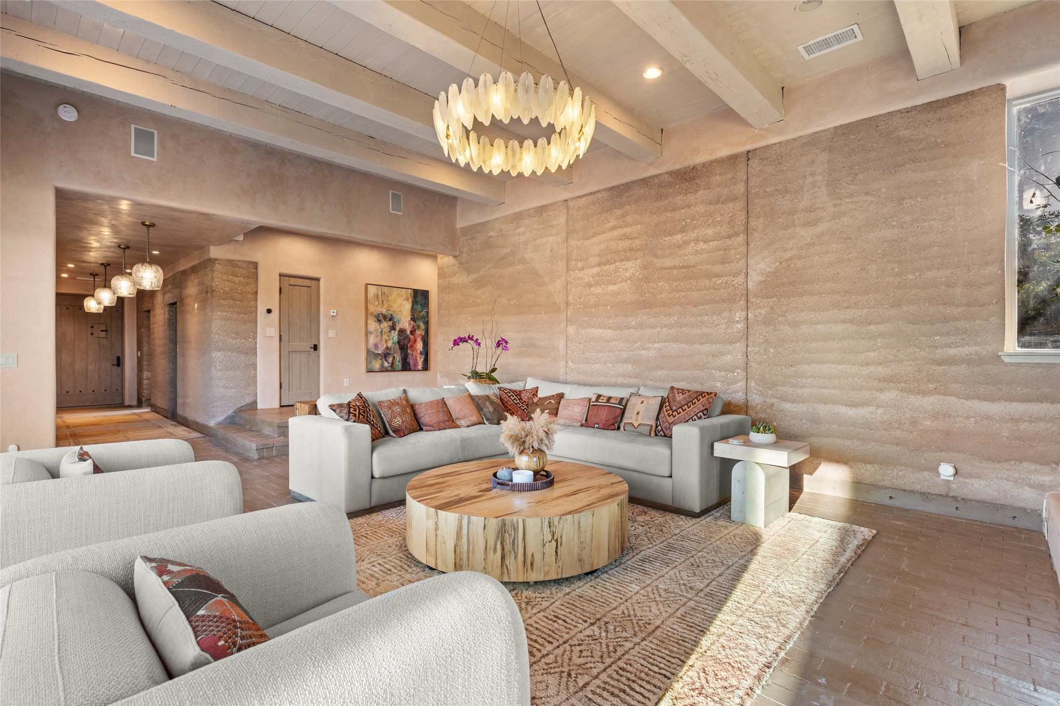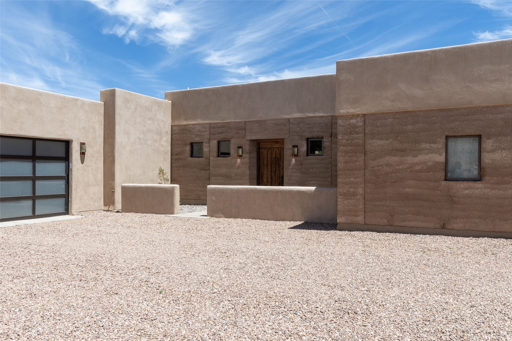 Tranquility, seclusion, and refined living define this beautifully reimagined 6.4 acre dual-residence estate tucked into the Sangre de Cristo foothills. Although located just minutes from the Santa Fe Plaza, SF Opera, Four Seasons Resort, and the village of Tesuque, the property feels wonderfully removed from the world. Adore multiple panoramas of the Sangre de Cristos, the Jemez, and expansive northern badlands. Set beside conservation land, offering long-term privacy, this award-winning design by architect Efthimios Maniatis reflects an organic modern aesthetic, blending clean architectural lines with warm textures, exposed beams, and earthy materials. Mornings begin with sunlight spilling over the ski basin. Evenings invite quiet reflection on the north deck as the Jemez Mountains glow. Open the expansive glass doors in the living area for seamless indoor-outdoor dining beside the patio fireplace, or retreat to a primary suite with a media room and sweeping views. A distinctive feature of both homes is the use of rammed earth accent walls, an ancient construction technique prized for its natural beauty, acoustic calm, and thermal efficiency, making this estate one of a select few in Santa Fe to showcase this coveted architectural element. Both homes were professionally styled in 2024, and furnishings are available separately for a turnkey transition. Completely renovated in 2024, the property offers the confidence of modern systems throughout, including new roofs, kitchens, bathrooms, closets, boilers, whole-house water purification, and integrated smart-home technology with security, audio, high-speed internet, and climate controls. The 2/bed 2/bath, guest house is currently licensed for short term rentals and has generated over $100,000 annually, with existing reservations transferable to the new owner. This exceptional estate combines natural beauty, modern luxury, and investment opportunity in one unforgettable offering.