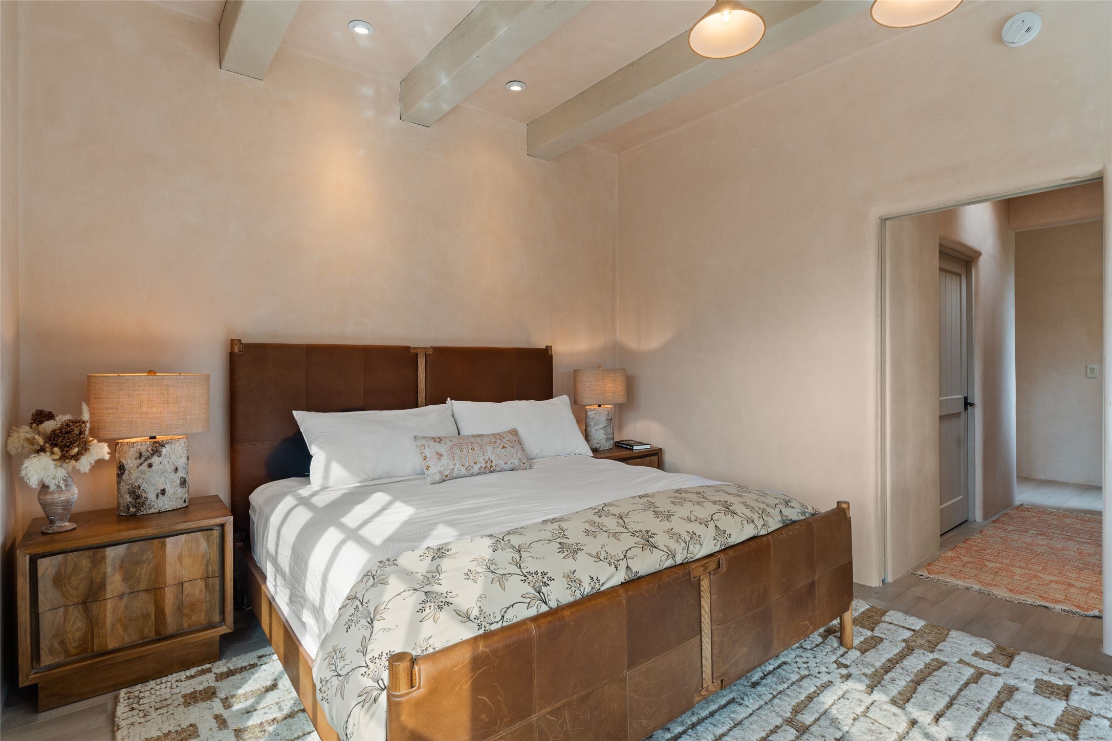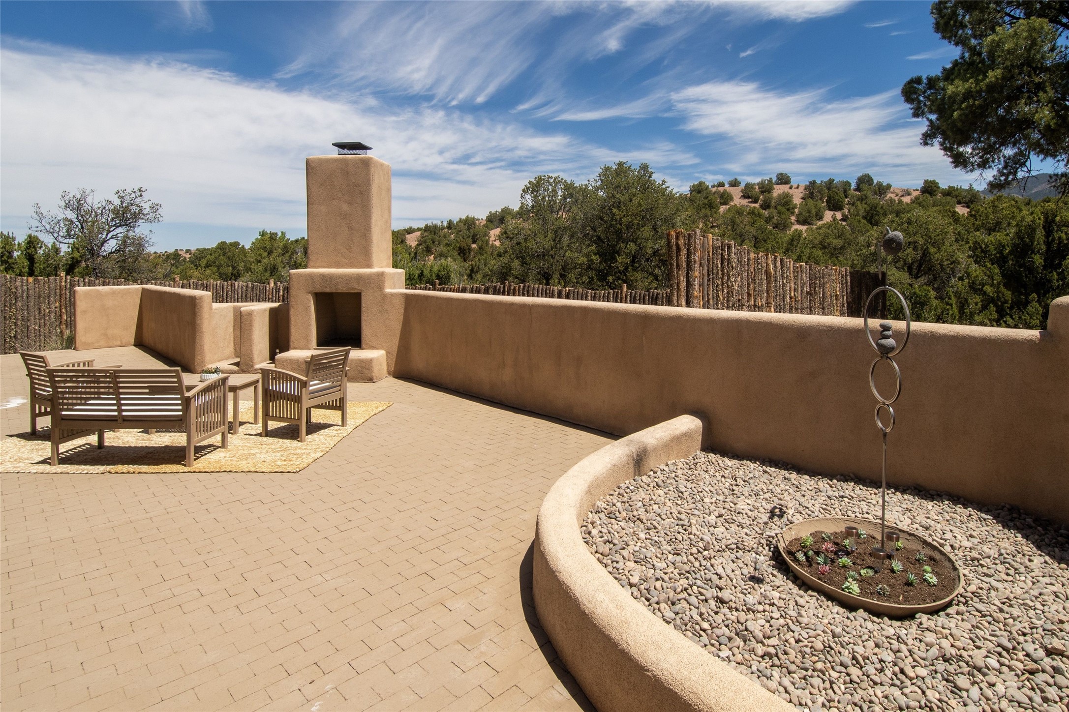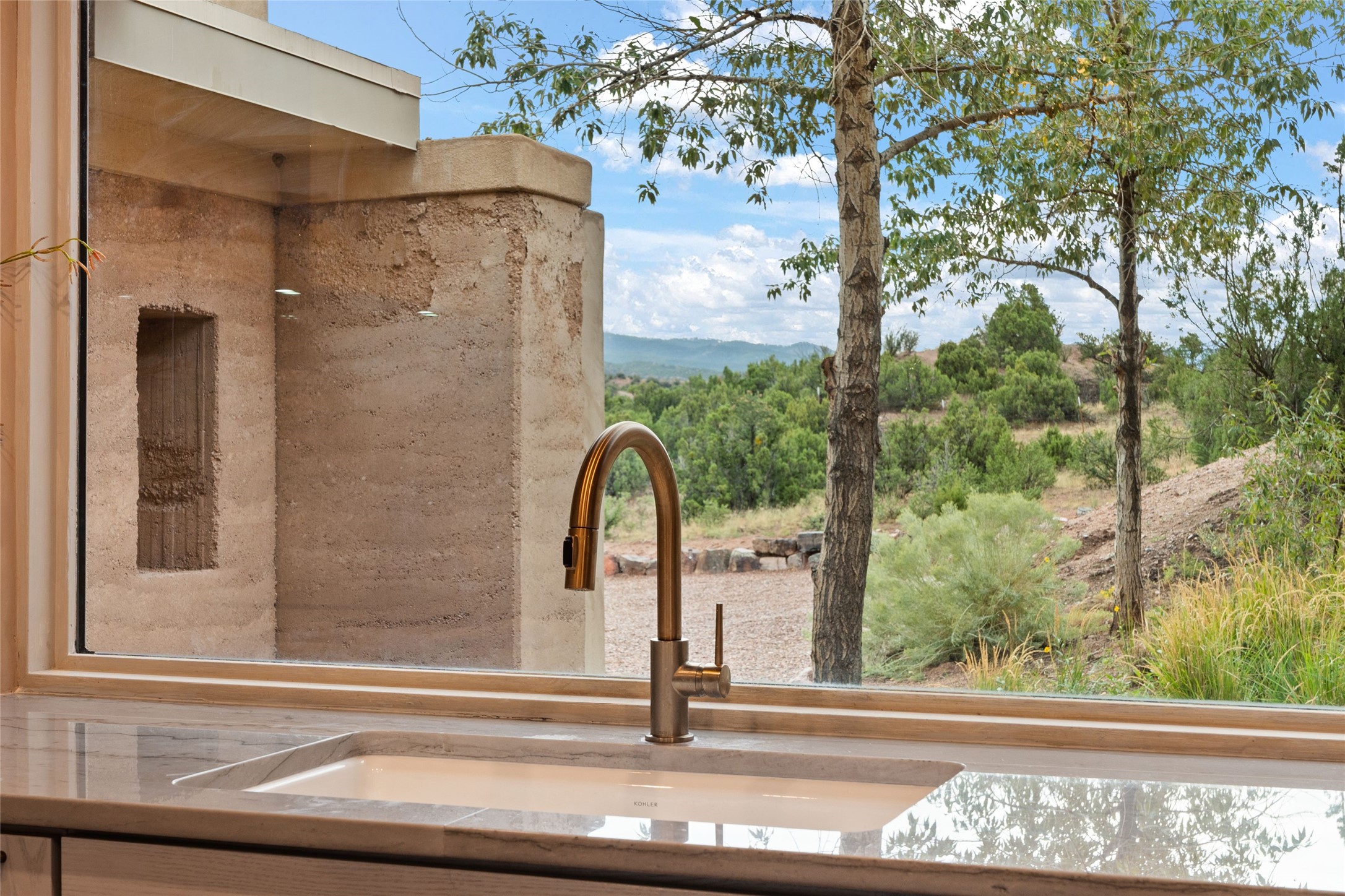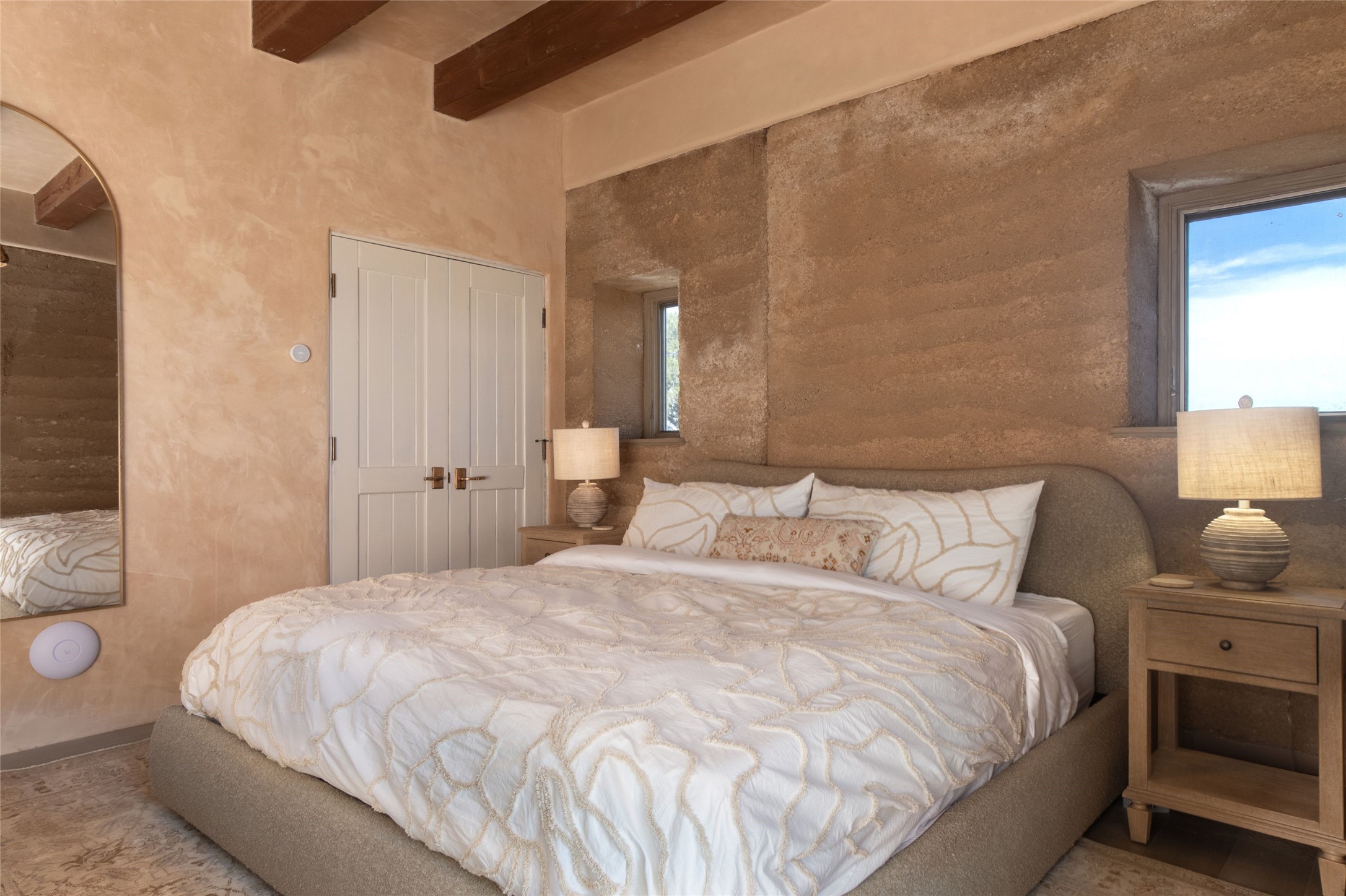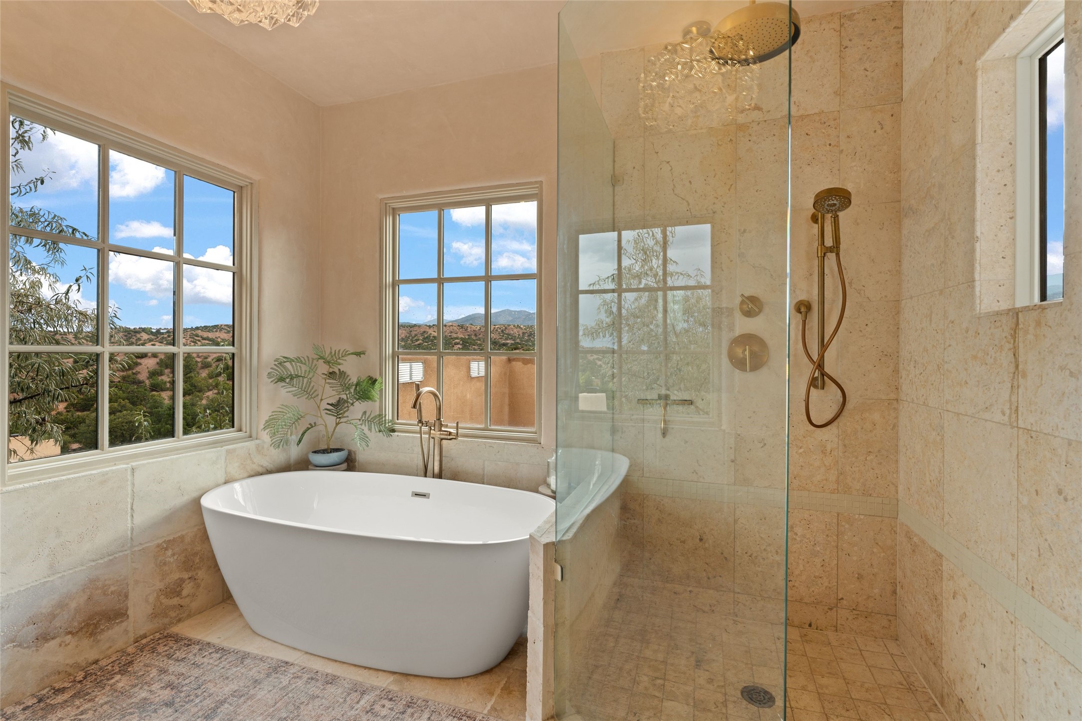 Tranquility, seclusion, and refined living define this beautifully reimagined 6.4 acre dual-residence estate tucked into the Sangre de Cristo foothills. Although located just minutes from the Santa Fe Plaza, SF Opera, Four Seasons Resort, and the village of Tesuque, the property feels wonderfully removed from the world. Adore multiple panoramas of the Sangre de Cristos, the Jemez, and expansive northern badlands. Set beside conservation land, offering long-term privacy, this award-winning design by architect Efthimios Maniatis reflects an organic modern aesthetic, blending clean architectural lines with warm textures, exposed beams, and earthy materials. Mornings begin with sunlight spilling over the ski basin. Evenings invite quiet reflection on the north deck as the Jemez Mountains glow. Open the expansive glass doors in the living area for seamless indoor-outdoor dining beside the patio fireplace, or retreat to a primary suite with a media room and sweeping views. A distinctive feature of both homes is the use of rammed earth accent walls, an ancient construction technique prized for its natural beauty, acoustic calm, and thermal efficiency, making this estate one of a select few in Santa Fe to showcase this coveted architectural element. Both homes were professionally styled in 2024, and furnishings are available separately for a turnkey transition. Completely renovated in 2024, the property offers the confidence of modern systems throughout, including new roofs, kitchens, bathrooms, closets, boilers, whole-house water purification, and integrated smart-home technology with security, audio, high-speed internet, and climate controls. The 2/bed 2/bath, guest house is currently licensed for short term rentals and has generated over $100,000 annually, with existing reservations transferable to the new owner. This exceptional estate combines natural beauty, modern luxury, and investment opportunity in one unforgettable offering.