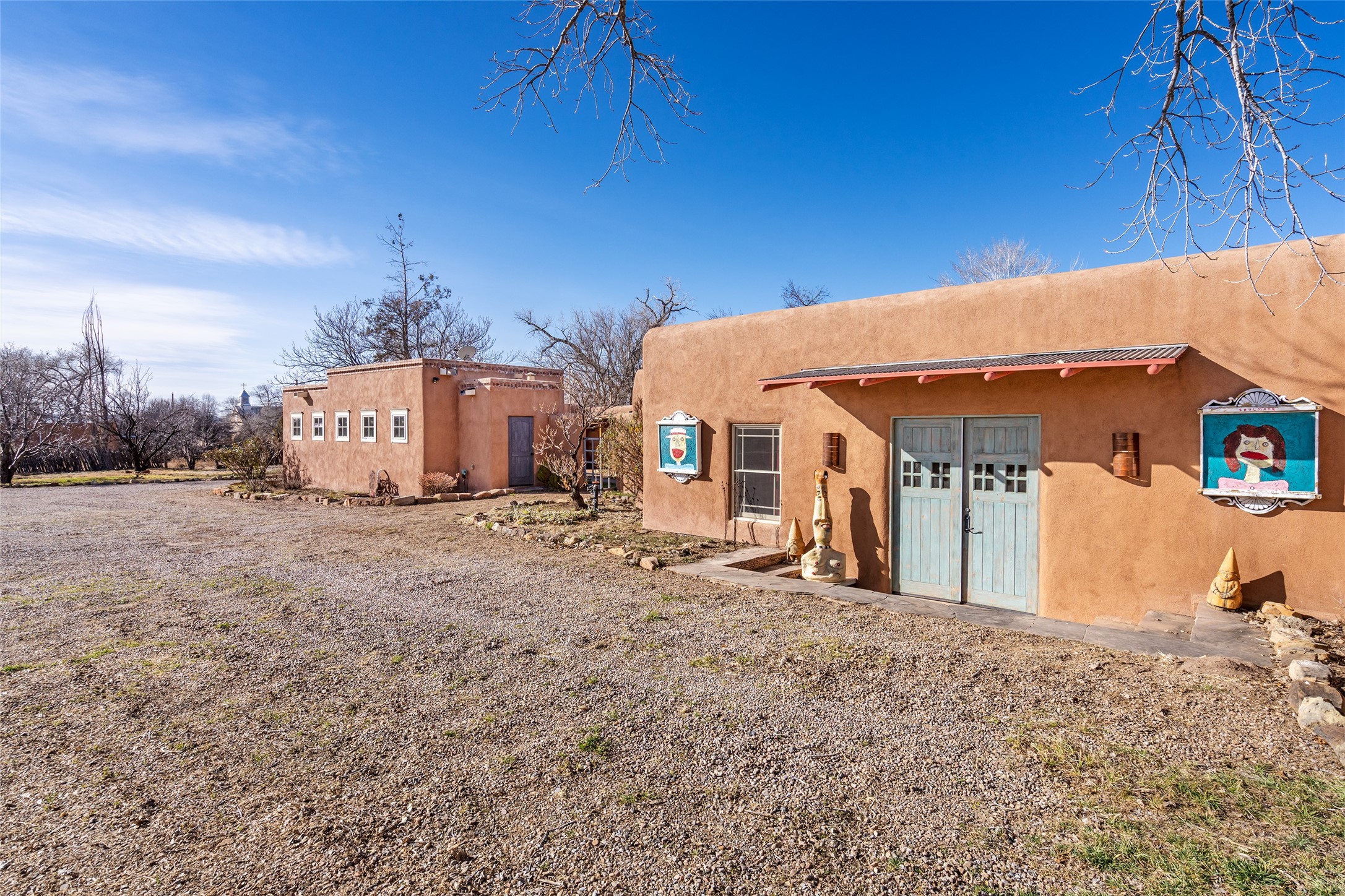 Something Old. Something New. Rare Commercial Opportunity.An exceptional and singular compound in the heart of historic Galisteo, this remarkable property weaves together centuries of heritage with thoughtful modern design. Dating to the 1800s, the 3-bedroom, 2-bath double-adobe Main House once housed the beloved La Mancha Restaurant (1959-1971), where the Ortiz family's New Mexican cuisine earned widespread acclaim.Tastefully renovated in 2012, the Main House features new brick floors, interior plaster walls, updated kitchen and baths, modern plumbing fixtures, and skylights, while honoring the home's original character, authenticity, and soul.Complementing the historic residence is a striking studio/gallery building originally designed by award-winning architect Beverly Spears and constructed in 1995 using Rastra construction for artist Linda Durham. A comprehensive 2006 remodel transformed the space into an extraordinary studio, gallery, and entertaining venue, featuring soaring 12-foot ceilings, exceptional lighting, integrated sound throughout, a home theater with surround sound and retractable screen, a bath, and a chef's kitchen equipped with Wolf, Sub-Zero, Miele, and Fisher & Paykel appliances, Bob Pepper custom cabinetry, and a generous pantry.The inviting Guest House, built in 2006, offers a warm and comfortable retreat with a living room, bedroom with fireplace, kitchen, and bath, ideal for visitors or extended stays.Commercially zoned and among the few such properties in Galisteo, this compound presents rare possibilities for a boutique B&B, restaurant, gallery, or creative retreat. Enclosed by historic adobe and stone walls and graced with fruit trees, this truly special offering invites vision, imagination, and opportunity in one of New Mexico's most cherished villages.