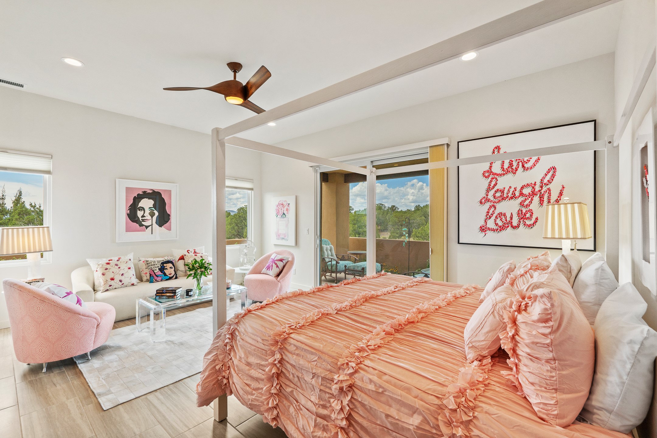 Discover the perfect blend of modern luxury and Southwest charm in this newer home built in 2022 and located in Las Campanas, a premier gated community located just 8 miles from town. Designed in a striking contemporary Pueblo style, the home boasts an open-concept floor plan that seamlessly connects indoor and outdoor spaces, all while framing the mountain views and famous sunsets of Santa. Enjoy multiple professionally landscaped outdoor living areas, thoughtfully designed with water features for relaxation and ambiance. Whether it's morning coffee, dining al fresco, entertaining or unwinding, this home offers serene outdoor retreats in every direction. Inside, the layout is open and light-filled, with high-end finishes and thoughtful details throughout. The spacious primary suite is a true sanctuary, featuring a generous seating area, a luxurious spa-like bath with a soaking tub, walk-in shower, dual vanities, and an expansive closet complete with built-in organizers. Eco-conscious amenities include solar panels and two electric vehicle charging hookups, offering both sustainability and convenience. The home also includes natural gas, central heating, and air conditioning to ensure year-round comfort. Perfect for full-time living or as a lock-and-leave second home, this property offers the ideal combination of style, efficiency, and tranquility. HOA fees cover road and common area maintenance, 24-hour roaming security, and on-site emergency medical technicians. Membership to The Club at Las Campanas is optional, offering amenities such as indoor and outdoor swimming pools, tennis courts, a fitness center, equestrian facilities, fine dining options, and two Jack Nicklaus Signature Golf Courses.