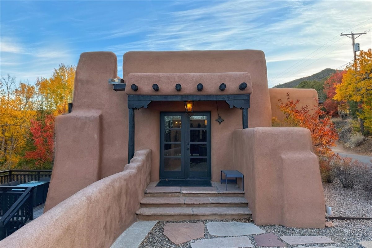 Discover Las Crucitas, a fully restored 1950s Santa Fe adobe blending timeless Southwestern charm with modern luxury, ideally located on coveted Upper Canyon Road in the Historic East Side. This remarkable property offers four bedrooms and four bathrooms (two full, one three-quarter, and one half) within 4,258 square feet of refined living space. A 492-square-foot attached casita, detached two-car garage, and over 200 linear feet of Santa Fe River frontage creates a rare and private setting. The upper level features a beautifully appointed chef's kitchen with top-of-the-line appliances, custom hood, two dishwashers, quartz countertops, custom Ernest Thompson cabinetry, and travertine floors. A spacious great room showcases classic Santa Fe details including columns, vigas with corbels, latillas, and wide-plank oak floors, American clay and plaster walls. Three sets of French doors open to a serene interior courtyard, while an additional set leads to a balcony ideal for sunset views. Also on the upper level are a guest suite with a three-quarter bath and an elegant owner's suite featuring two corner kiva wood-burning fireplaces, a luxurious en-suite full bath with mosaic tile shower and travertine floors, a walk-in closet with custom built-ins, and French doors opening to the outdoor area. The lower level offers a media area with custom Ernest Thompson cabinetry, a study nook, an additional guest bedroom with exposed rock walls, a powder room, and a three-quarter bath. The attached casita includes a wood-burning kiva fireplace, kitchenette, and full bath ideal for guests. Outdoor spaces include a back deck, a floating terrace with sunset views, and a flagstone path with direct river access. Additional features include in-floor radiant heat, 6 fireplaces, a rock garden, and a dog run with room to expand. Las Crucitas is a rare opportunity to own a property that seldom changes hands--just minutes from Canyon Road's galleries and restaurants and the Santa Fe Plaza.