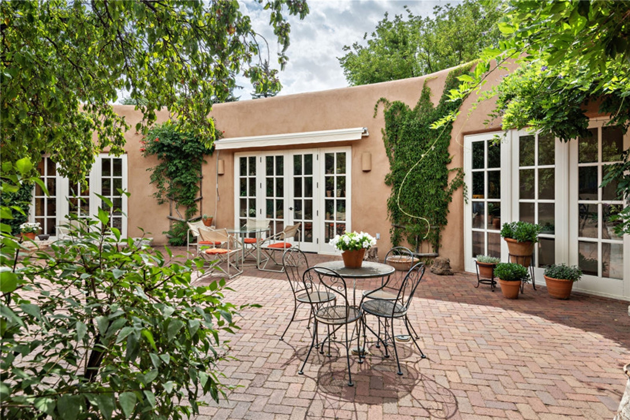 Tucked away on a quiet lane just off historic Canyon Road, this exceptional compound offers Santa Fe living at its best.This house was originally built in 1947 by artist Agnes Simms and thoughtfully expanded in 1997 by noted collector Omer Claiborne. The spacious main house welcomes you with a graceful, light filled living room featuring 12-foot beamed ceilings, multiple French doors, concrete floors, a fireplace, and extensive wall space ideal for displaying artwork. The beautifully designed kitchen opens seamlessly to an impressive dining room and includes a large walk-in pantry. There are four well separated bedrooms and five baths, and the home provides exceptional privacy and comfort.A serene east-facing courtyard extends the living space outdoors, creating a perfect setting for relaxing and dining. Mature plantings - including wisteria, lilacs, pear, plum and crabapple trees enhance the sense of tranquility.The charming guesthouse is accessed through its own courtyard and offers a cozy retreat complete with kiva fireplace, kitchenette, and bath.Located moments from Canyon Road's renowned galleries and restaurants and within walking distance of the historic Plaza.This rare property represents the best of Santa Fe living.