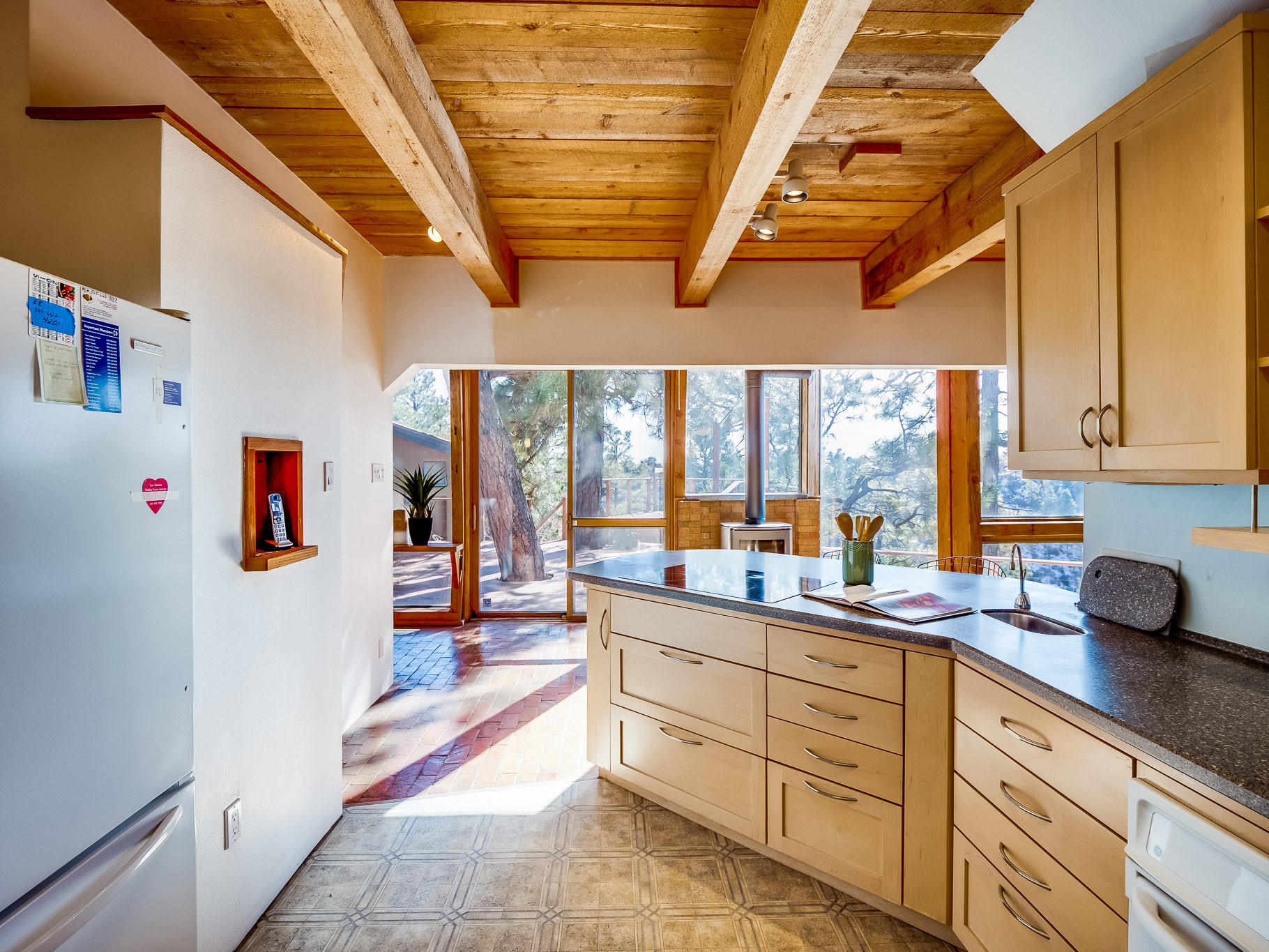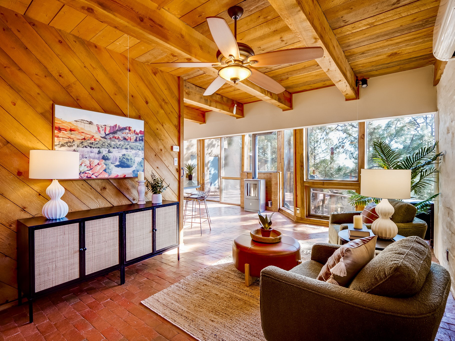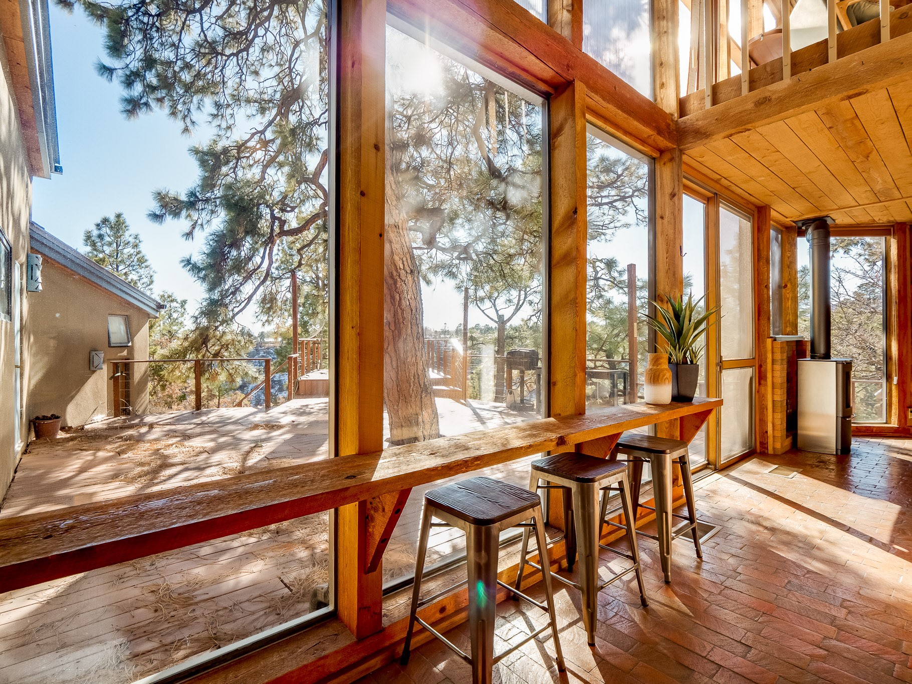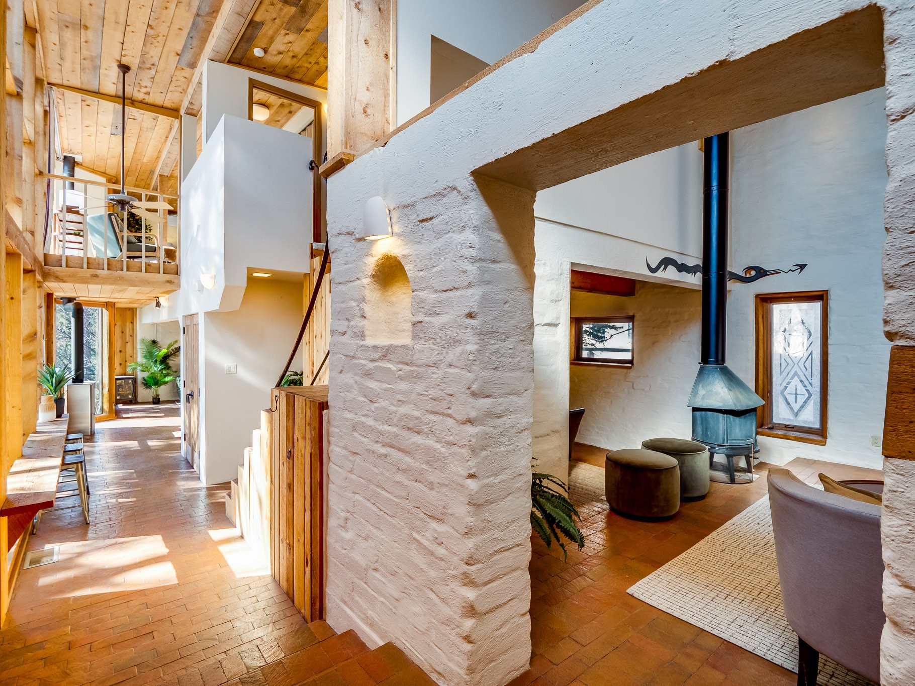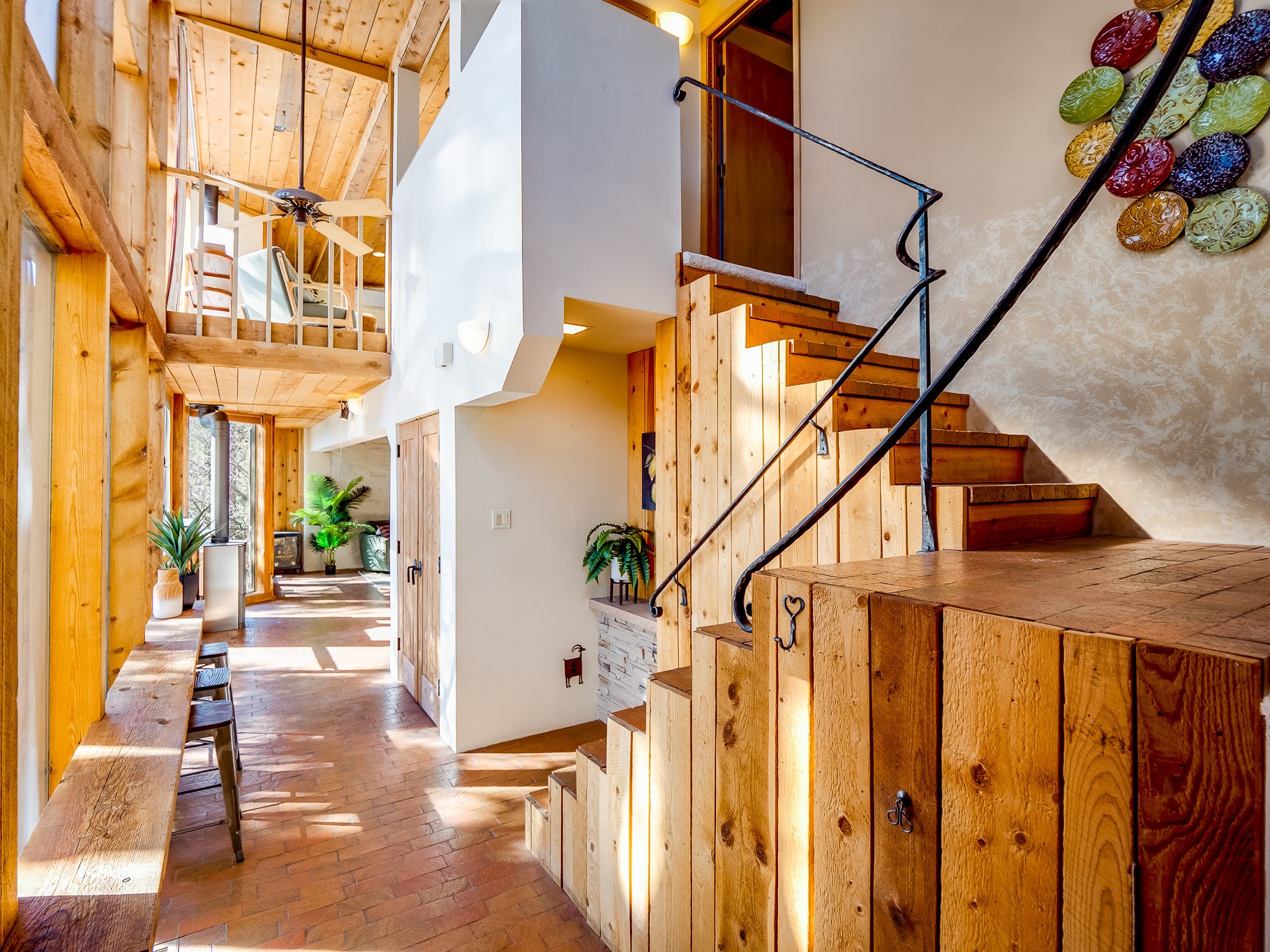 Perched on the canyon in North Mesa, this custom modern adobe home is a rare architectural offering that seamlessly blends natural materials, thoughtful design, and breathtaking surroundings. Character and craftsmanship are evident at every turn, with expansive canyon and treetop views. From the moment you step through the front door your'e greeted with a long, dramatic hallway setting the tone, featuring wood-planked vaulted ceilings, brick flooring, floor to ceiling windows and a rich combination of wood plank and plastered walls that continue throughout the home. The living room carries forward the vaulted ceilings and is anchored by a wood-burning freestanding fireplace that serves as a striking focal point between the living and dining area, thoughtfully tying the spaces together. The kitchen and family room form a bright, open living space with wood-beamed ceilings, abundant windows, and sliding doors that lead directly to the deck. The family room offers a custom wood built-in cabinetry and a gas freestanding fireplace. The kitchen features light-toned wood cabinetry, hard surface counters, and a peninsula island with bar seating, perfect for casual meals or entertaining. Just off the kitchen is a guest bath with a single-sink vanity and a tiled walk-in shower. This level also provides access to the two-car garage, which includes a connected green room. Upstairs, is fully carpeted and offers two bedrooms. A guest bed and the spacious primary suite that feels luxurious and serene, highlighted by a kiva fireplace and a dedicated seating area. There's a large closet and a washer and dryer for added convenience. The generously sized bathroom is shared between the two bedrooms and includes a deep jetted soaking tub, a walk-in shower, and two separate single-sink vanities. Outdoor living is truly exceptional, with a massive composite deck offering multiple areas for entertaining and taking in those canyon views. Book your tour to experience this home for yourself!