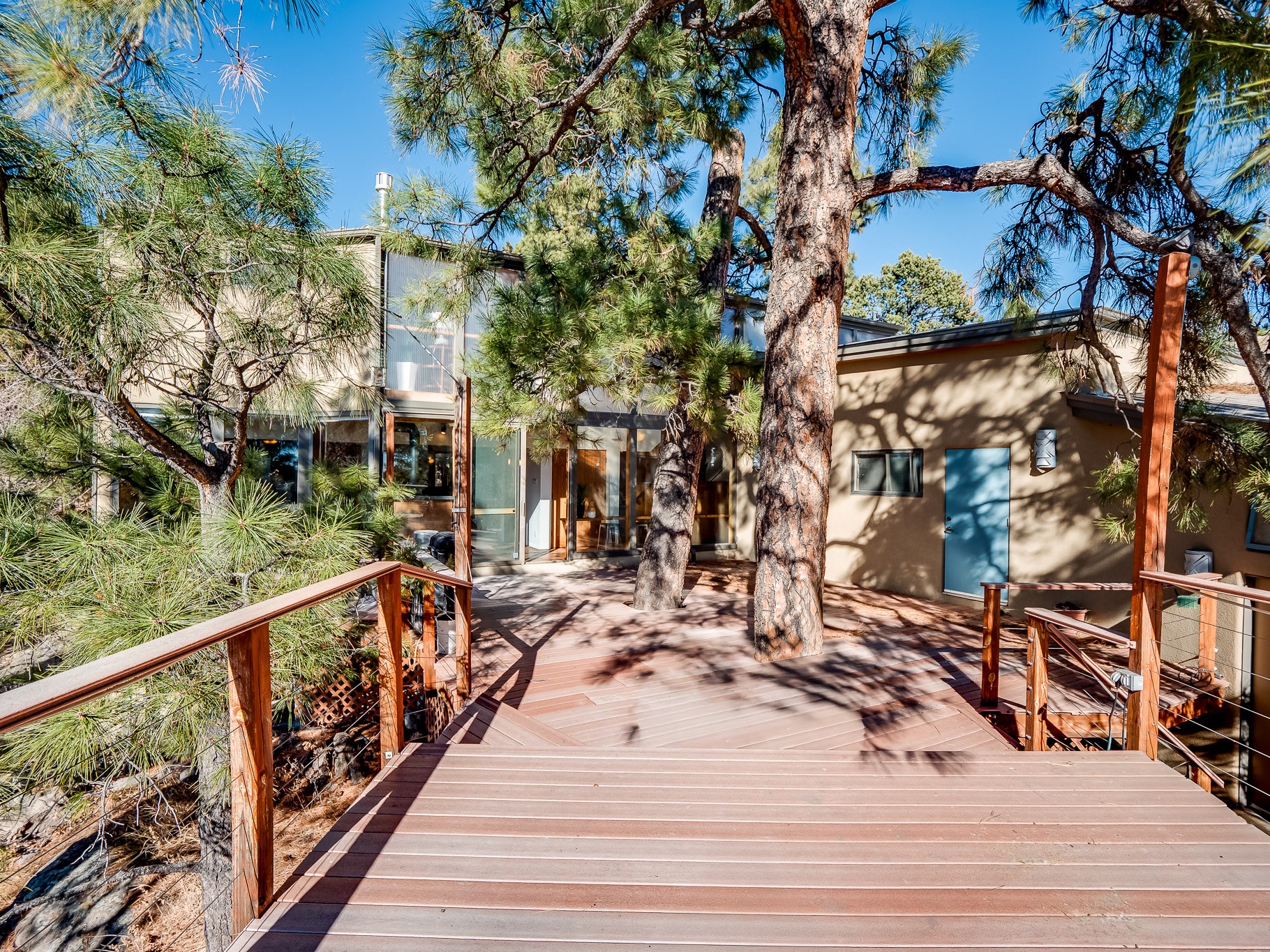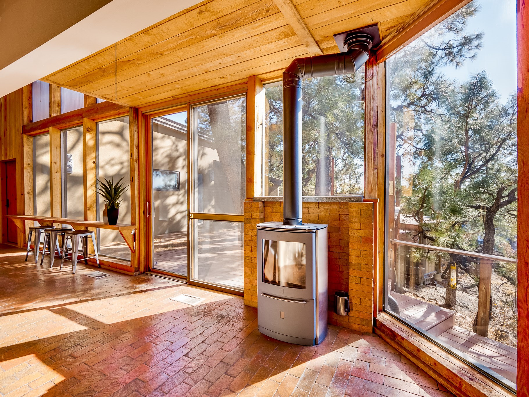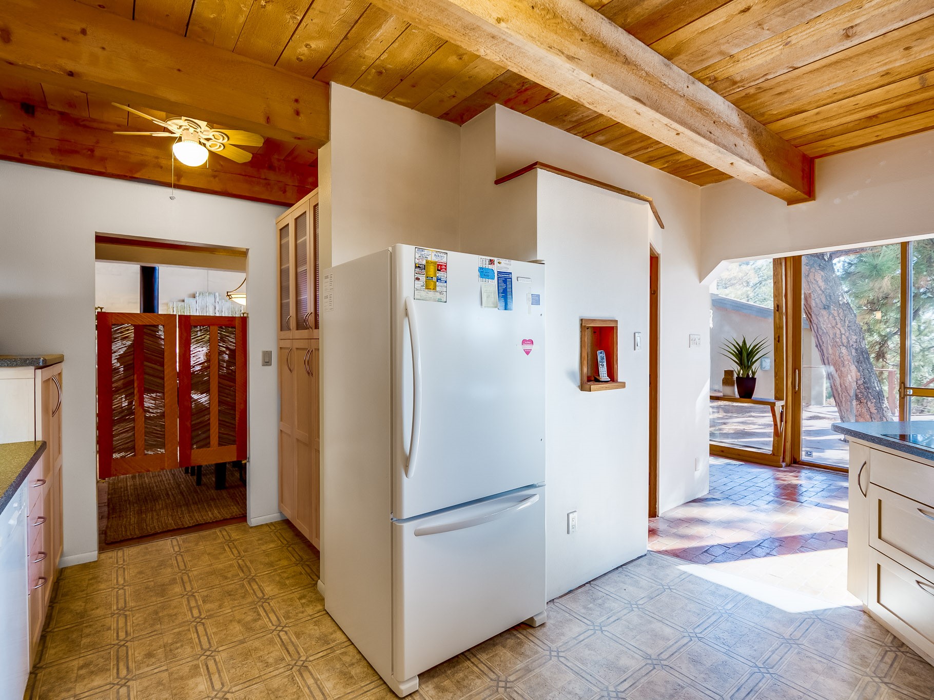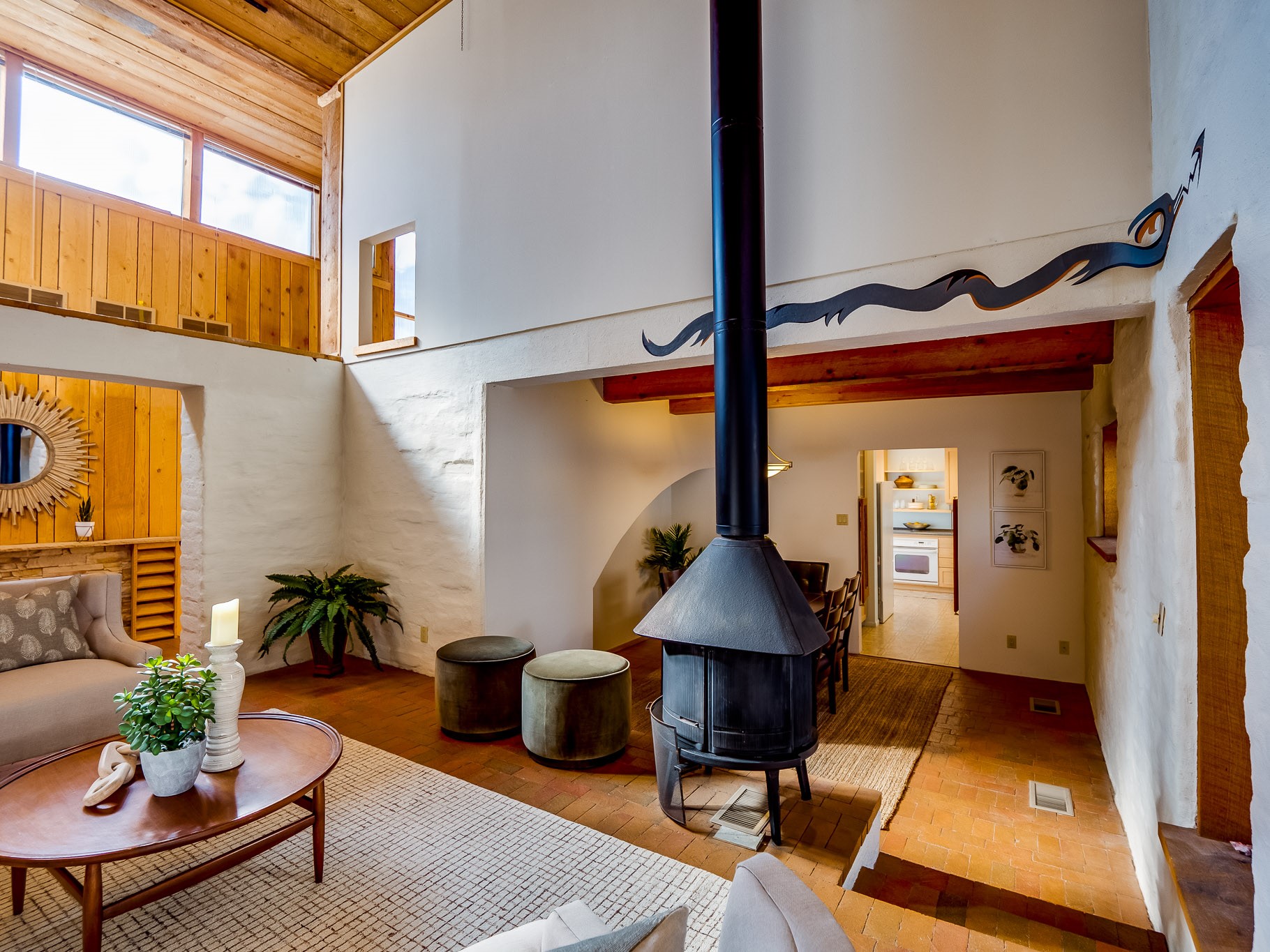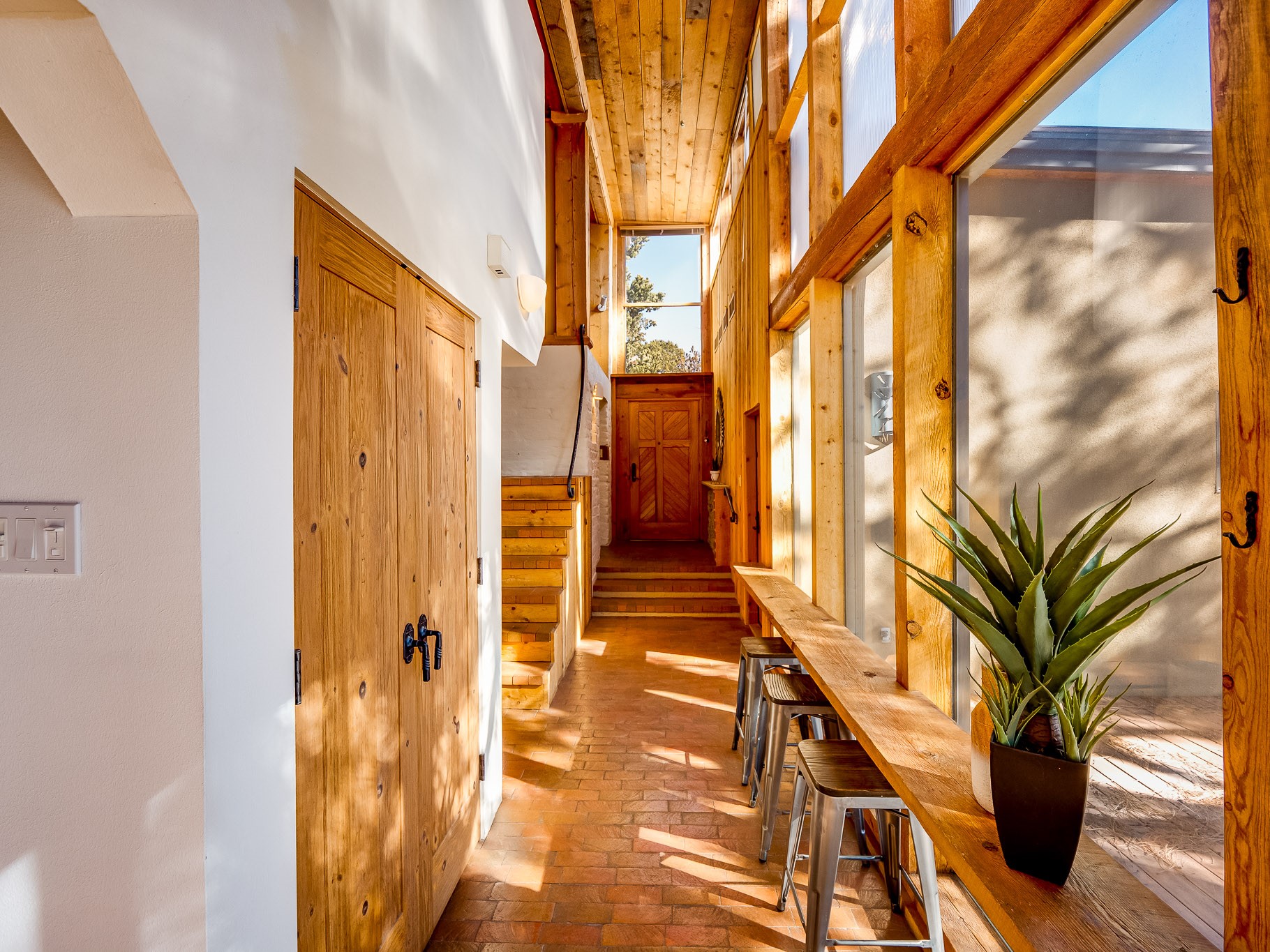 Perched on the canyon in North Mesa, this custom modern adobe home is a rare architectural offering that seamlessly blends natural materials, thoughtful design, and breathtaking surroundings. Character and craftsmanship are evident at every turn, with expansive canyon and treetop views. From the moment you step through the front door your'e greeted with a long, dramatic hallway setting the tone, featuring wood-planked vaulted ceilings, brick flooring, floor to ceiling windows and a rich combination of wood plank and plastered walls that continue throughout the home. The living room carries forward the vaulted ceilings and is anchored by a wood-burning freestanding fireplace that serves as a striking focal point between the living and dining area, thoughtfully tying the spaces together. The kitchen and family room form a bright, open living space with wood-beamed ceilings, abundant windows, and sliding doors that lead directly to the deck. The family room offers a custom wood built-in cabinetry and a gas freestanding fireplace. The kitchen features light-toned wood cabinetry, hard surface counters, and a peninsula island with bar seating, perfect for casual meals or entertaining. Just off the kitchen is a guest bath with a single-sink vanity and a tiled walk-in shower. This level also provides access to the two-car garage, which includes a connected green room. Upstairs, is fully carpeted and offers two bedrooms. A guest bed and the spacious primary suite that feels luxurious and serene, highlighted by a kiva fireplace and a dedicated seating area. There's a large closet and a washer and dryer for added convenience. The generously sized bathroom is shared between the two bedrooms and includes a deep jetted soaking tub, a walk-in shower, and two separate single-sink vanities. Outdoor living is truly exceptional, with a massive composite deck offering multiple areas for entertaining and taking in those canyon views. Book your tour to experience this home for yourself!