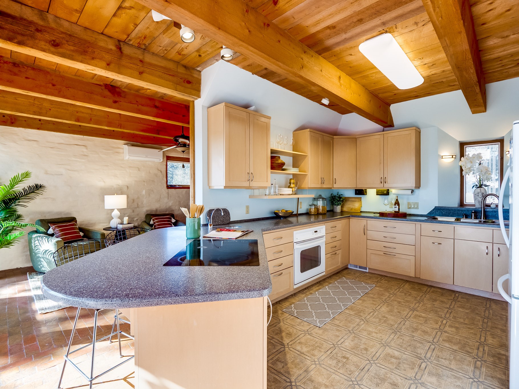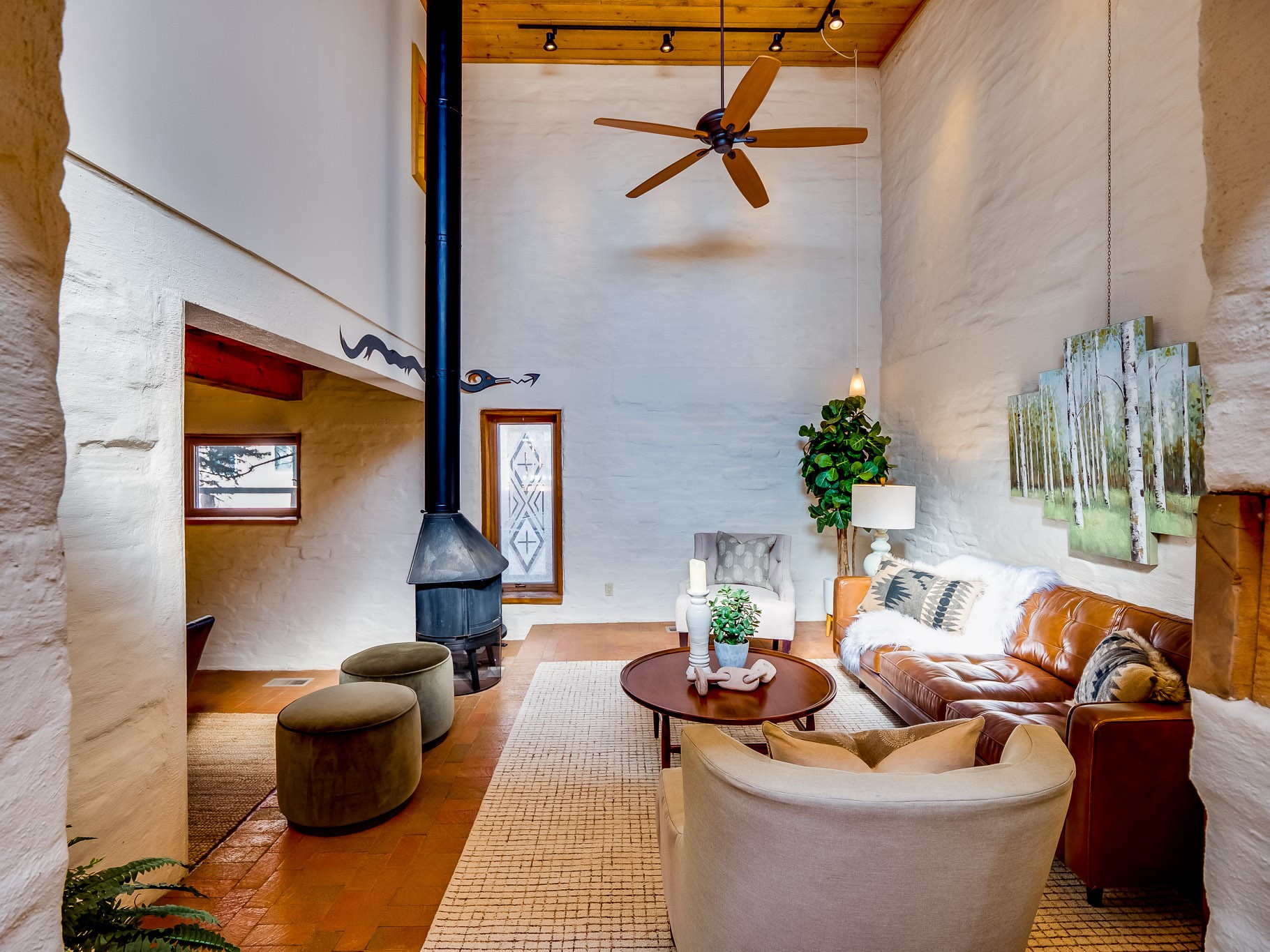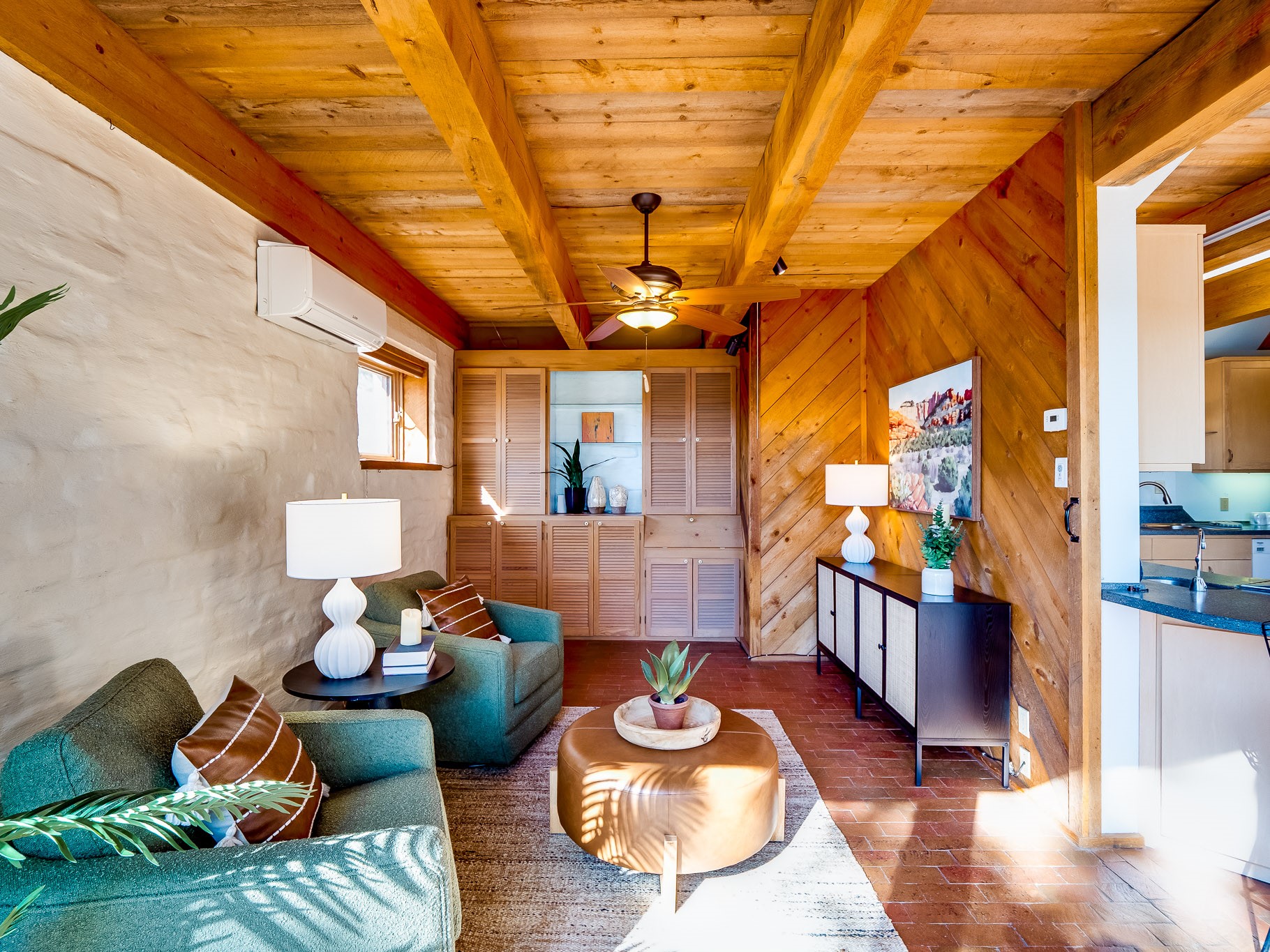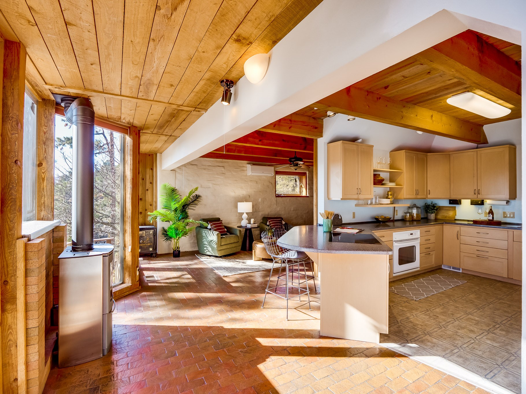 Perched on the canyon in North Mesa, this custom modern adobe home is a rare architectural offering that seamlessly blends natural materials, thoughtful design, and breathtaking surroundings. Character and craftsmanship are evident at every turn, with expansive canyon and treetop views. From the moment you step through the front door your'e greeted with a long, dramatic hallway setting the tone, featuring wood-planked vaulted ceilings, brick flooring, floor to ceiling windows and a rich combination of wood plank and plastered walls that continue throughout the home. The living room carries forward the vaulted ceilings and is anchored by a wood-burning freestanding fireplace that serves as a striking focal point between the living and dining area, thoughtfully tying the spaces together. The kitchen and family room form a bright, open living space with wood-beamed ceilings, abundant windows, and sliding doors that lead directly to the deck. The family room offers a custom wood built-in cabinetry and a gas freestanding fireplace. The kitchen features light-toned wood cabinetry, hard surface counters, and a peninsula island with bar seating, perfect for casual meals or entertaining. Just off the kitchen is a guest bath with a single-sink vanity and a tiled walk-in shower. This level also provides access to the two-car garage, which includes a connected green room. Upstairs, is fully carpeted and offers two bedrooms. A guest bed and the spacious primary suite that feels luxurious and serene, highlighted by a kiva fireplace and a dedicated seating area. There's a large closet and a washer and dryer for added convenience. The generously sized bathroom is shared between the two bedrooms and includes a deep jetted soaking tub, a walk-in shower, and two separate single-sink vanities. Outdoor living is truly exceptional, with a massive composite deck offering multiple areas for entertaining and taking in those canyon views. Book your tour to experience this home for yourself!