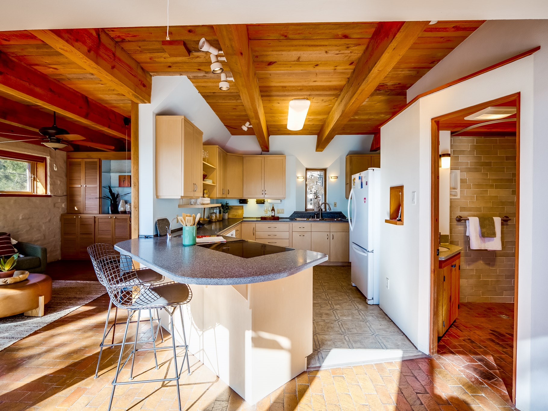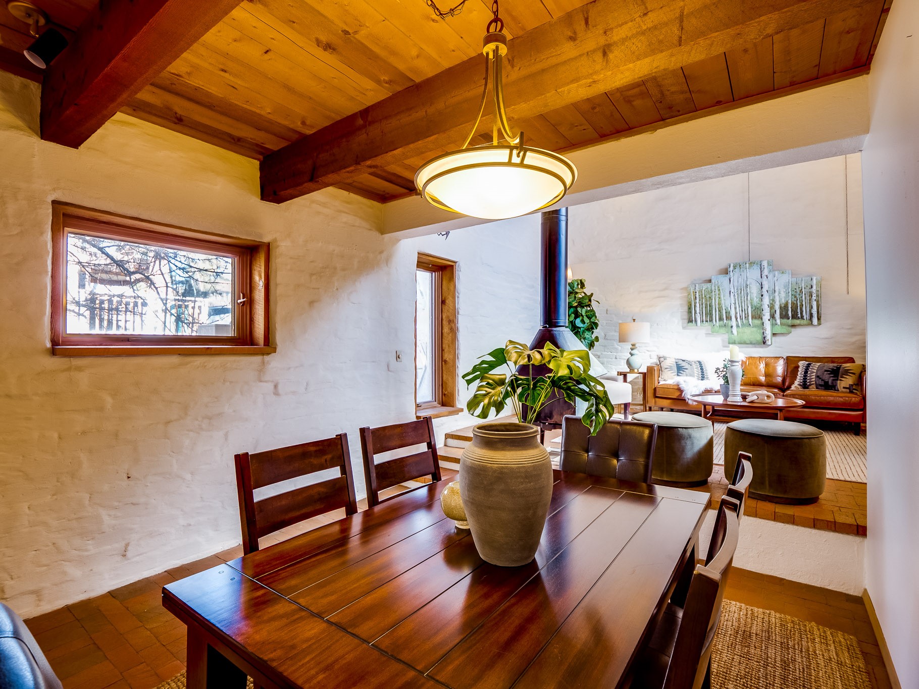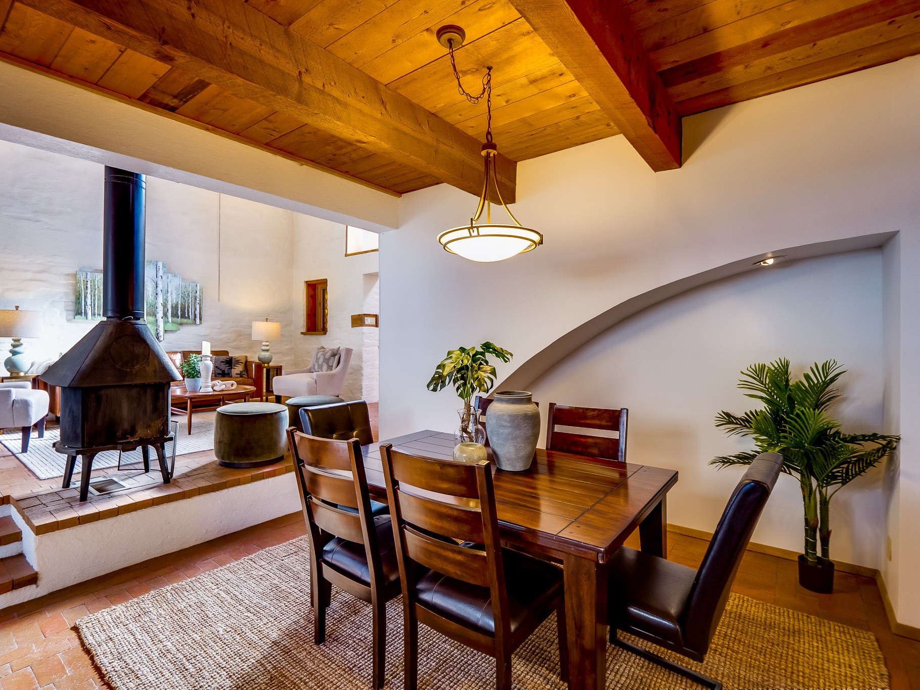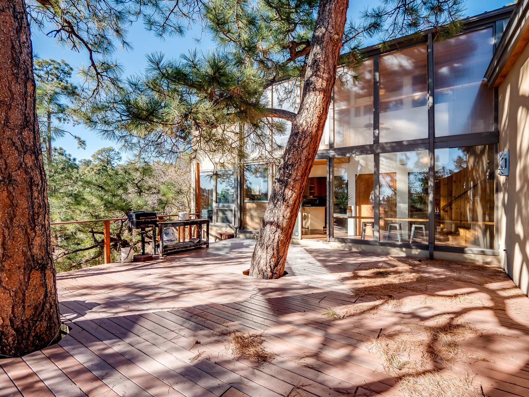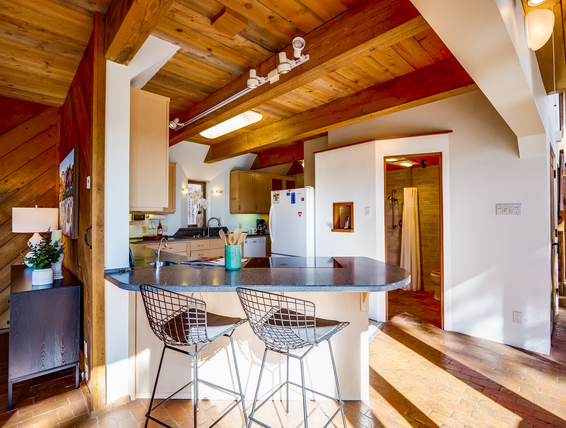 Perched on the canyon in North Mesa, this custom modern adobe home is a rare architectural offering that seamlessly blends natural materials, thoughtful design, and breathtaking surroundings. Character and craftsmanship are evident at every turn, with expansive canyon and treetop views. From the moment you step through the front door your'e greeted with a long, dramatic hallway setting the tone, featuring wood-planked vaulted ceilings, brick flooring, floor to ceiling windows and a rich combination of wood plank and plastered walls that continue throughout the home. The living room carries forward the vaulted ceilings and is anchored by a wood-burning freestanding fireplace that serves as a striking focal point between the living and dining area, thoughtfully tying the spaces together. The kitchen and family room form a bright, open living space with wood-beamed ceilings, abundant windows, and sliding doors that lead directly to the deck. The family room offers a custom wood built-in cabinetry and a gas freestanding fireplace. The kitchen features light-toned wood cabinetry, hard surface counters, and a peninsula island with bar seating, perfect for casual meals or entertaining. Just off the kitchen is a guest bath with a single-sink vanity and a tiled walk-in shower. This level also provides access to the two-car garage, which includes a connected green room. Upstairs, is fully carpeted and offers two bedrooms. A guest bed and the spacious primary suite that feels luxurious and serene, highlighted by a kiva fireplace and a dedicated seating area. There's a large closet and a washer and dryer for added convenience. The generously sized bathroom is shared between the two bedrooms and includes a deep jetted soaking tub, a walk-in shower, and two separate single-sink vanities. Outdoor living is truly exceptional, with a massive composite deck offering multiple areas for entertaining and taking in those canyon views. Book your tour to experience this home for yourself!