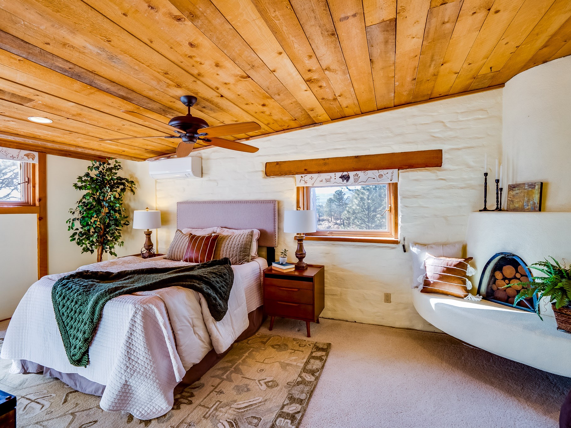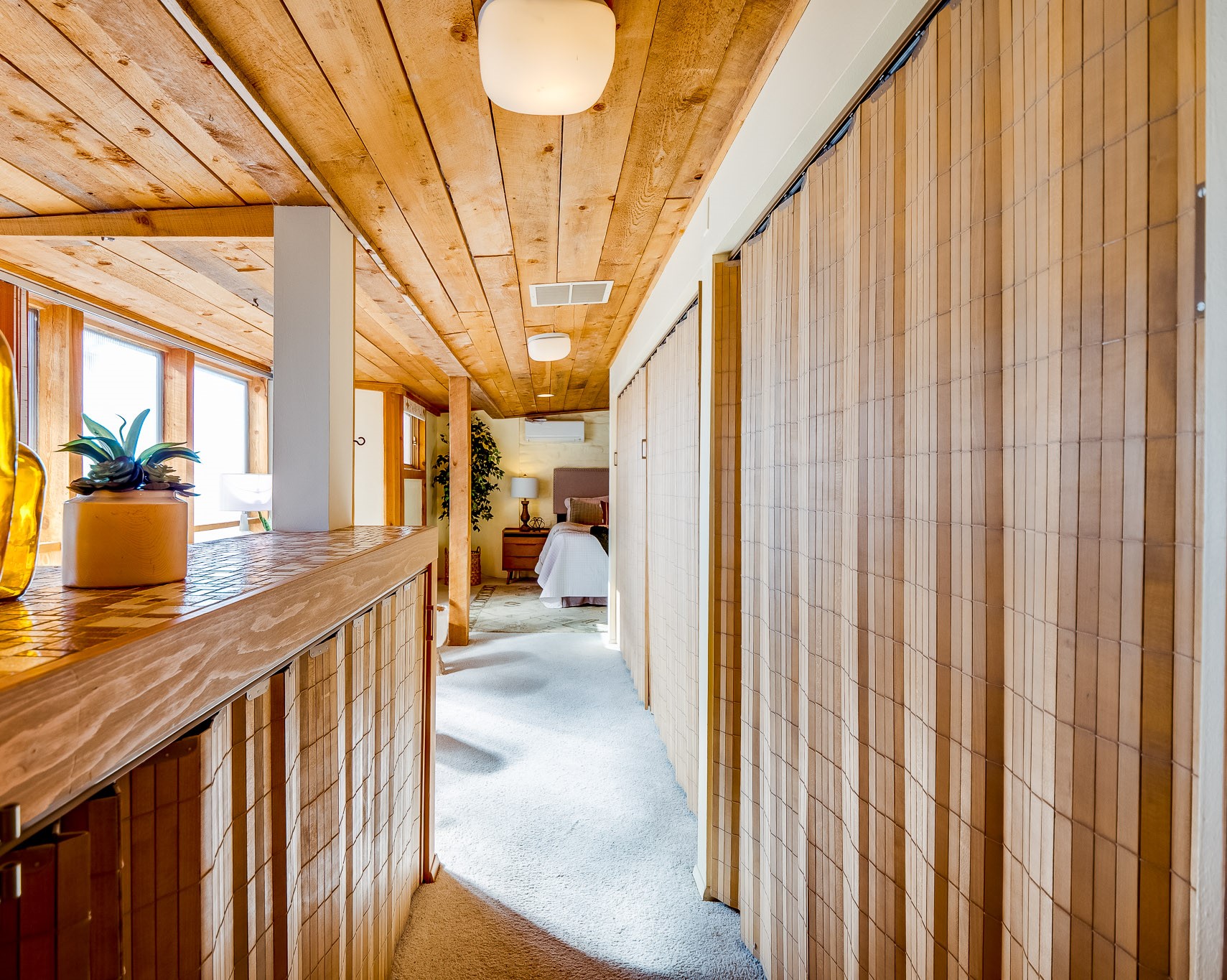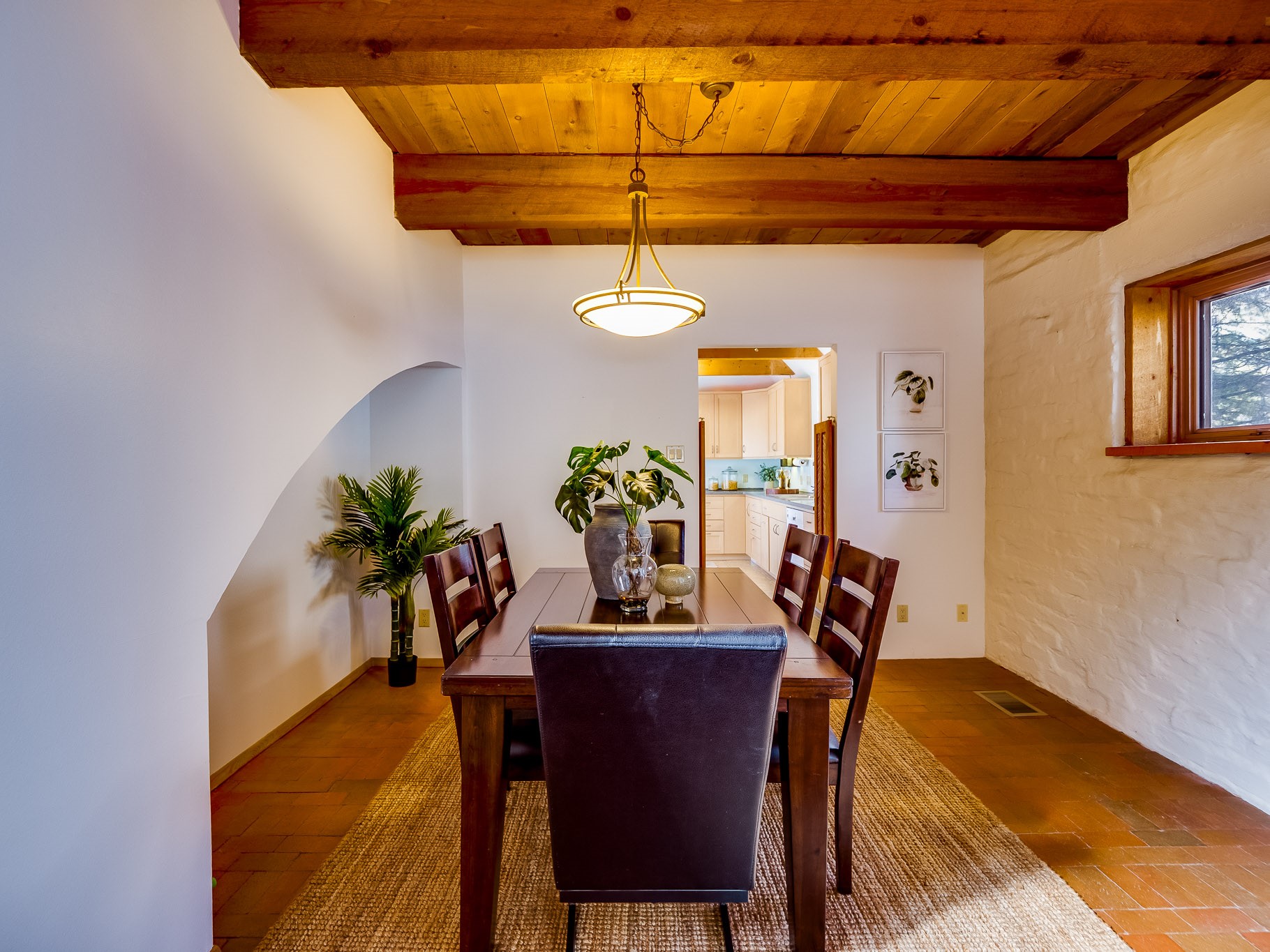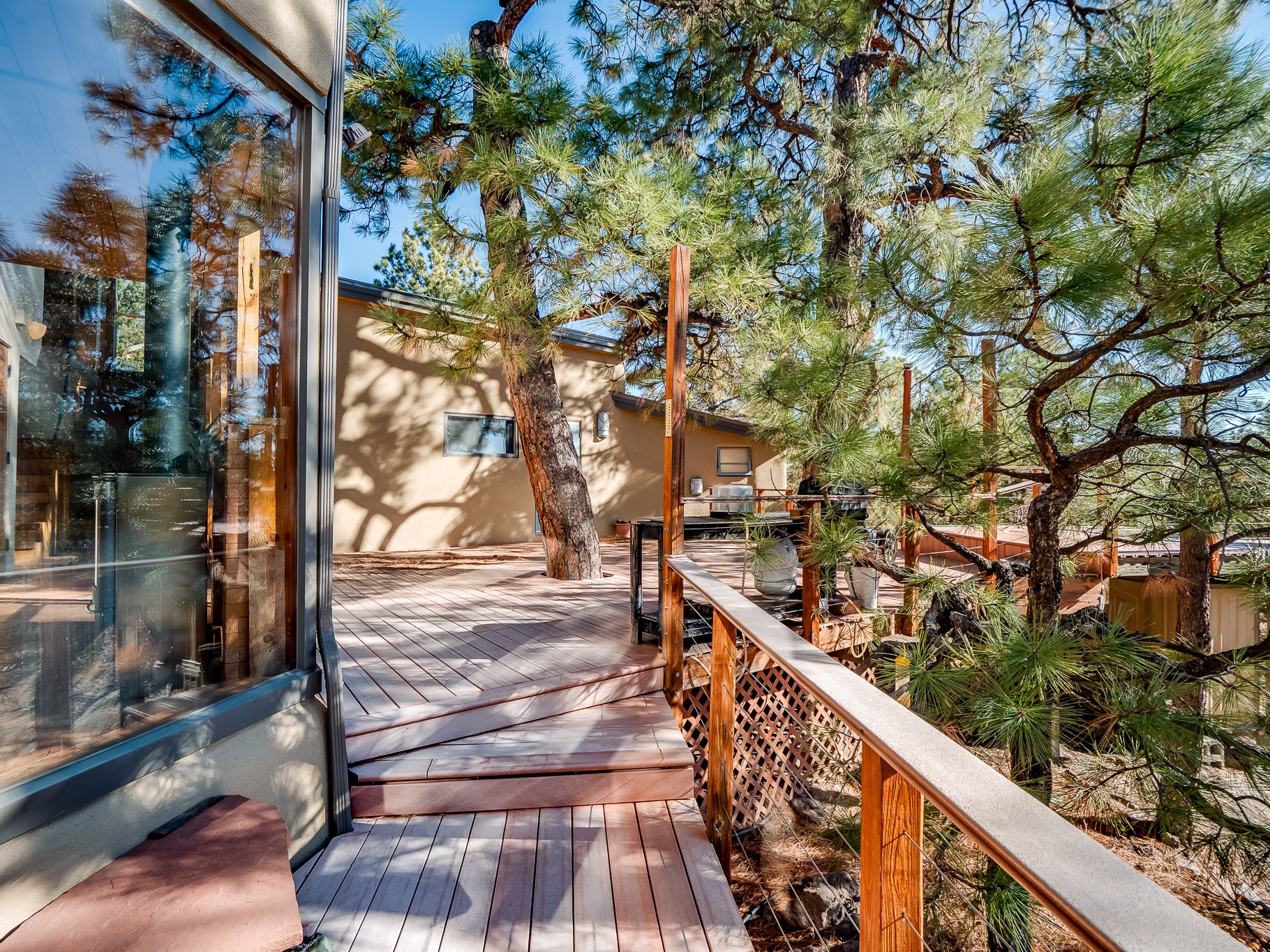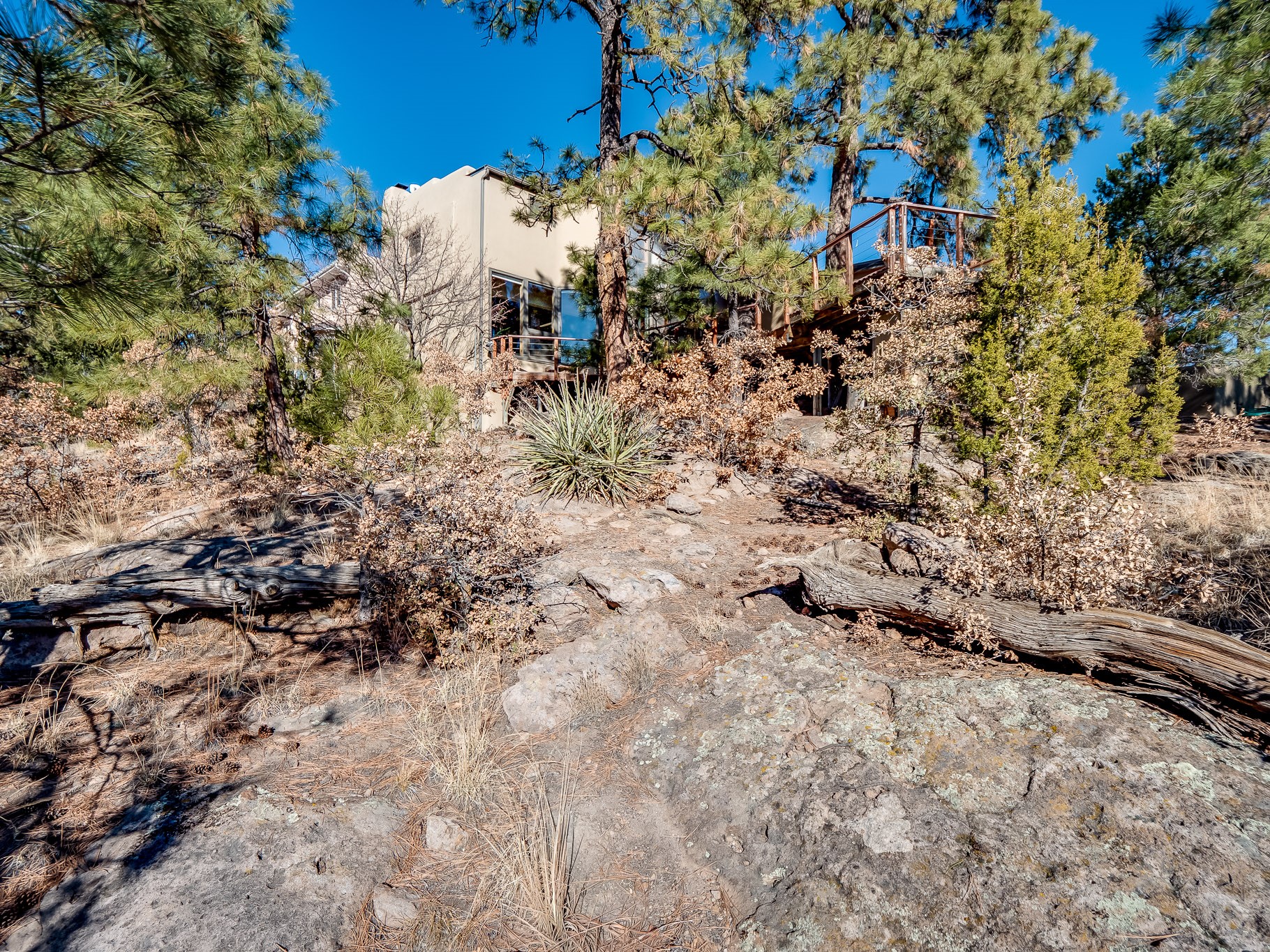 Perched on the canyon in North Mesa, this custom modern adobe home is a rare architectural offering that seamlessly blends natural materials, thoughtful design, and breathtaking surroundings. Character and craftsmanship are evident at every turn, with expansive canyon and treetop views. From the moment you step through the front door your'e greeted with a long, dramatic hallway setting the tone, featuring wood-planked vaulted ceilings, brick flooring, floor to ceiling windows and a rich combination of wood plank and plastered walls that continue throughout the home. The living room carries forward the vaulted ceilings and is anchored by a wood-burning freestanding fireplace that serves as a striking focal point between the living and dining area, thoughtfully tying the spaces together. The kitchen and family room form a bright, open living space with wood-beamed ceilings, abundant windows, and sliding doors that lead directly to the deck. The family room offers a custom wood built-in cabinetry and a gas freestanding fireplace. The kitchen features light-toned wood cabinetry, hard surface counters, and a peninsula island with bar seating, perfect for casual meals or entertaining. Just off the kitchen is a guest bath with a single-sink vanity and a tiled walk-in shower. This level also provides access to the two-car garage, which includes a connected green room. Upstairs, is fully carpeted and offers two bedrooms. A guest bed and the spacious primary suite that feels luxurious and serene, highlighted by a kiva fireplace and a dedicated seating area. There's a large closet and a washer and dryer for added convenience. The generously sized bathroom is shared between the two bedrooms and includes a deep jetted soaking tub, a walk-in shower, and two separate single-sink vanities. Outdoor living is truly exceptional, with a massive composite deck offering multiple areas for entertaining and taking in those canyon views. Book your tour to experience this home for yourself!