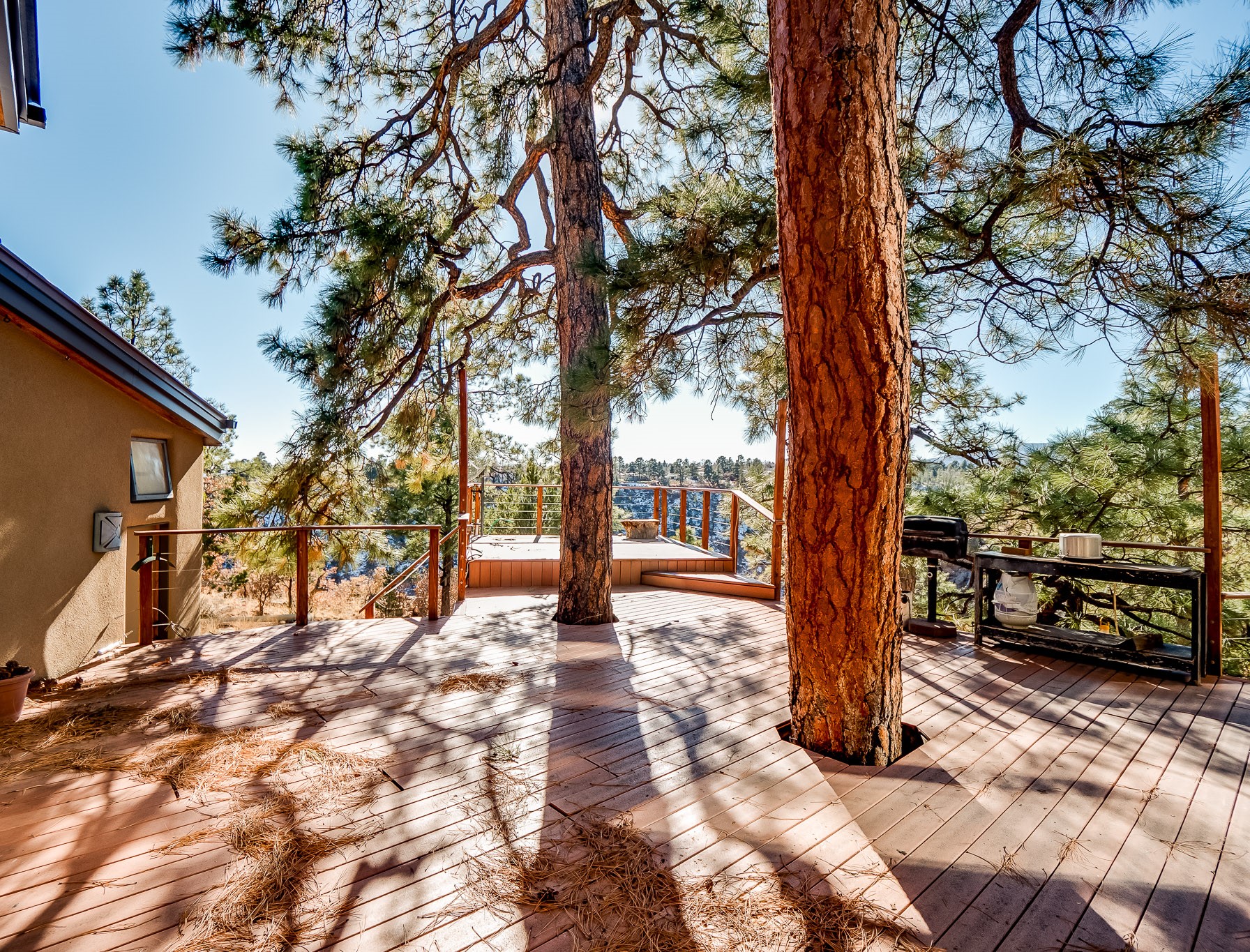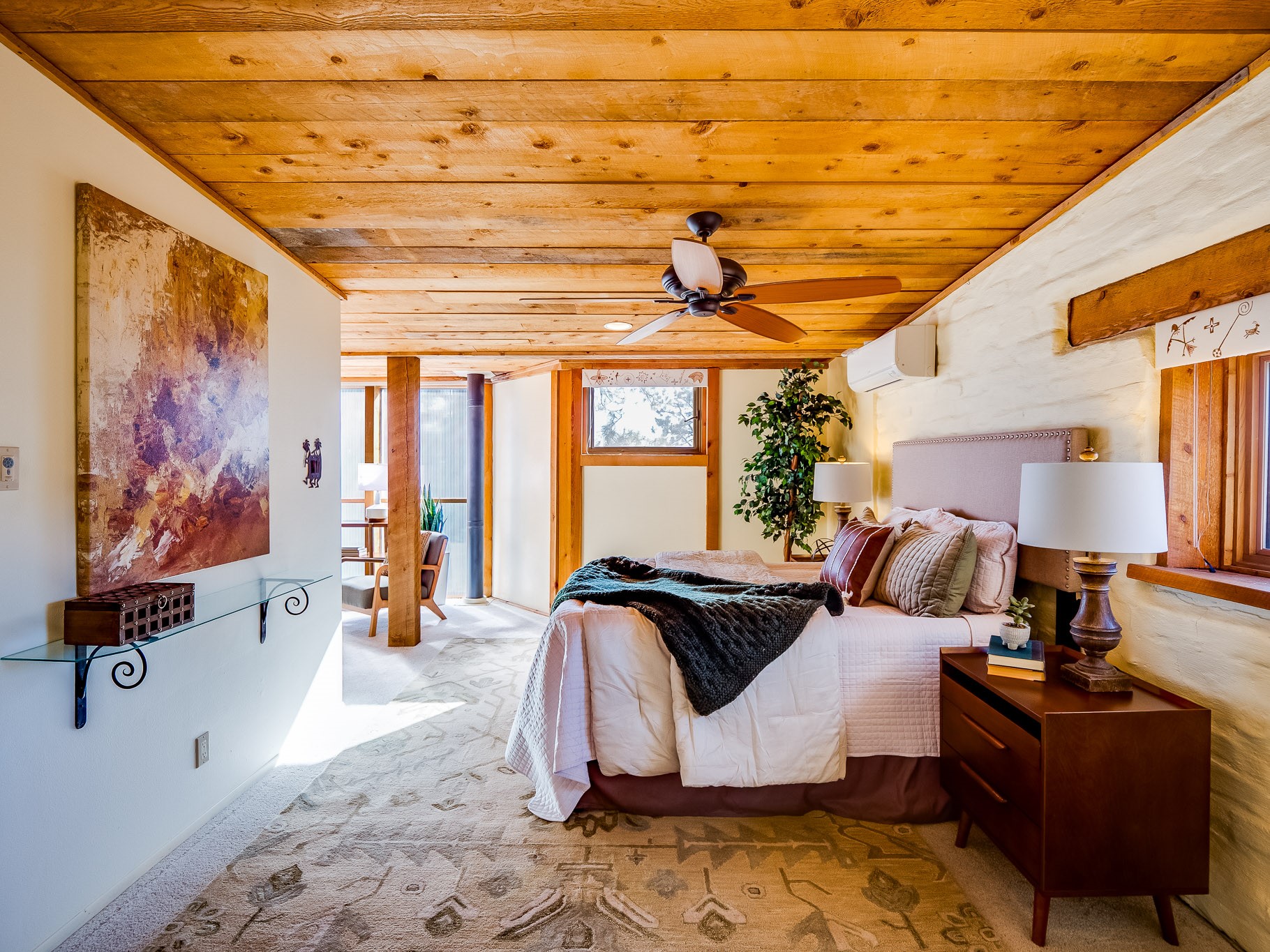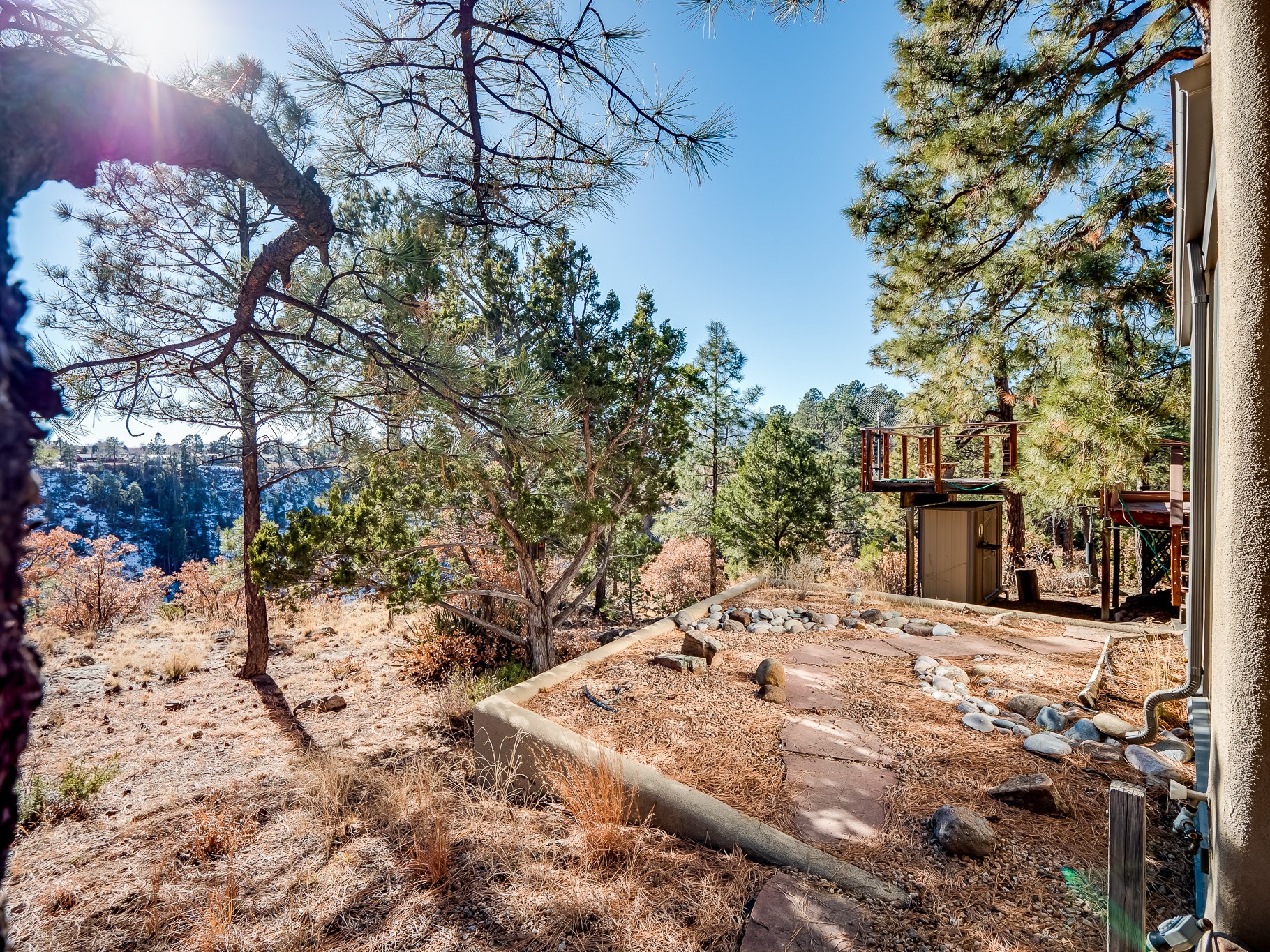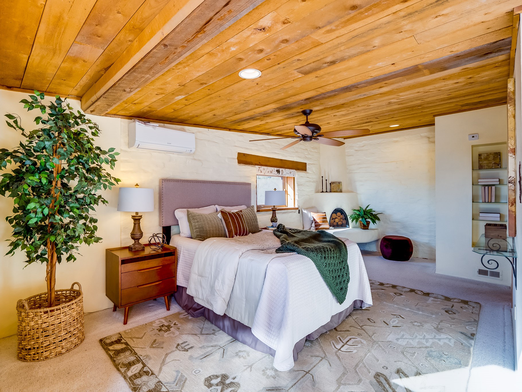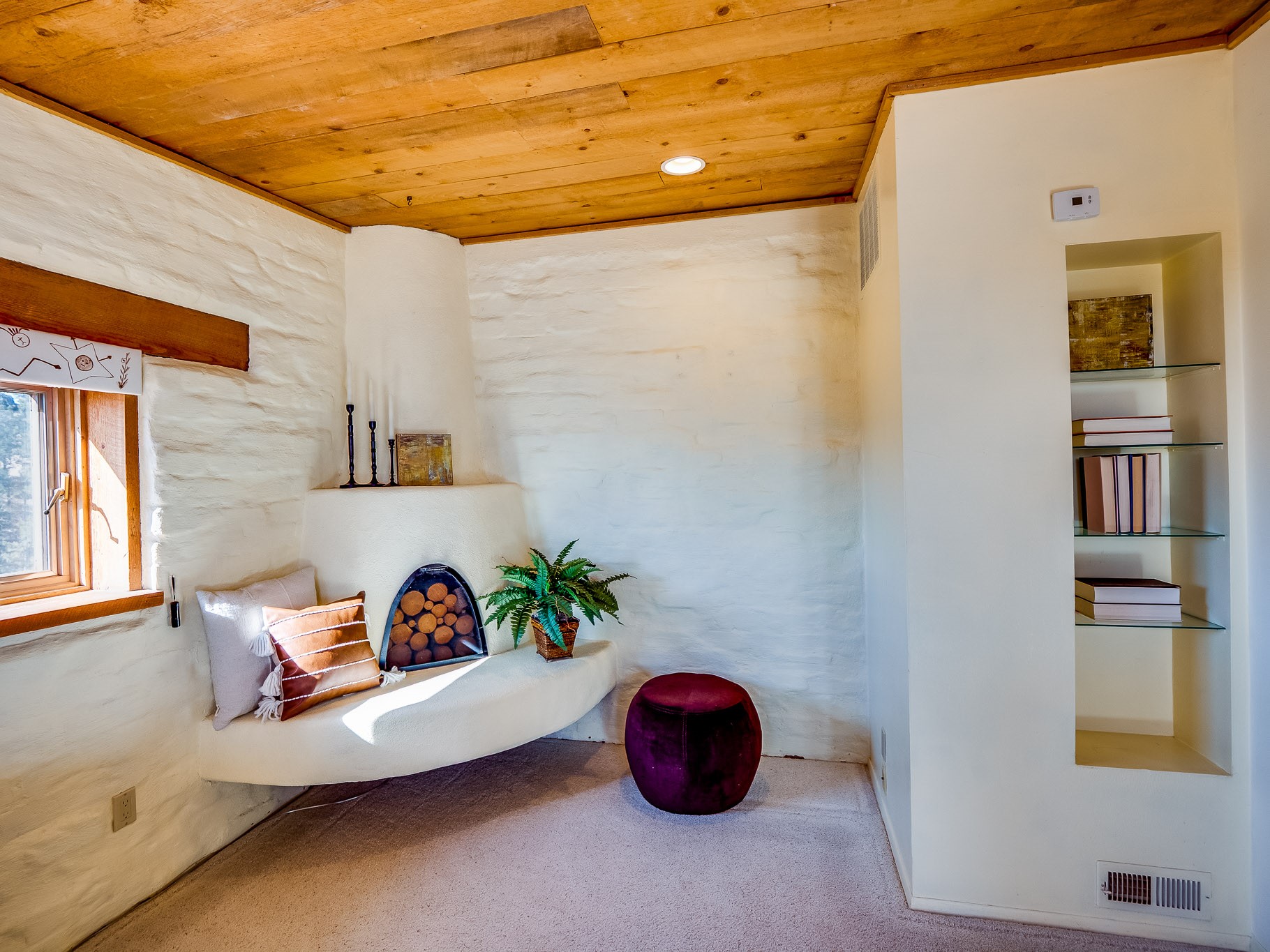 Perched on the canyon in North Mesa, this custom modern adobe home is a rare architectural offering that seamlessly blends natural materials, thoughtful design, and breathtaking surroundings. Character and craftsmanship are evident at every turn, with expansive canyon and treetop views. From the moment you step through the front door your'e greeted with a long, dramatic hallway setting the tone, featuring wood-planked vaulted ceilings, brick flooring, floor to ceiling windows and a rich combination of wood plank and plastered walls that continue throughout the home. The living room carries forward the vaulted ceilings and is anchored by a wood-burning freestanding fireplace that serves as a striking focal point between the living and dining area, thoughtfully tying the spaces together. The kitchen and family room form a bright, open living space with wood-beamed ceilings, abundant windows, and sliding doors that lead directly to the deck. The family room offers a custom wood built-in cabinetry and a gas freestanding fireplace. The kitchen features light-toned wood cabinetry, hard surface counters, and a peninsula island with bar seating, perfect for casual meals or entertaining. Just off the kitchen is a guest bath with a single-sink vanity and a tiled walk-in shower. This level also provides access to the two-car garage, which includes a connected green room. Upstairs, is fully carpeted and offers two bedrooms. A guest bed and the spacious primary suite that feels luxurious and serene, highlighted by a kiva fireplace and a dedicated seating area. There's a large closet and a washer and dryer for added convenience. The generously sized bathroom is shared between the two bedrooms and includes a deep jetted soaking tub, a walk-in shower, and two separate single-sink vanities. Outdoor living is truly exceptional, with a massive composite deck offering multiple areas for entertaining and taking in those canyon views. Book your tour to experience this home for yourself!